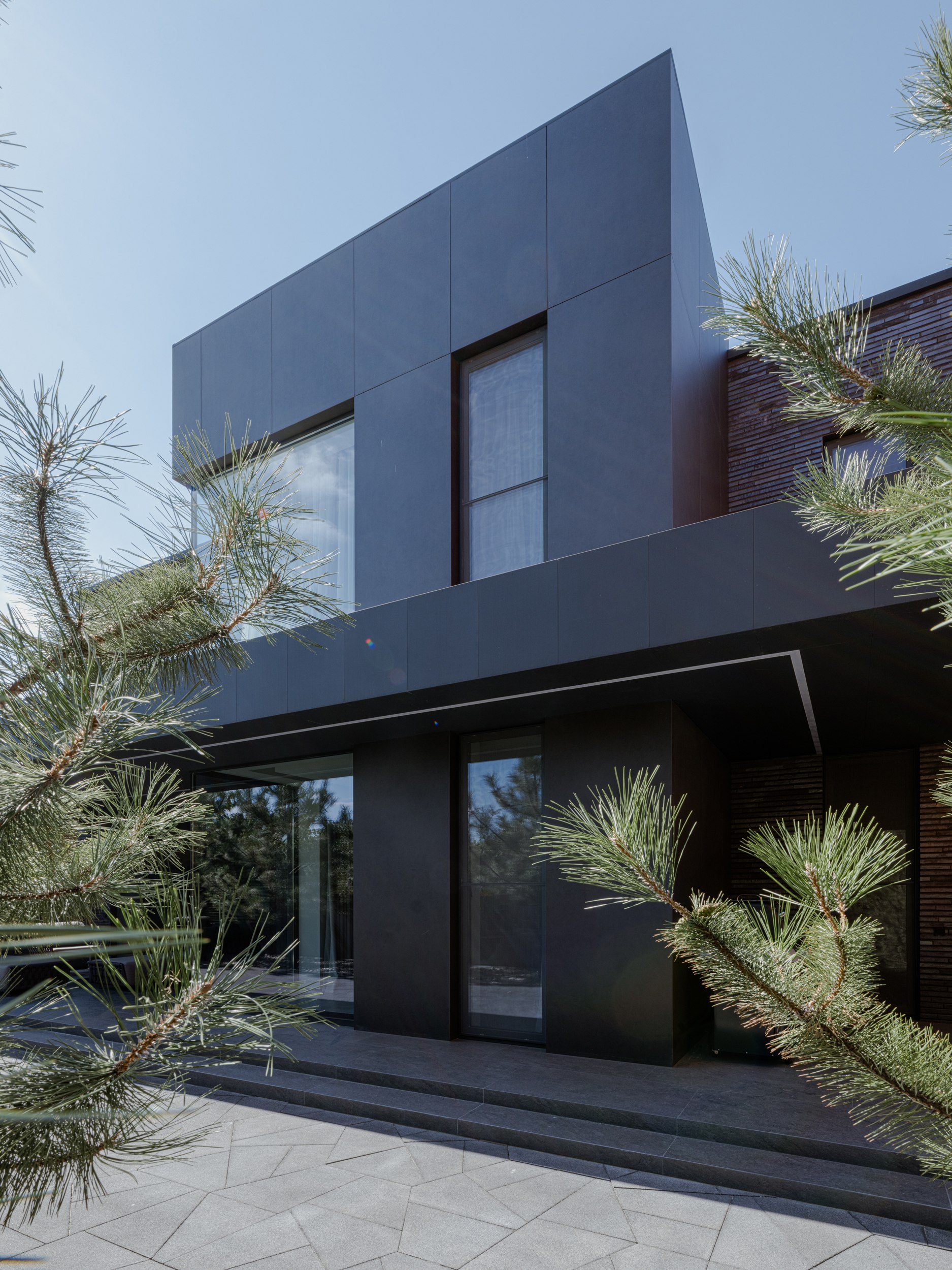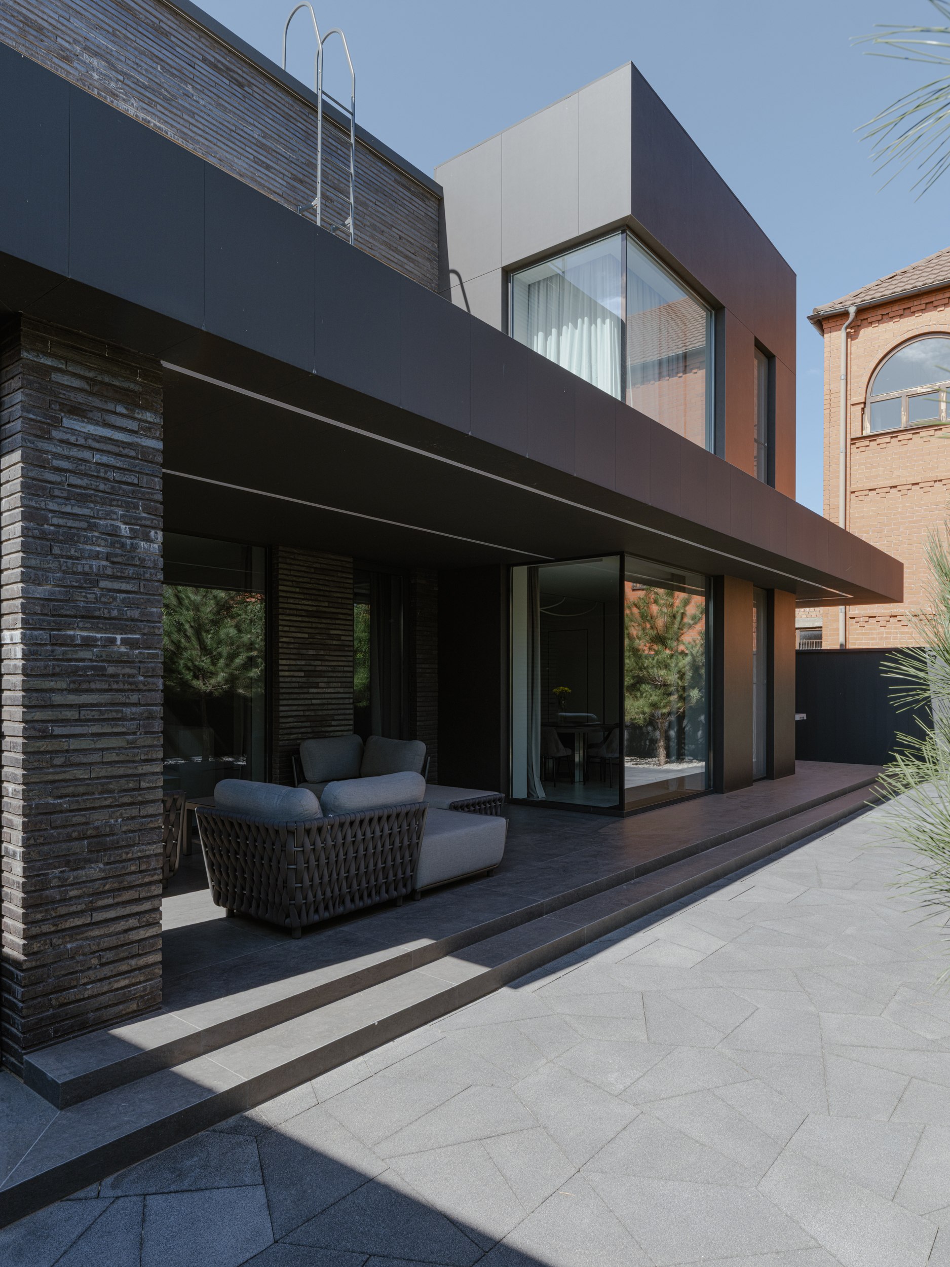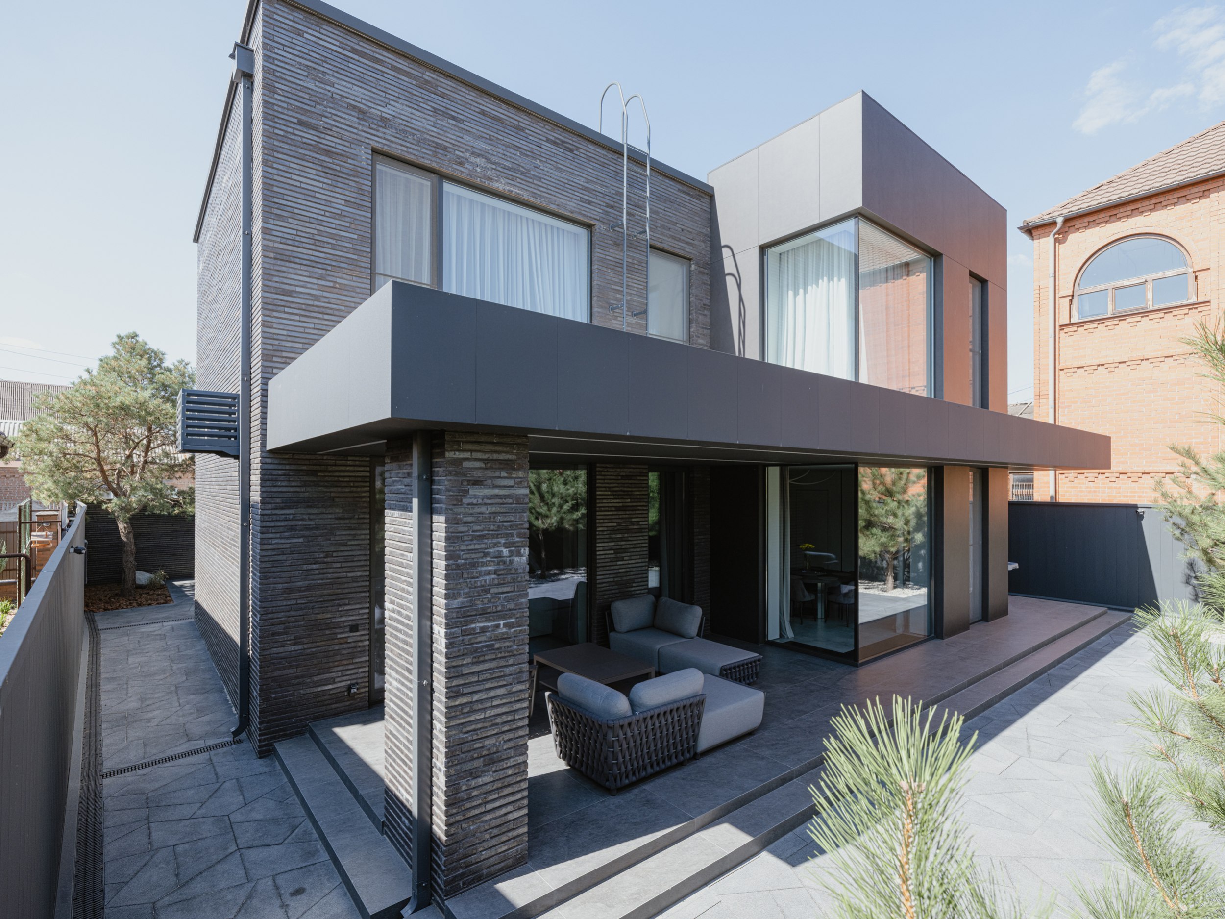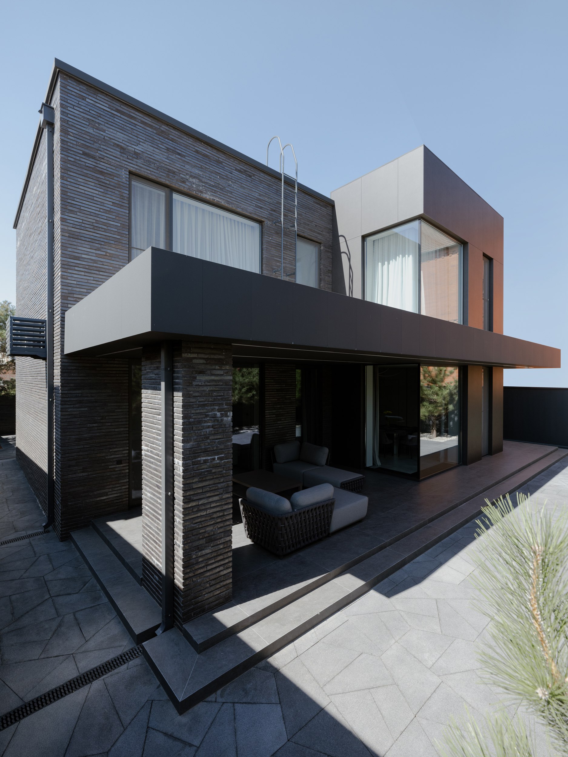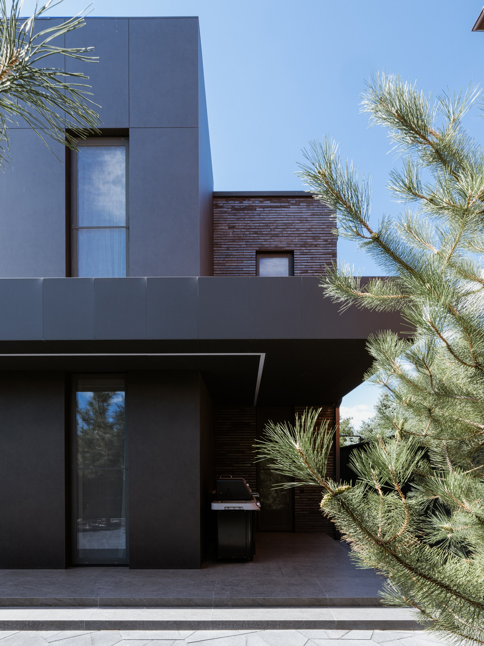 В основе экстерьера заложены кирпич ручной формовки и крупноформатные керамические панели. Мы сделали ставку не на контраст оттенков, а на глубину фактур. Чёрный цвет раскрывается через поверхности, поэтому облик интересно рассматривать. Плоская кровля продолжает линию современной архитектуры и подчёркивает графику объёма.