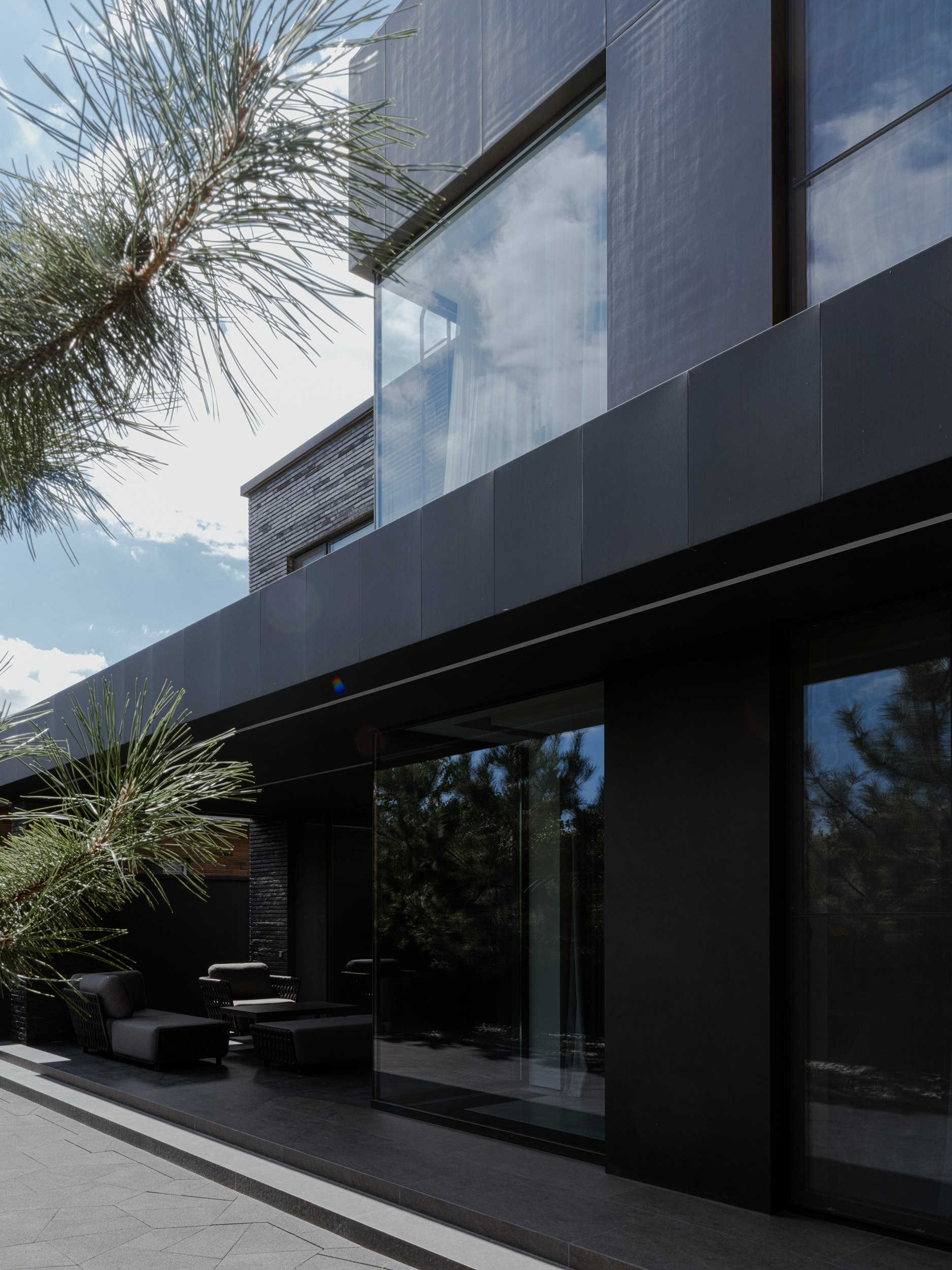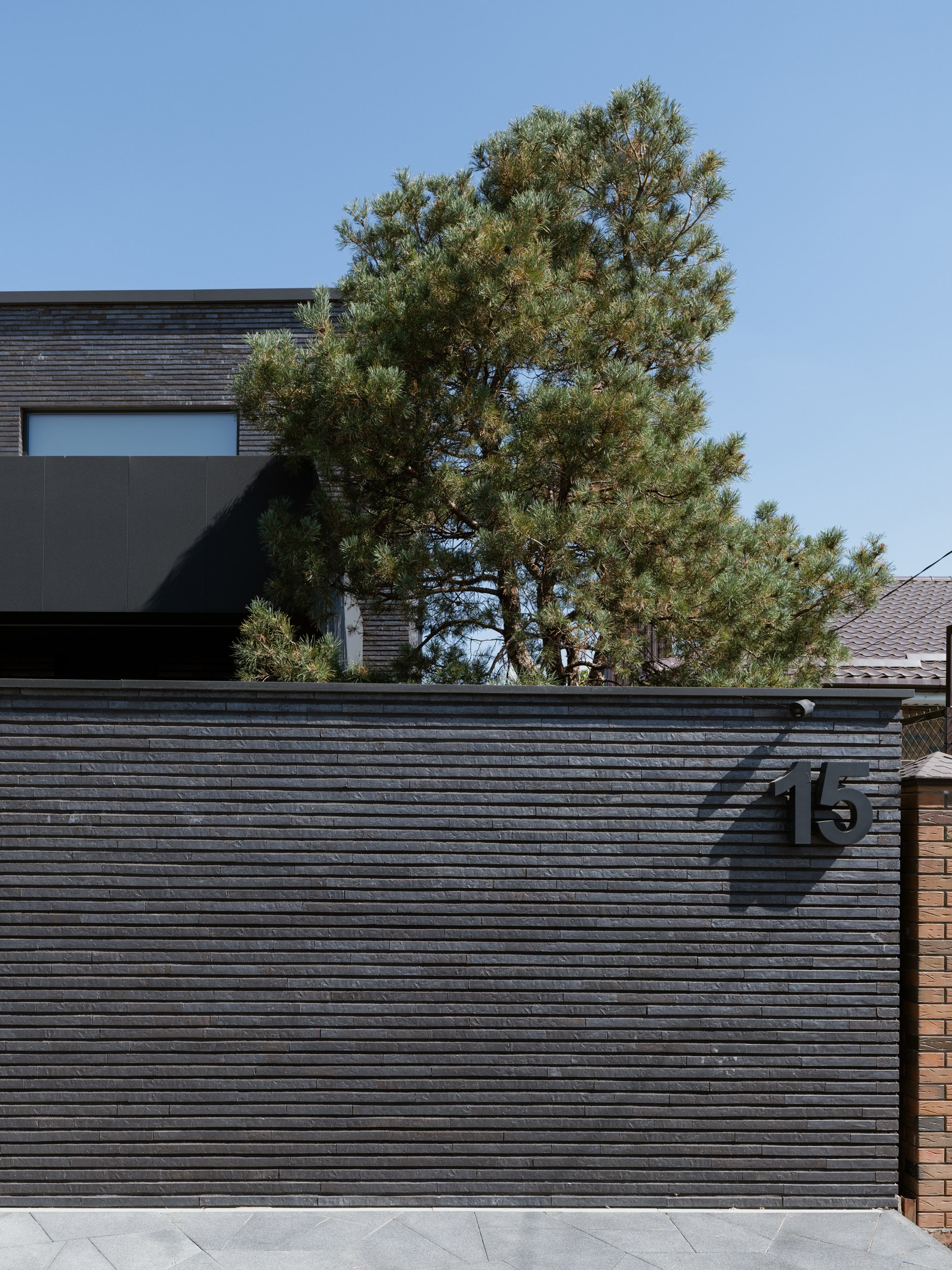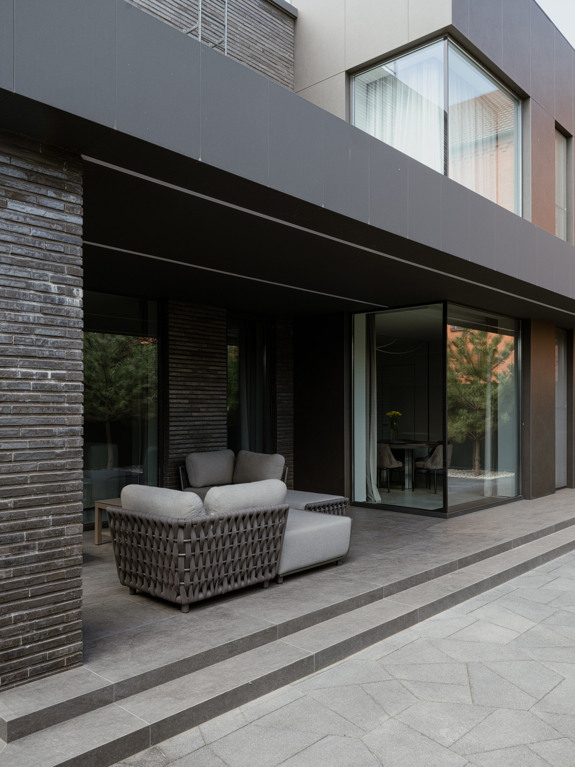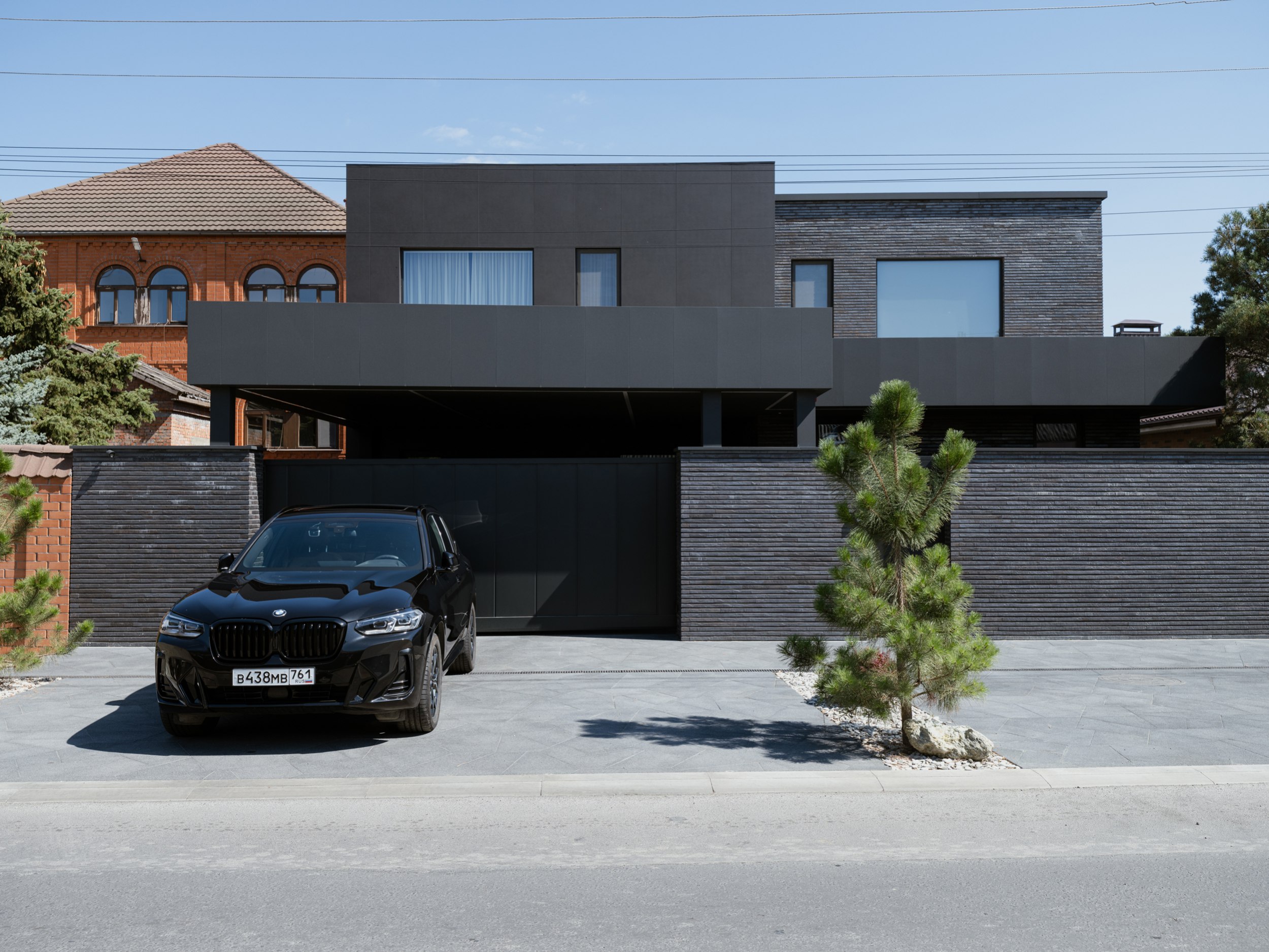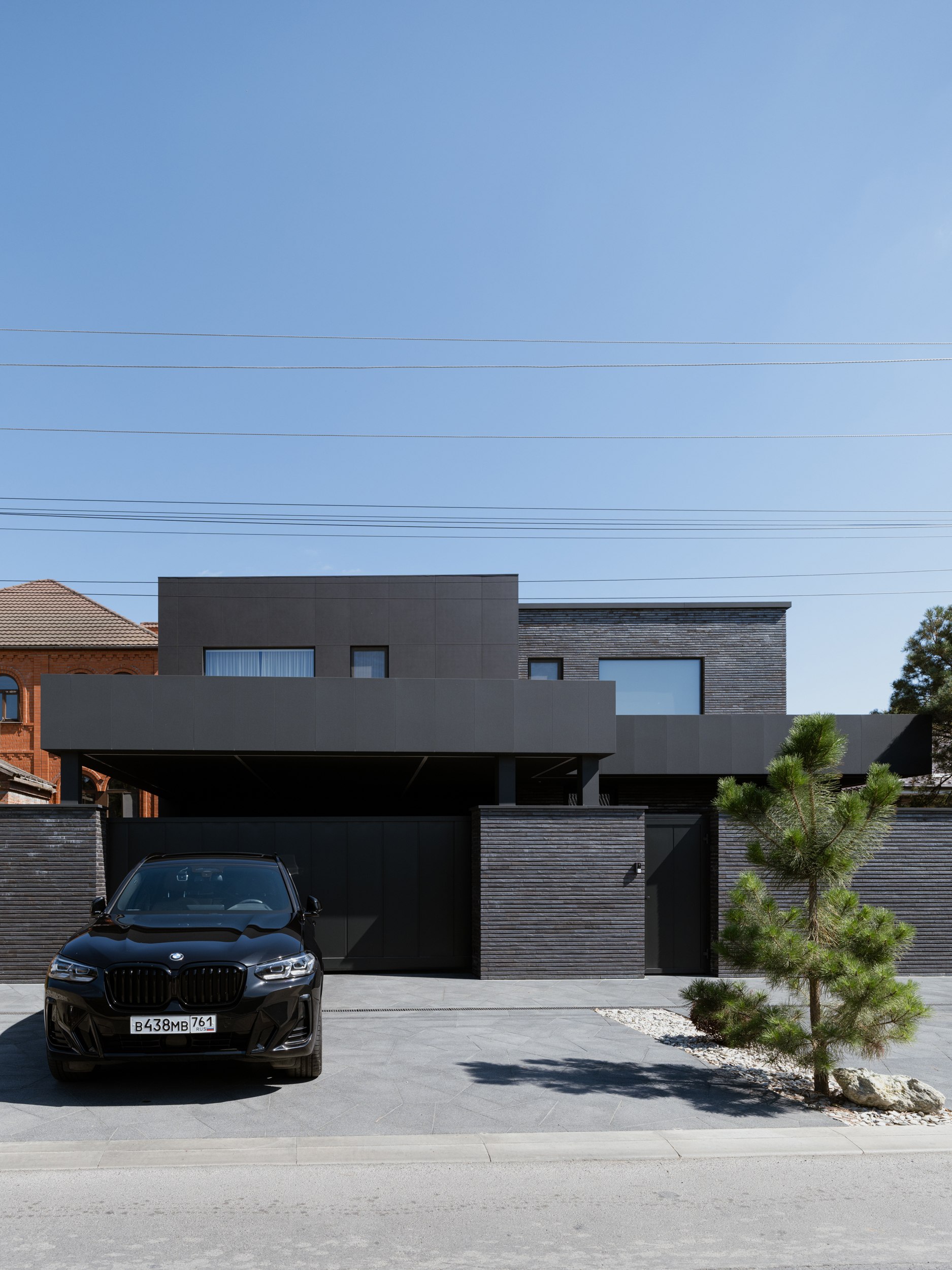 В основе экстерьера заложены кирпич ручной формовки и крупноформатные керамические панели. Мы сделали ставку не на контраст оттенков, а на глубину фактур. Чёрный цвет раскрывается через поверхности, поэтому облик интересно рассматривать. Плоская кровля продолжает линию современной архитектуры и подчёркивает графику объёма.