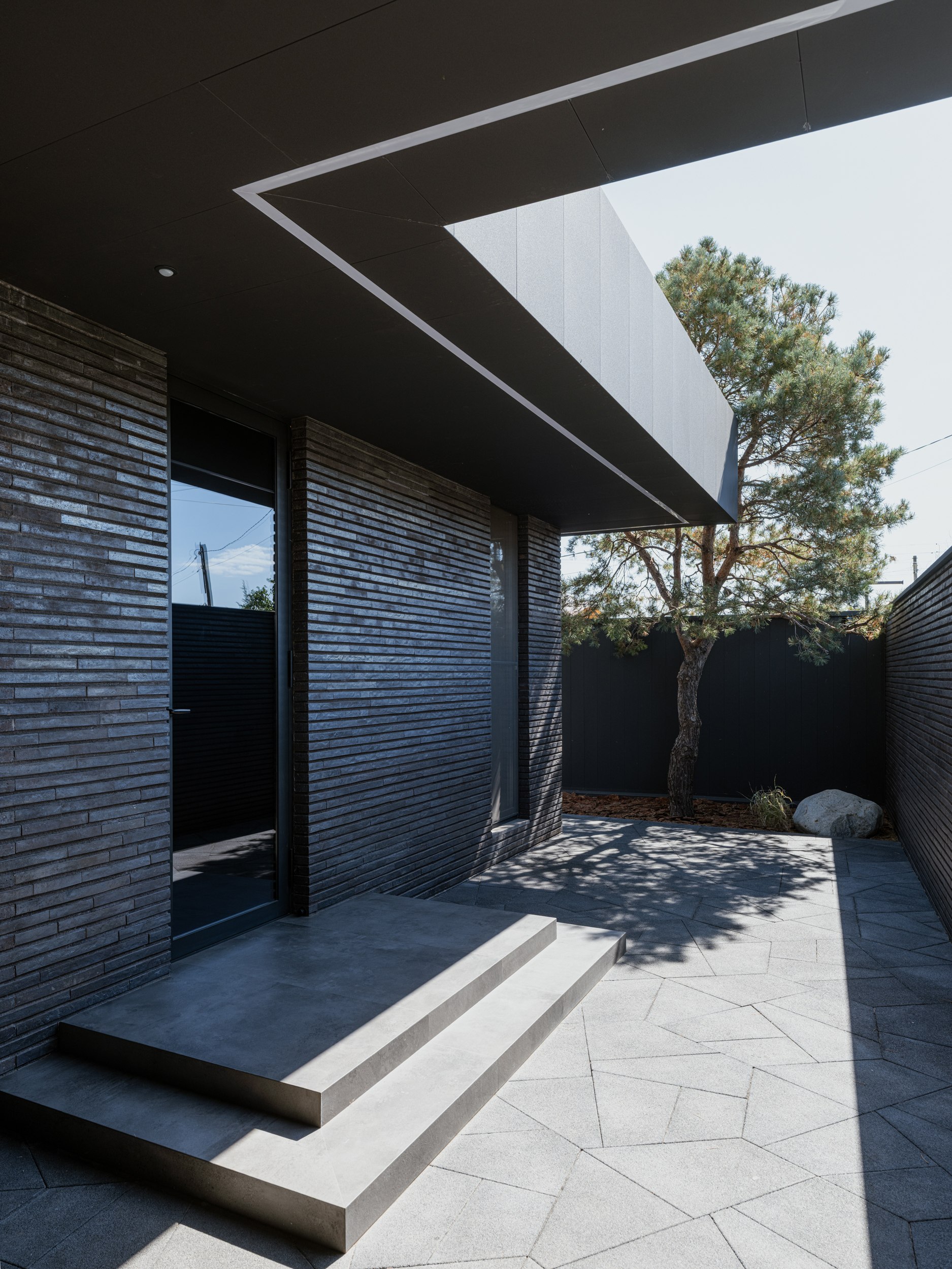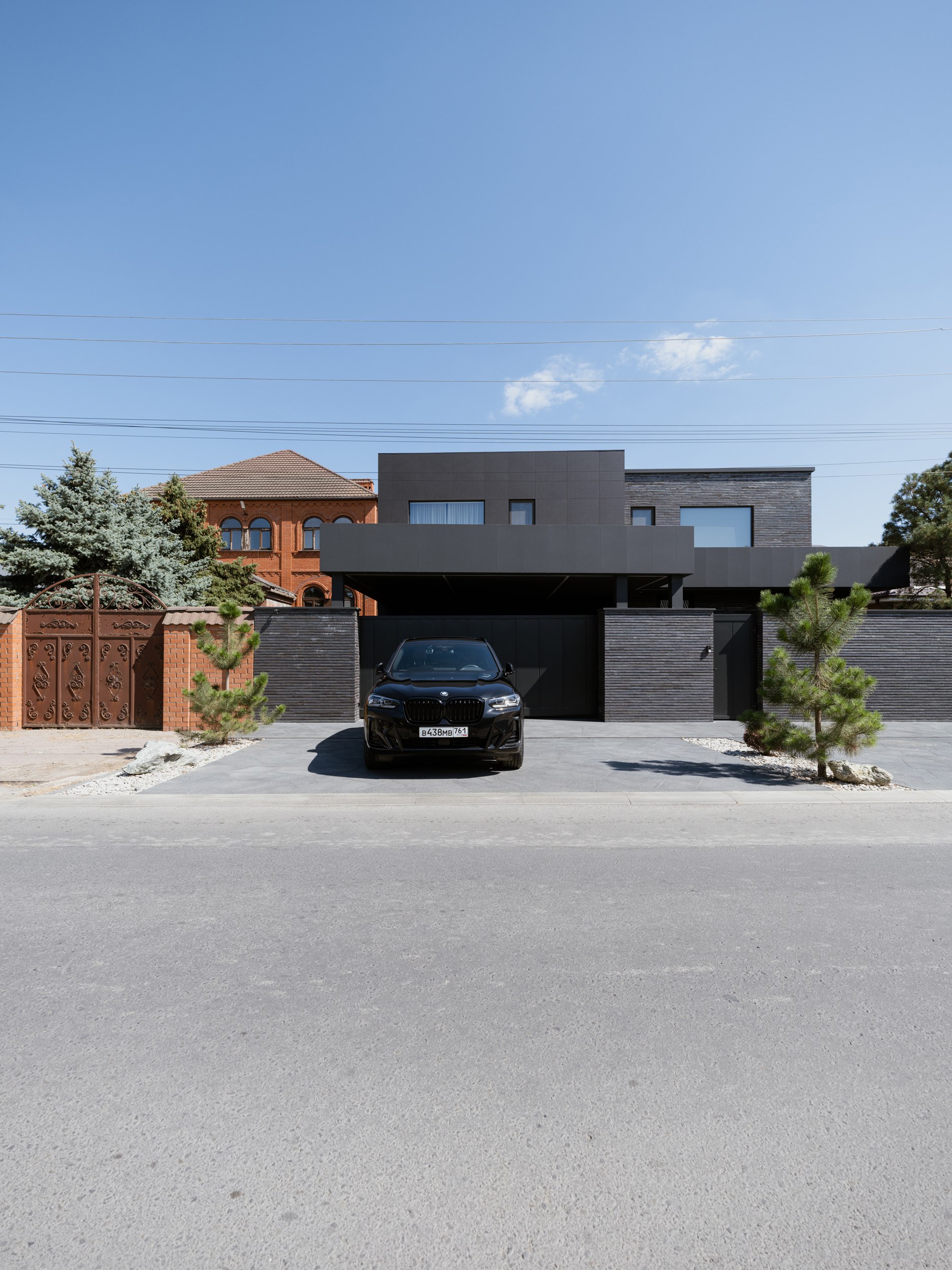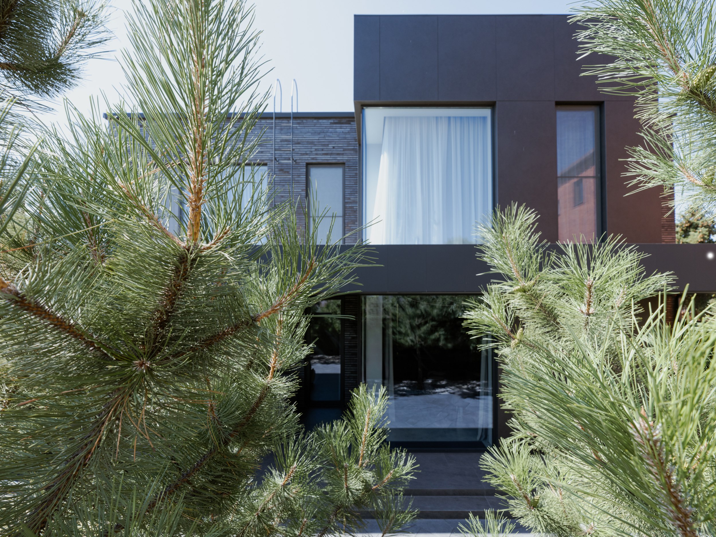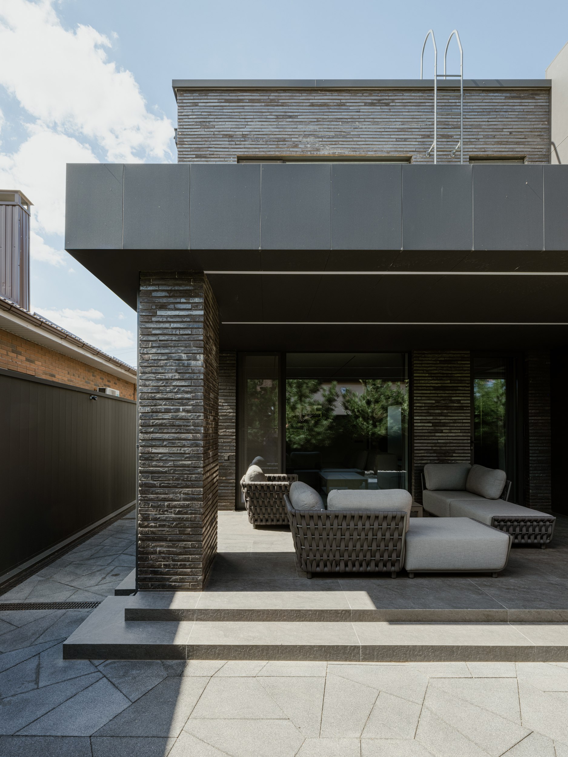 В основе экстерьера заложены кирпич ручной формовки и крупноформатные керамические панели. Мы сделали ставку не на контраст оттенков, а на глубину фактур. Чёрный цвет раскрывается через поверхности, поэтому облик интересно рассматривать. Плоская кровля продолжает линию современной архитектуры и подчёркивает графику объёма.