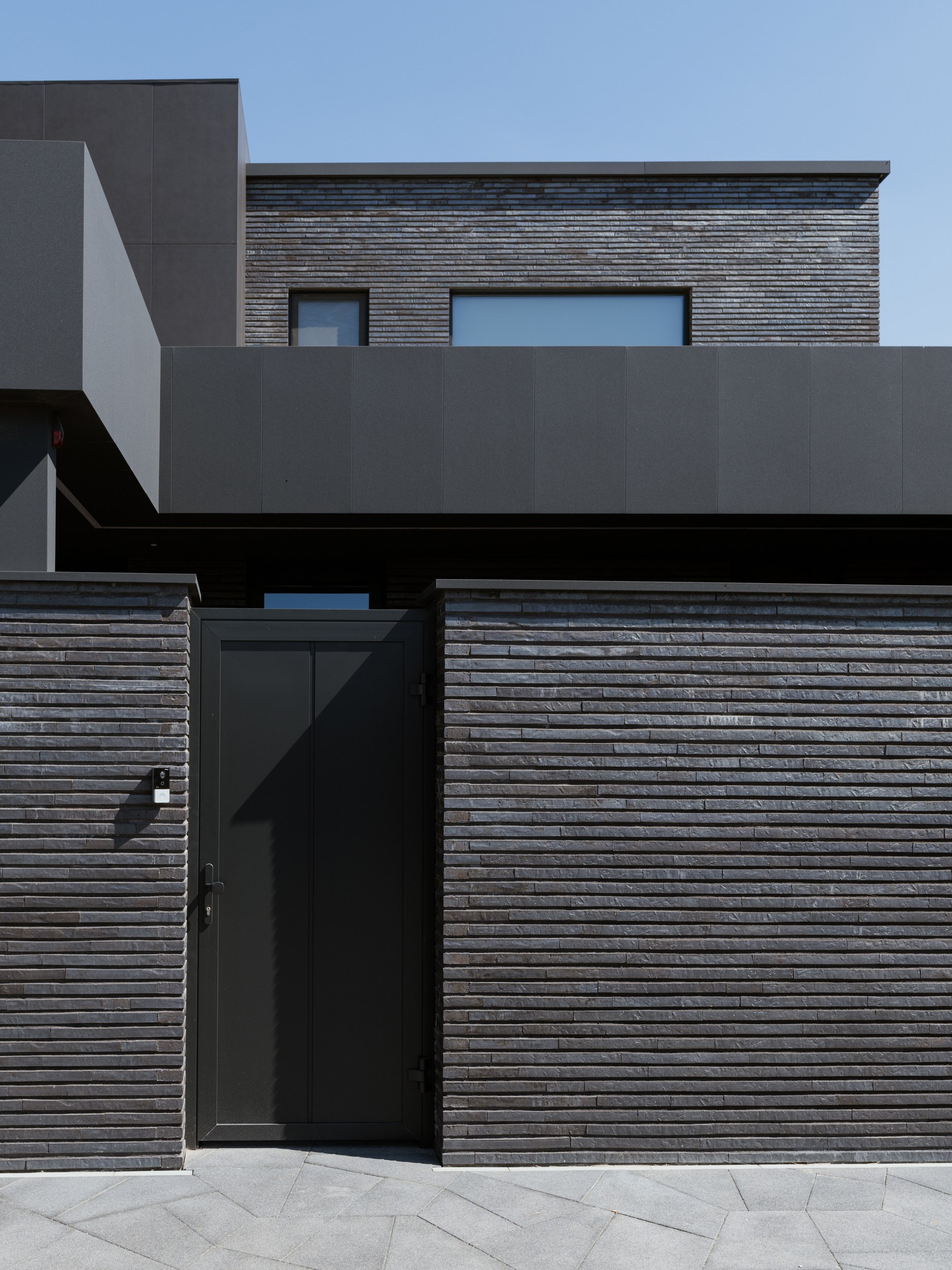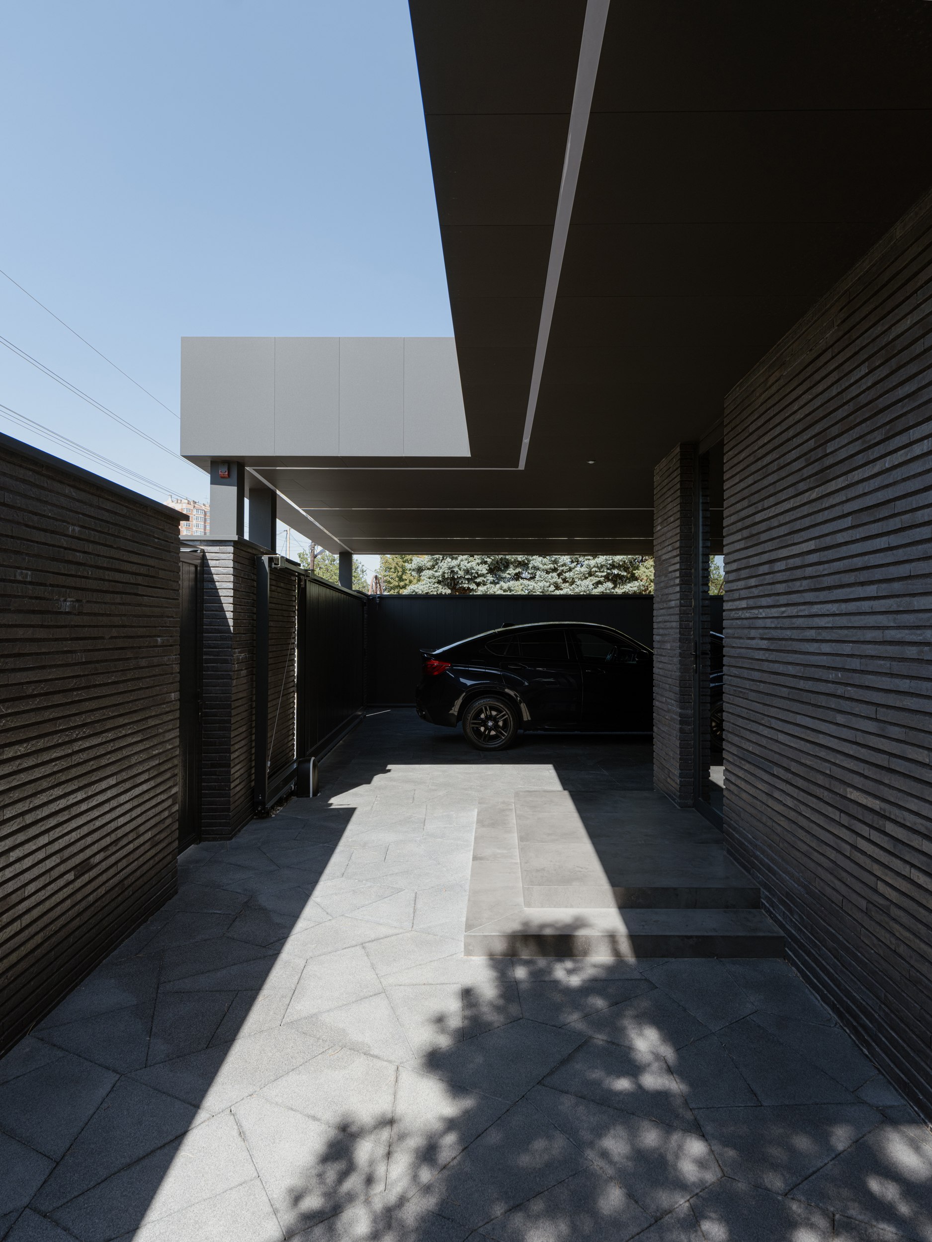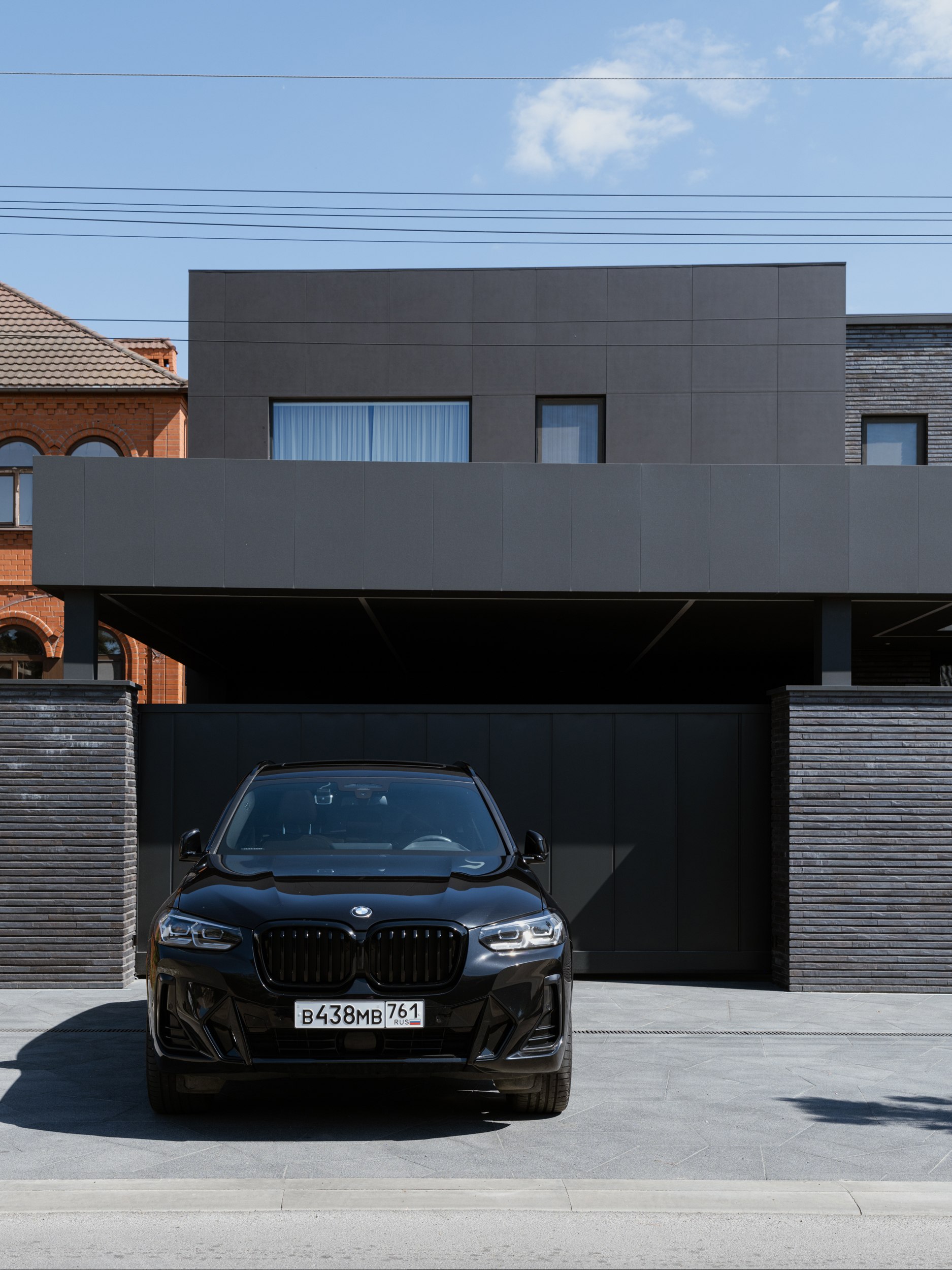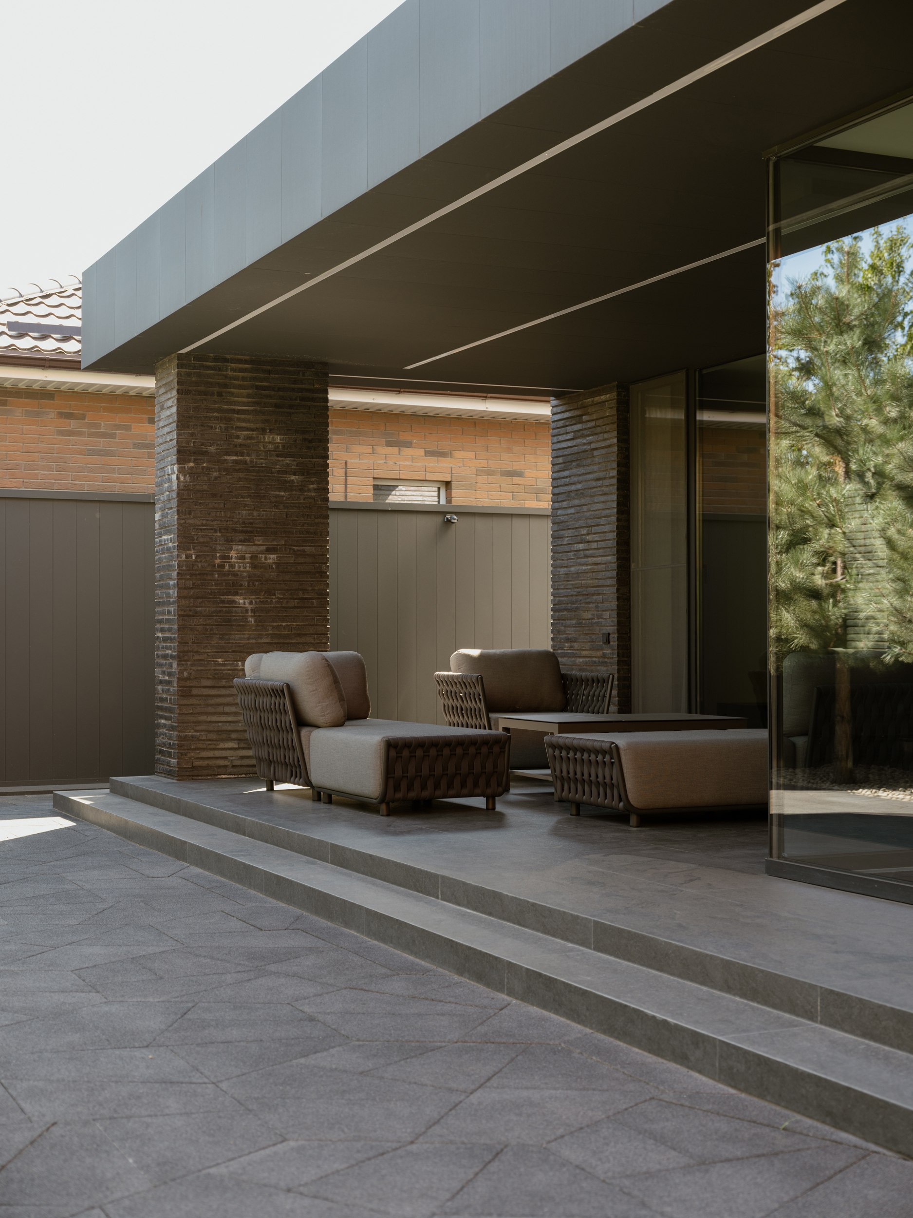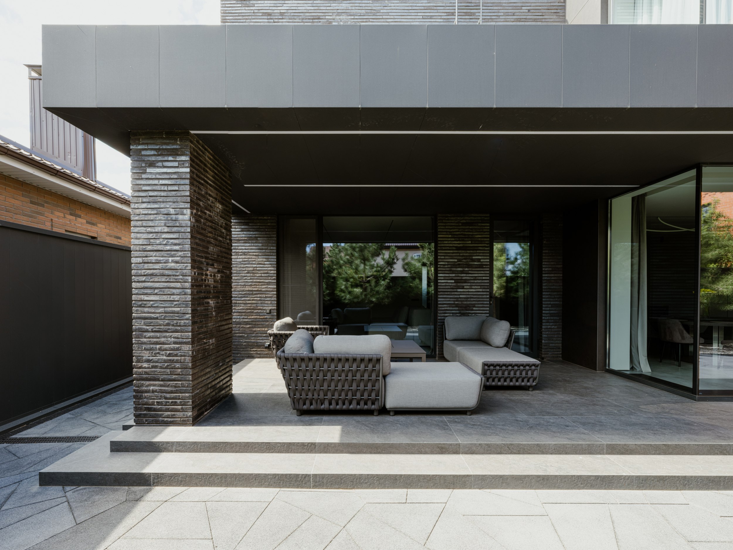 В основе экстерьера заложены кирпич ручной формовки и крупноформатные керамические панели. Мы сделали ставку не на контраст оттенков, а на глубину фактур. Чёрный цвет раскрывается через поверхности, поэтому облик интересно рассматривать. Плоская кровля продолжает линию современной архитектуры и подчёркивает графику объёма.