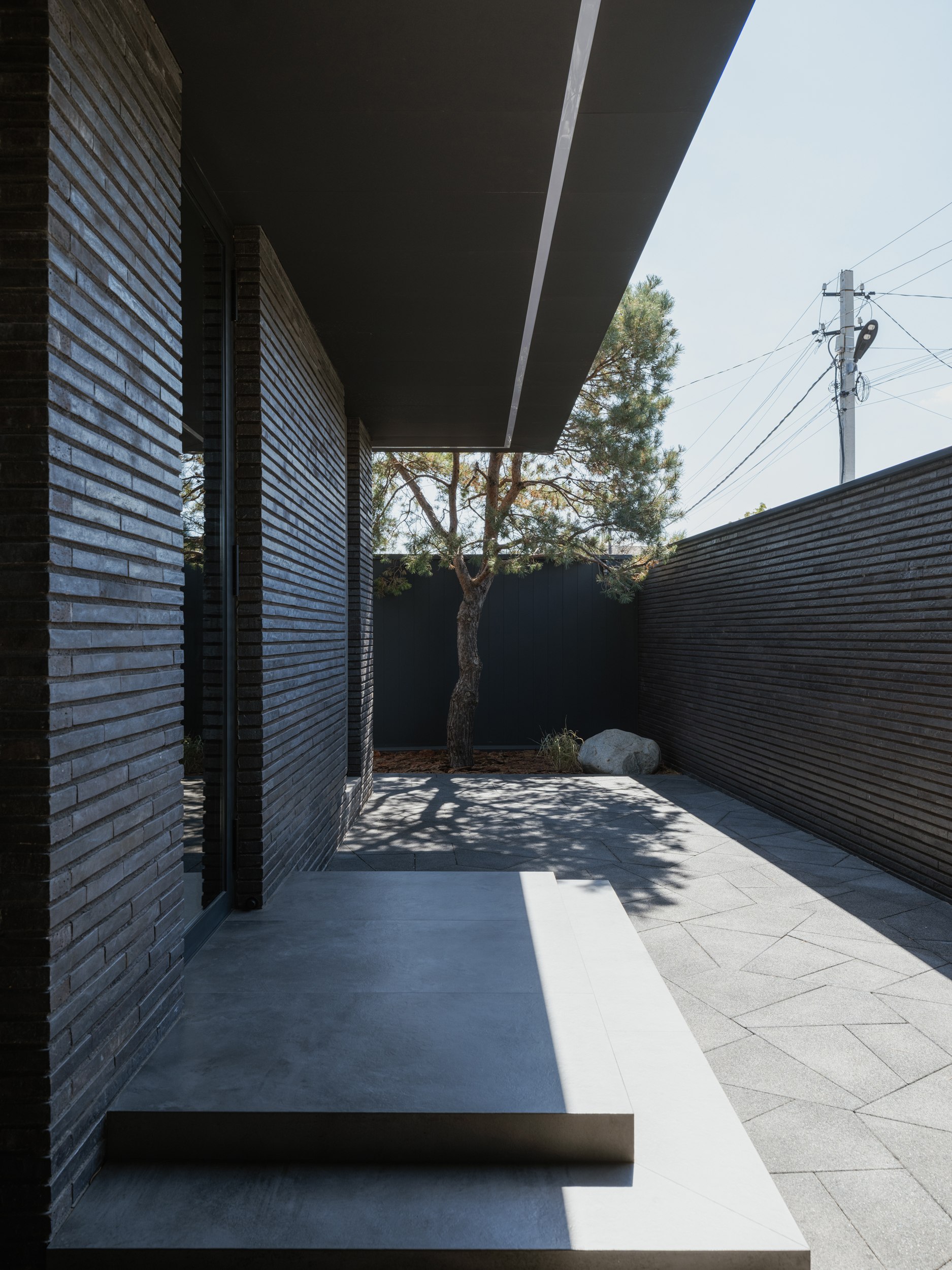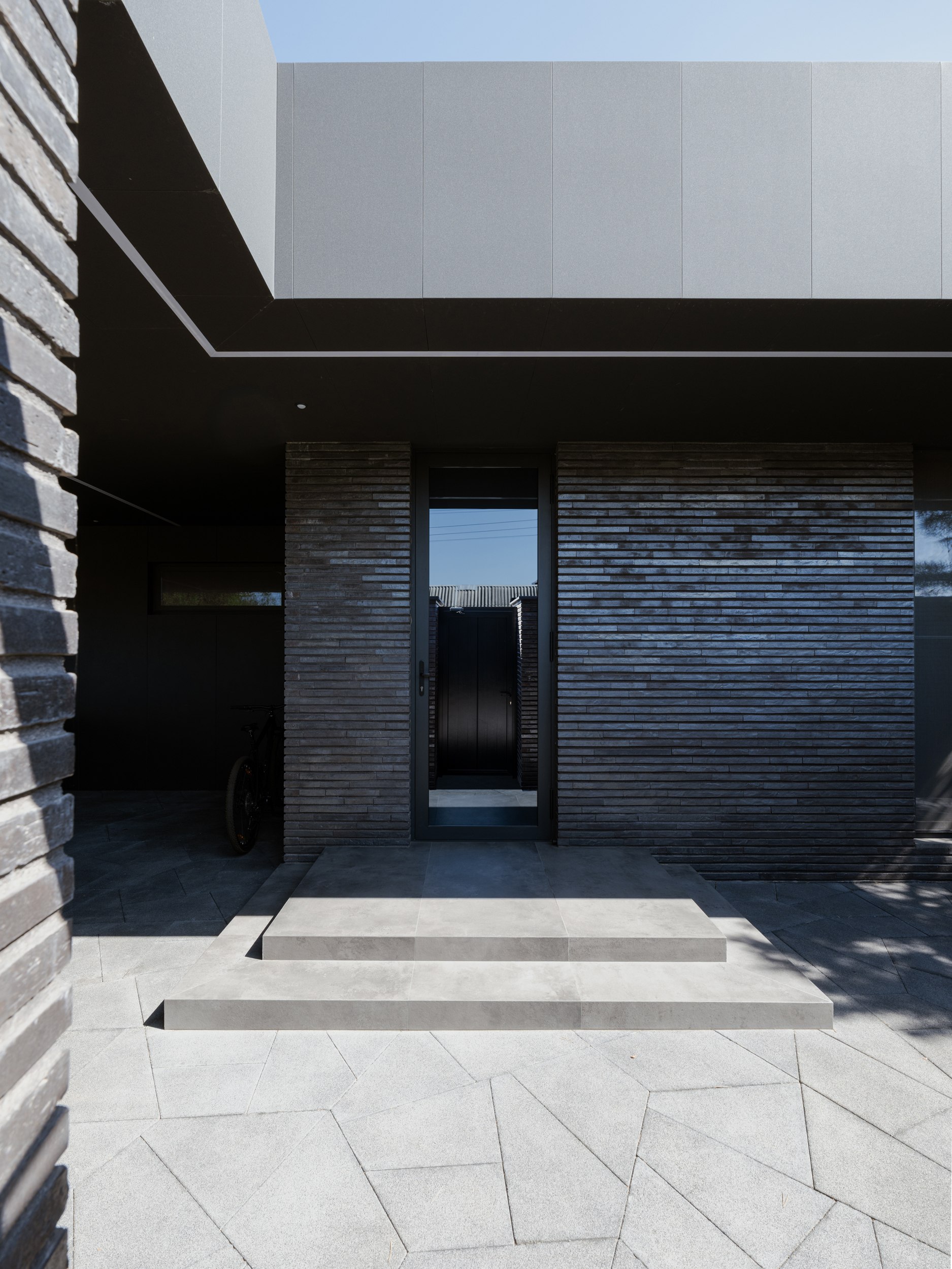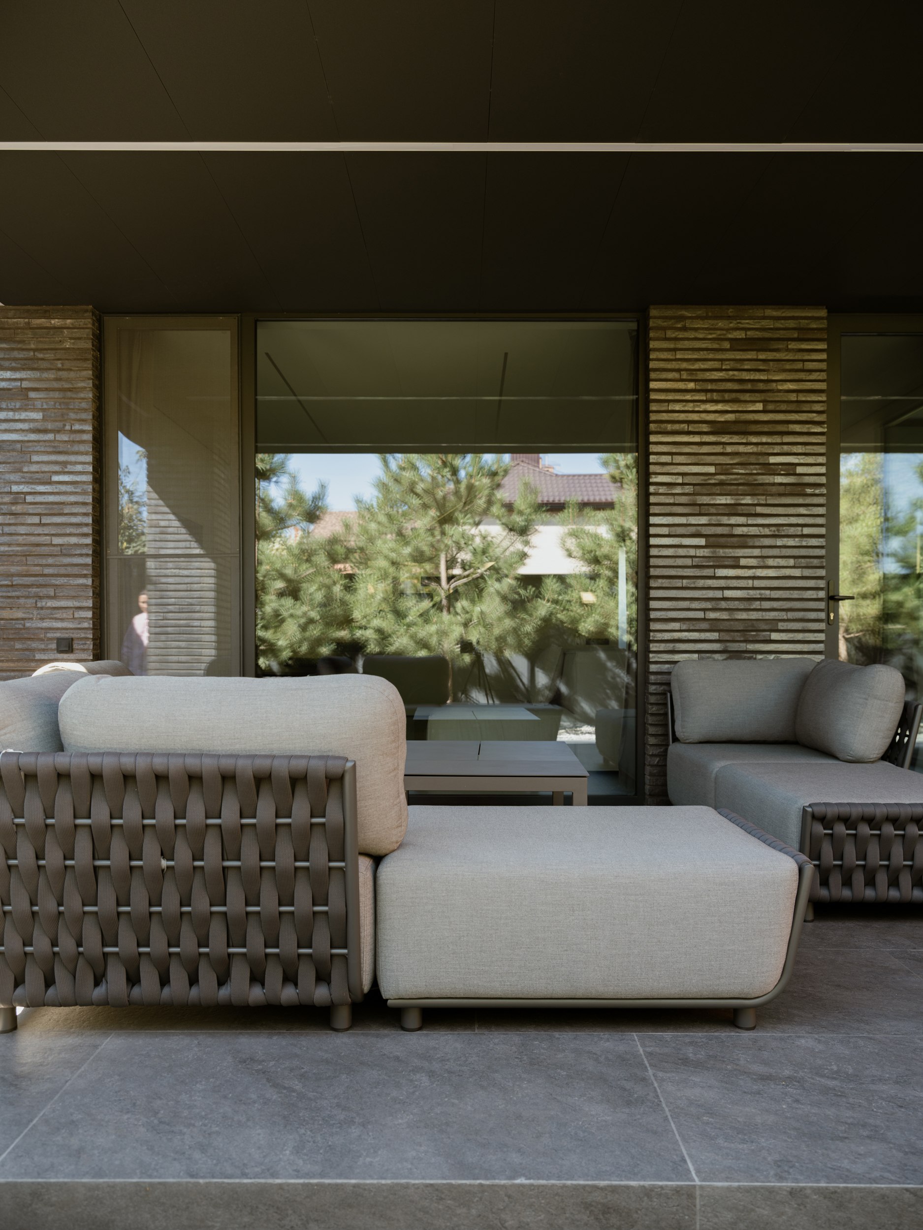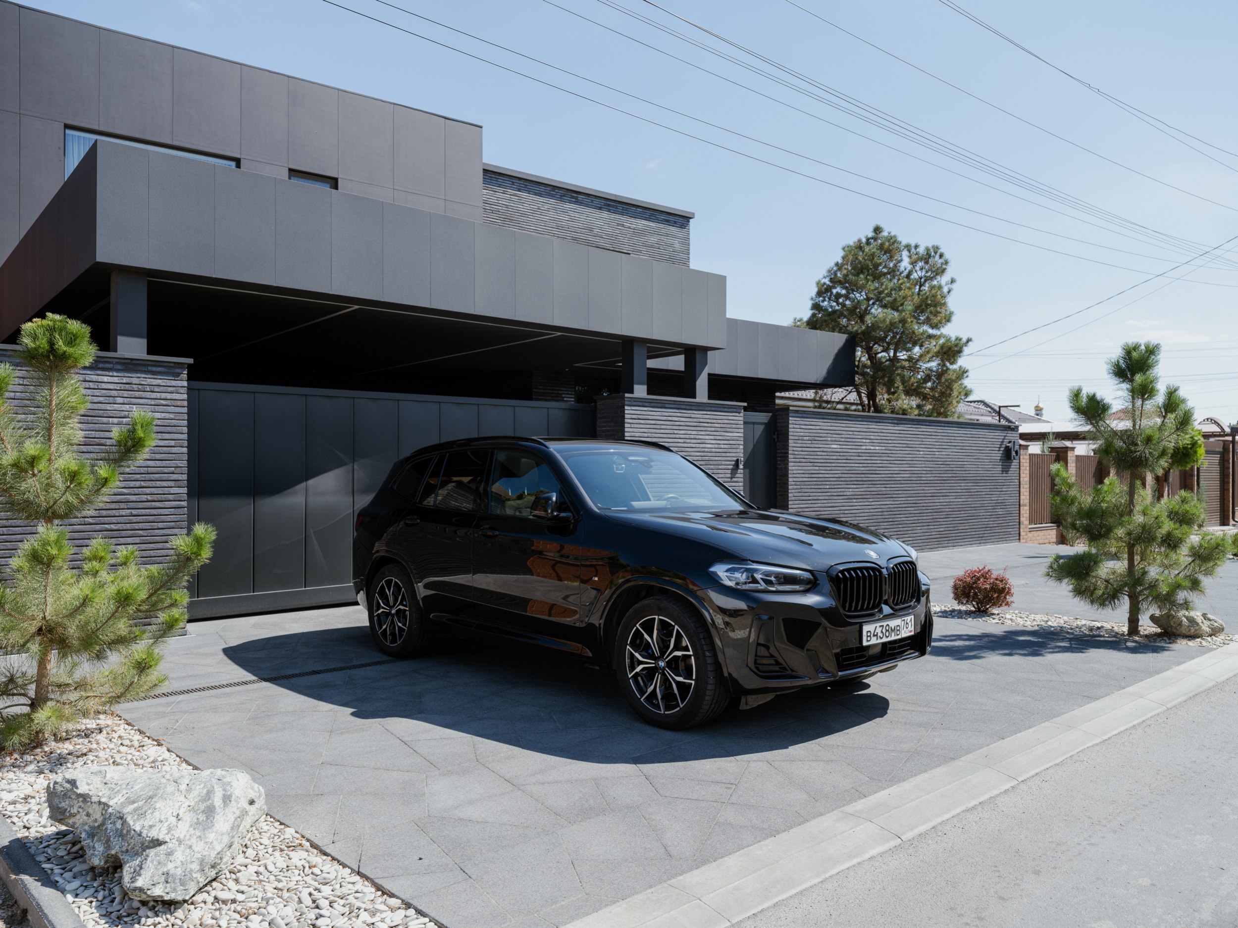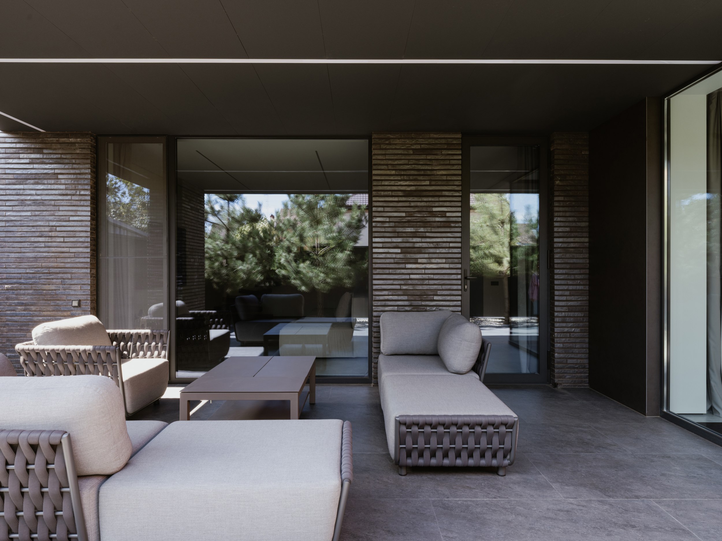 В основе экстерьера заложены кирпич ручной формовки и крупноформатные керамические панели. Мы сделали ставку не на контраст оттенков, а на глубину фактур. Чёрный цвет раскрывается через поверхности, поэтому облик интересно рассматривать. Плоская кровля продолжает линию современной архитектуры и подчёркивает графику объёма.