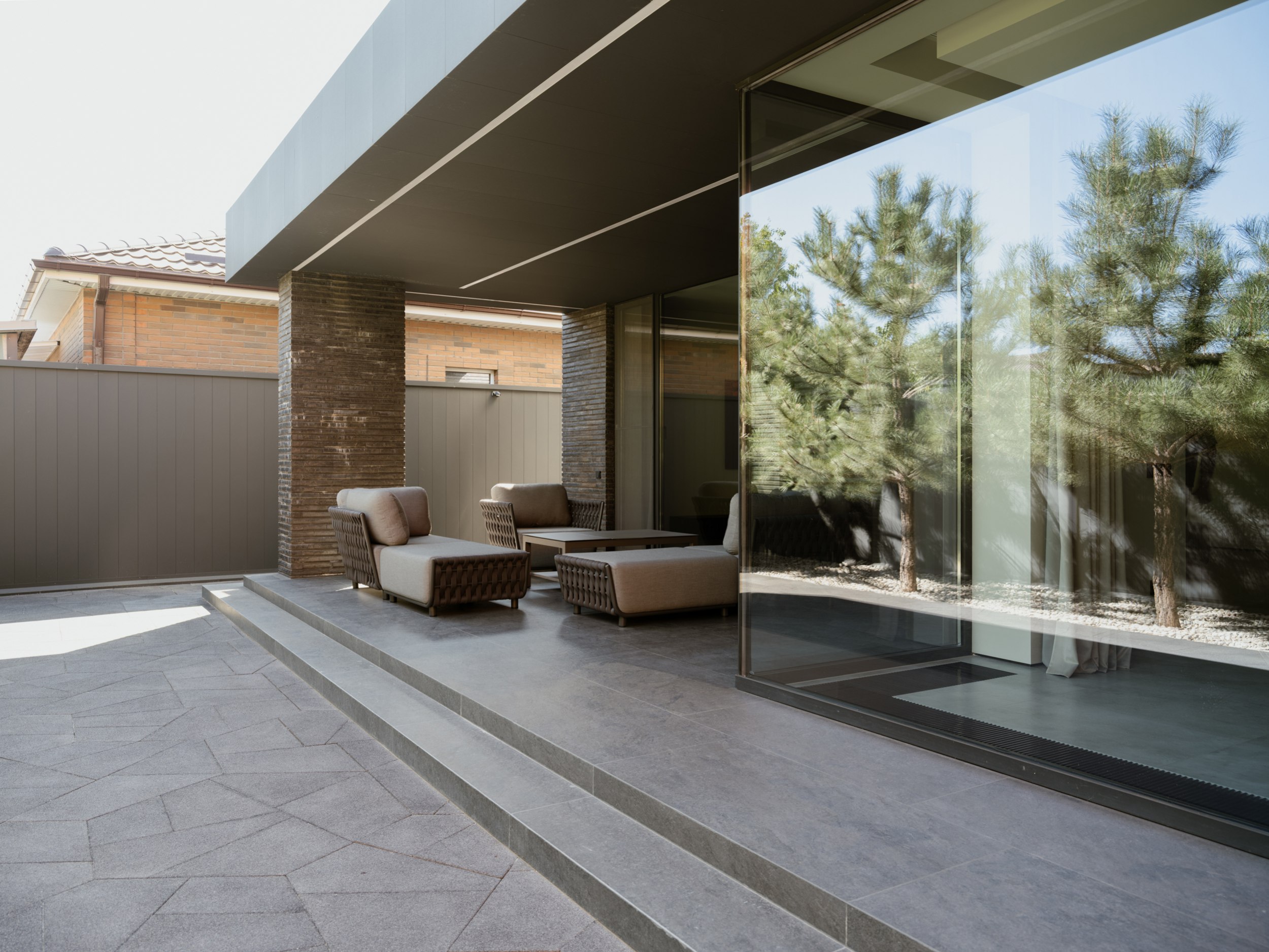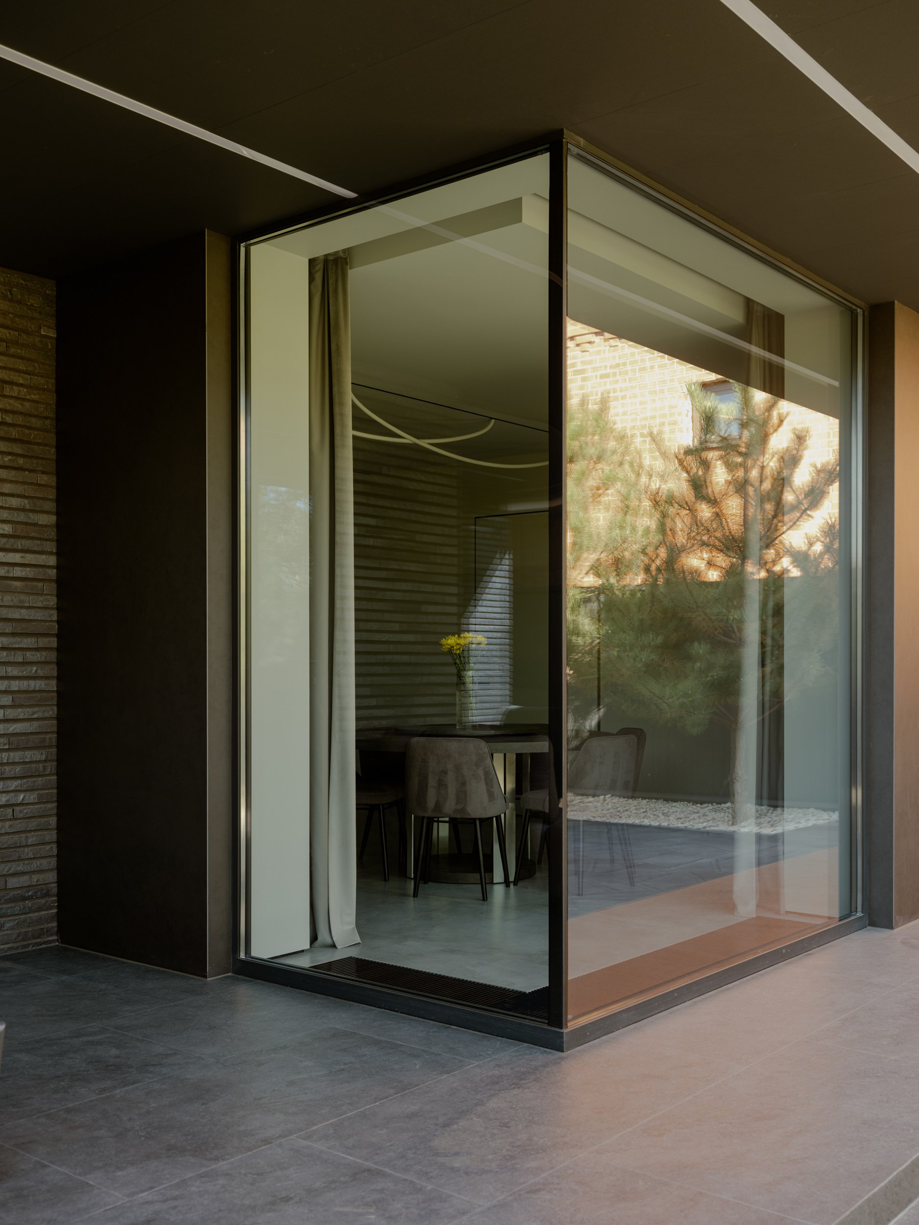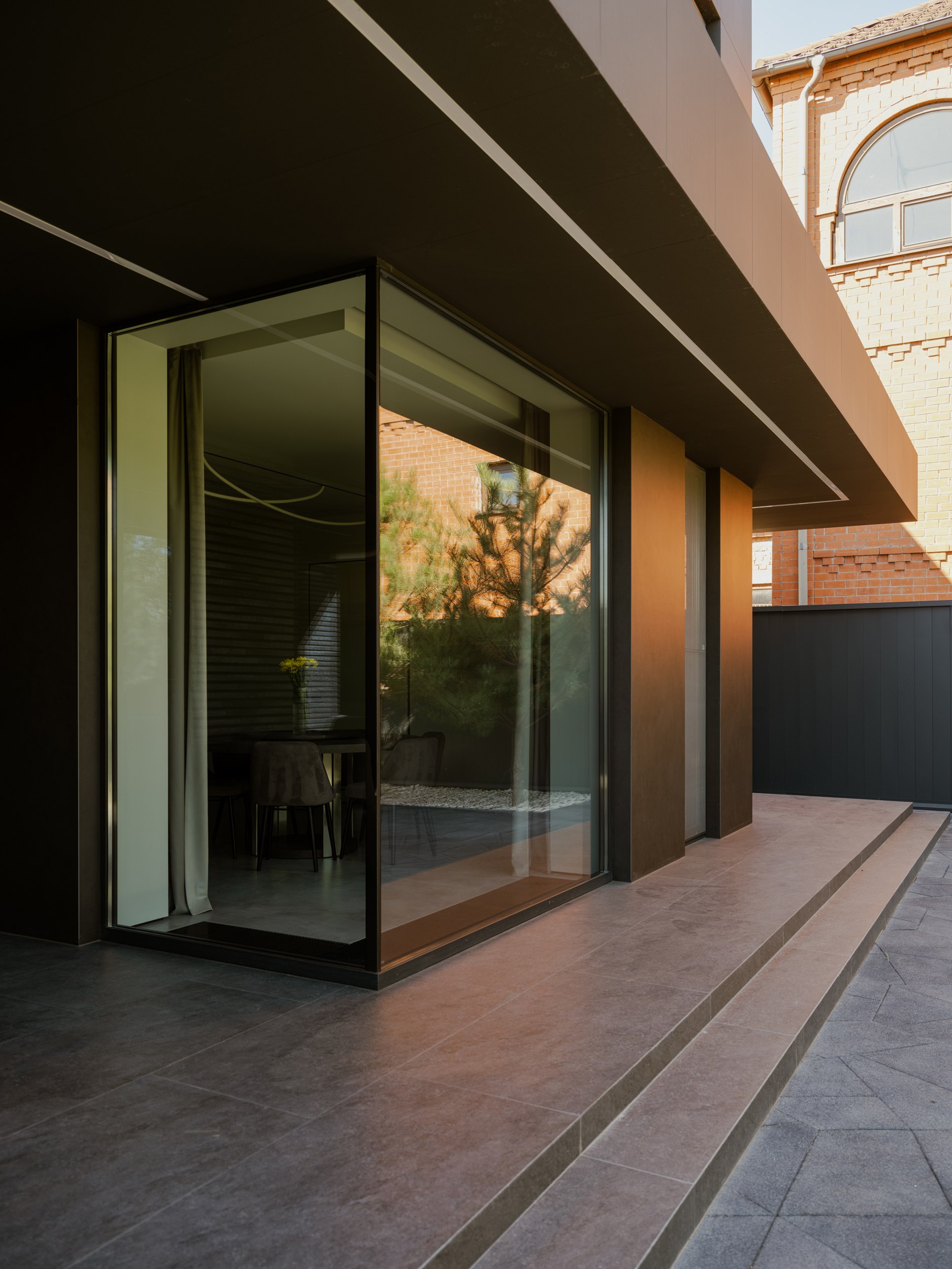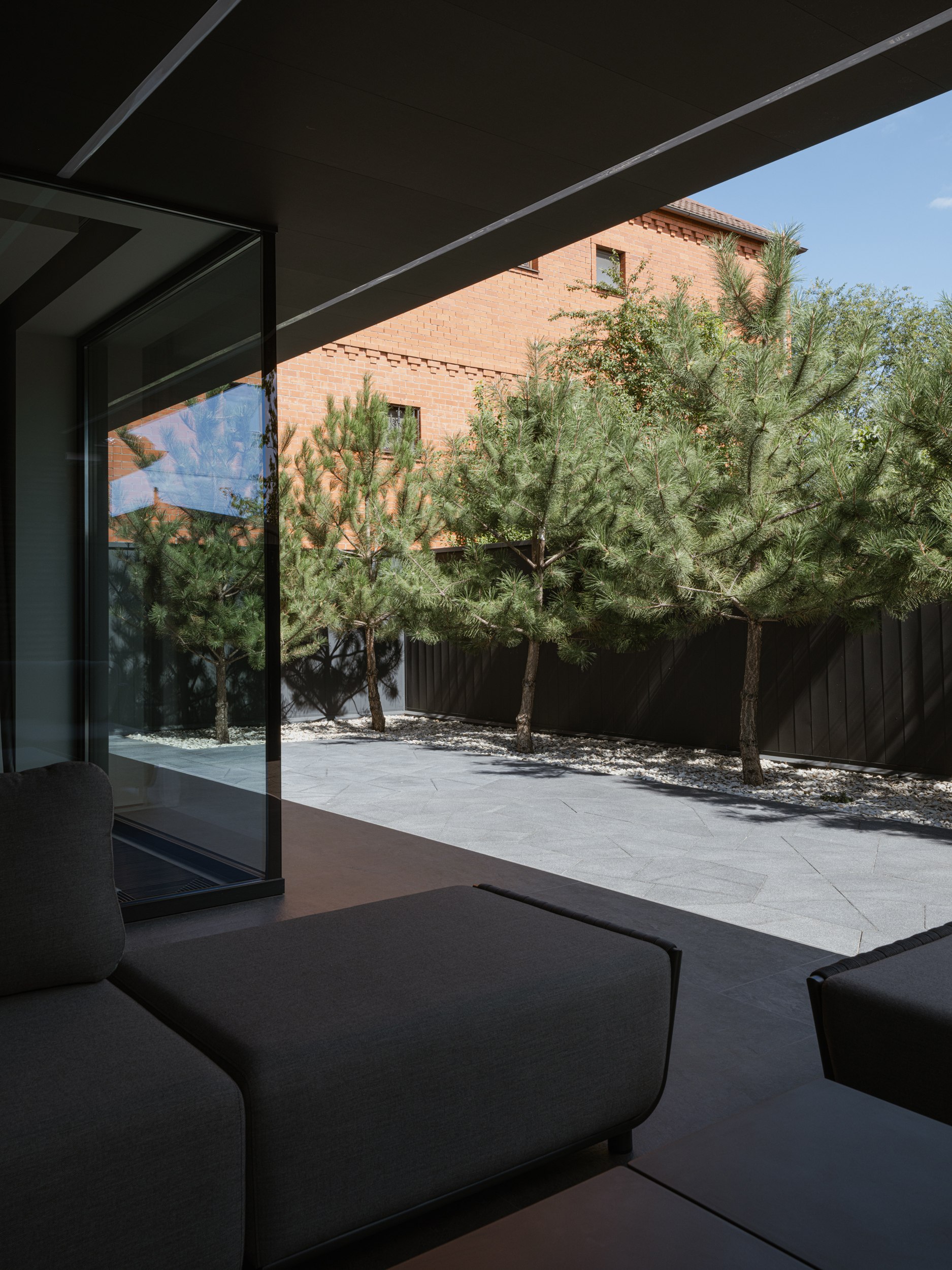 Внешне дом более закрыт и это продуманный ответ на локацию участка. Основное остекление развернуто во внутренний двор, формируя приватное пространство внутри городской среды. Несмотря на небольшую площадь, нам удалось создать полноценную зону отдыха, которая стала продолжением архитектуры. Она не отделена от дома, а интегрирована в его логику, как ещё один уровень личной территории.