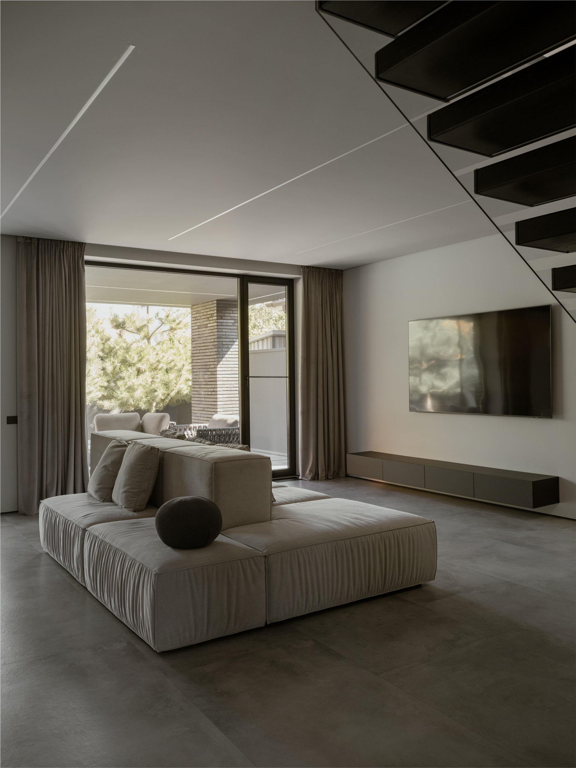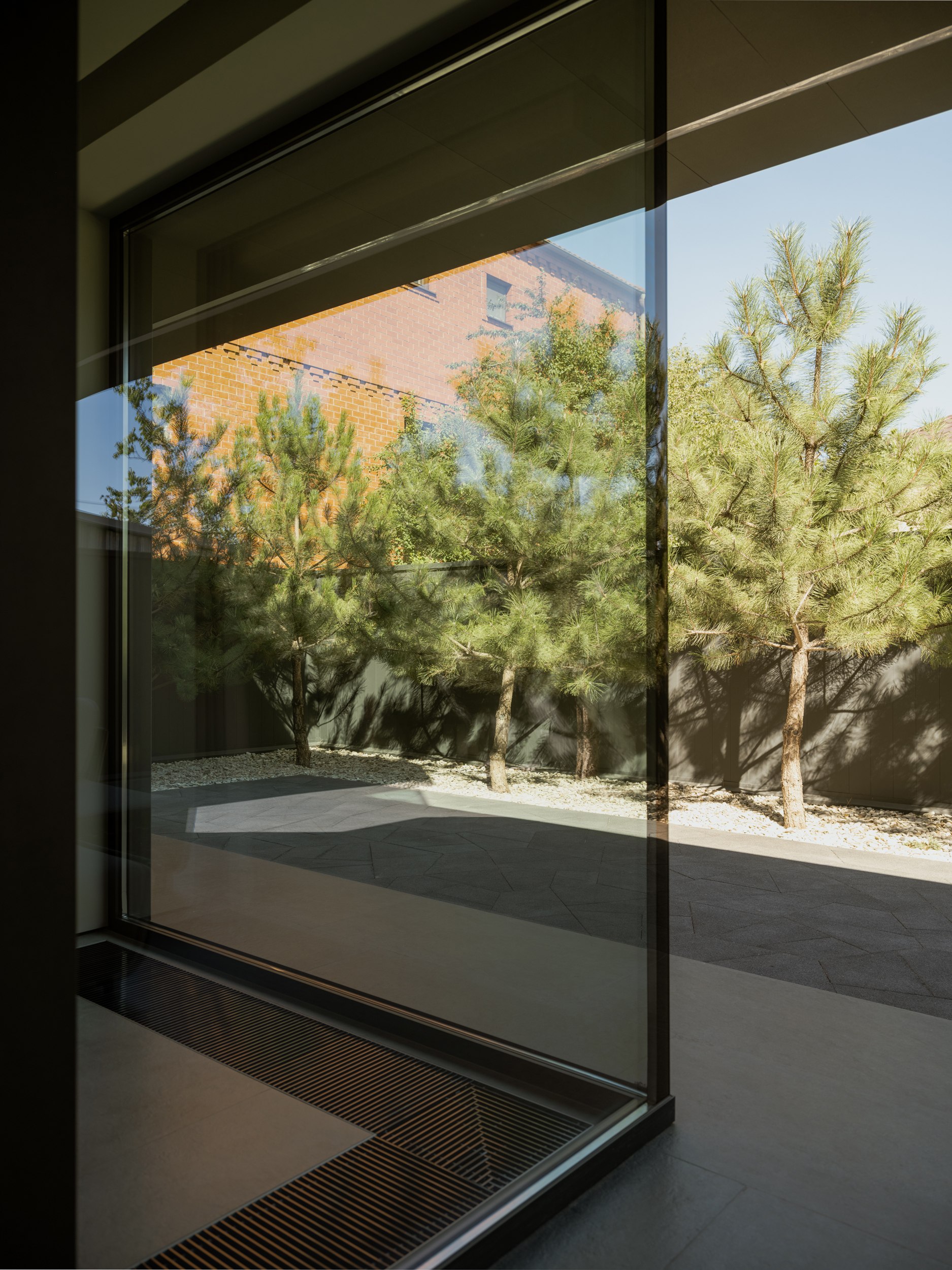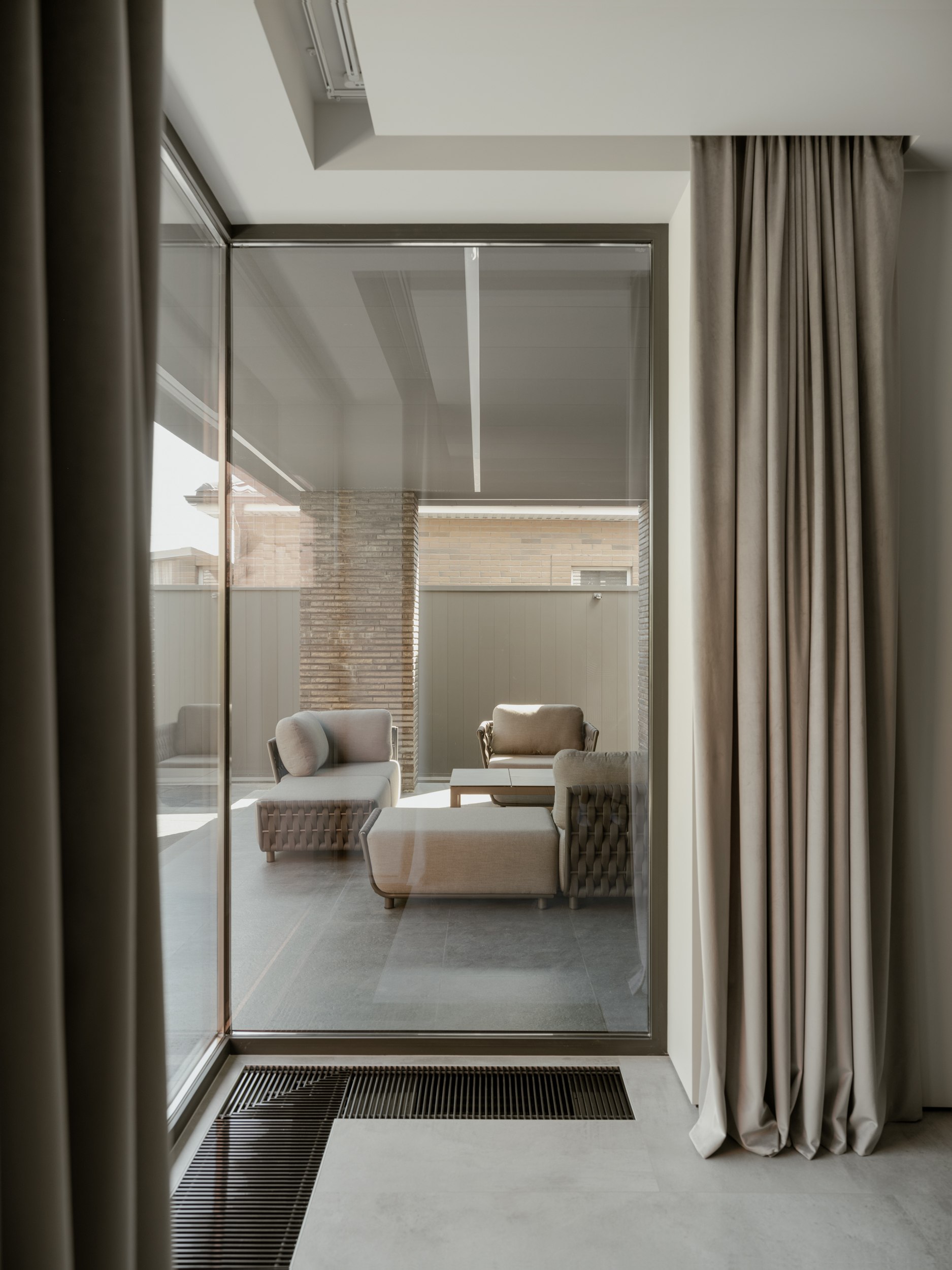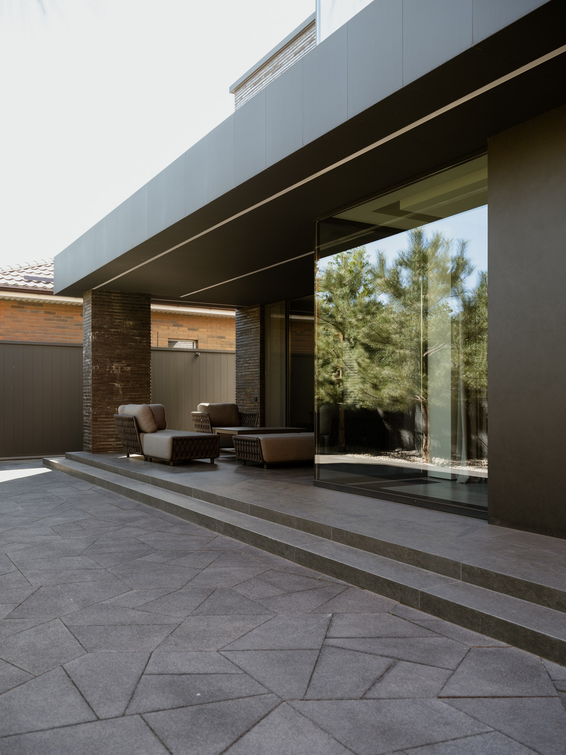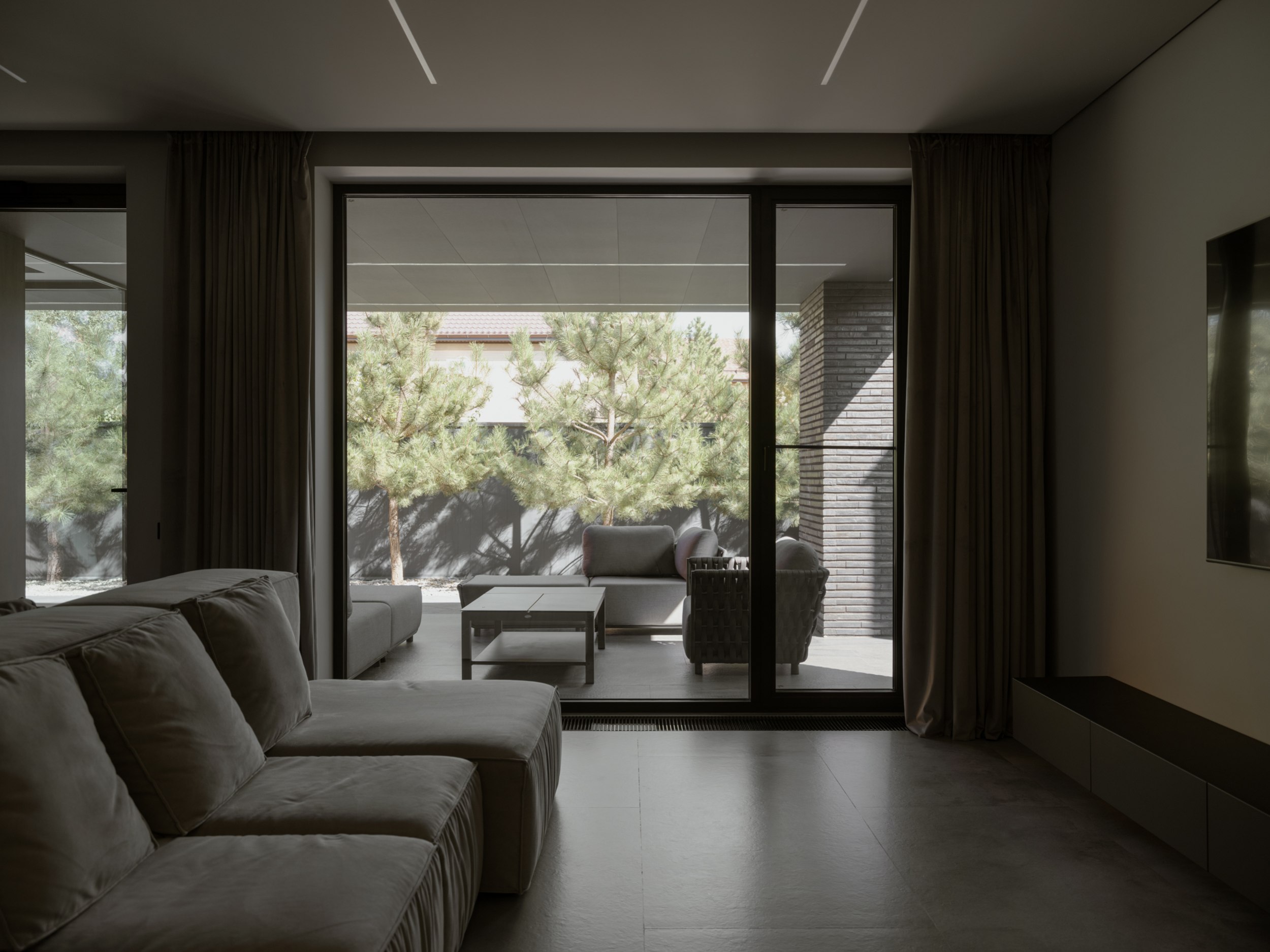 Внешне дом более закрыт и это продуманный ответ на локацию участка. Основное остекление развернуто во внутренний двор, формируя приватное пространство внутри городской среды. Несмотря на небольшую площадь, нам удалось создать полноценную зону отдыха, которая стала продолжением архитектуры. Она не отделена от дома, а интегрирована в его логику, как ещё один уровень личной территории.