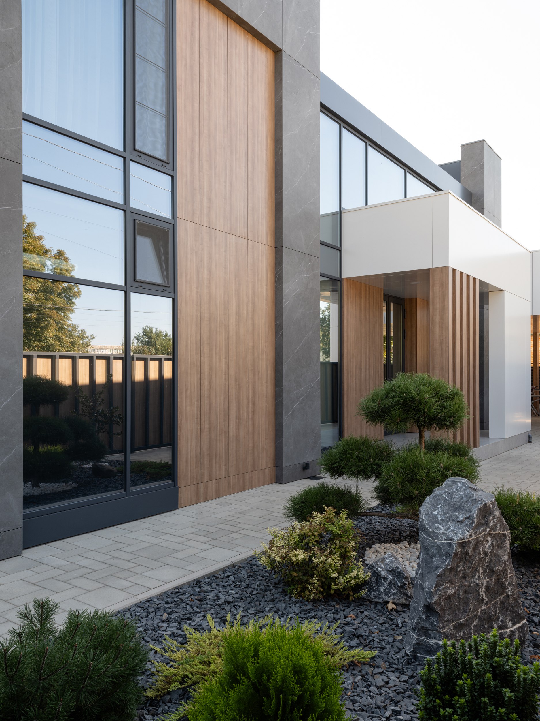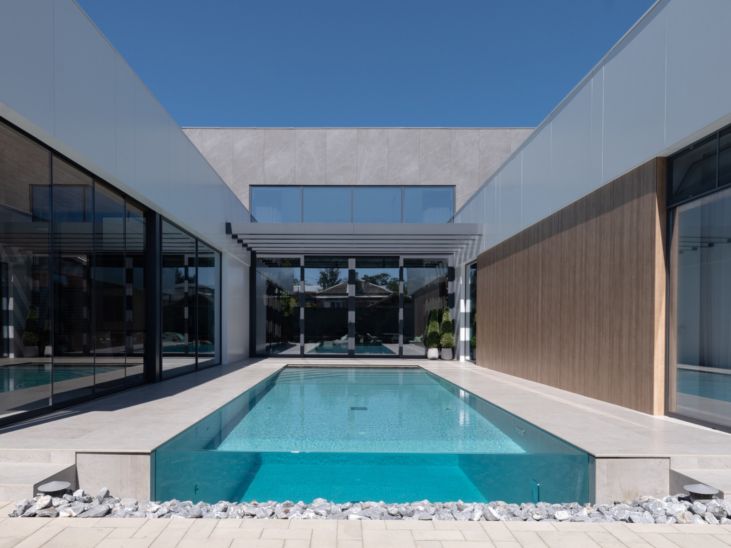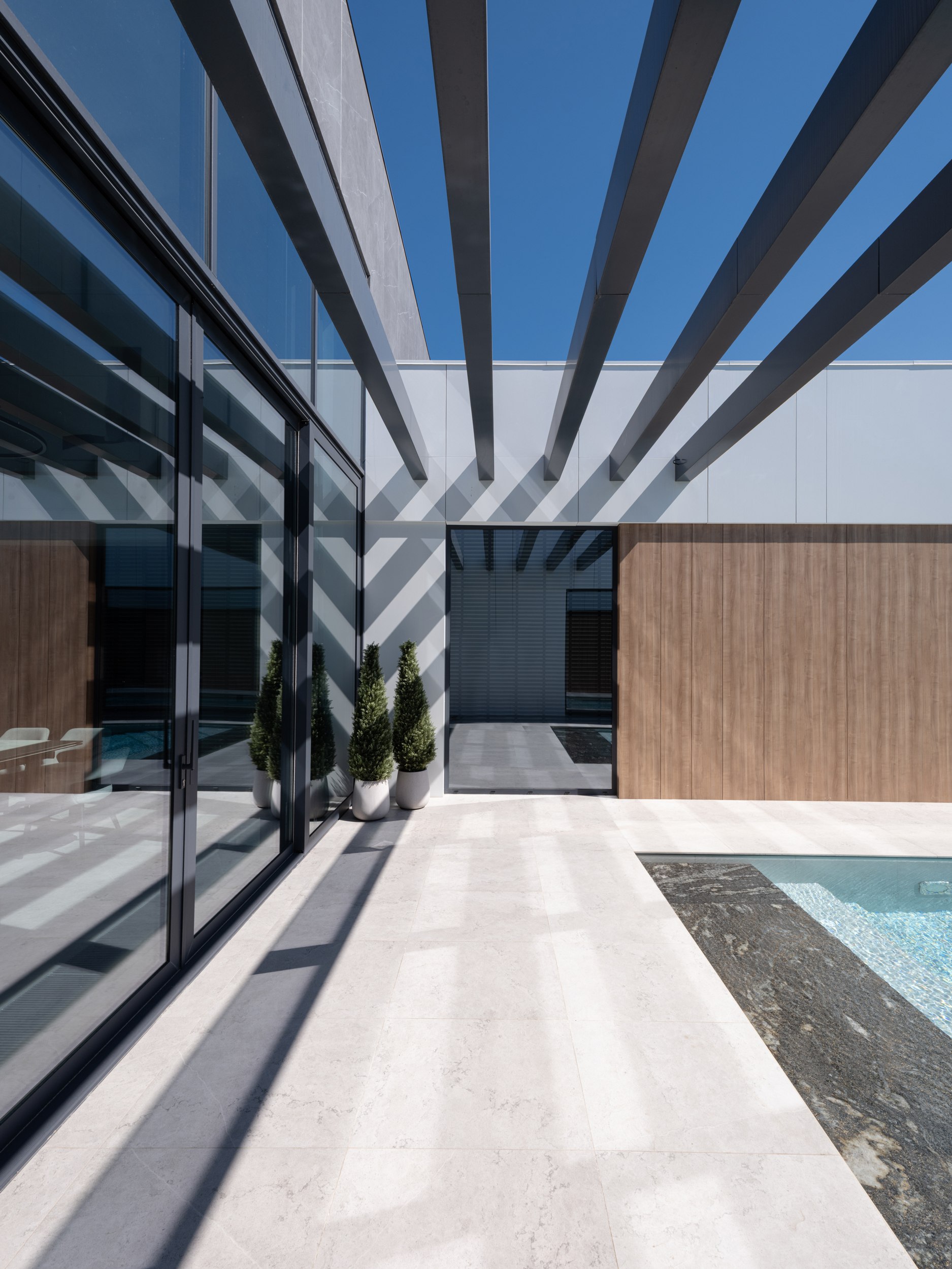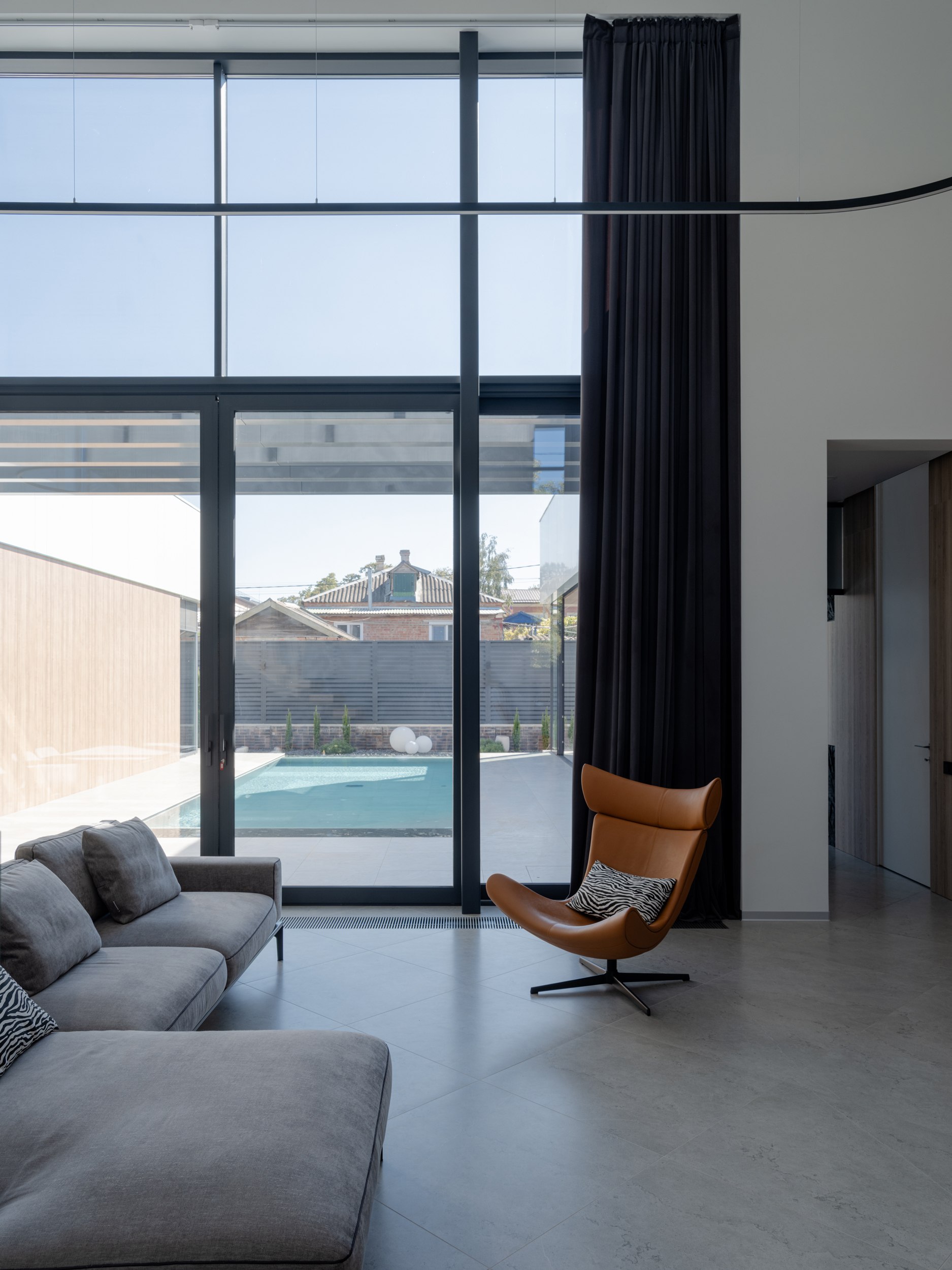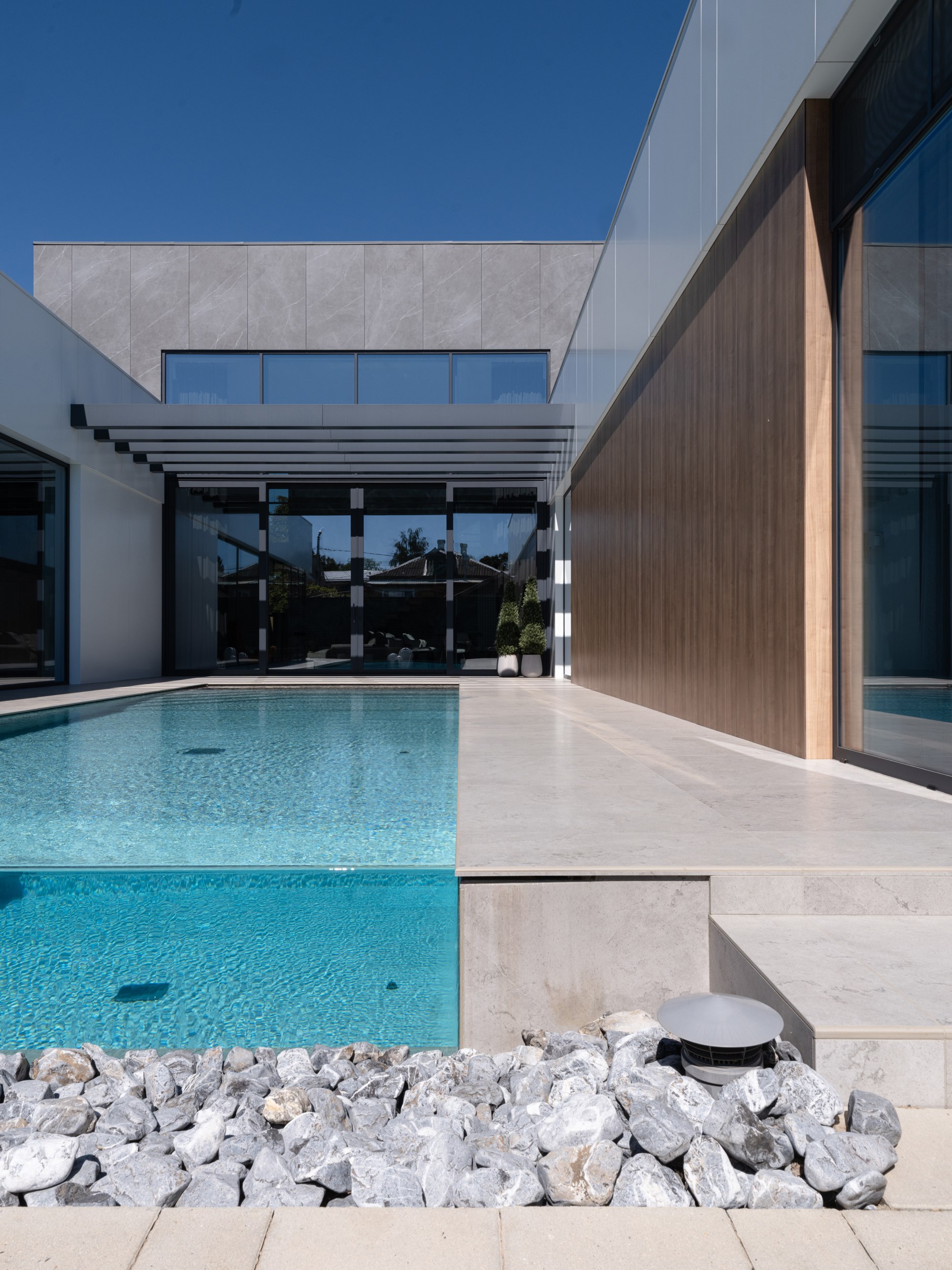 Дом имеет П-образную форму. В центре размещена общая зона со вторым светом, а по бокам примыкают приватный блок со спальнями и полноценная SPA-зона. Одним из смысловых центров стал закрытый внутренний двор. Здесь главную роль играет переливной бассейн со стеклянной гранью, создающий эффект «воды вне гравитации». Мы использовали единый материал для напольного покрытия внутри дома, на террасе и в бассейне, что визуально объединило интерьер и экстерьер. Во внешней отделке применены фактурные керамические панели в сочетании с композитными металлическими элементами и HPL-панелями под дерево.