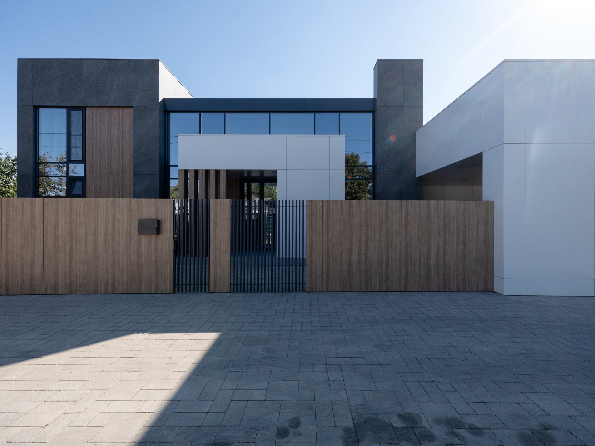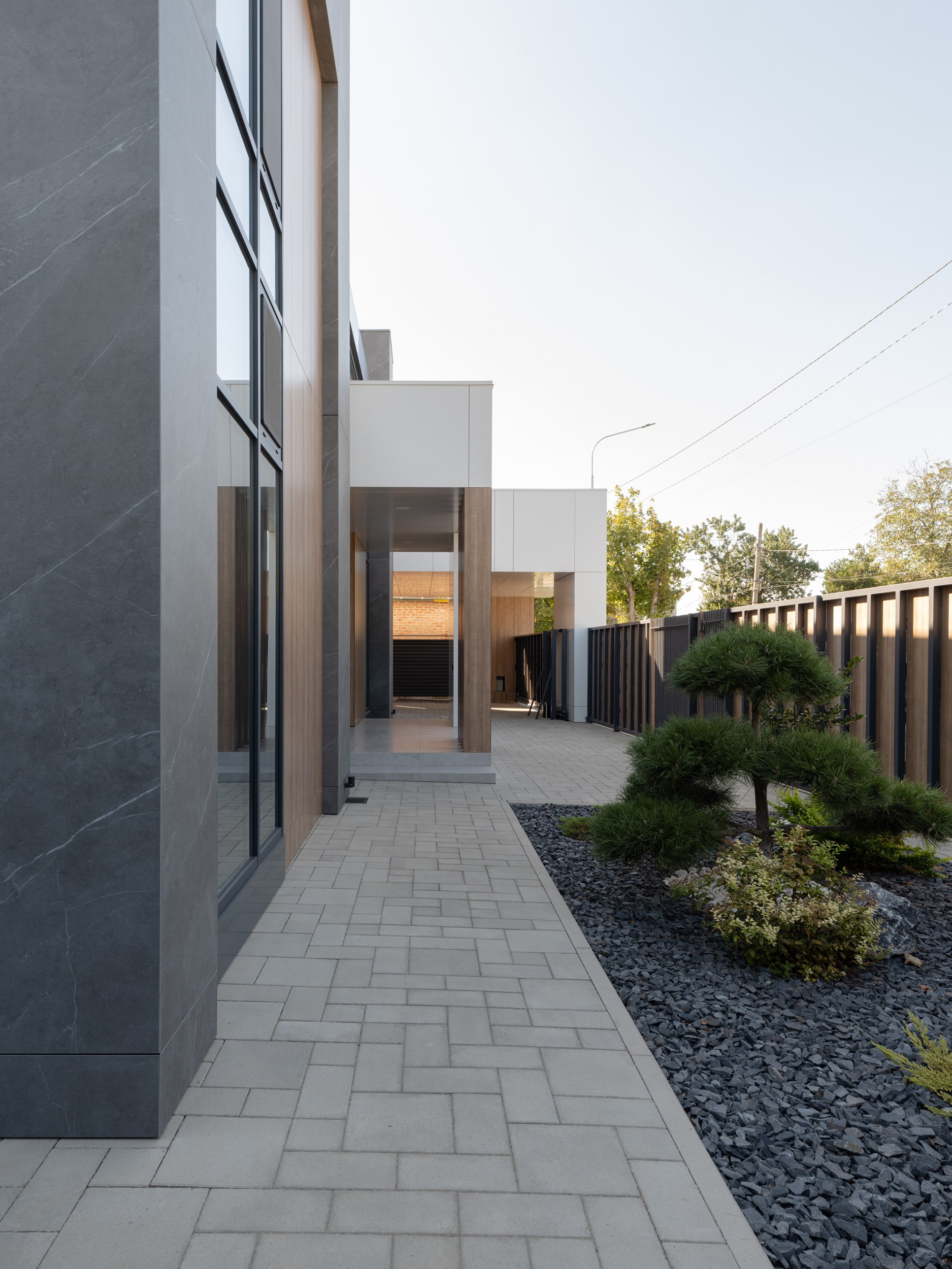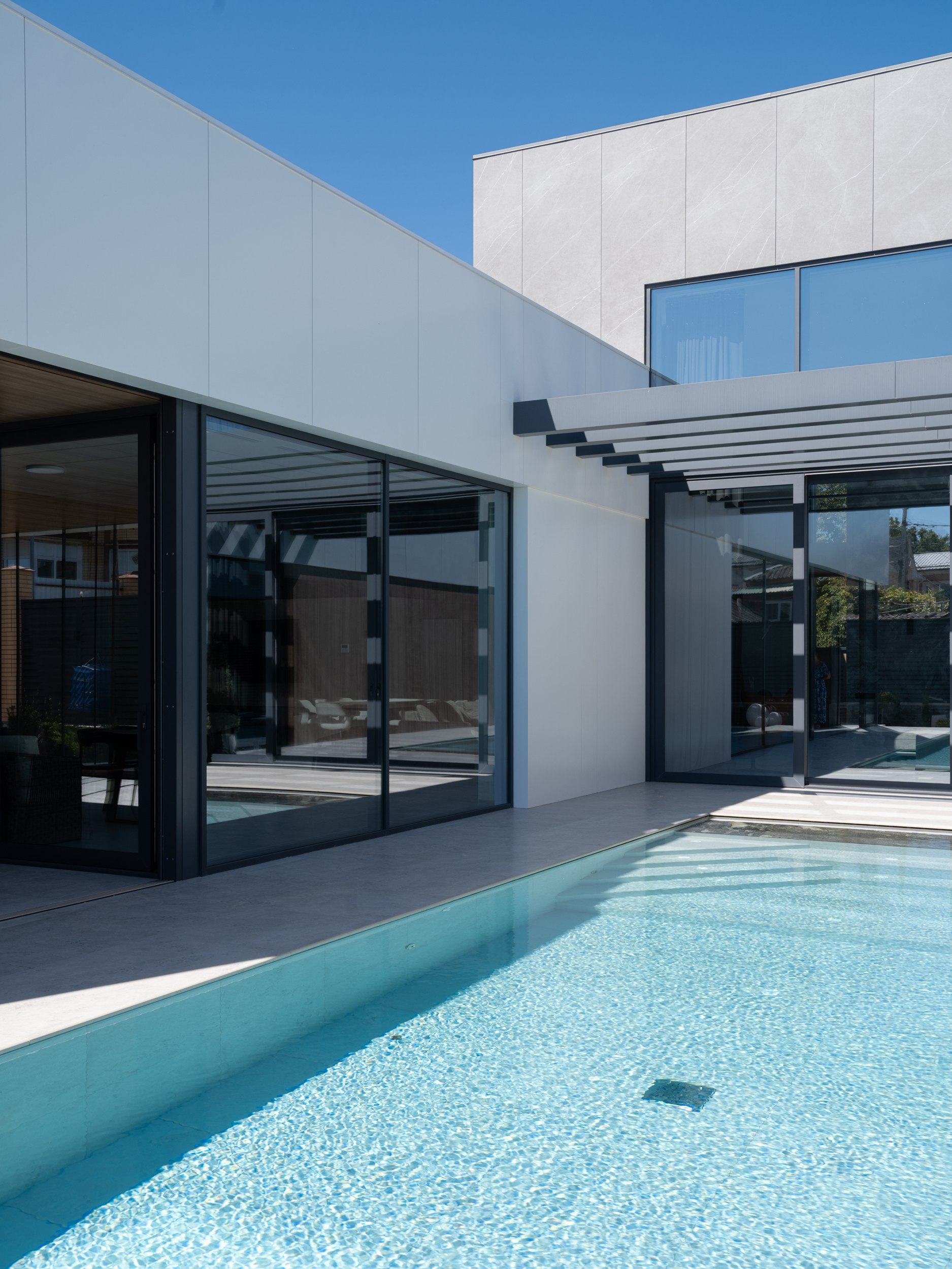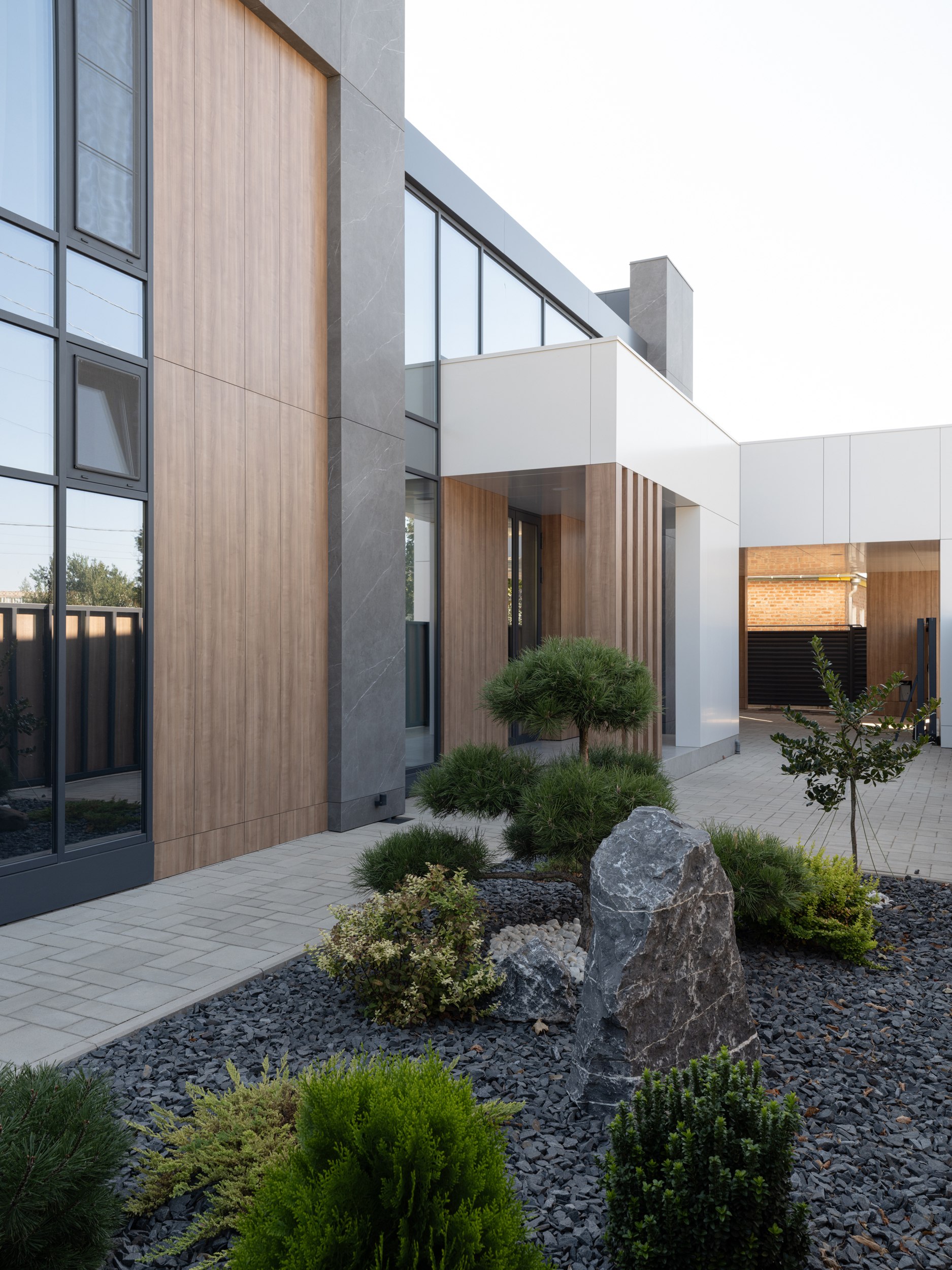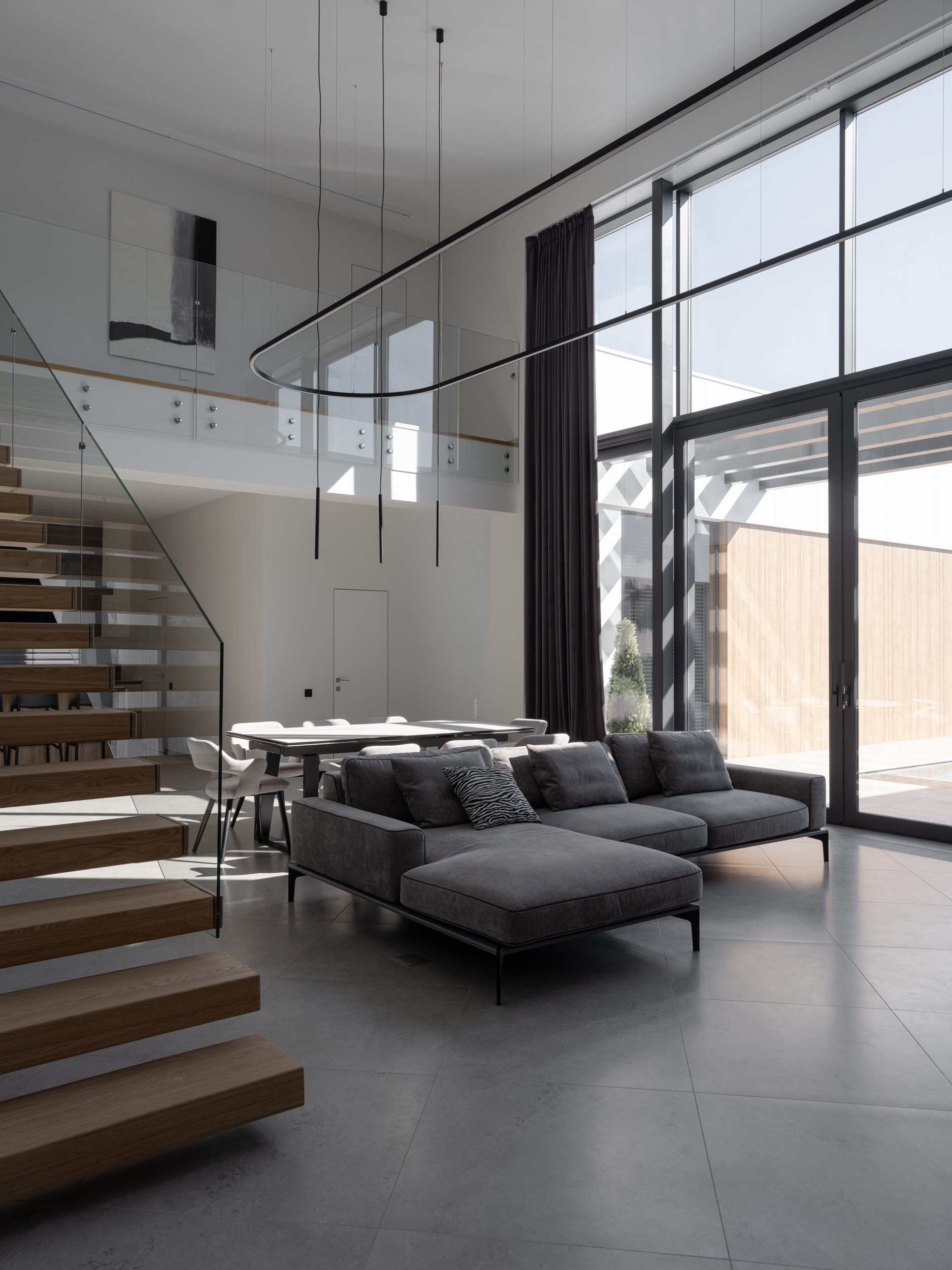 Дом имеет П-образную форму. В центре размещена общая зона со вторым светом, а по бокам примыкают приватный блок со спальнями и полноценная SPA-зона. Одним из смысловых центров стал закрытый внутренний двор. Здесь главную роль играет переливной бассейн со стеклянной гранью, создающий эффект «воды вне гравитации». Мы использовали единый материал для напольного покрытия внутри дома, на террасе и в бассейне, что визуально объединило интерьер и экстерьер. Во внешней отделке применены фактурные керамические панели в сочетании с композитными металлическими элементами и HPL-панелями под дерево.