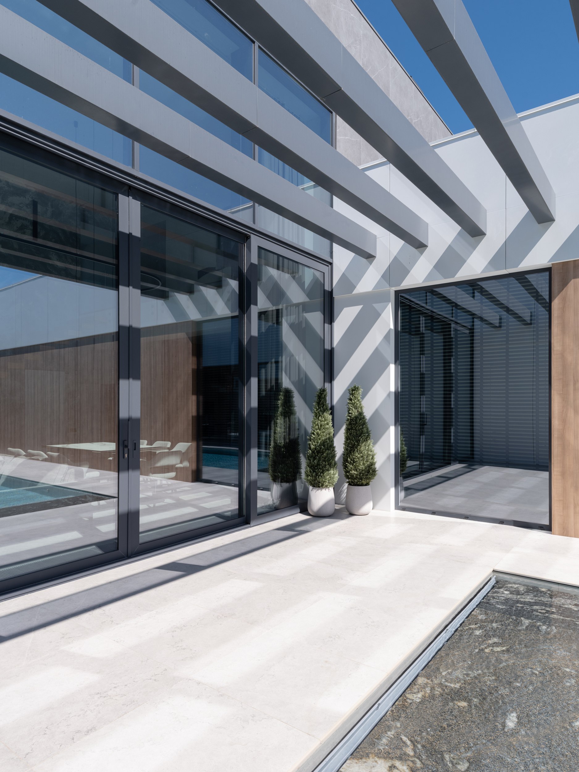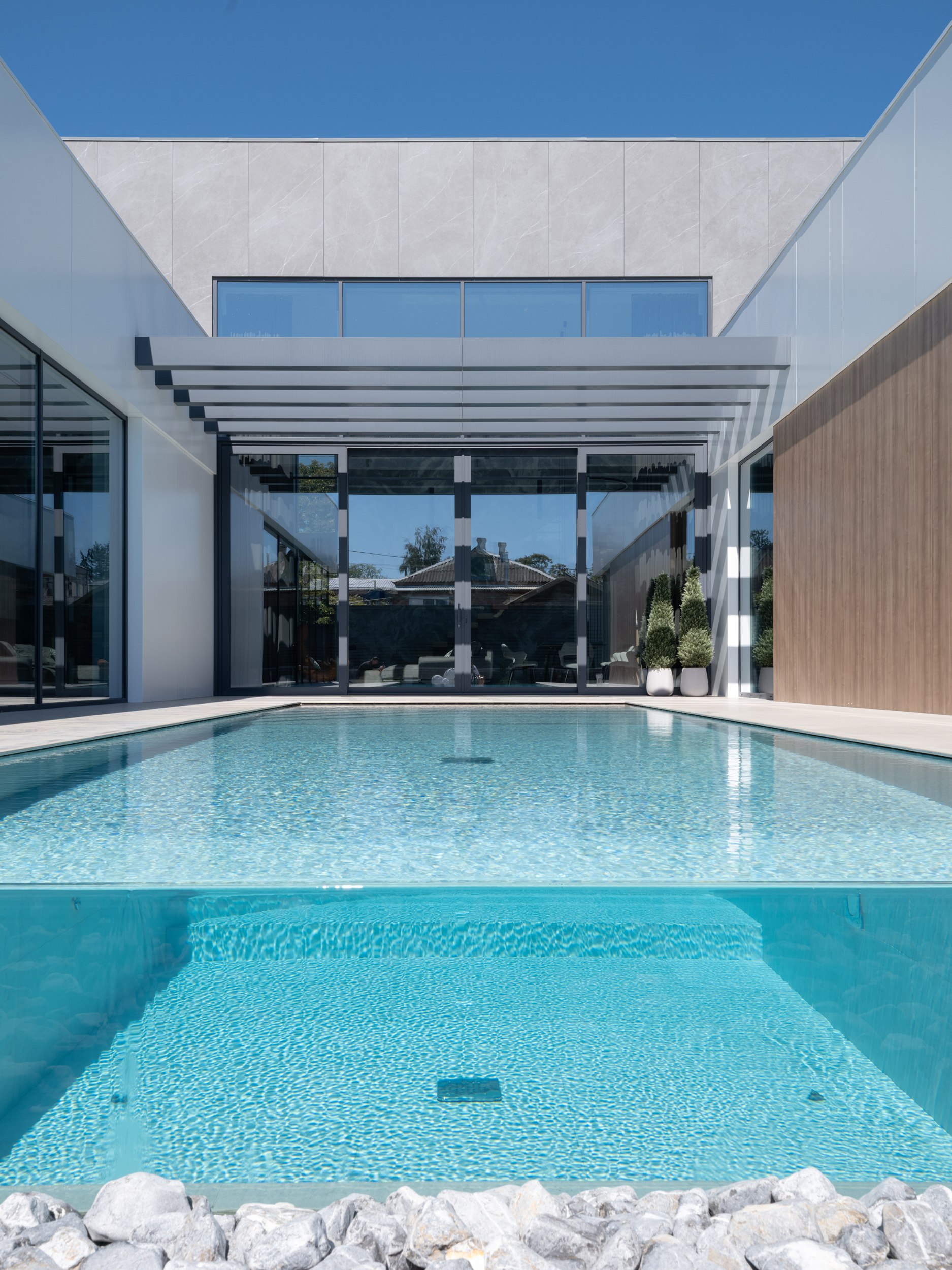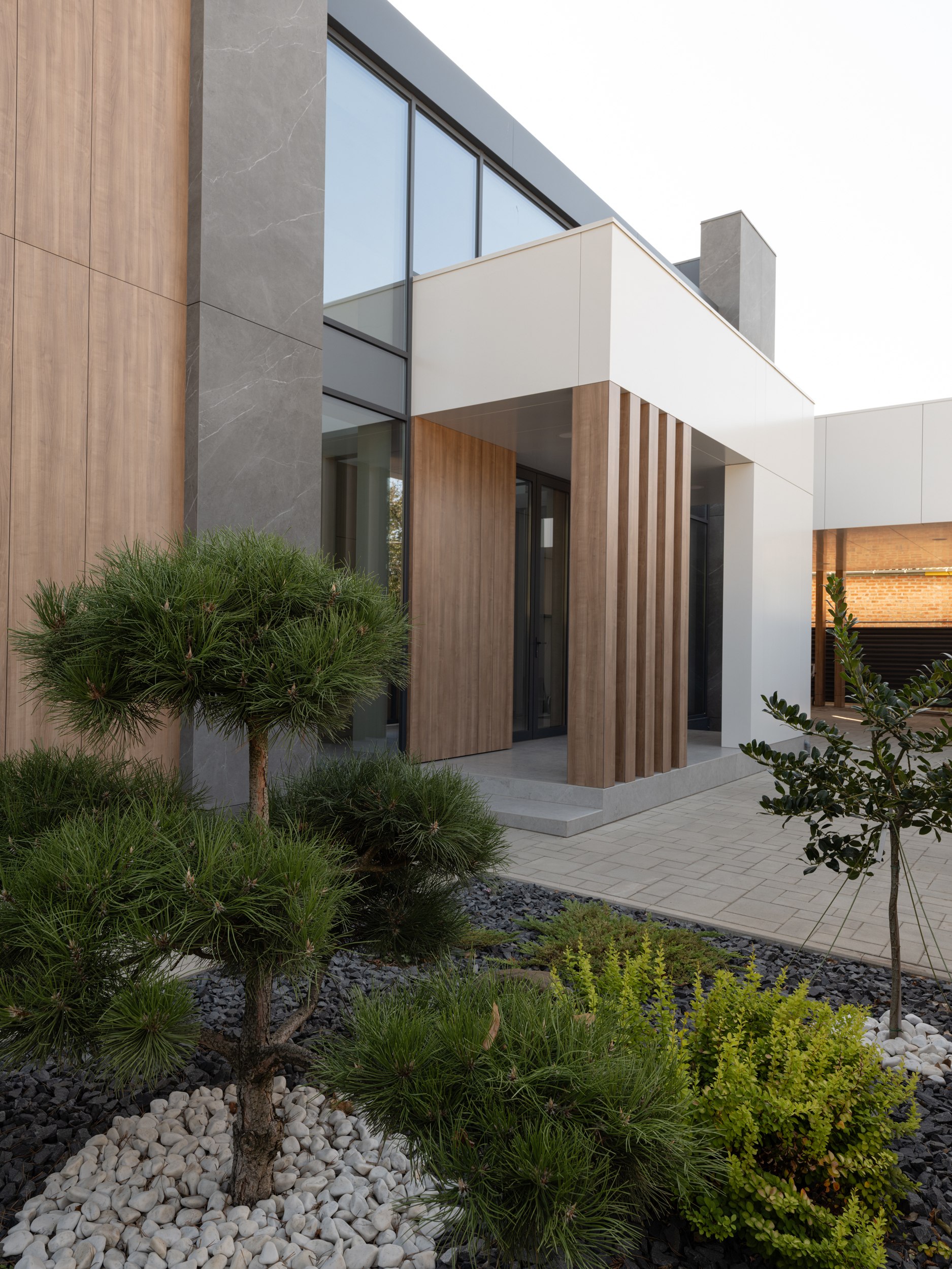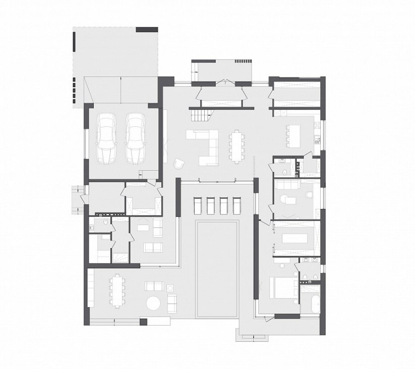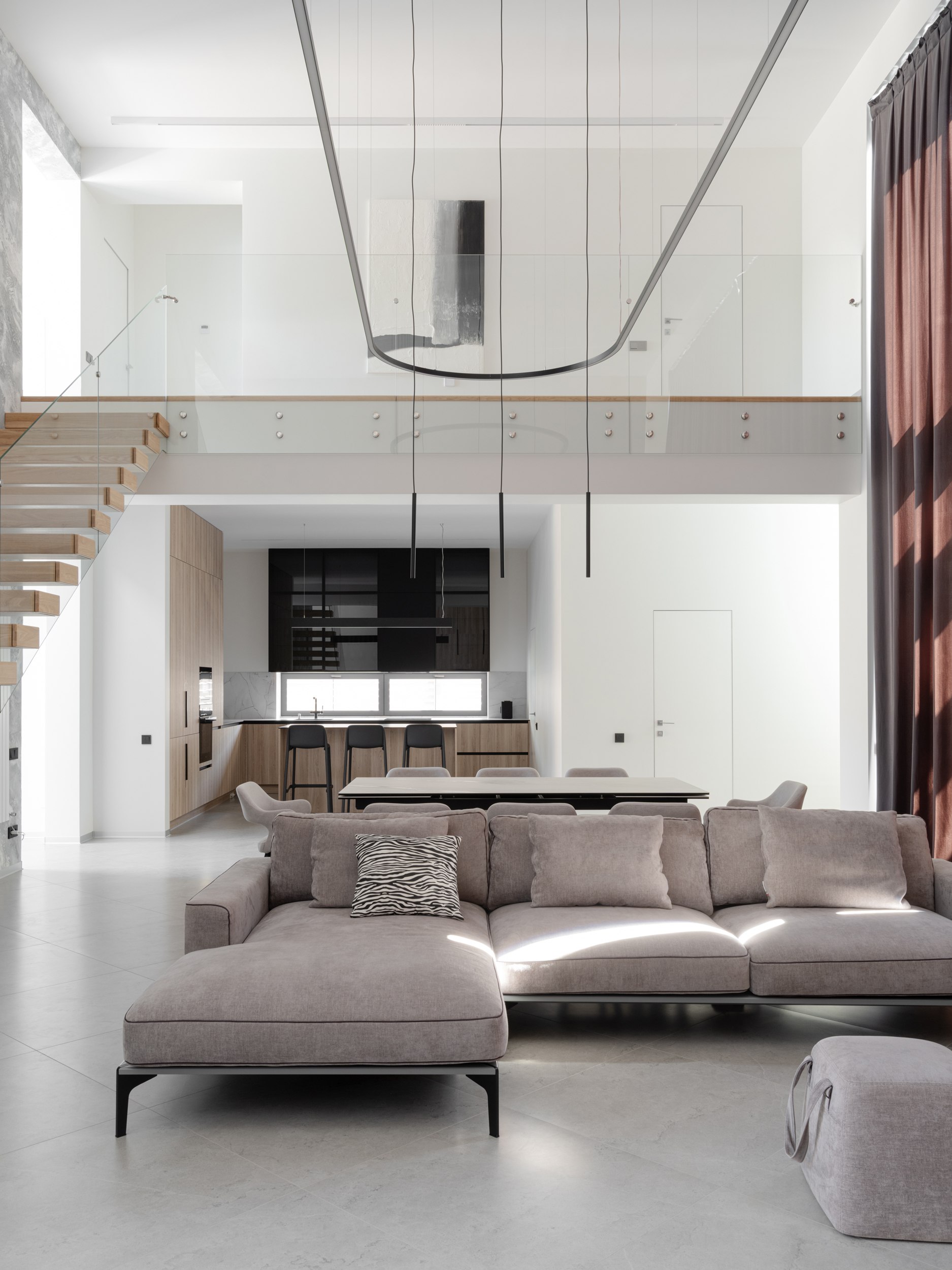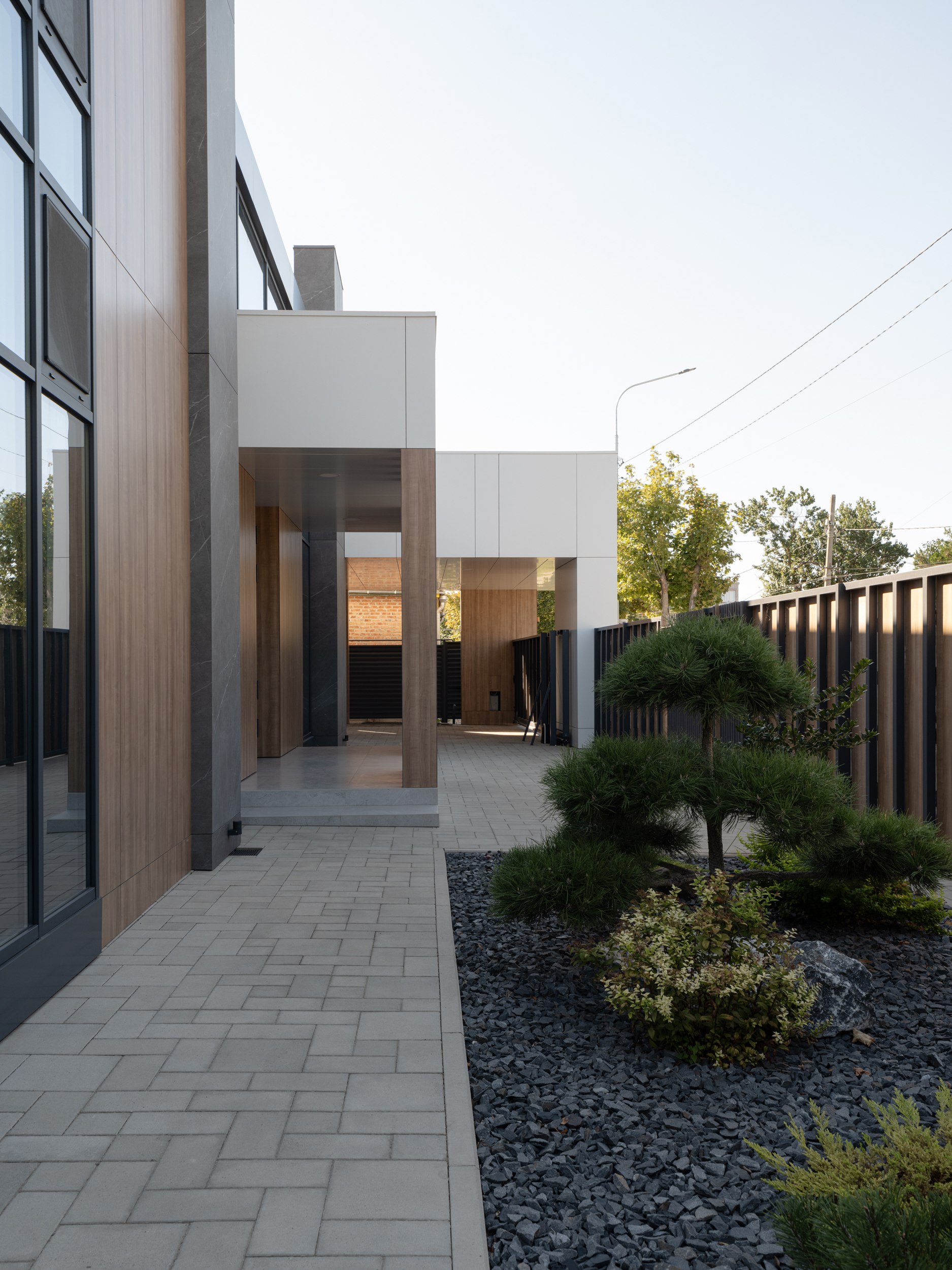 Дом имеет П-образную форму. В центре размещена общая зона со вторым светом, а по бокам примыкают приватный блок со спальнями и полноценная SPA-зона. Одним из смысловых центров стал закрытый внутренний двор. Здесь главную роль играет переливной бассейн со стеклянной гранью, создающий эффект «воды вне гравитации». Мы использовали единый материал для напольного покрытия внутри дома, на террасе и в бассейне, что визуально объединило интерьер и экстерьер. Во внешней отделке применены фактурные керамические панели в сочетании с композитными металлическими элементами и HPL-панелями под дерево.