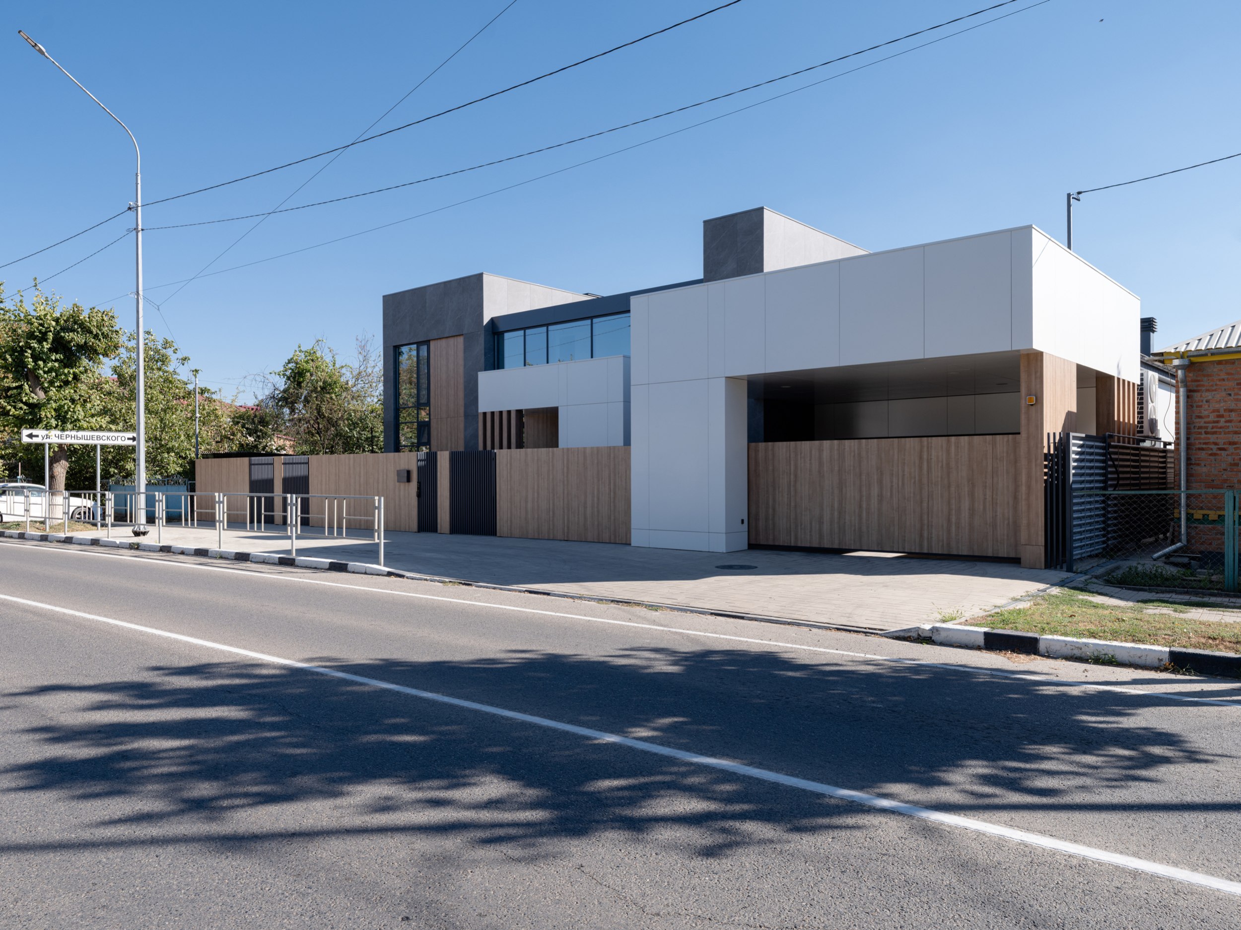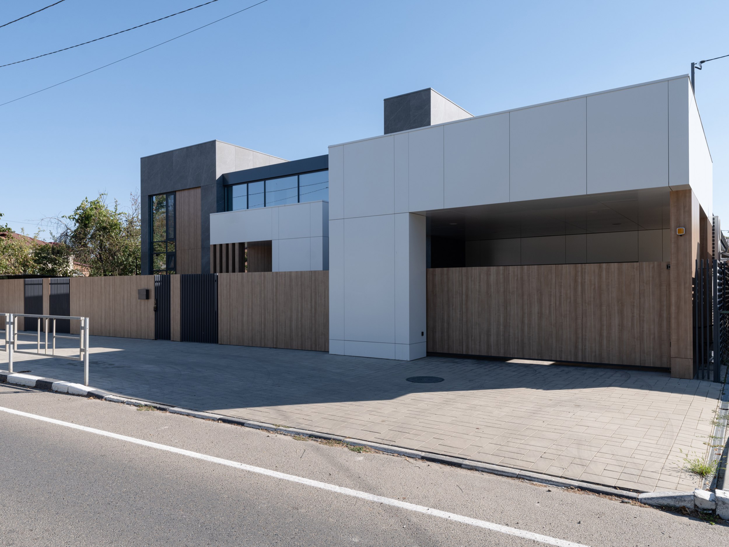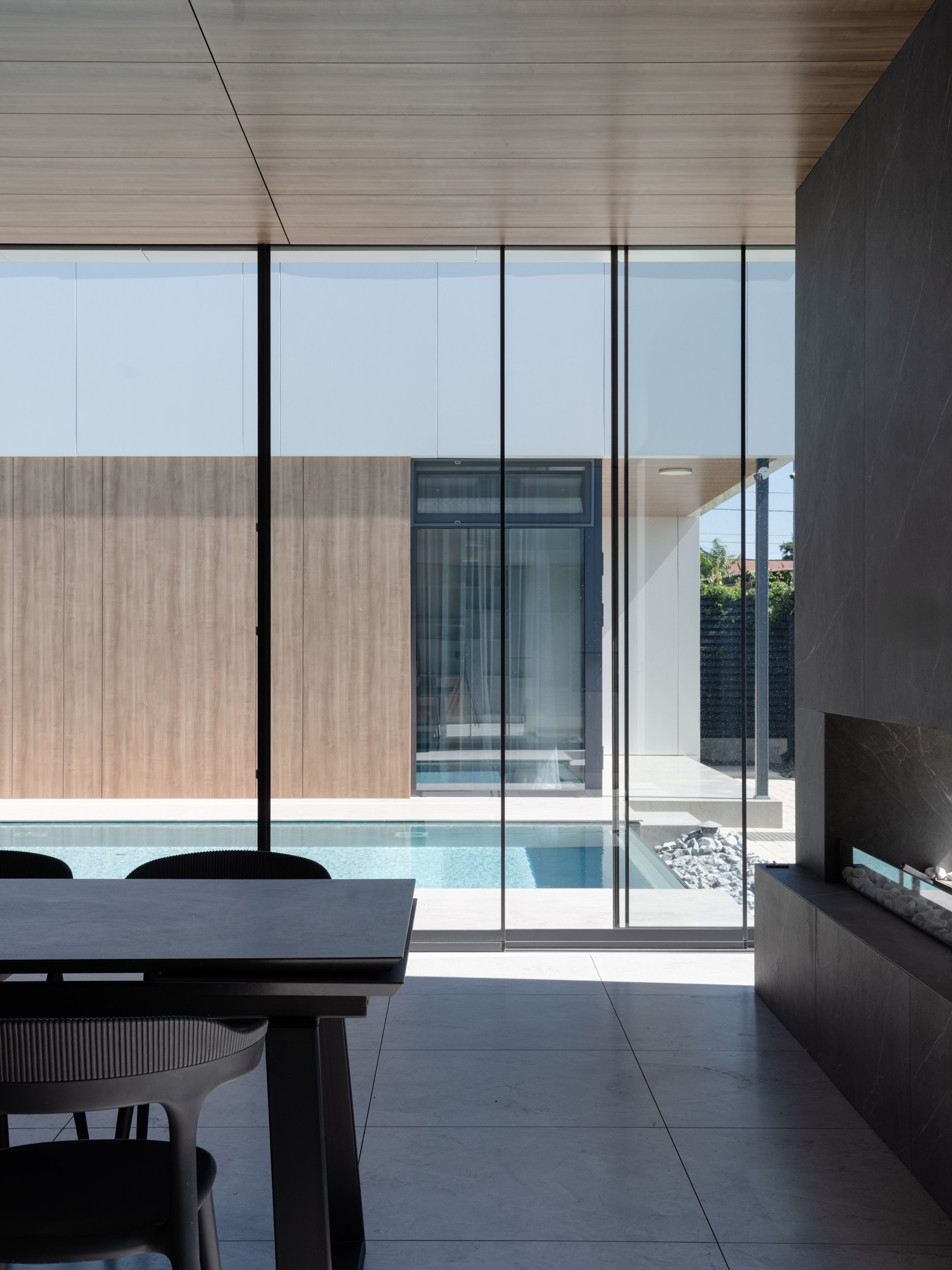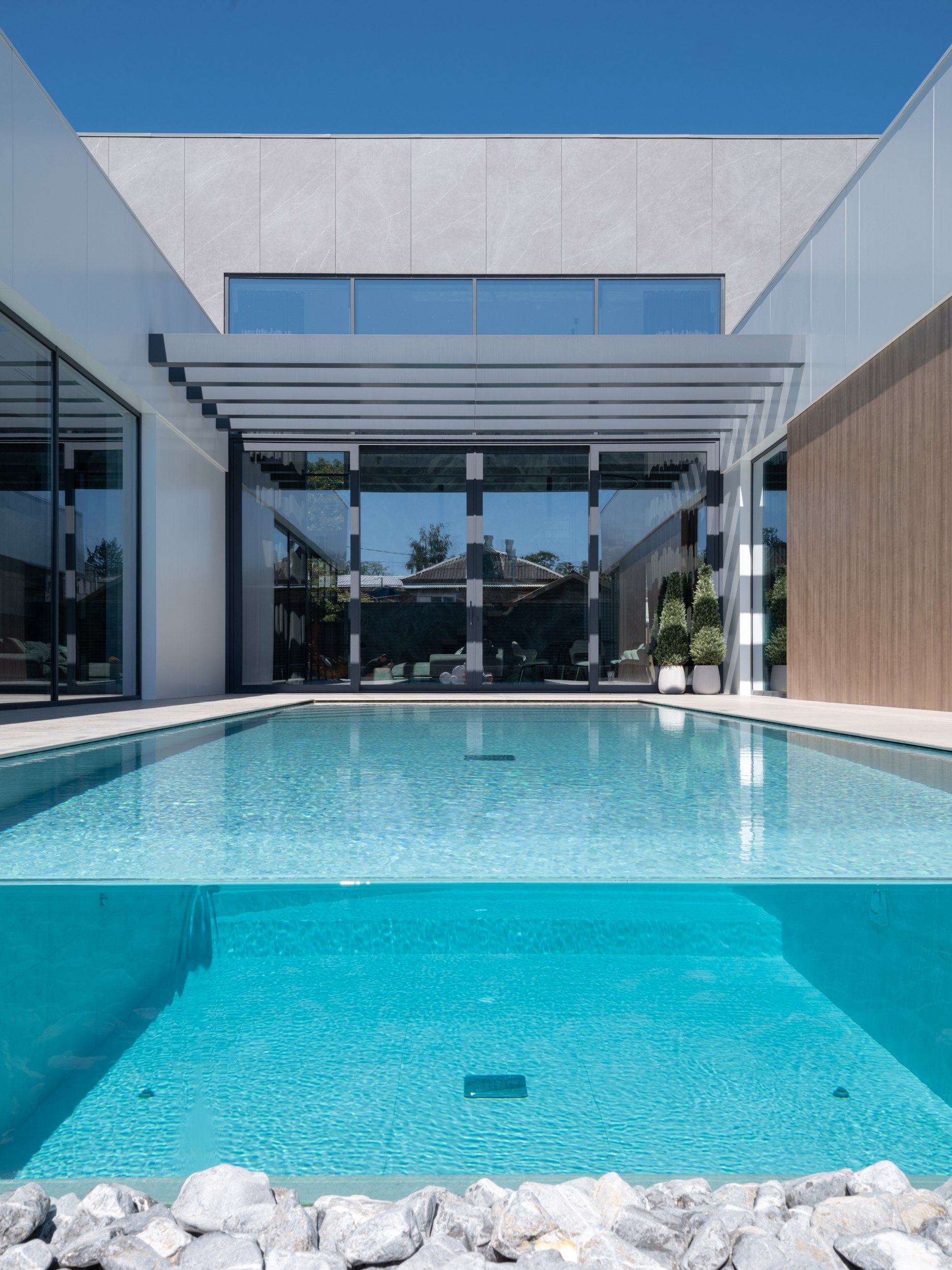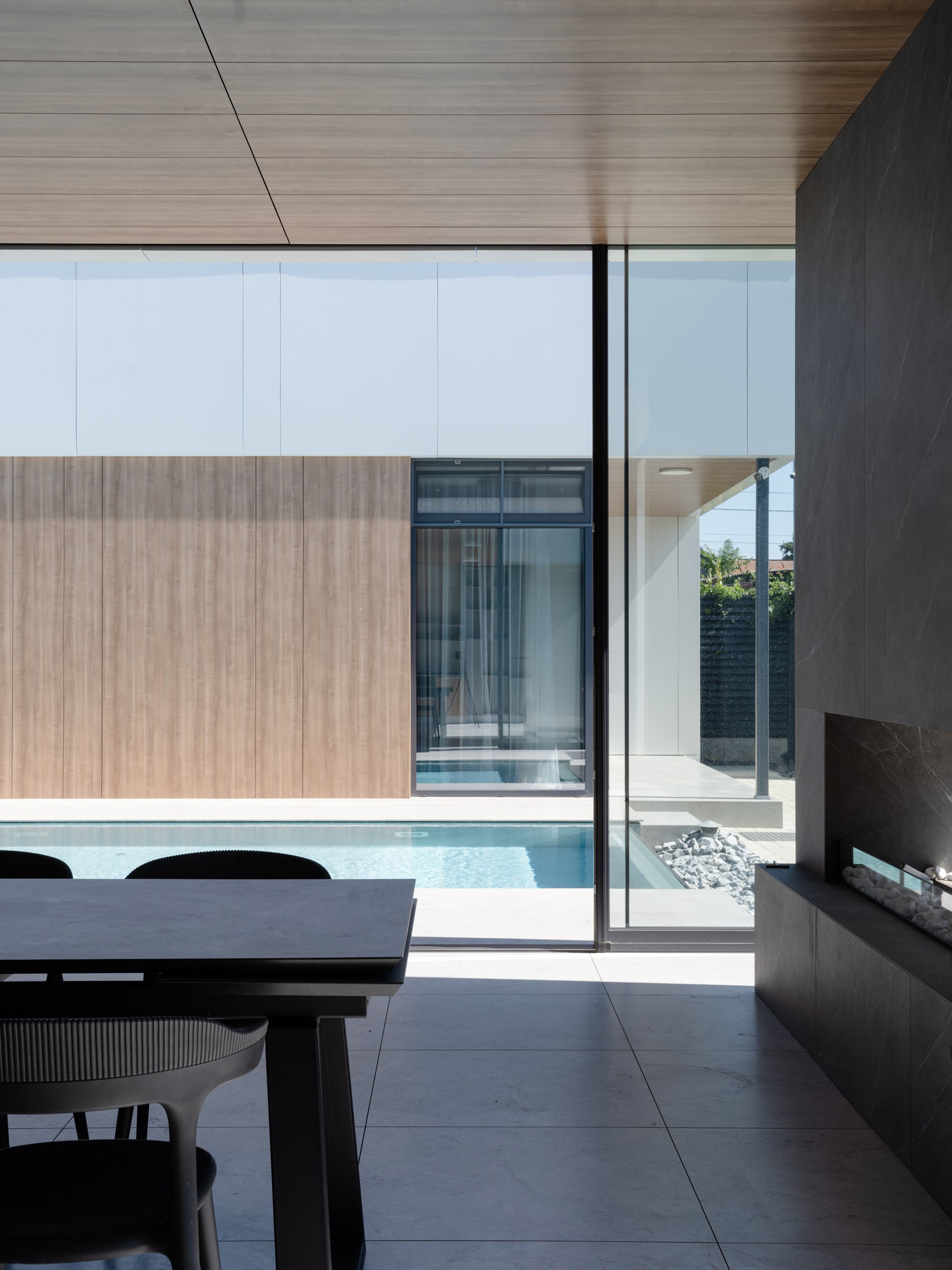 Дом имеет П-образную форму. В центре размещена общая зона со вторым светом, а по бокам примыкают приватный блок со спальнями и полноценная SPA-зона. Одним из смысловых центров стал закрытый внутренний двор. Здесь главную роль играет переливной бассейн со стеклянной гранью, создающий эффект «воды вне гравитации». Мы использовали единый материал для напольного покрытия внутри дома, на террасе и в бассейне, что визуально объединило интерьер и экстерьер. Во внешней отделке применены фактурные керамические панели в сочетании с композитными металлическими элементами и HPL-панелями под дерево.