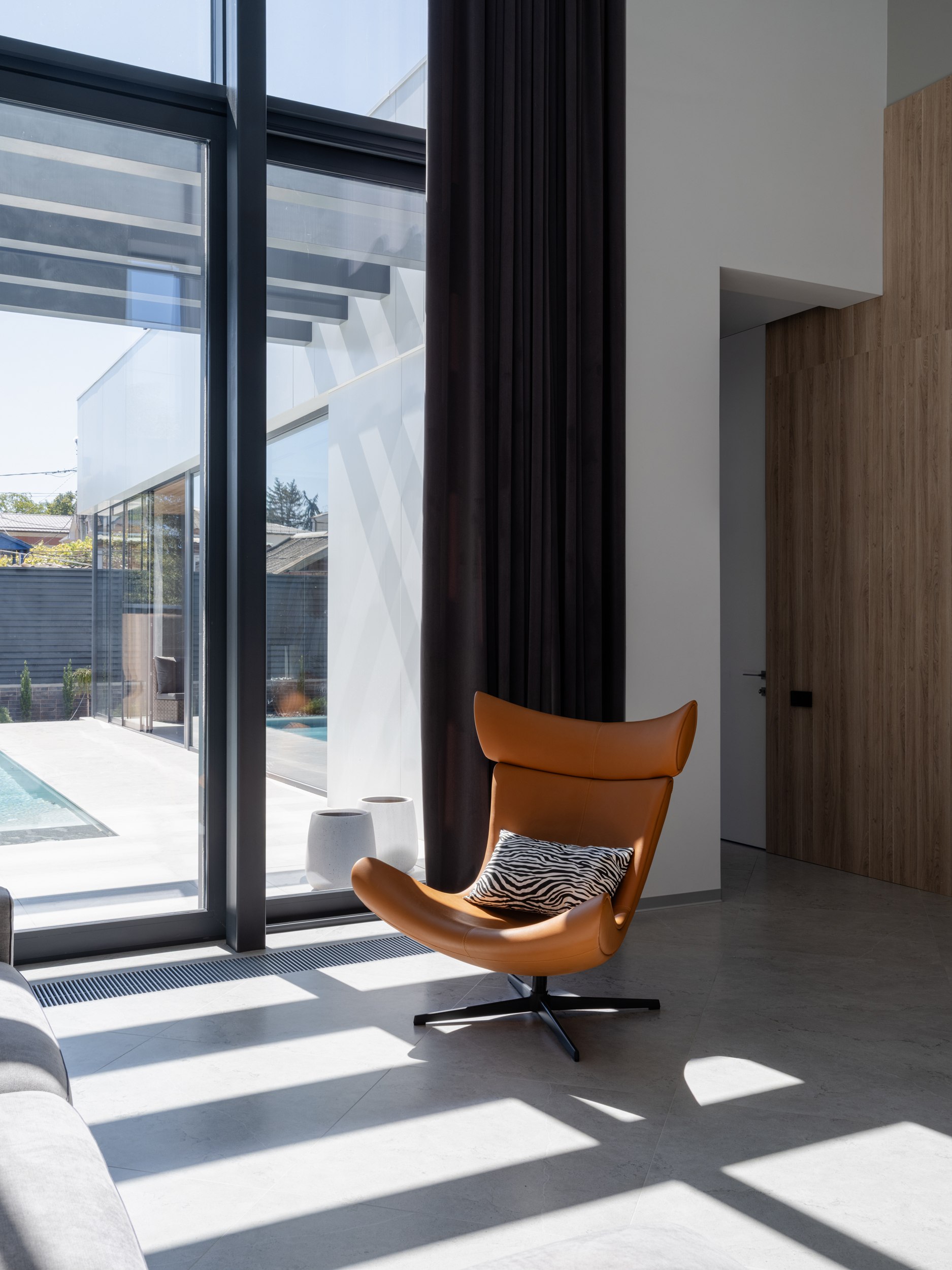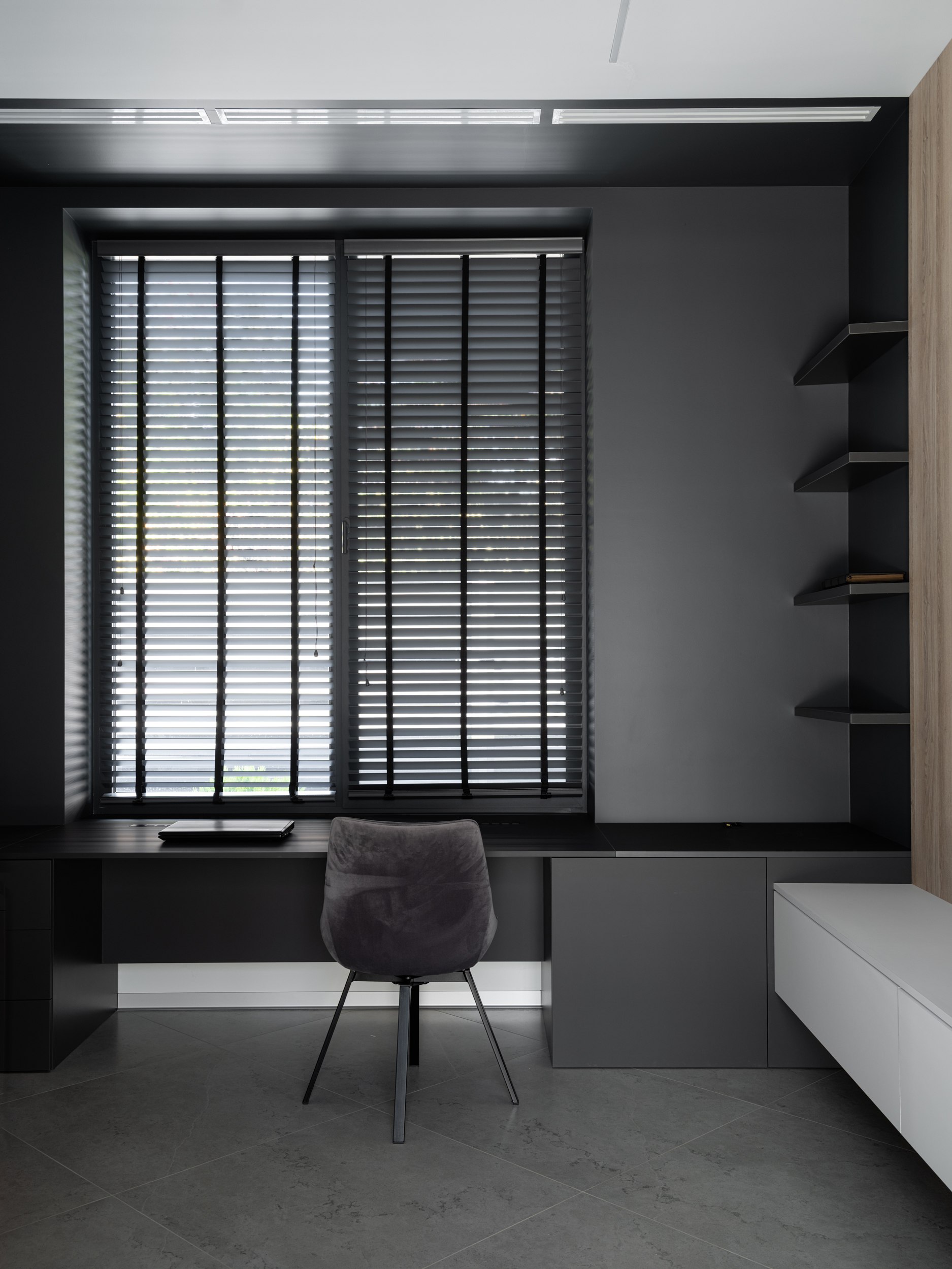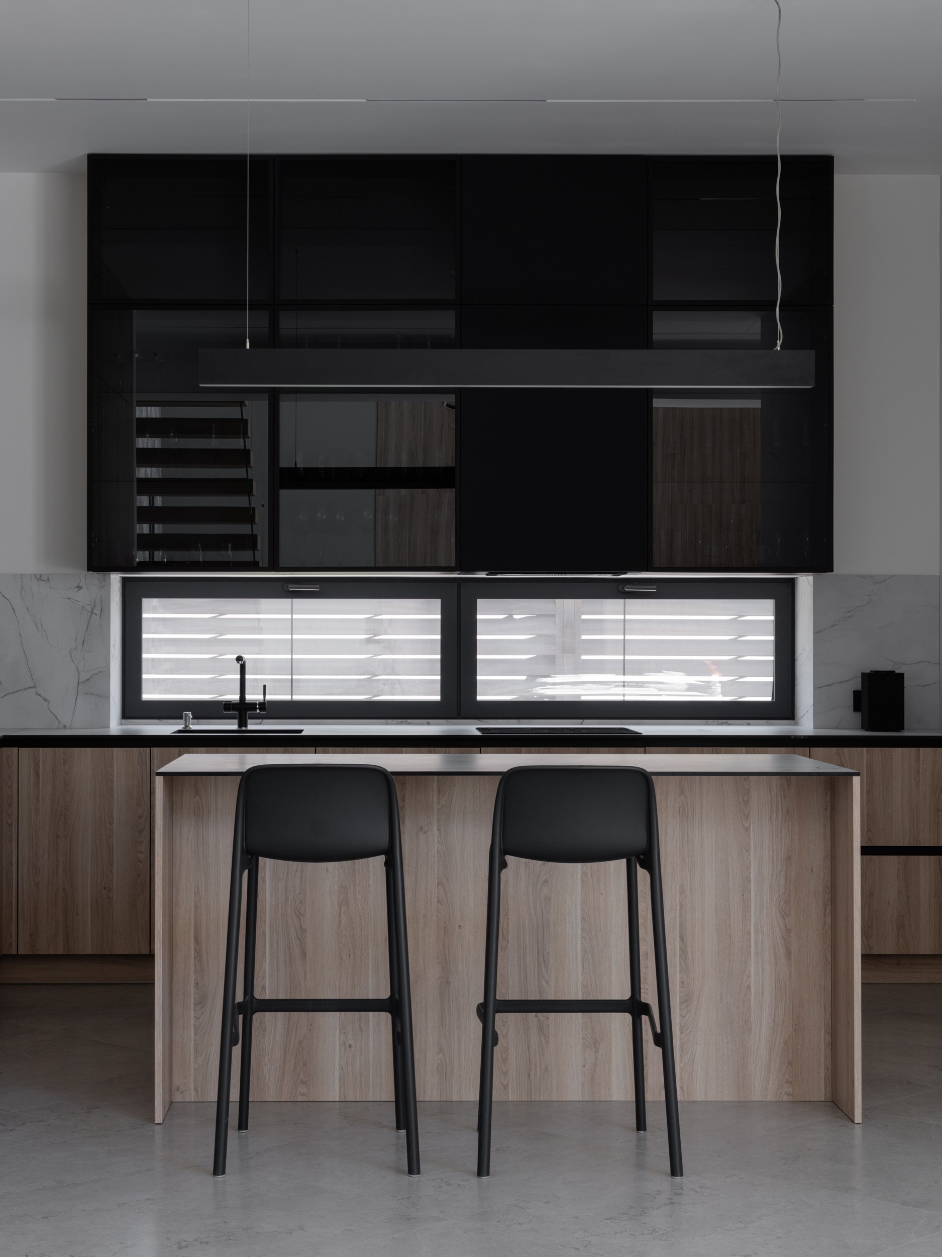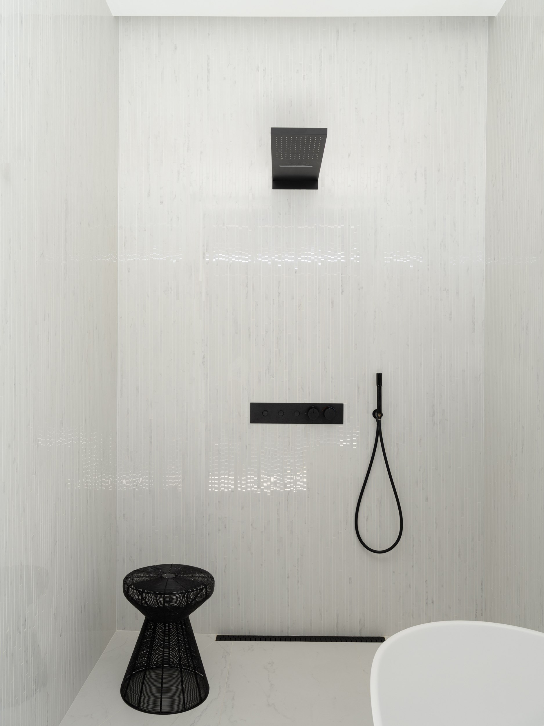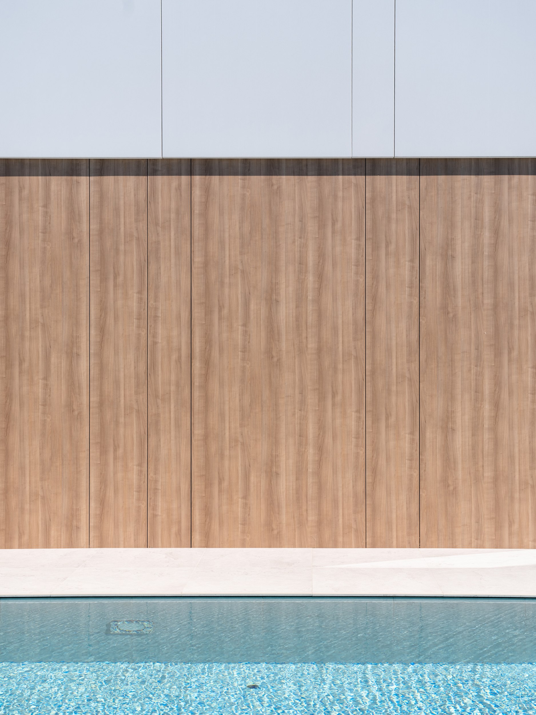 Дом имеет П-образную форму. В центре размещена общая зона со вторым светом, а по бокам примыкают приватный блок со спальнями и полноценная SPA-зона. Одним из смысловых центров стал закрытый внутренний двор. Здесь главную роль играет переливной бассейн со стеклянной гранью, создающий эффект «воды вне гравитации». Мы использовали единый материал для напольного покрытия внутри дома, на террасе и в бассейне, что визуально объединило интерьер и экстерьер. Во внешней отделке применены фактурные керамические панели в сочетании с композитными металлическими элементами и HPL-панелями под дерево.