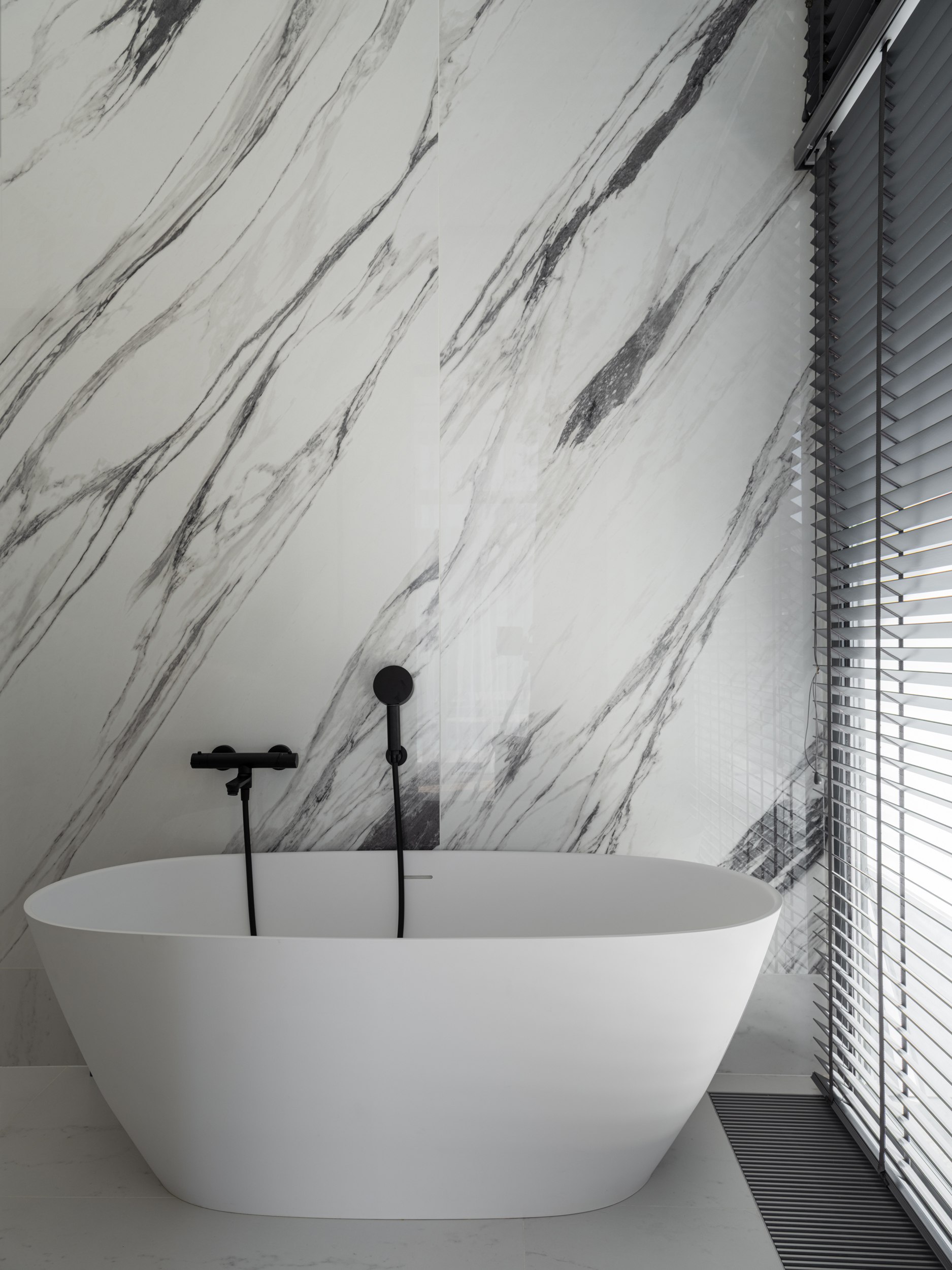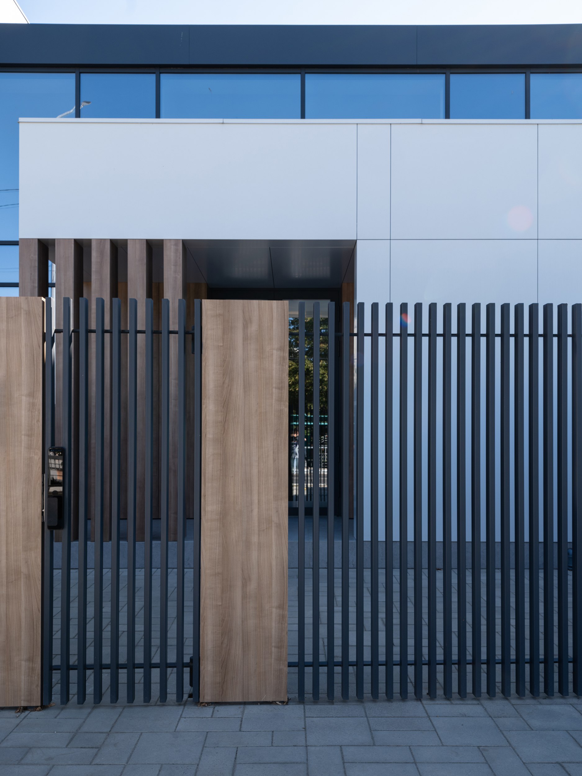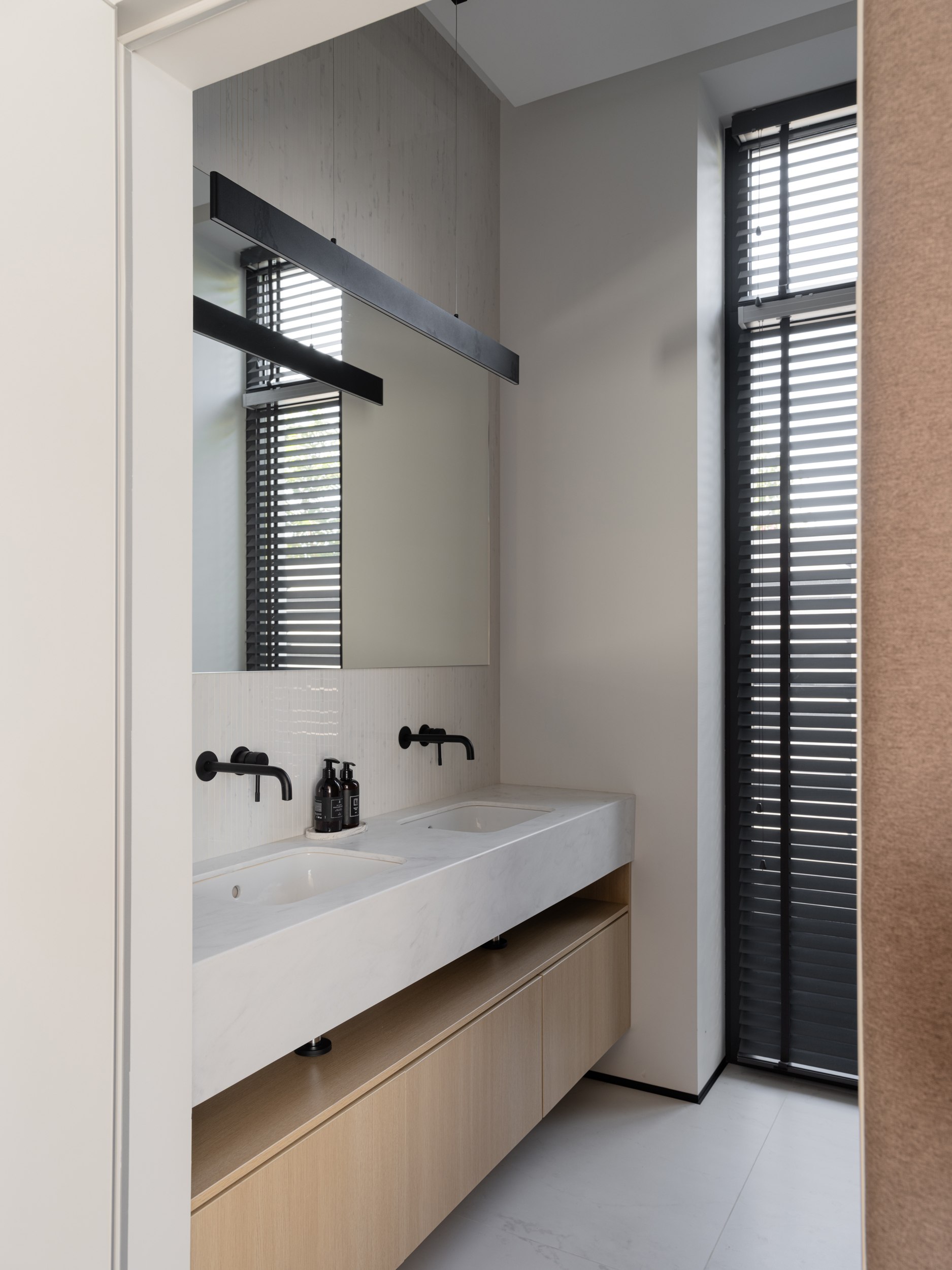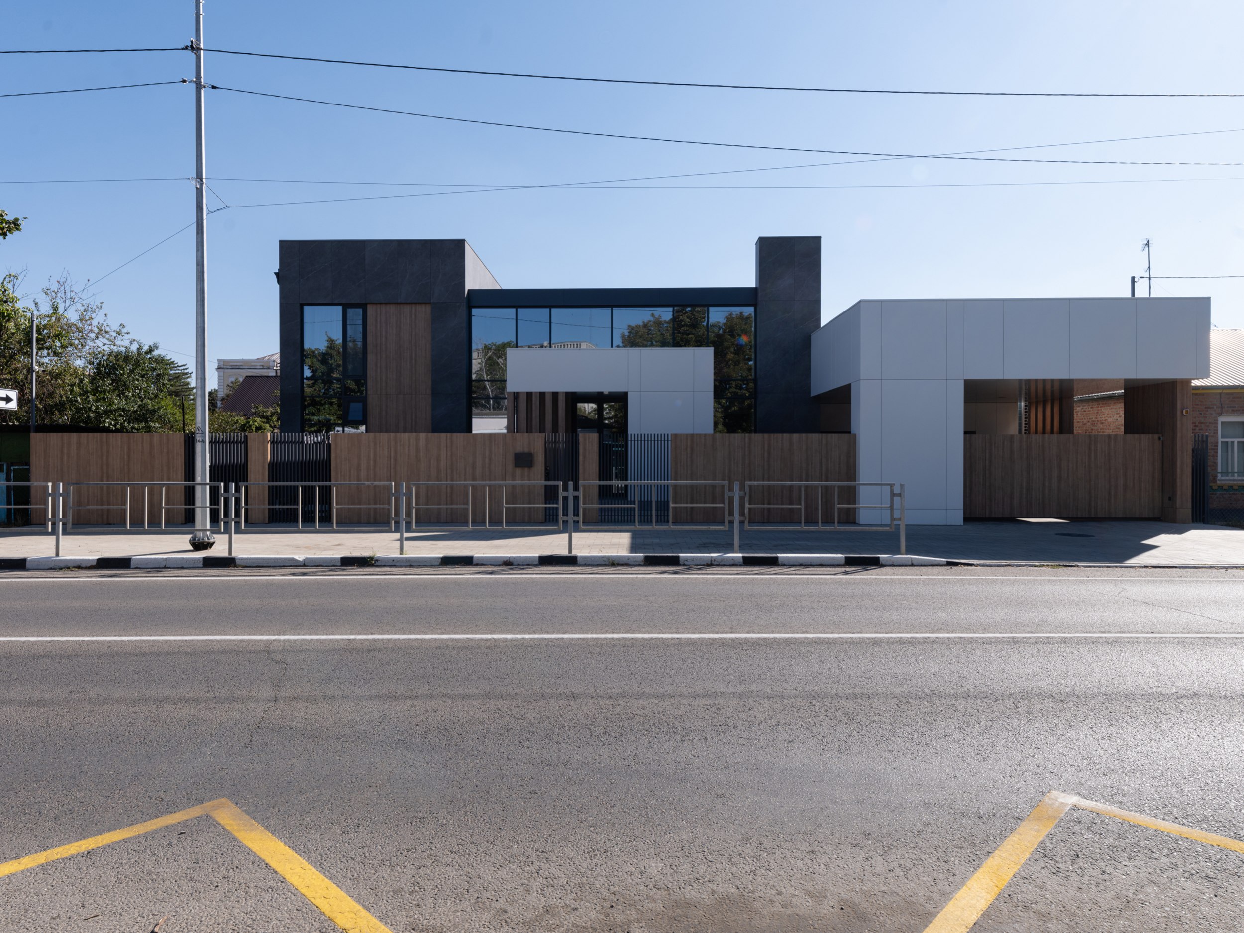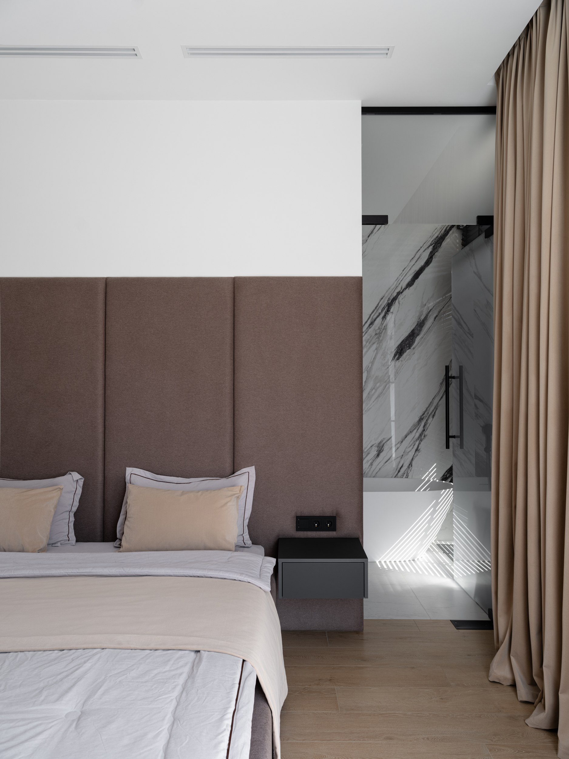Дом имеет П-образную форму. В центре размещена общая зона со вторым светом, а по бокам примыкают приватный блок со спальнями и полноценная SPA-зона. Одним из смысловых центров стал закрытый внутренний двор. Здесь главную роль играет переливной бассейн со стеклянной гранью, создающий эффект «воды вне гравитации». Мы использовали единый материал для напольного покрытия внутри дома, на террасе и в бассейне, что визуально объединило интерьер и экстерьер. Во внешней отделке применены фактурные керамические панели в сочетании с композитными металлическими элементами и HPL-панелями под дерево.