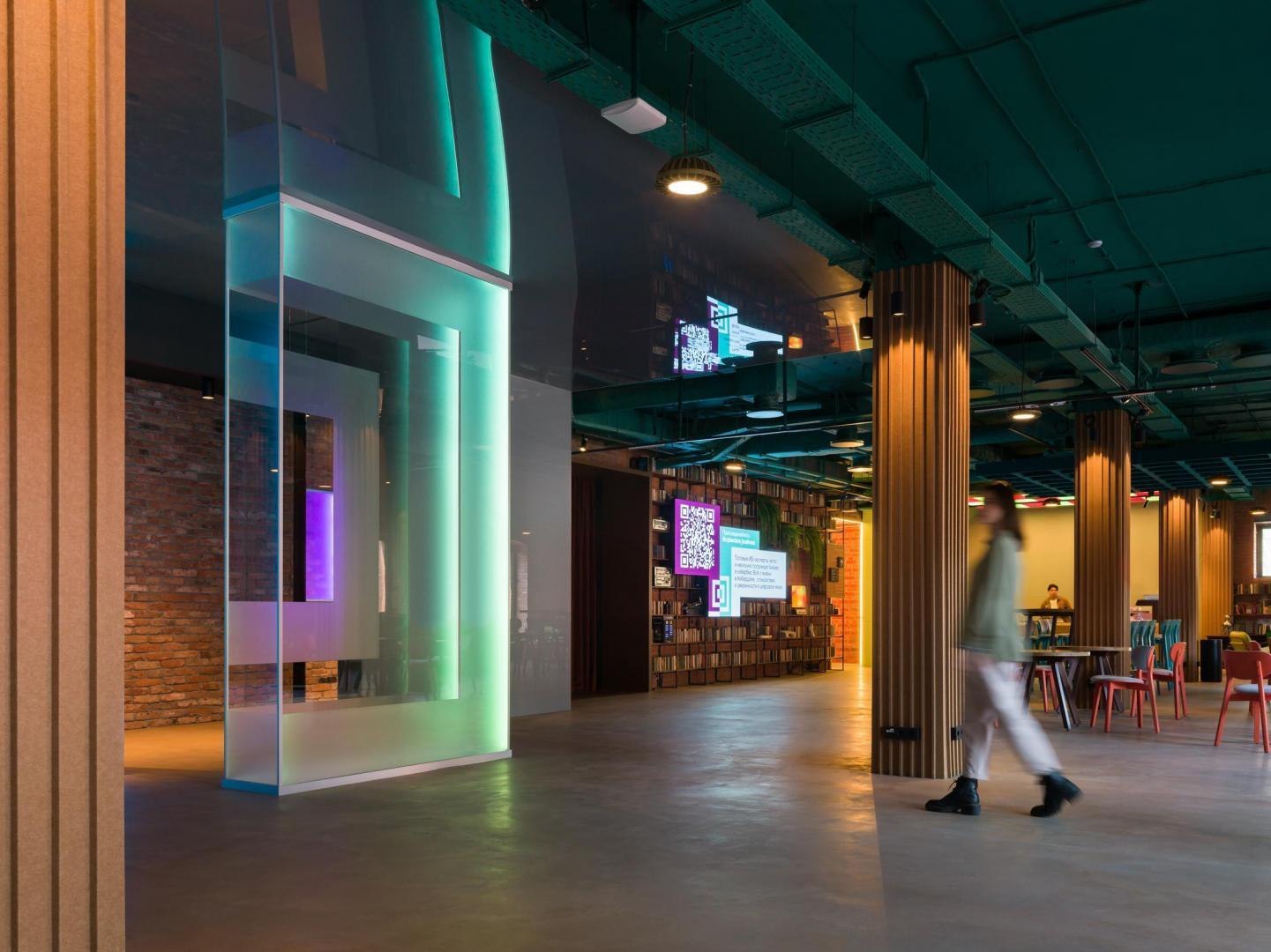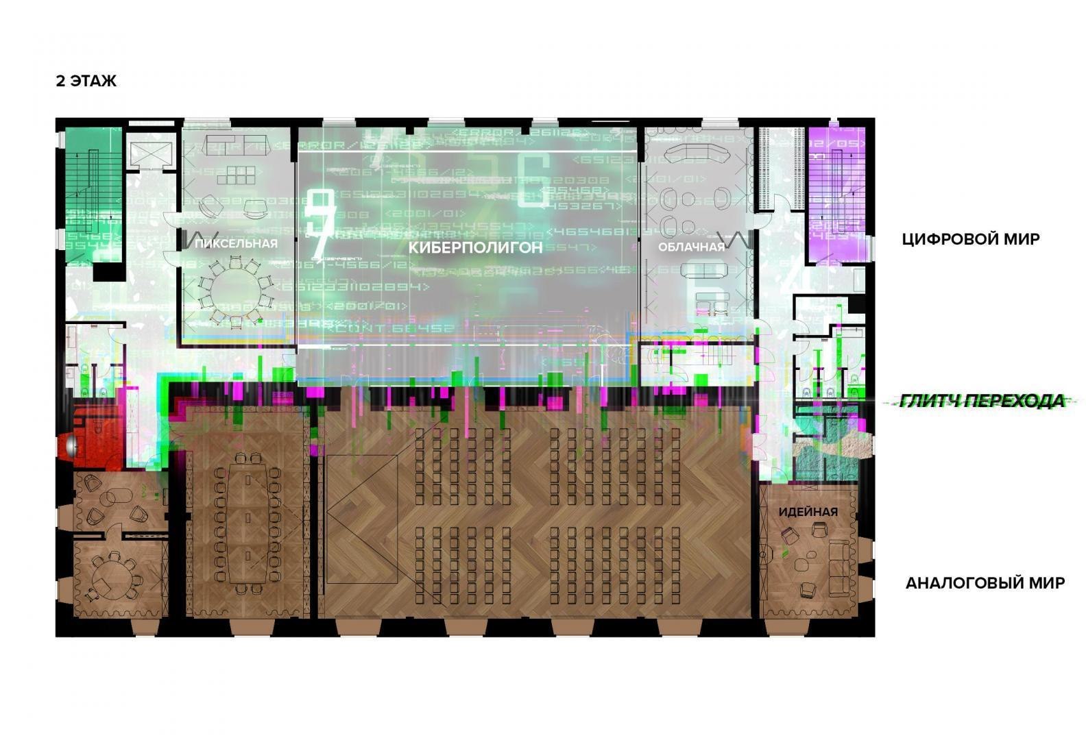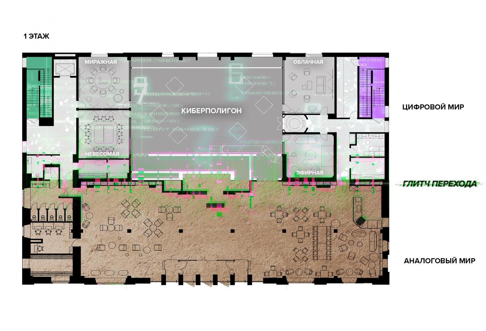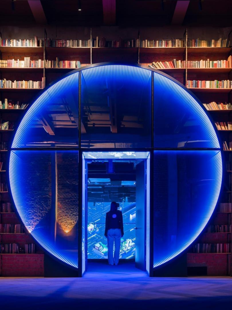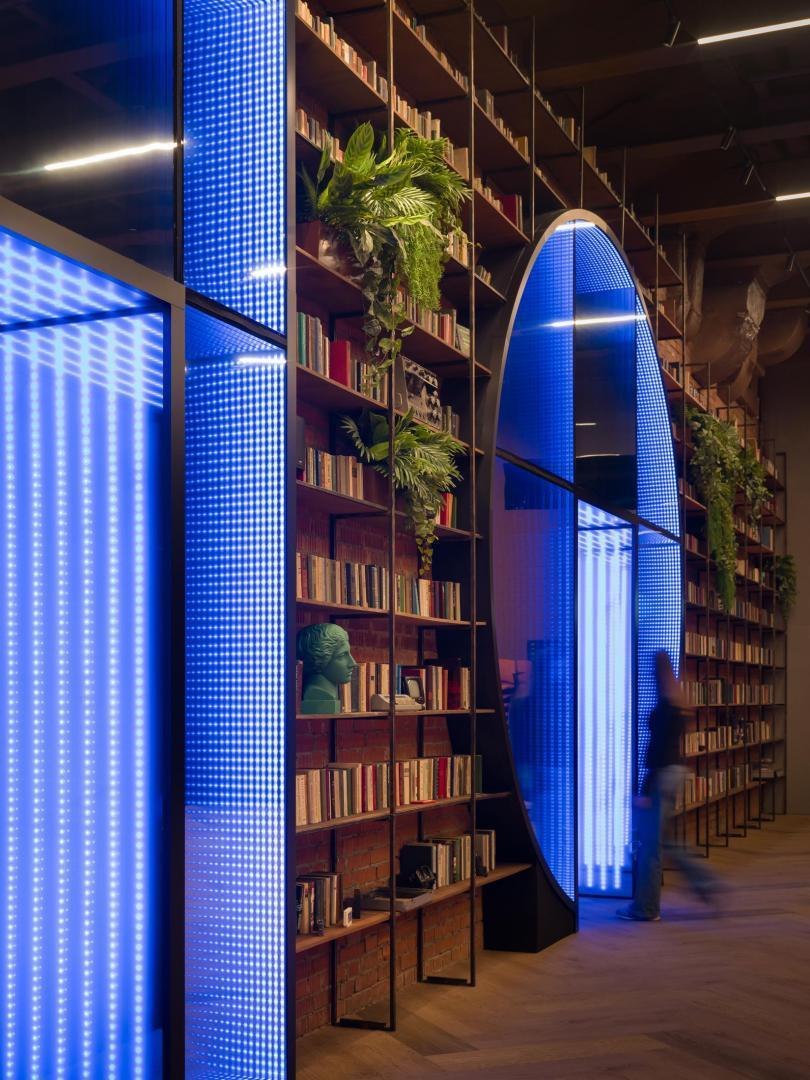 Переход из лобби первого этажа в киберполигон, выполненный компанией Sila Sveta, – еще одно прочтение глитч-эффекта: спроецированный на стены коридора рендер пространства лобби внезапно начинает закручиваться в вихрь световых линий и рассыпаться на пиксели. Мягкая поверхность пола усиливает чувство ухода из реальности в digital-вселенную. Переход из одного мира в другой открывается в обе стороны: в коридорах, которые ведут из цифрового пространства в аналоговое, настоящая кирпичная кладка становится напечатанным на стекле изображением, а в библиотеке лаунж-зоны порталы открываются в виде пиксельных экранов среди книг.