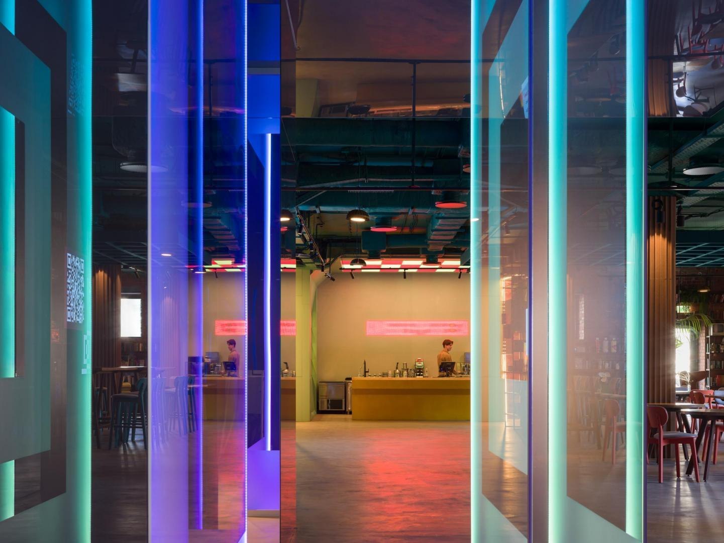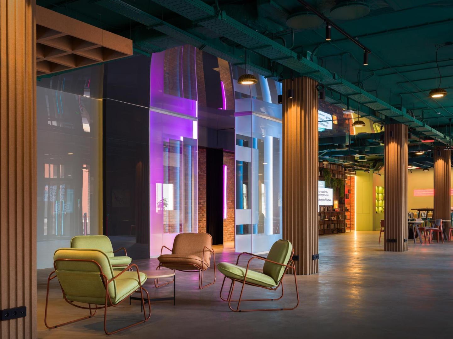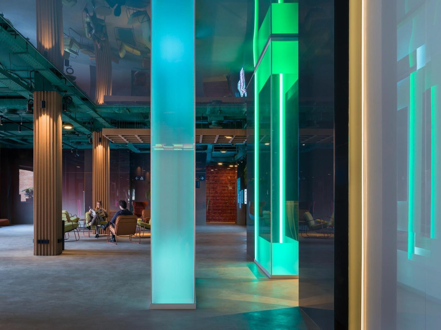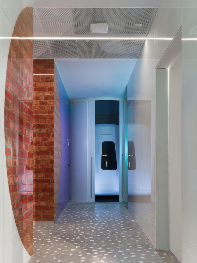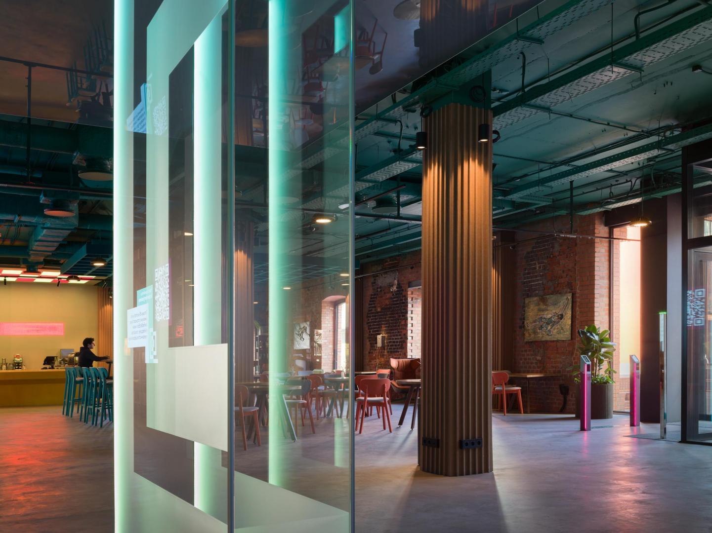 Переход из лобби первого этажа в киберполигон, выполненный компанией Sila Sveta, – еще одно прочтение глитч-эффекта: спроецированный на стены коридора рендер пространства лобби внезапно начинает закручиваться в вихрь световых линий и рассыпаться на пиксели. Мягкая поверхность пола усиливает чувство ухода из реальности в digital-вселенную. Переход из одного мира в другой открывается в обе стороны: в коридорах, которые ведут из цифрового пространства в аналоговое, настоящая кирпичная кладка становится напечатанным на стекле изображением, а в библиотеке лаунж-зоны порталы открываются в виде пиксельных экранов среди книг.