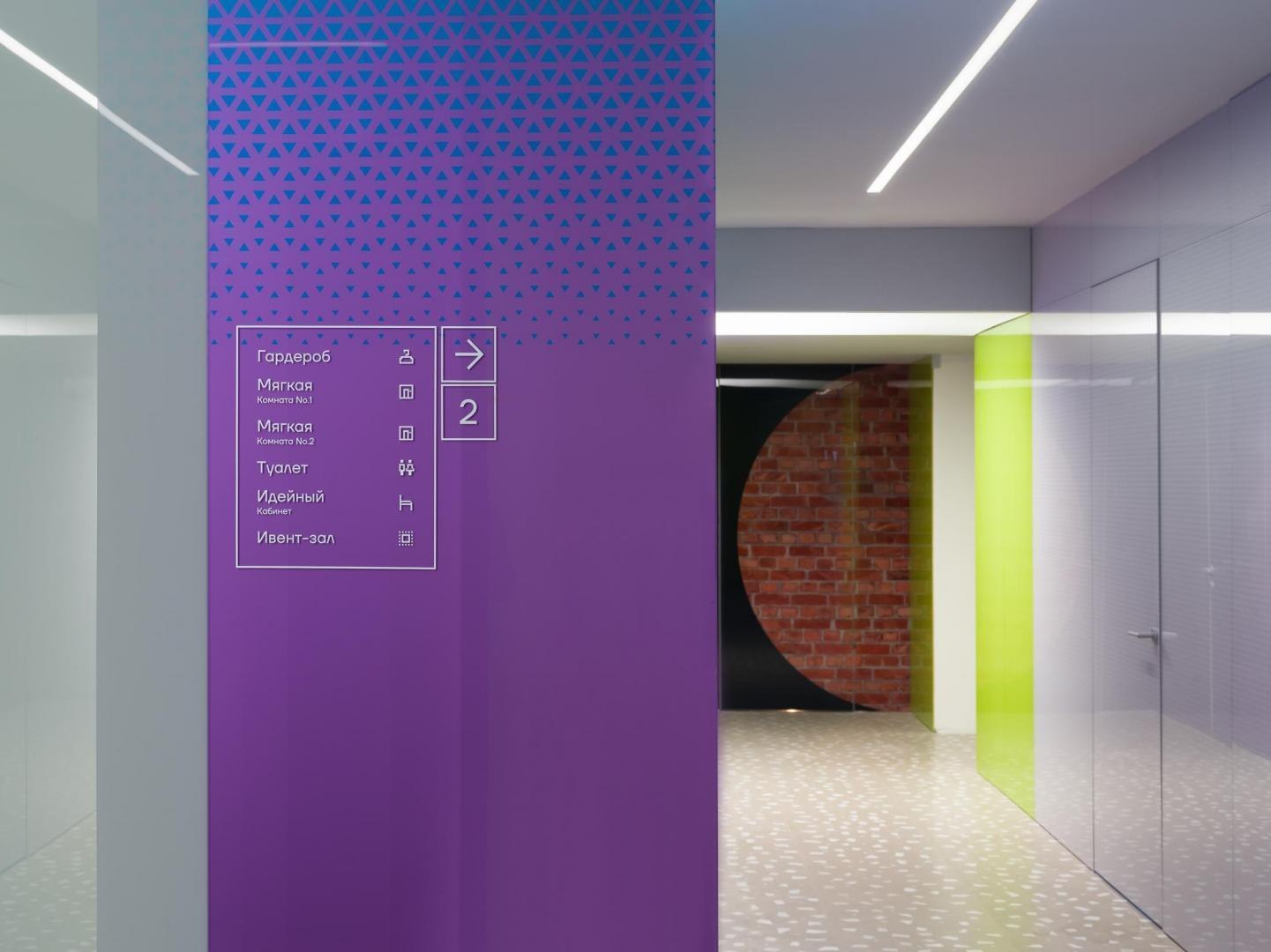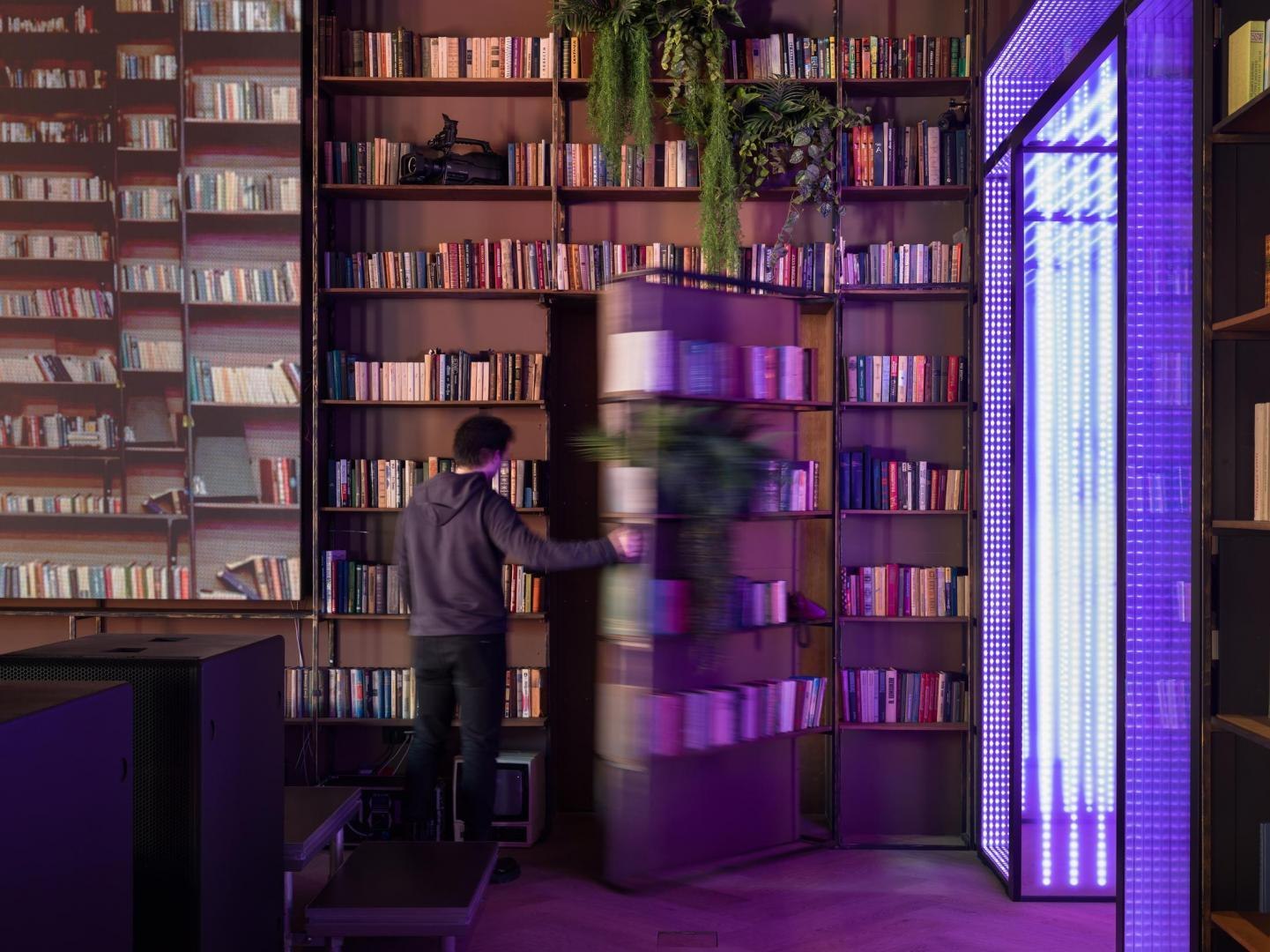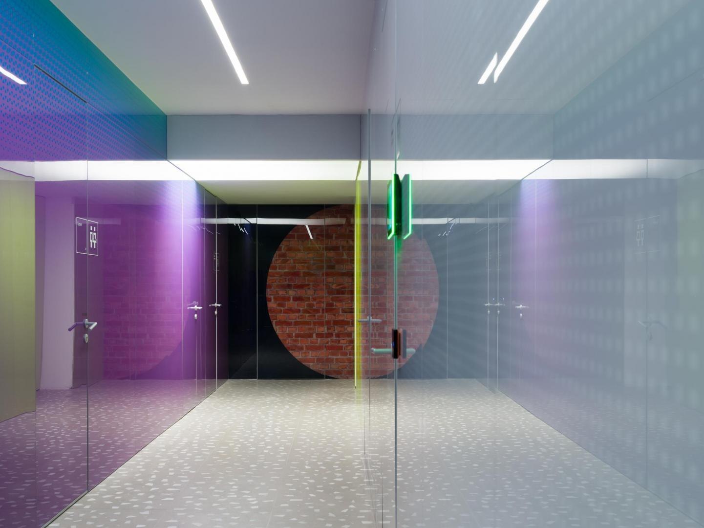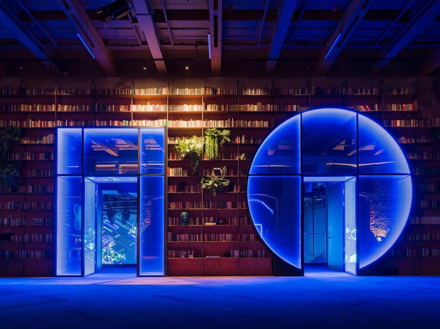 Переход из лобби первого этажа в киберполигон, выполненный компанией Sila Sveta, – еще одно прочтение глитч-эффекта: спроецированный на стены коридора рендер пространства лобби внезапно начинает закручиваться в вихрь световых линий и рассыпаться на пиксели. Мягкая поверхность пола усиливает чувство ухода из реальности в digital-вселенную. Переход из одного мира в другой открывается в обе стороны: в коридорах, которые ведут из цифрового пространства в аналоговое, настоящая кирпичная кладка становится напечатанным на стекле изображением, а в библиотеке лаунж-зоны порталы открываются в виде пиксельных экранов среди книг.