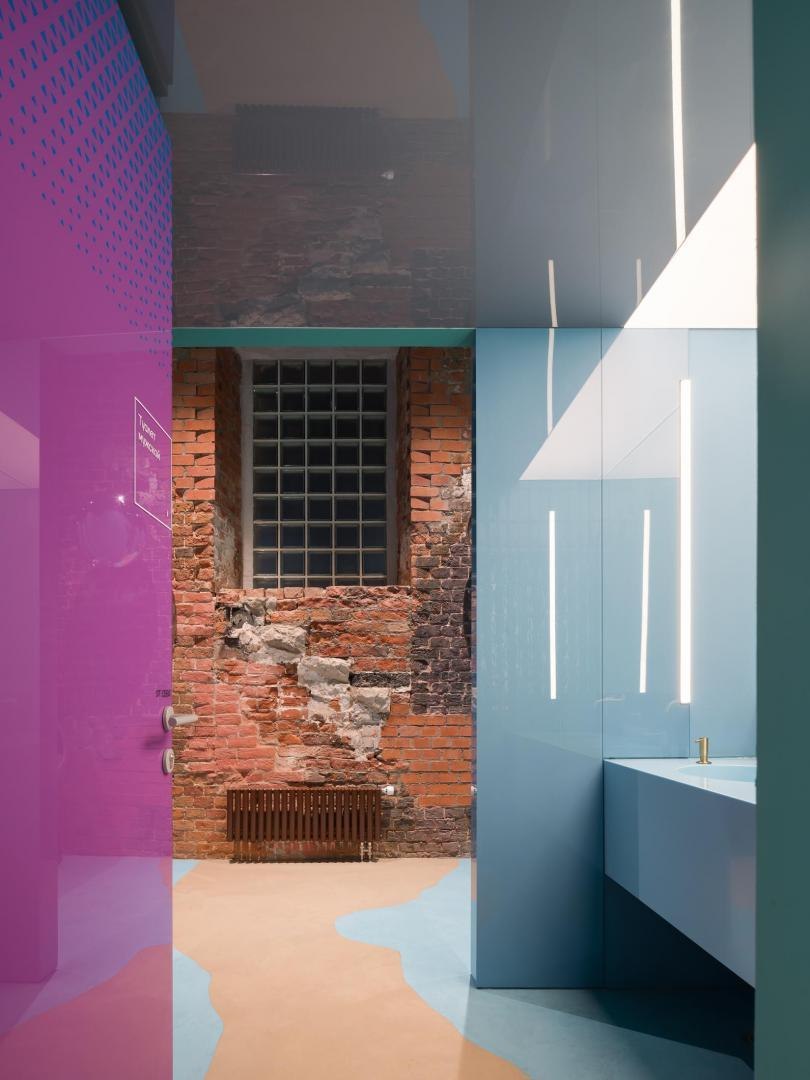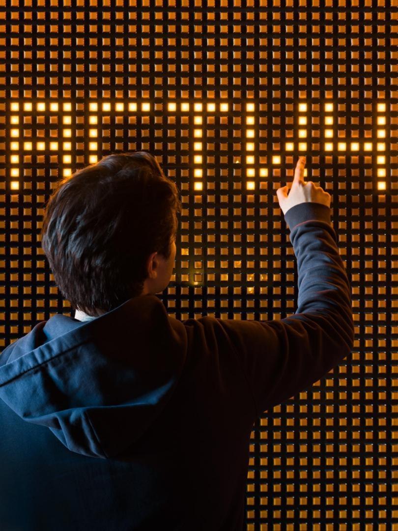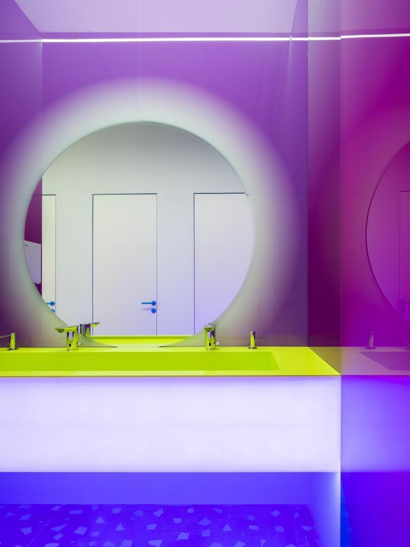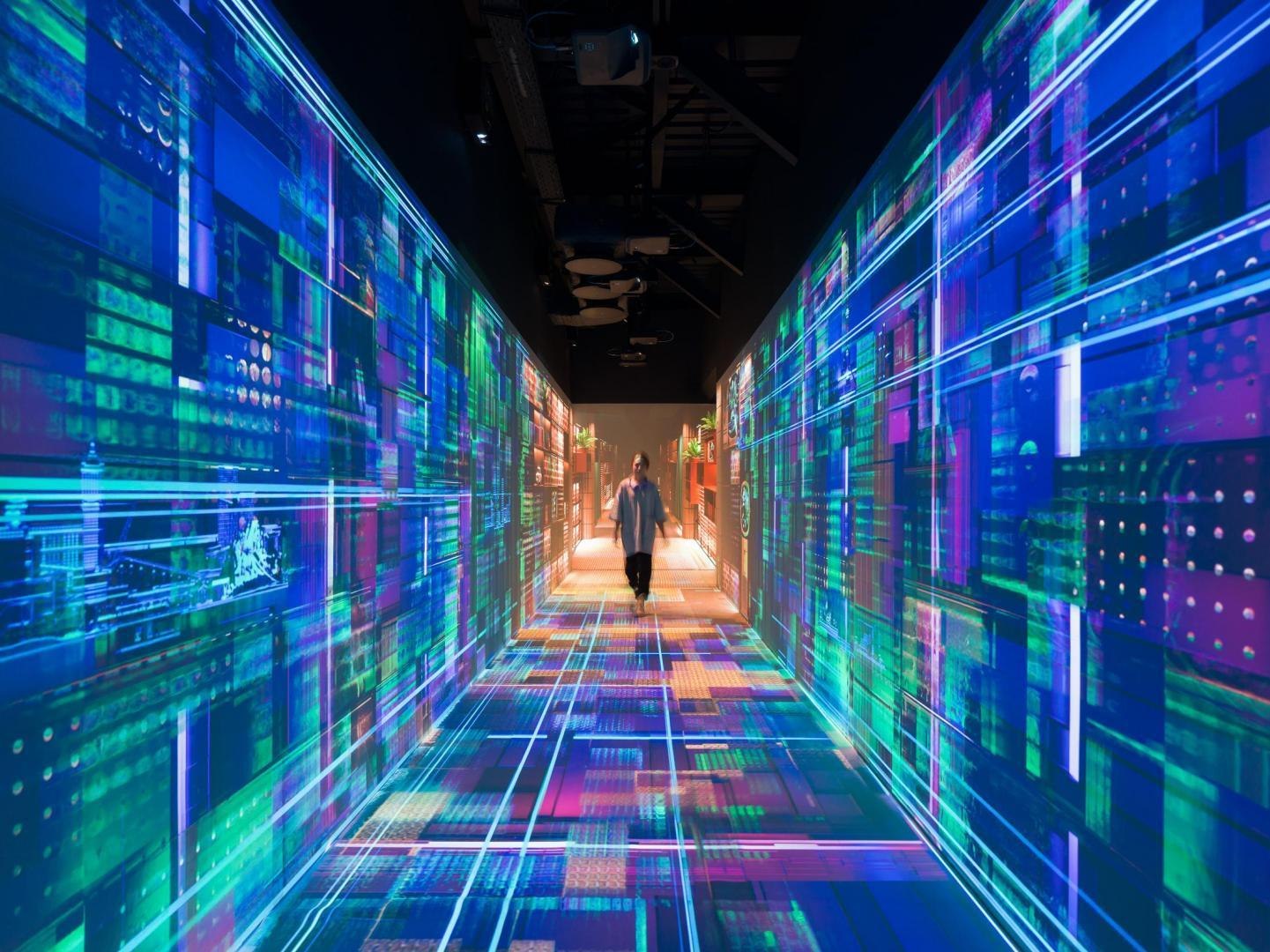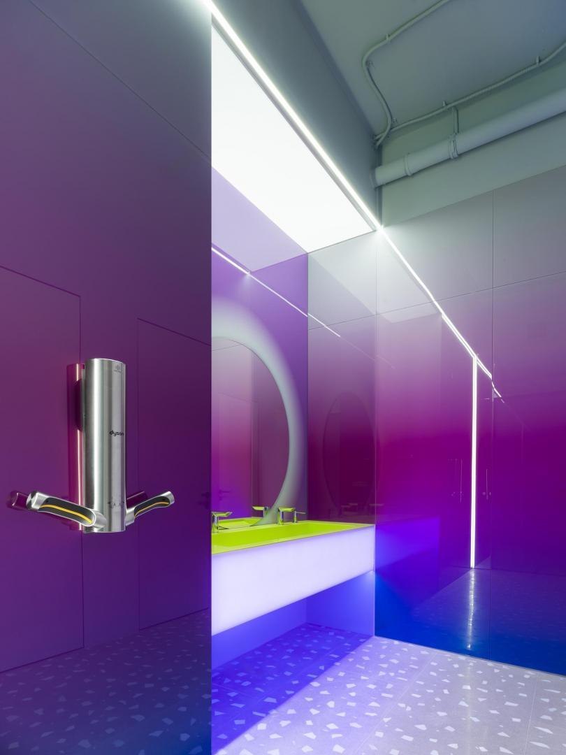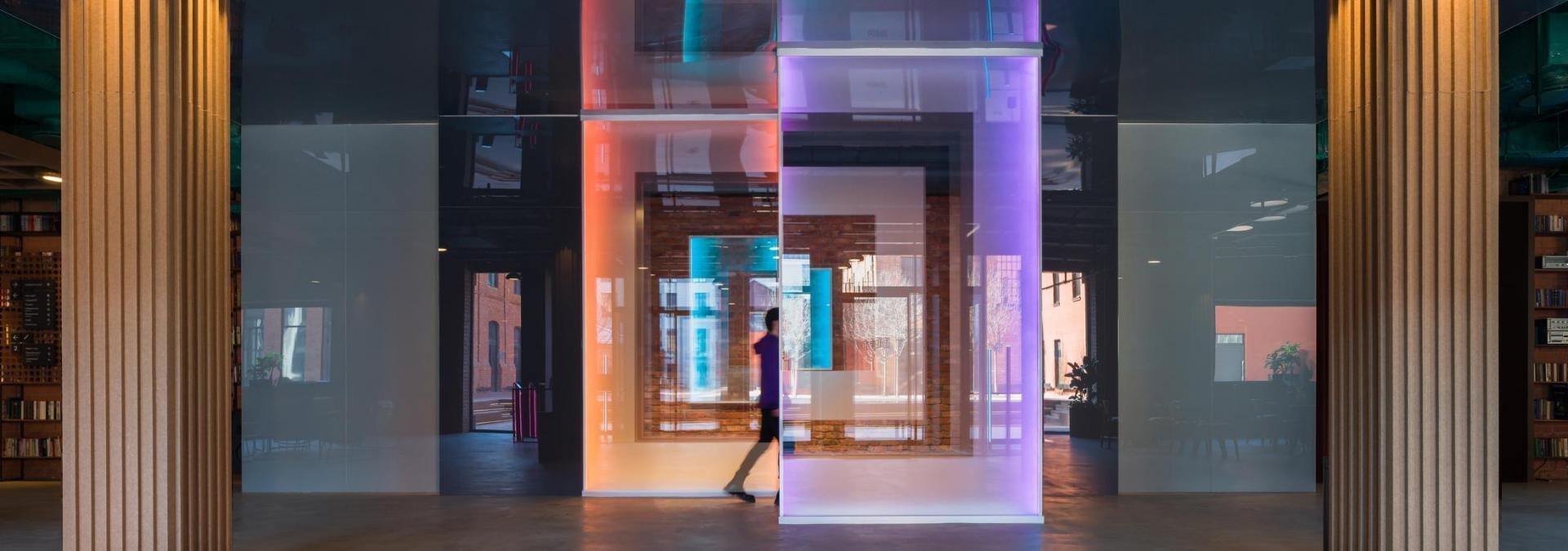 Переход из лобби первого этажа в киберполигон, выполненный компанией Sila Sveta, – еще одно прочтение глитч-эффекта: спроецированный на стены коридора рендер пространства лобби внезапно начинает закручиваться в вихрь световых линий и рассыпаться на пиксели. Мягкая поверхность пола усиливает чувство ухода из реальности в digital-вселенную. Переход из одного мира в другой открывается в обе стороны: в коридорах, которые ведут из цифрового пространства в аналоговое, настоящая кирпичная кладка становится напечатанным на стекле изображением, а в библиотеке лаунж-зоны порталы открываются в виде пиксельных экранов среди книг.