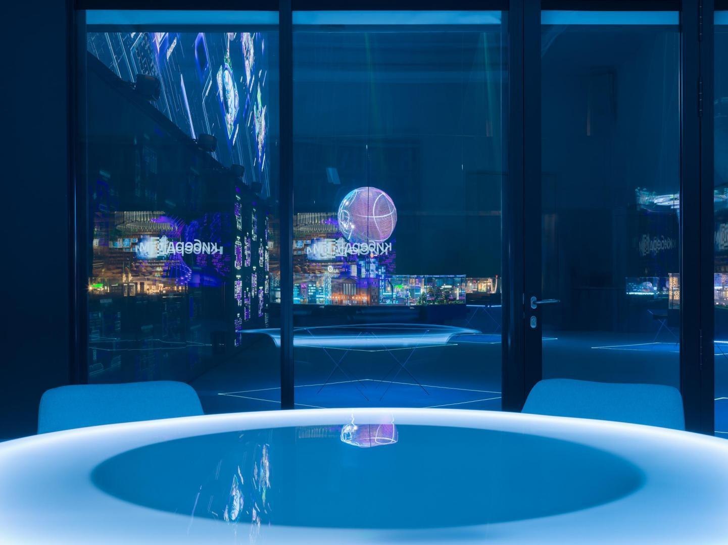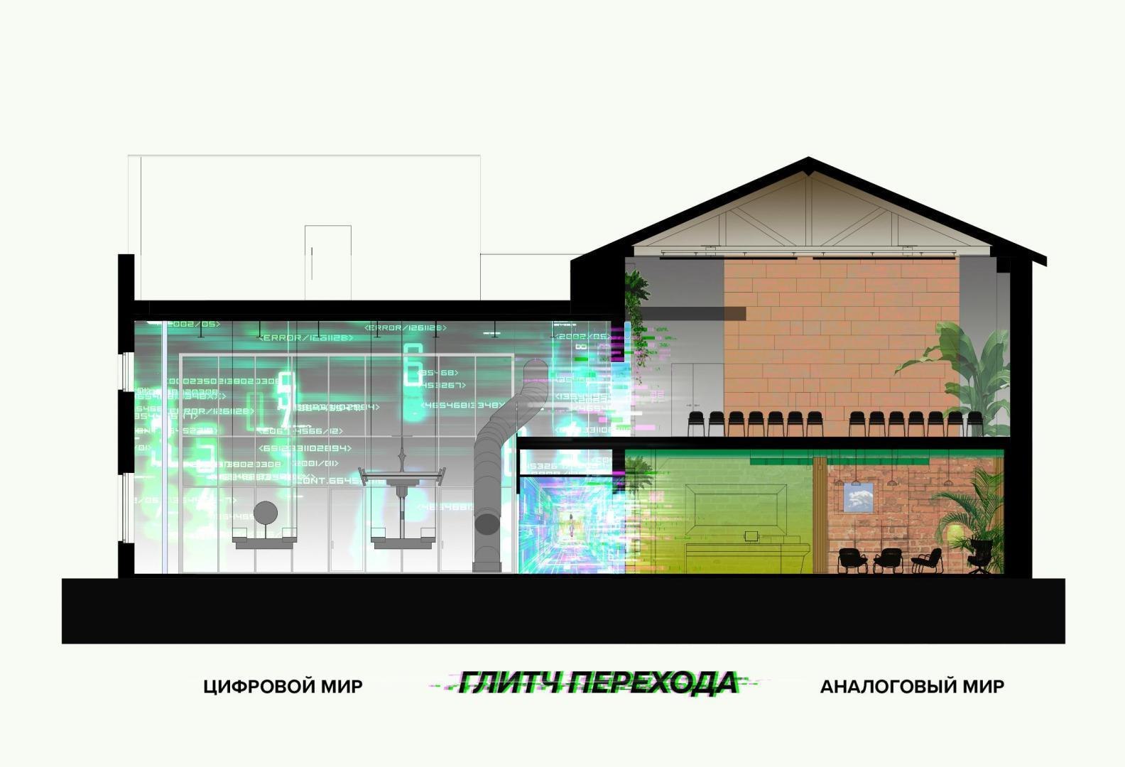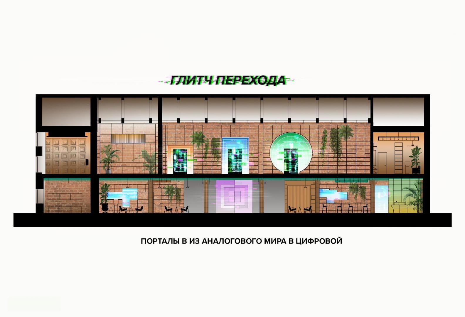 Архитекторы VOX Architects предложили материализовать идею смешения виртуального и реального через переход из одного мира в другой в образе глитч-порталов в стене между аналоговой и цифровой частью «Кибердома». Эффект растворения границ создают огромные световые порталы: прежде всего, это портал в виде логотипа на первом этаже, через который можно попасть на киберполигон; на втором этаже глитч-порталы из зеркал бесконечности ведут в ивент-зал.