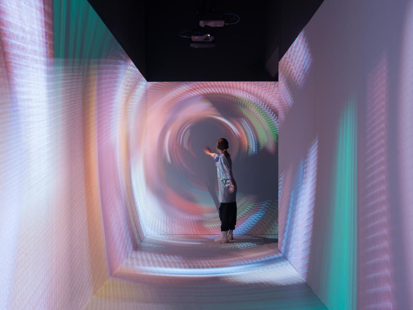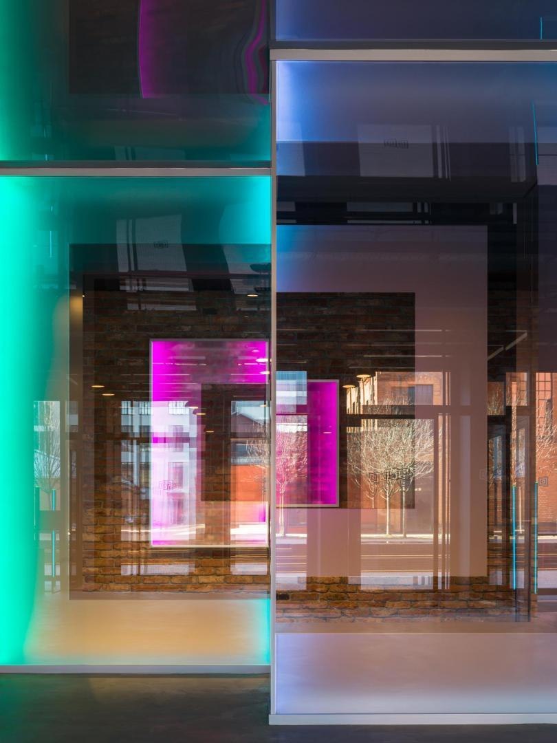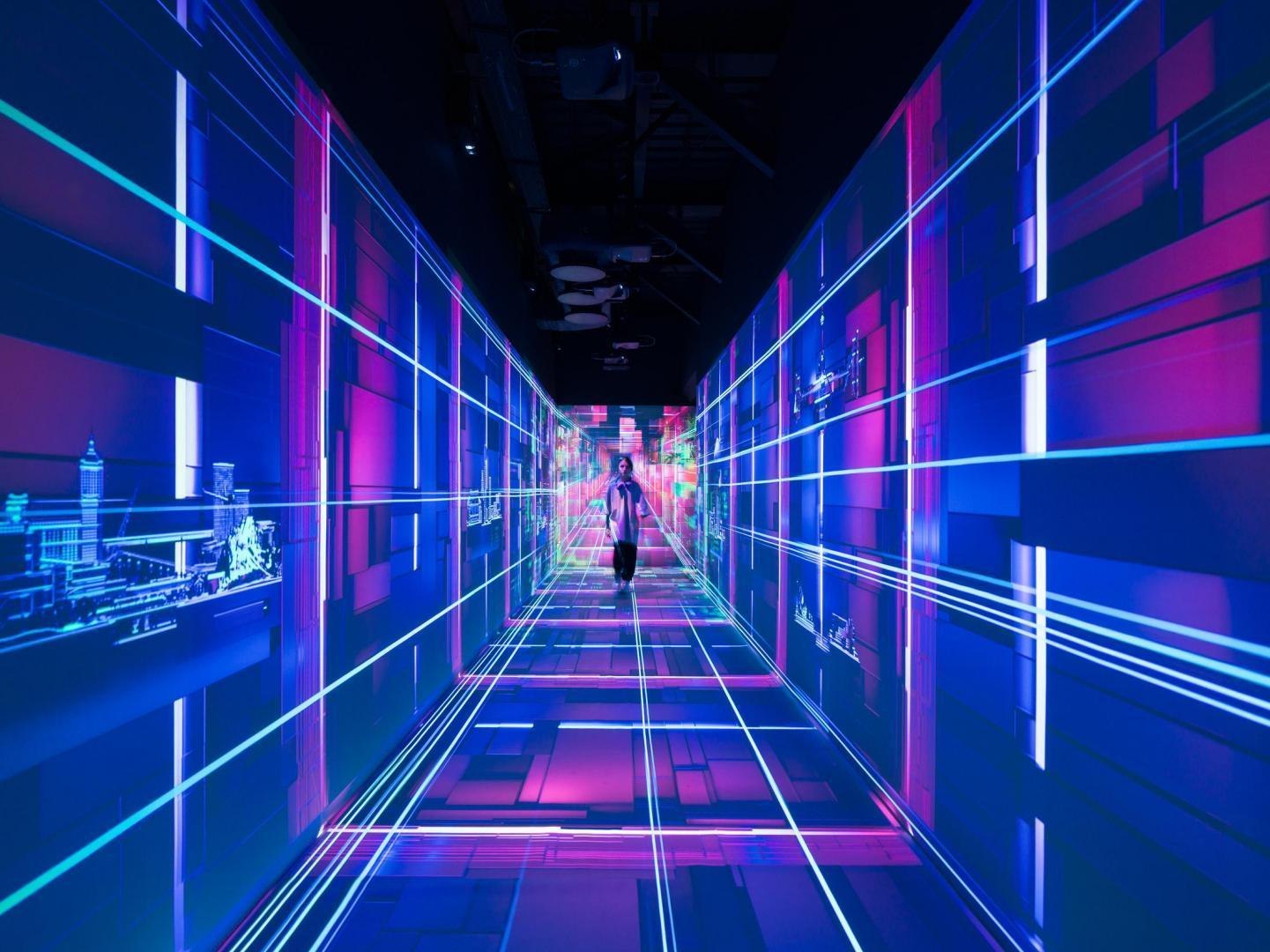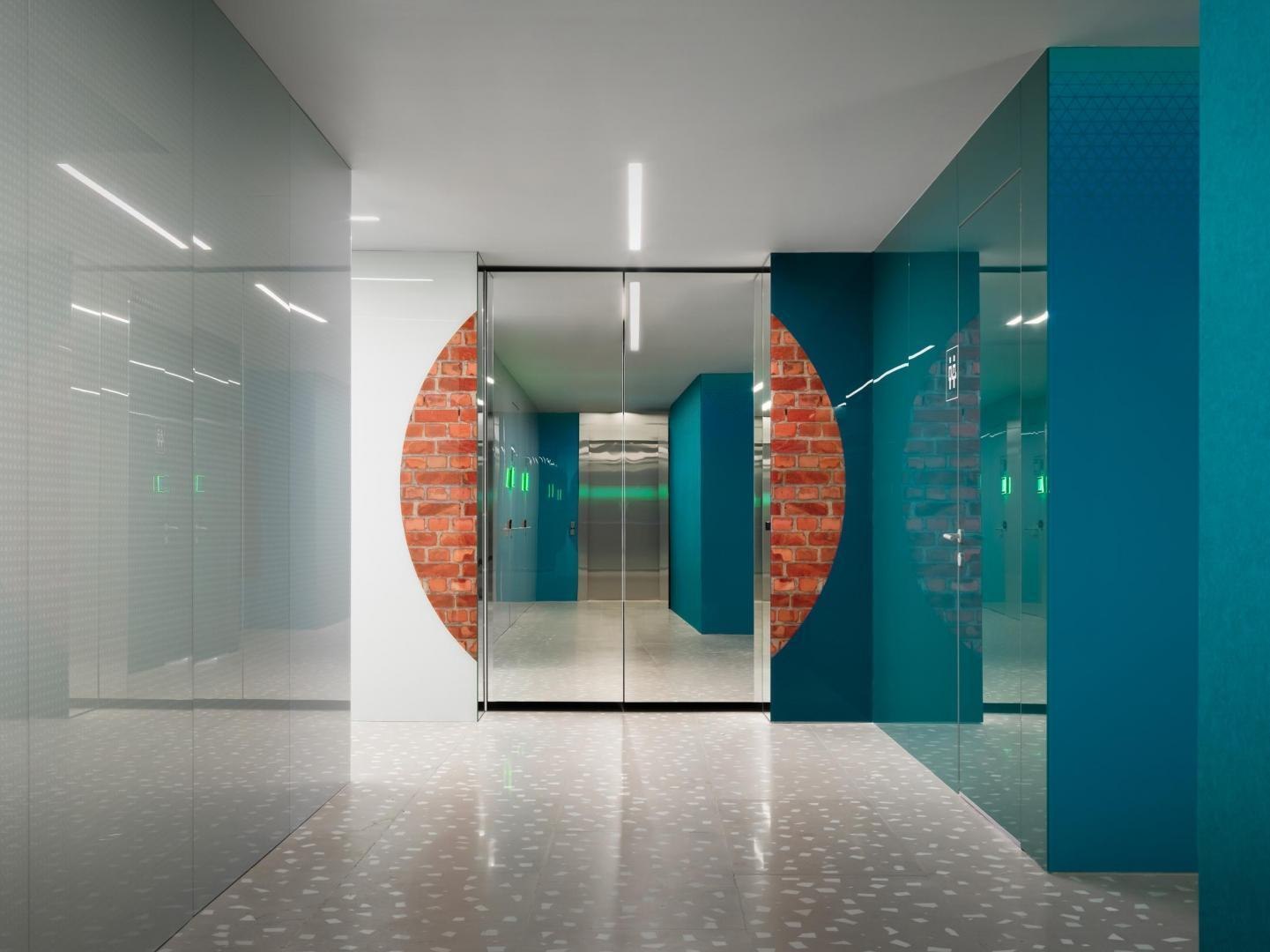 Архитекторы VOX Architects предложили материализовать идею смешения виртуального и реального через переход из одного мира в другой в образе глитч-порталов в стене между аналоговой и цифровой частью «Кибердома». Эффект растворения границ создают огромные световые порталы: прежде всего, это портал в виде логотипа на первом этаже, через который можно попасть на киберполигон; на втором этаже глитч-порталы из зеркал бесконечности ведут в ивент-зал.