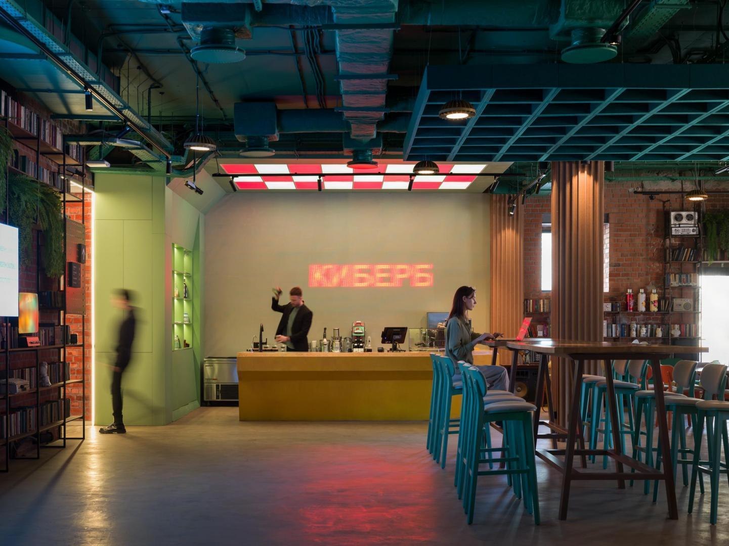 Интерьерные решения подчинены той половине «Кибердома» в которой они находятся, аналоговой или цифровой. В пространствах кирпичного исторического объема для заказчика было принципиально важно создать ощущение безопасности на всех уровнях восприятия. Радость узнавания привычных вещей и артефактов в лаунж-зоне и лобби, ивент-зале, а также переговорных для особо важных гостей на втором этаже в интерьере поддержана приятными на ощупь свойствами материалов, которые на тактильном уровне создают ощущение спокойствия и комфорта. Это чувство усиливает с тщательным вниманием подобранная мебель. Особое внимание на себя обращают costume made-детали. В зоне лобби помещена барная стойка из стеклохолста с орнаментом из деталей компьютерных плат. В «Идейной» переговорной нужную атмосферу создает аналоговое панно, на котором можно записывать гениальные и не очень идеи, нажимая на загорающиеся кнопки.