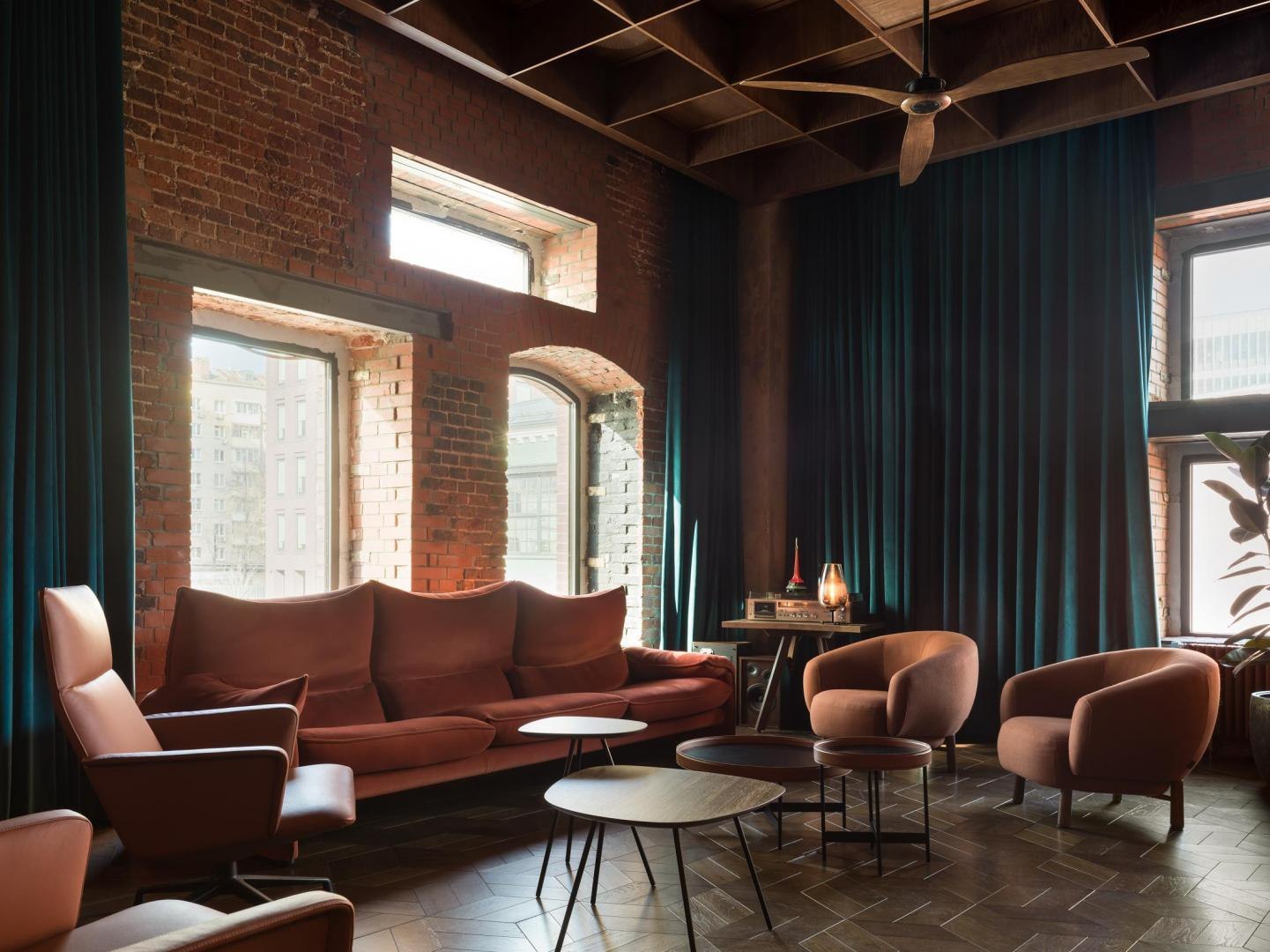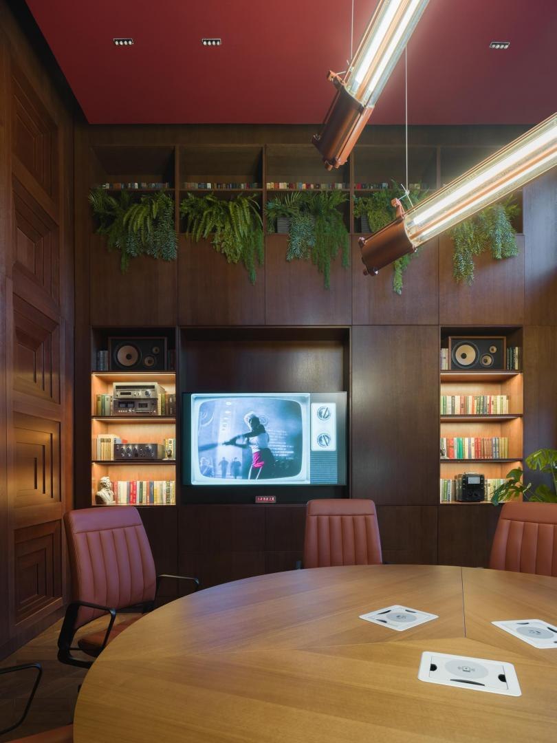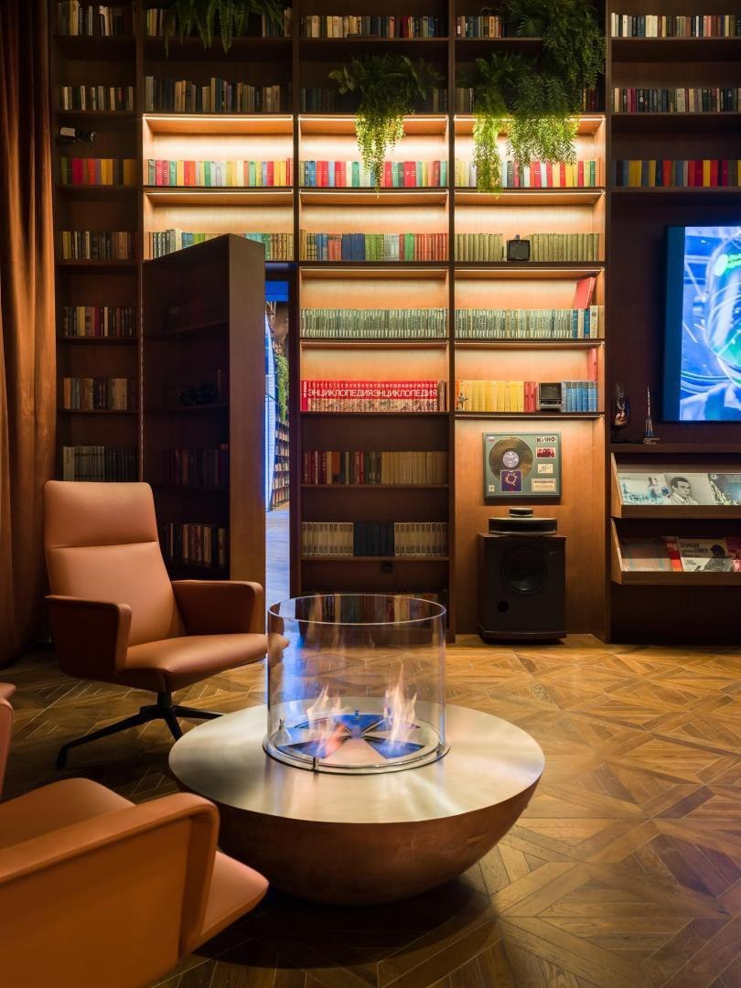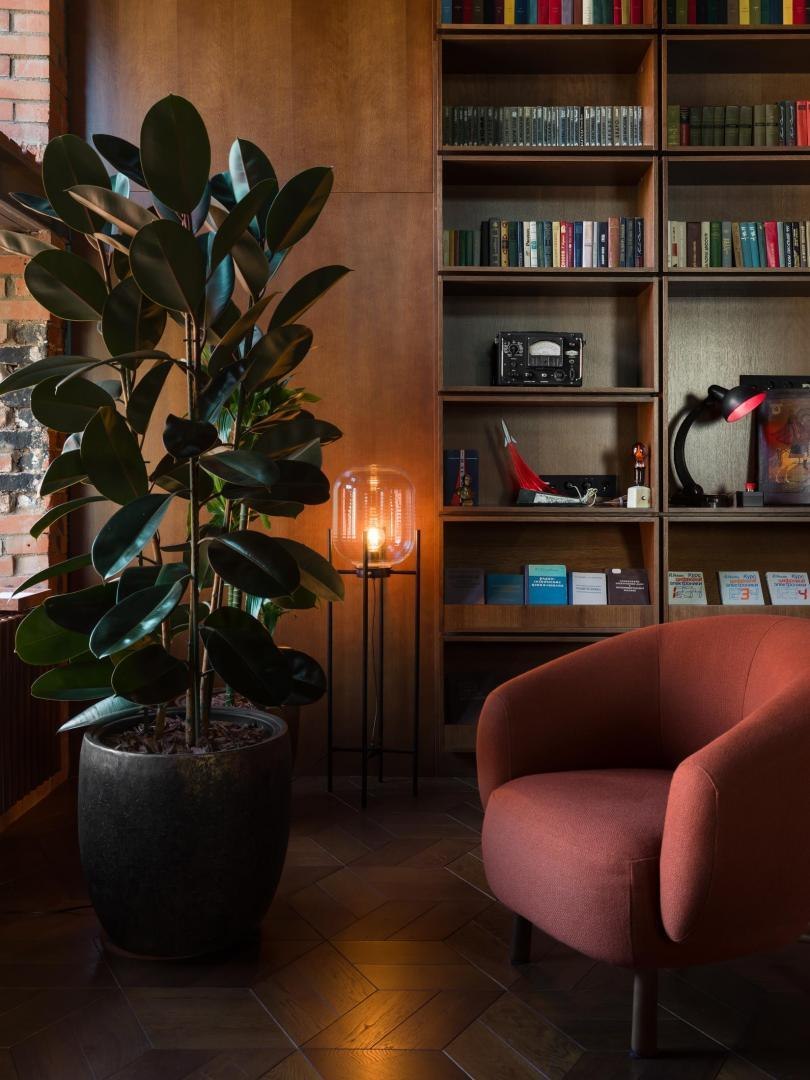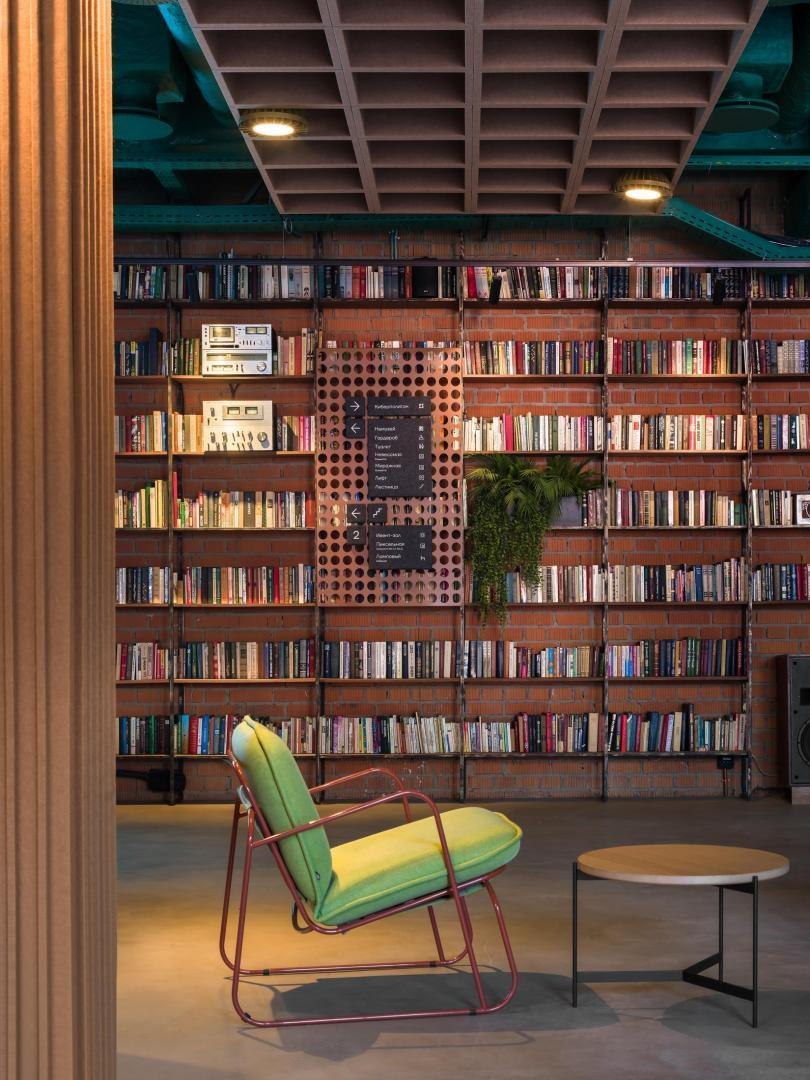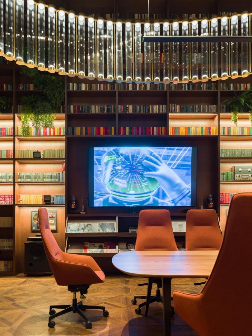 Историческое кирпичное здание стало олицетворением физической реальности, а пристроенный к нему белый лаконичный объем – образом реальности цифровой. Главный вход расположен в кирпичной половине здания. В лаунж-пространстве, напоминающем уютную домашнюю библиотеку, практически все детали отсылают к качеству жизни в доцифровую эпоху.