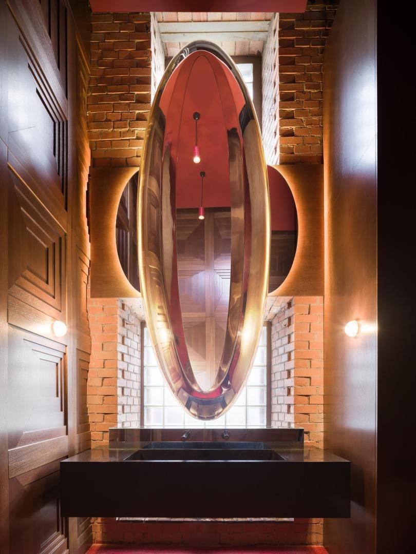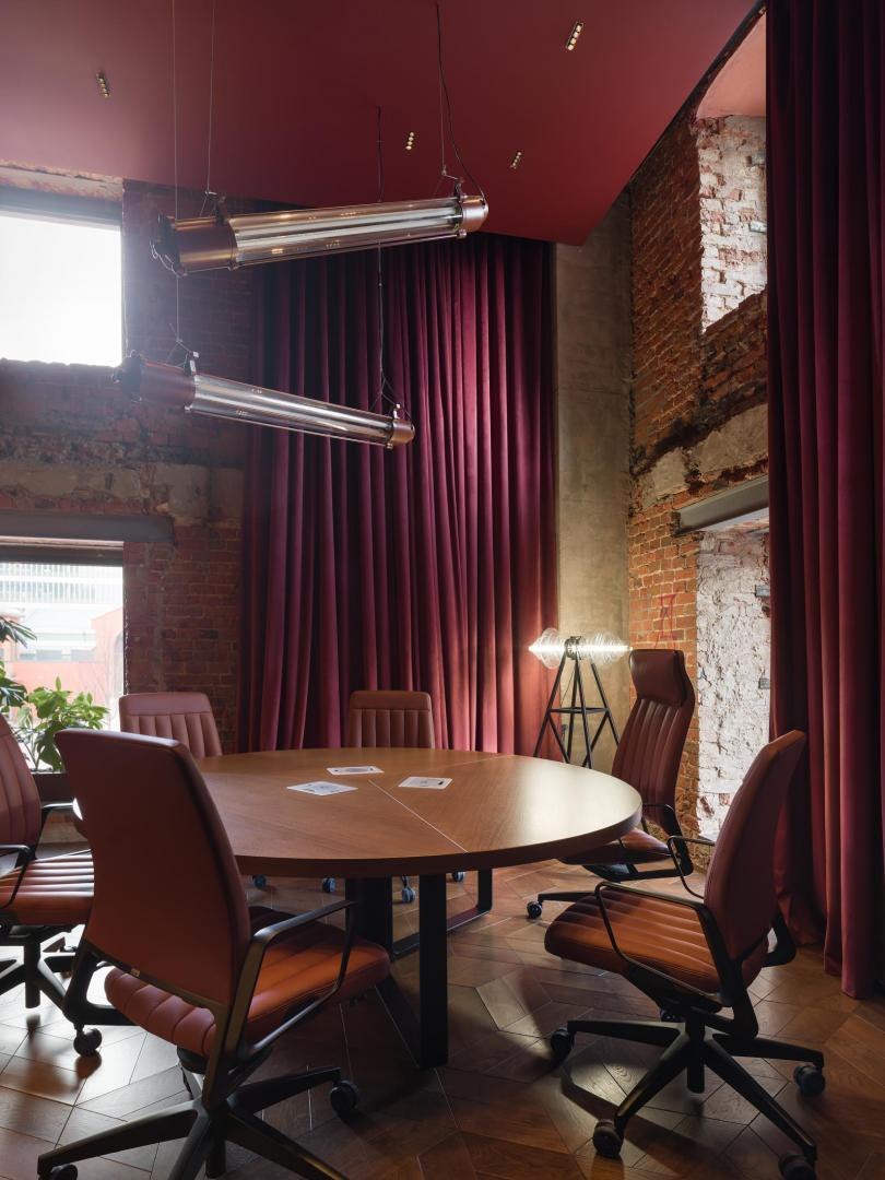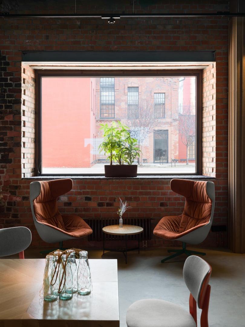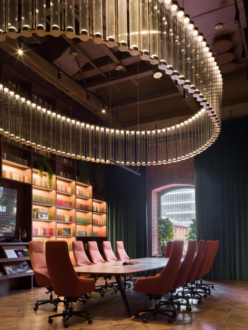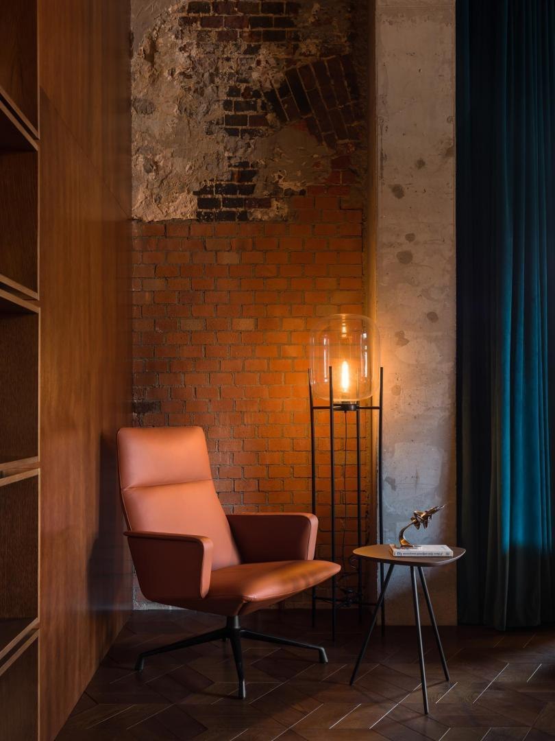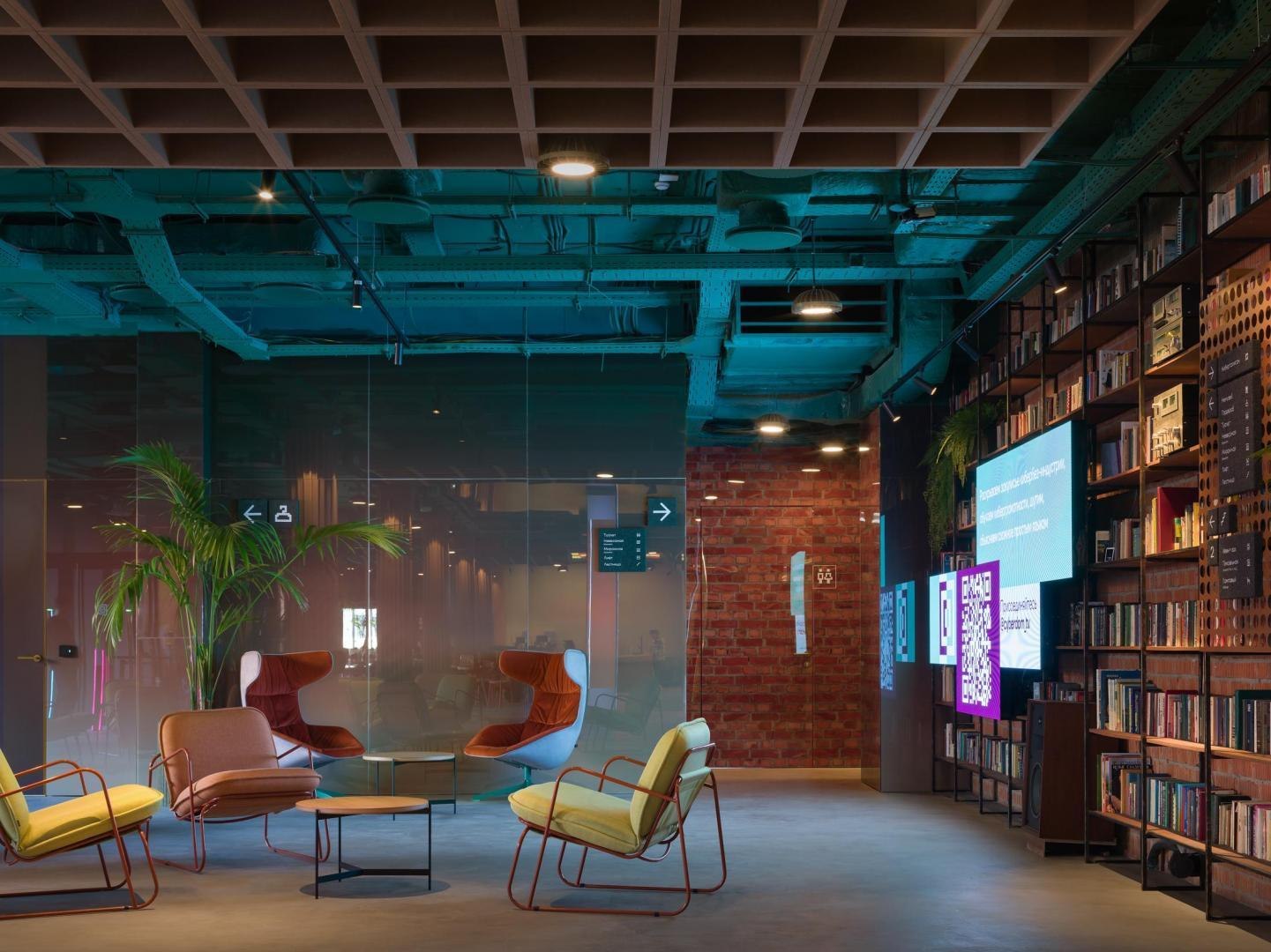 Историческое кирпичное здание стало олицетворением физической реальности, а пристроенный к нему белый лаконичный объем – образом реальности цифровой. Главный вход расположен в кирпичной половине здания. В лаунж-пространстве, напоминающем уютную домашнюю библиотеку, практически все детали отсылают к качеству жизни в доцифровую эпоху.