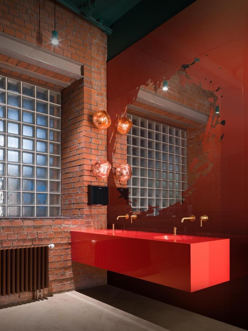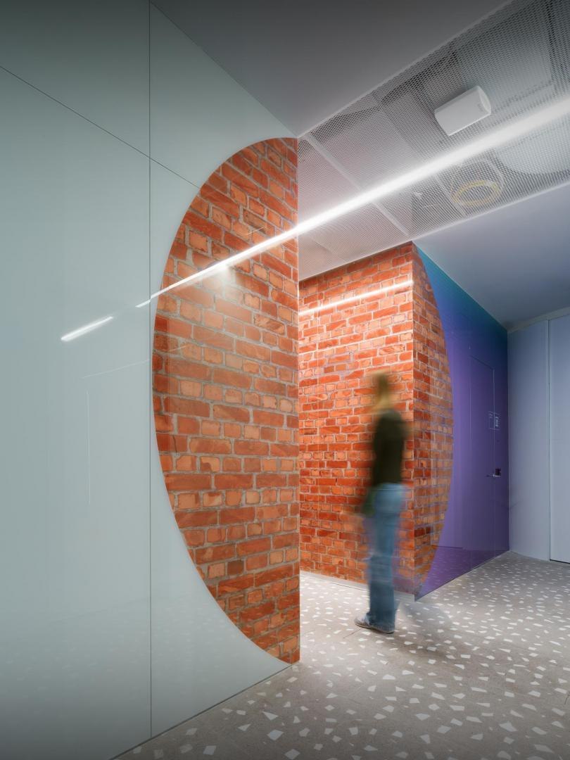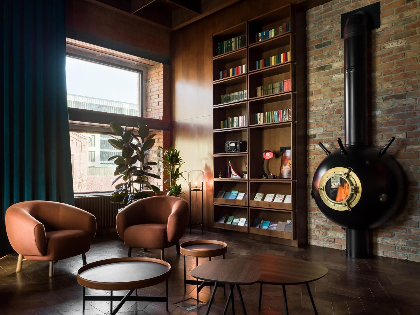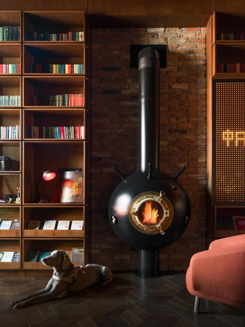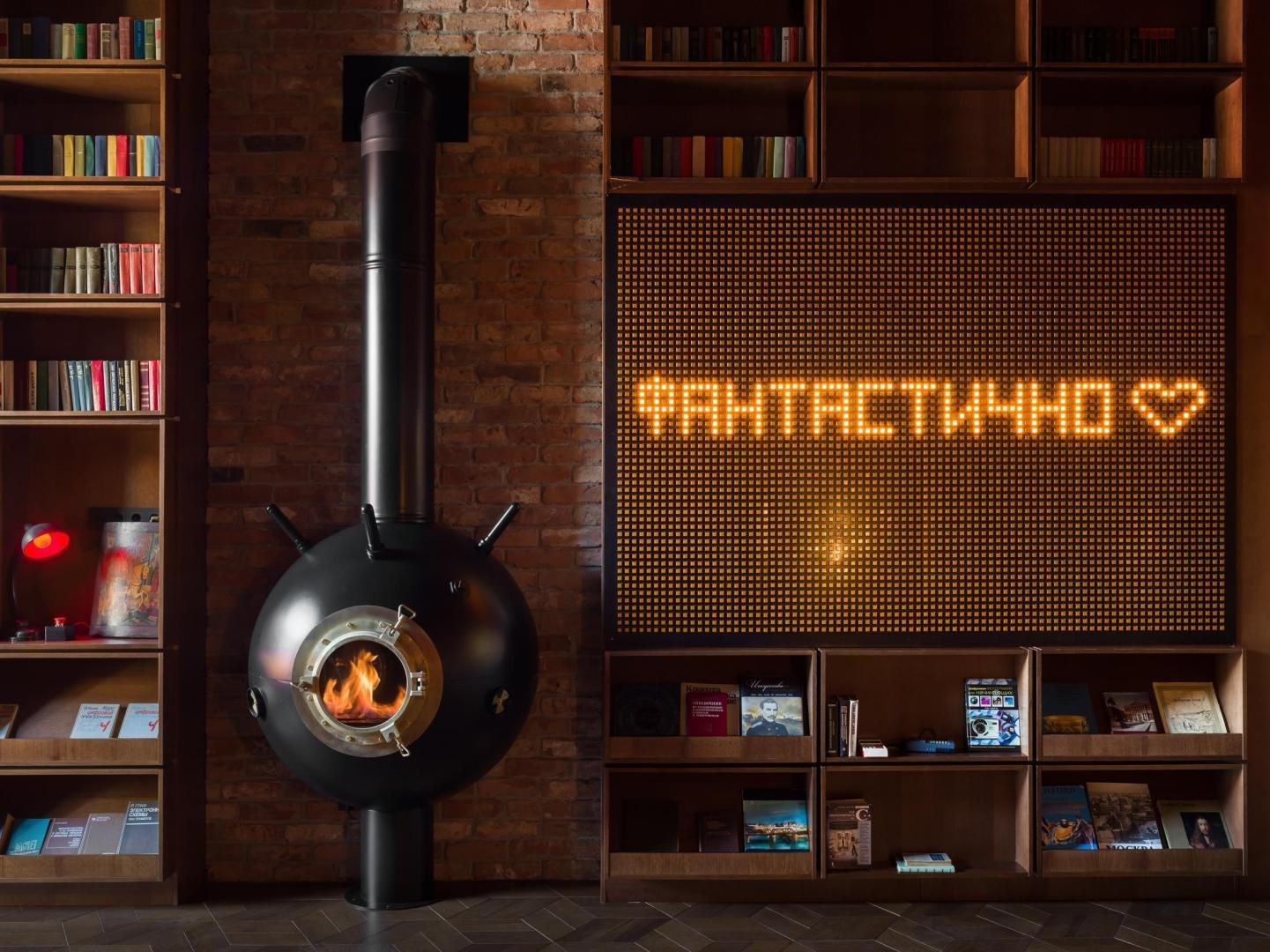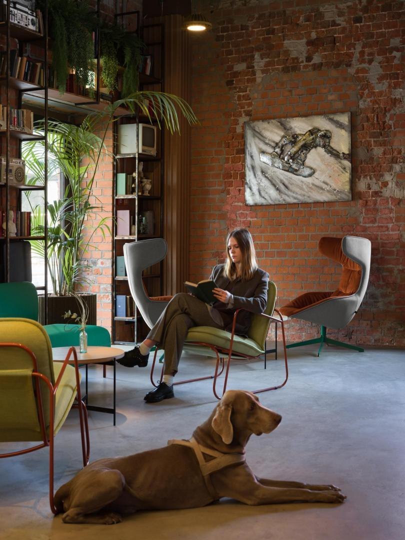 Историческое кирпичное здание стало олицетворением физической реальности, а пристроенный к нему белый лаконичный объем – образом реальности цифровой. Главный вход расположен в кирпичной половине здания. В лаунж-пространстве, напоминающем уютную домашнюю библиотеку, практически все детали отсылают к качеству жизни в доцифровую эпоху.