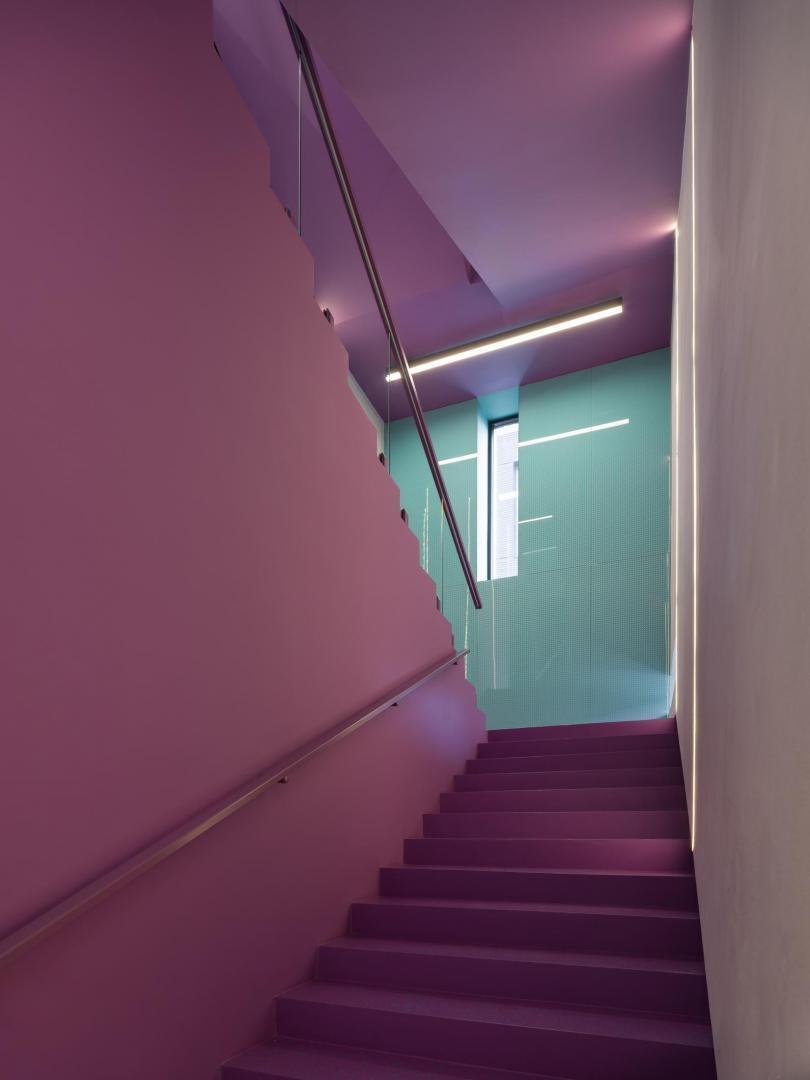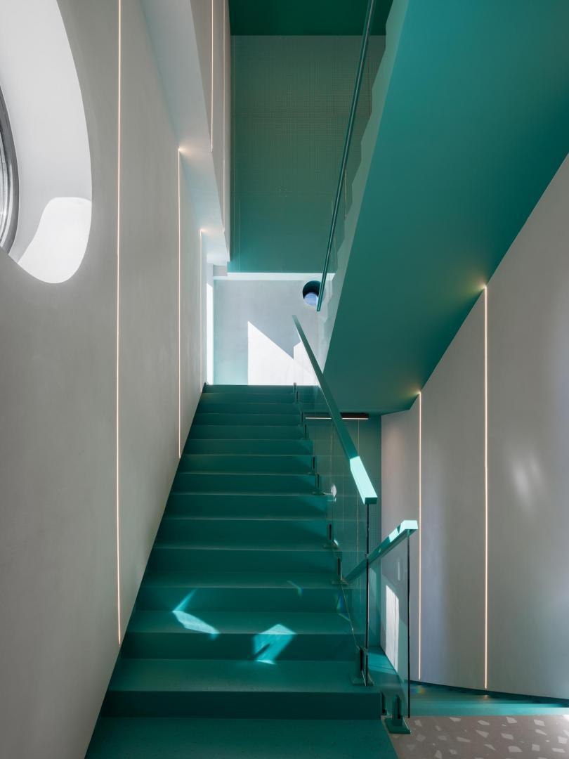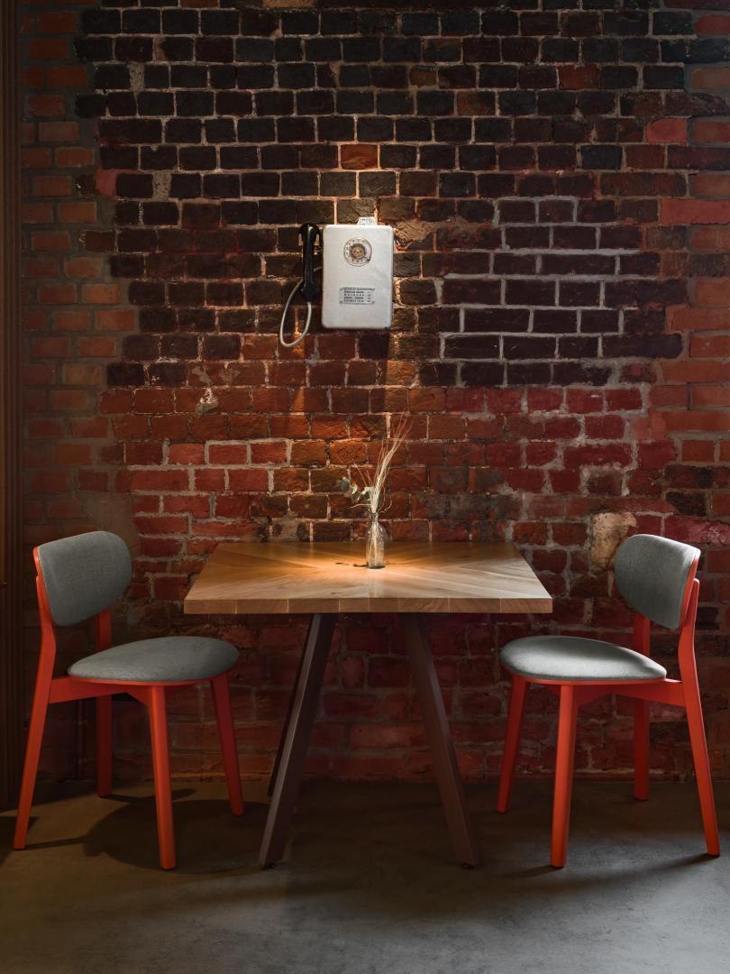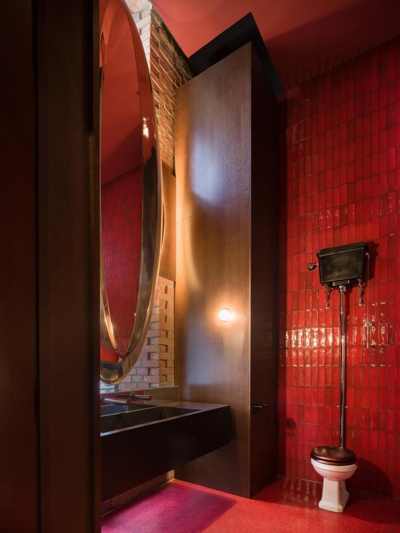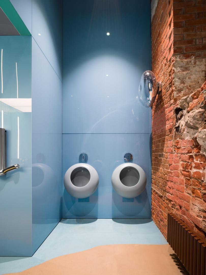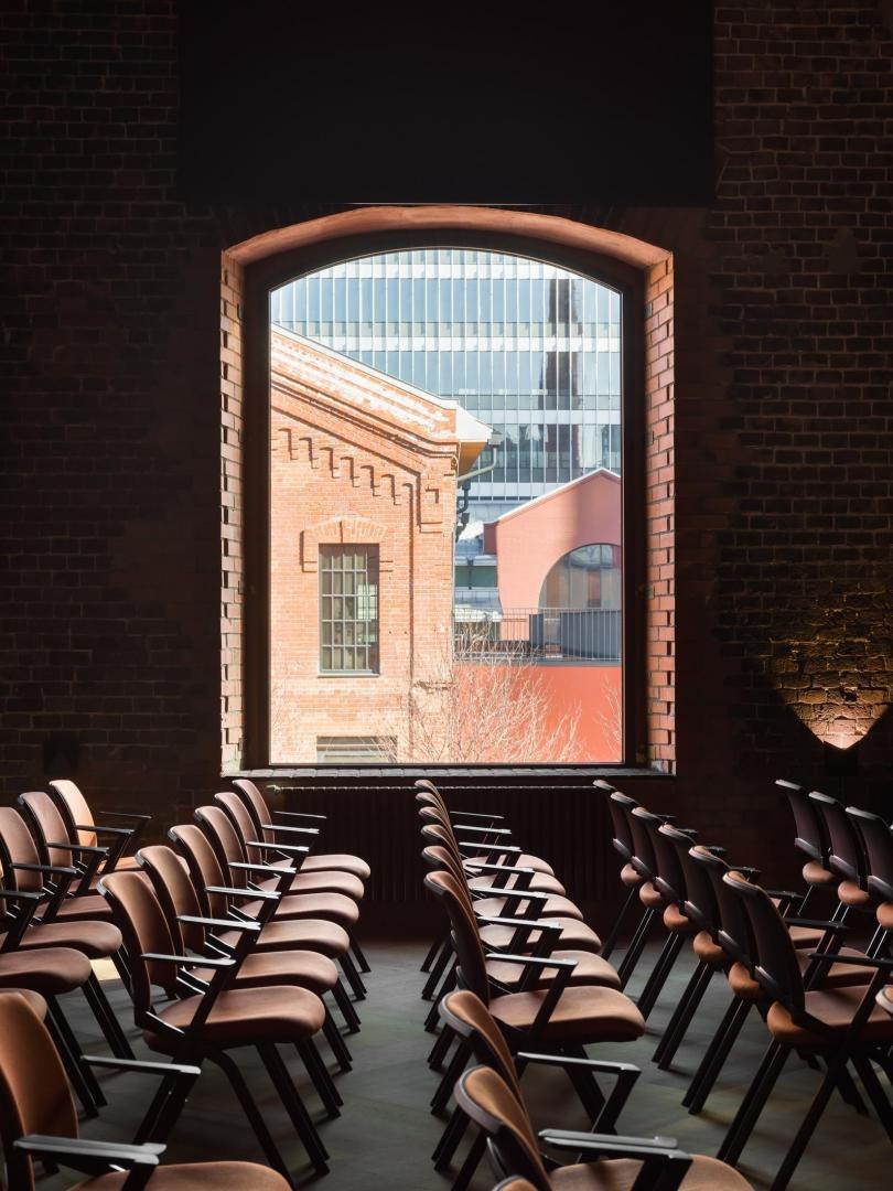 Историческое кирпичное здание стало олицетворением физической реальности, а пристроенный к нему белый лаконичный объем – образом реальности цифровой. Главный вход расположен в кирпичной половине здания. В лаунж-пространстве, напоминающем уютную домашнюю библиотеку, практически все детали отсылают к качеству жизни в доцифровую эпоху.