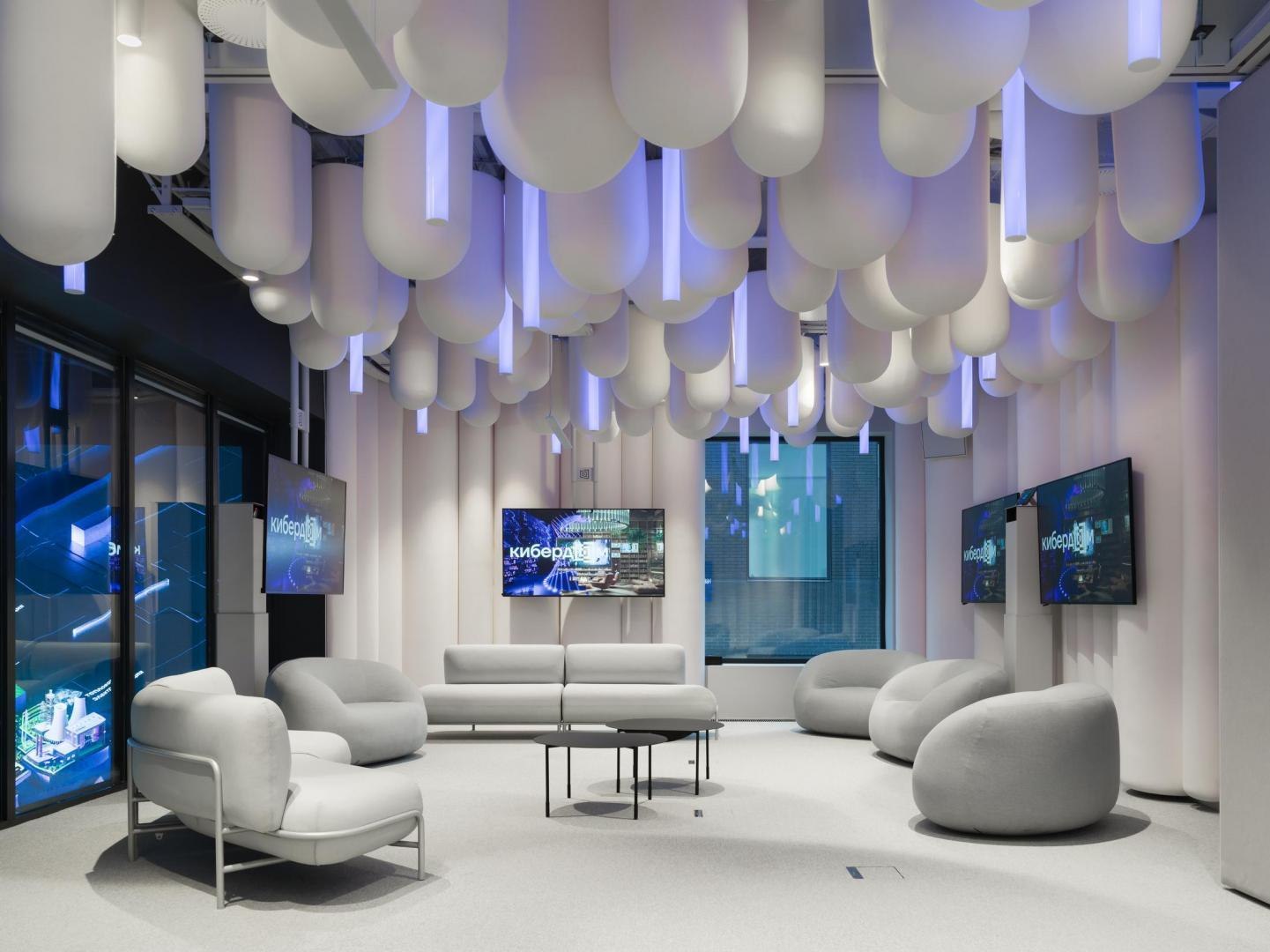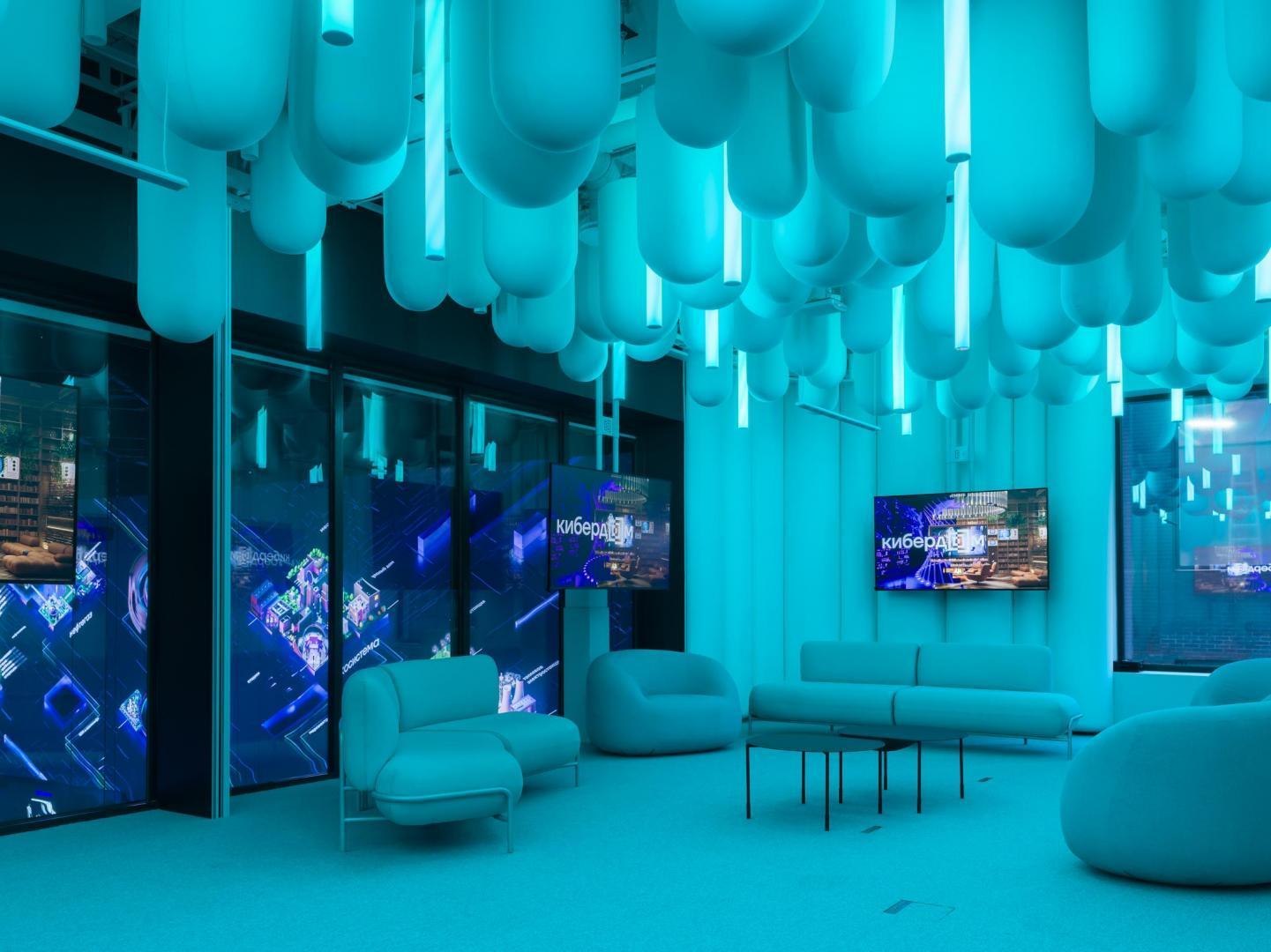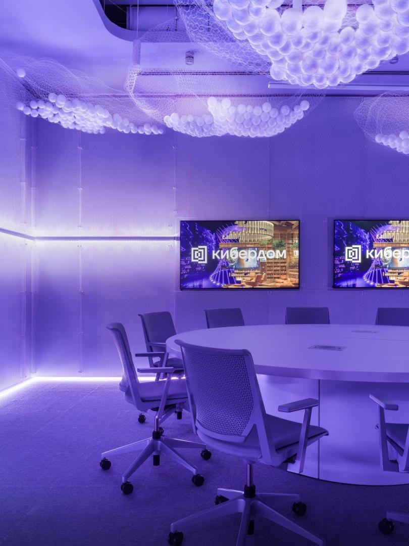 Образное решение «цифровых» ахроматических белоснежных помещений транслирует идею выхода из пространства реальности. Ее по-разному передают тематические переговорные в белой части «Кибердома» на первом этаже. В «Миражной» за матовым стеклом видны библиотечные полки с книгами, но это лишь их изображение. В «Невесомой» за счет зеркальных поверхностей и встроенных источников света возникает эффект левитирующего стола и стен. В «Облачной» создан образ кучевых облаков и сияющей линией горизонта. В «Эфирной» с бесконечной циклорамой и встроенным закругленным экраном ведутся прямые включения. На втором этаже расположена «Мягкая» переговорная: за образ отвечают подвешенные дутые баллоны со спрятанными между них трубчатыми светильниками, и поверхности со скругленными углами и мягким наполнителем. В «Пиксельной» пиксализация пространства имитируется за счет выступающих из стены квадратных панелей и кубических светильников. Светодиодные системы освещения всех переговорных могут работать в RGBW-режимах.