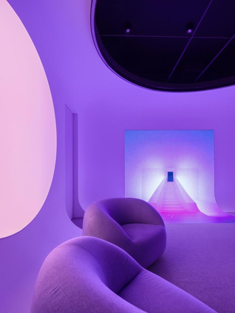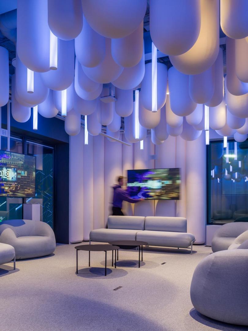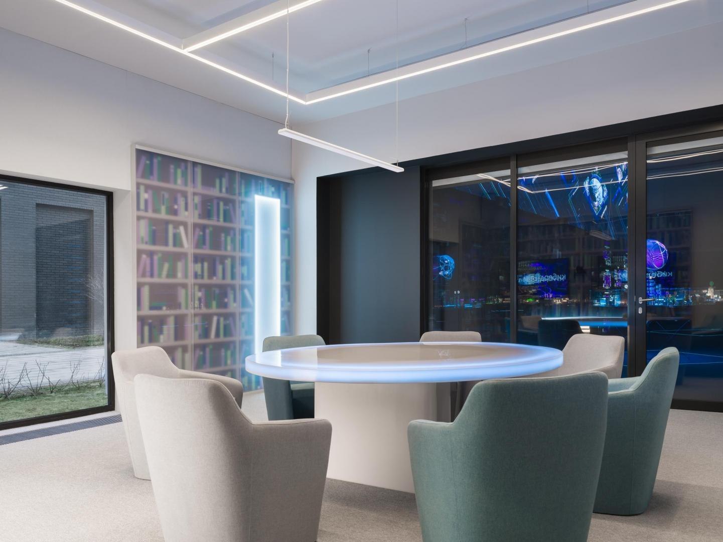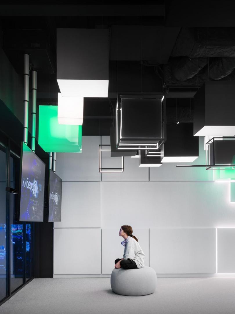 Образное решение «цифровых» ахроматических белоснежных помещений транслирует идею выхода из пространства реальности. Ее по-разному передают тематические переговорные в белой части «Кибердома» на первом этаже. В «Миражной» за матовым стеклом видны библиотечные полки с книгами, но это лишь их изображение. В «Невесомой» за счет зеркальных поверхностей и встроенных источников света возникает эффект левитирующего стола и стен. В «Облачной» создан образ кучевых облаков и сияющей линией горизонта. В «Эфирной» с бесконечной циклорамой и встроенным закругленным экраном ведутся прямые включения. На втором этаже расположена «Мягкая» переговорная: за образ отвечают подвешенные дутые баллоны со спрятанными между них трубчатыми светильниками, и поверхности со скругленными углами и мягким наполнителем. В «Пиксельной» пиксализация пространства имитируется за счет выступающих из стены квадратных панелей и кубических светильников. Светодиодные системы освещения всех переговорных могут работать в RGBW-режимах.