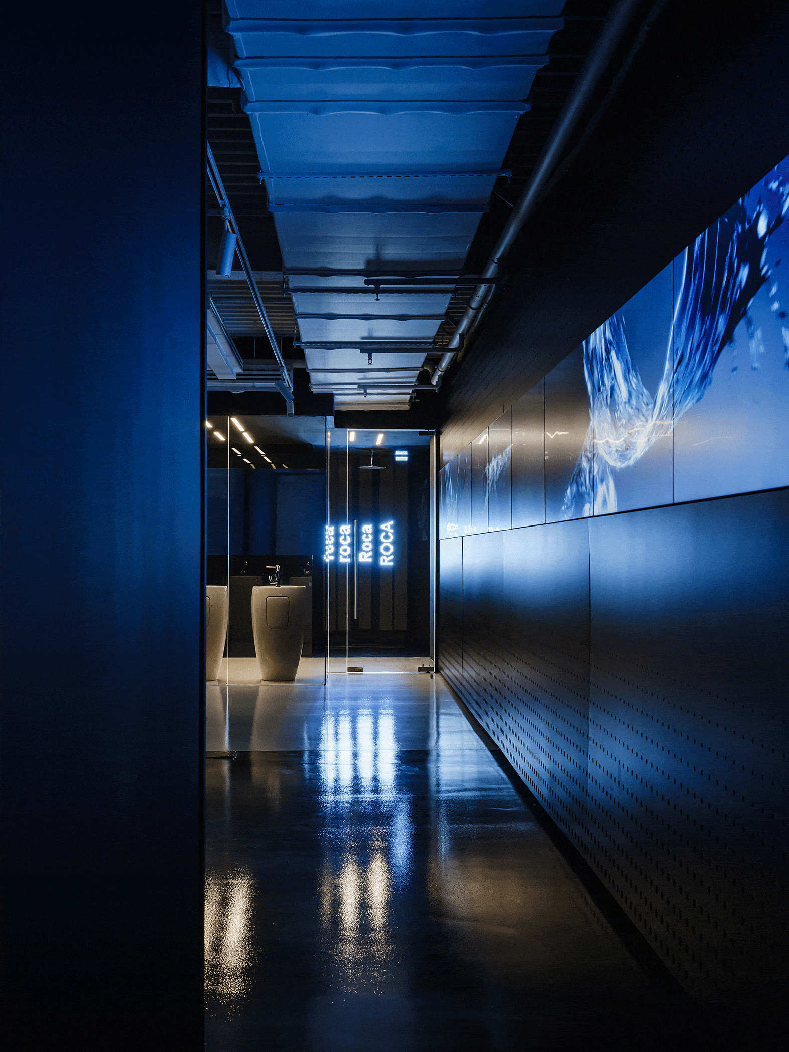 Тема воды, без которой невозможно функционирование решений ROCA GROUP, пронизывает все спроектированные здесь на площади 700 квадратных метров функциональные зоны. Свободным, мощным, меняющимся потоком вода перетекает, бурлит, пузырится, колышется, льется в видеоряде протяженностью 46 метров на ЖК-экранах, закрепленных на темных перфорированных HPL-панелях Fundermax, которыми облицованы стены выставочного пространства. Эти же медиа-экраны служат визуальной составляющей на различных мероприятиях, используются для трансляции фильмов и видео-материалов компании, а также для проведения digital-выставок и дизайн-конкурсов. Цифровая волна опоясывает зал для лекций, презентаций и встреч с прозрачными стульями Frilly от Kartell, а также комнаты с тематическими экспозициями, которые представляют культовые раковины LAUFEN Alessi, цветные аксессуары Kartell by LAUFEN, умный унитаз-биде Cleanet Riva, премиум-коллекцию LAUFEN The New Classic от Марселя Вандерса и элегантную Sonar от Патриции Уркиолы. В зале Roca дигитальная вода «омывает» зоны винтажной линейки Carmen, современной Beyond и Ohtake, плавно «перетекая» в пространство смесителей и решений для душа от Roca и ARMANI/Roca. Еще один информационный поток из логотипа «Roca» льется с потолка в виртуальной душевой комнате, отражаясь в поверхностях пола и потолка.