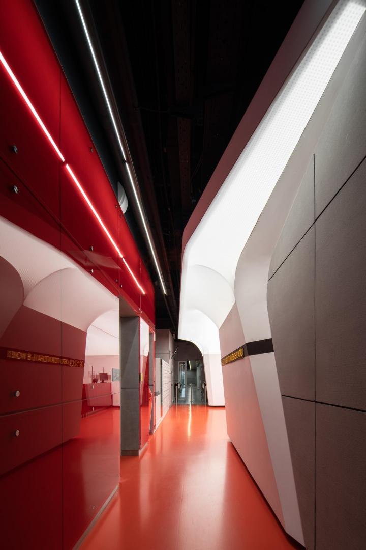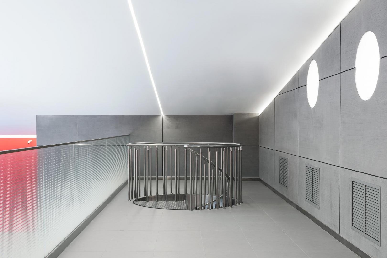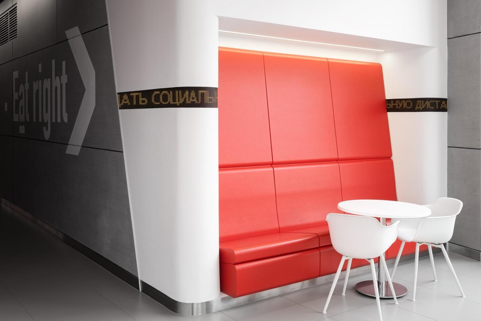 В основу концепции легла идея динамики, движения, построенная на столкновении двух противоположных начал, в результате которого рождается энергия. Сталкивающиеся полюса выражены в виде цветов и материалов: белый – пластичный, тягучий, антропоморфный, женственный; серый – бетонный, маскулинный, тяжелый, брутальный. Их взаимодействие рождает красный – энергичный, пульсирующий, объединяющий, он наполняет пространство движением, биением сердца.