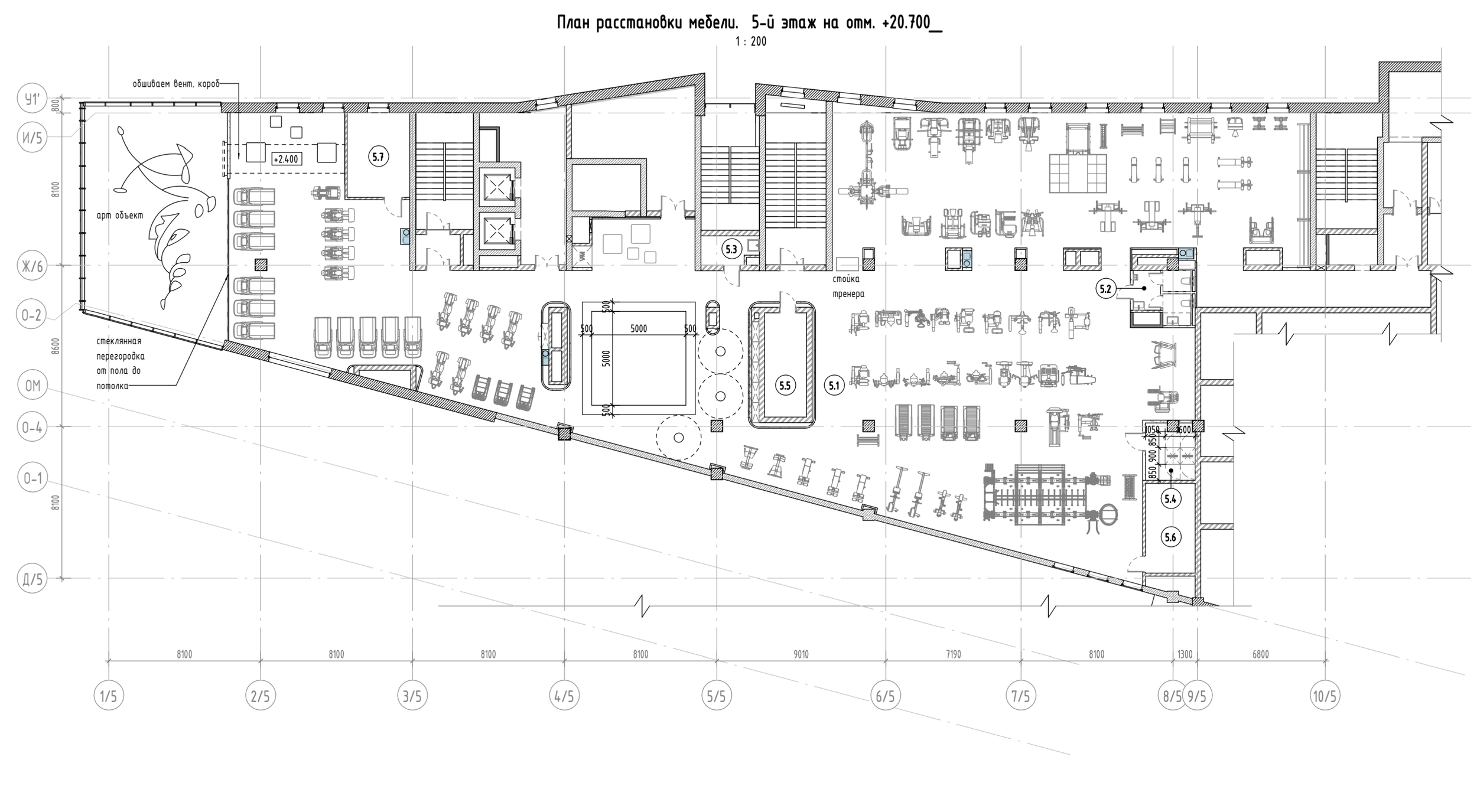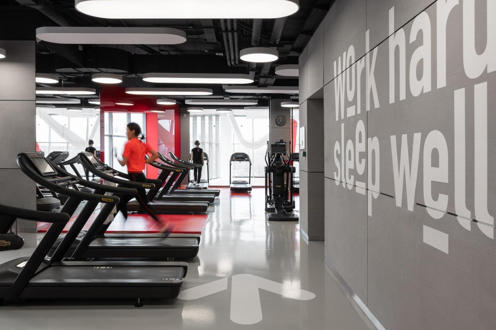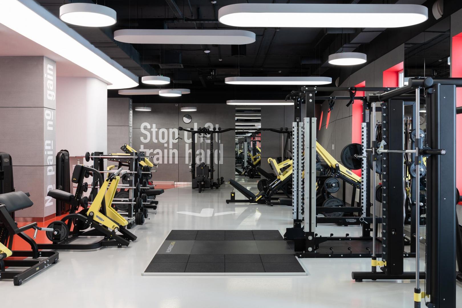 Все это ощущается на интуитивном уровне, и в клубах возникает способствующая активности, тонизирующая среда. Неотъемлемой частью общей концепции интерьеров является уникальный графический язык, который подчеркивает архитектурные формы и вместе с ними работает на цельный образ: наиболее характерными зонами с графикой в каждом клубе сети являются раздевалки. В отделке клубов использованы выразительные материалы, такие как облицовочные плиты, имитирующие бетонный монолит со следами опалубочного крепления и стеклянные элементы со встроенным светом.