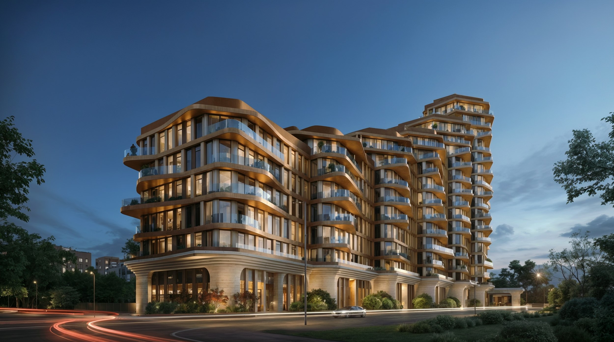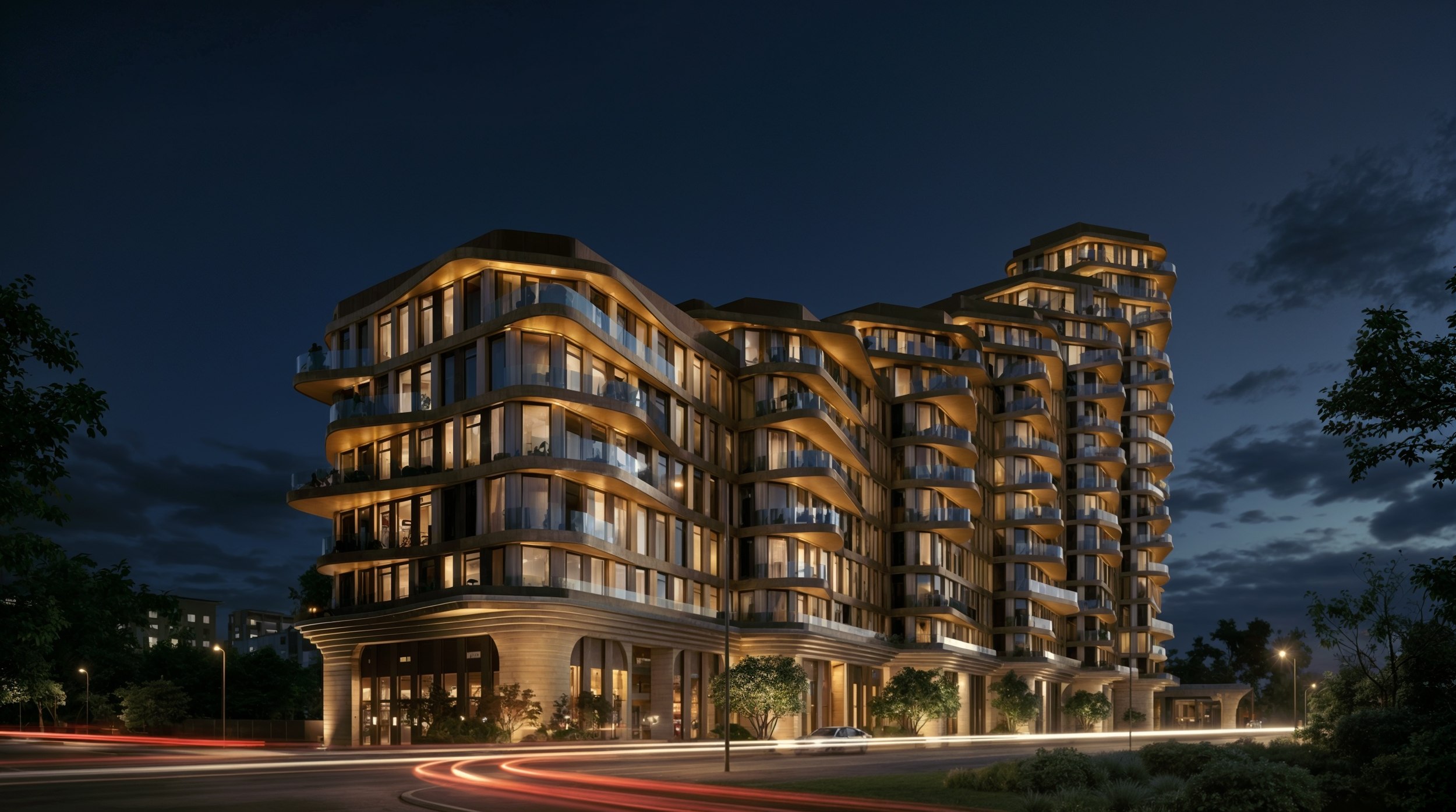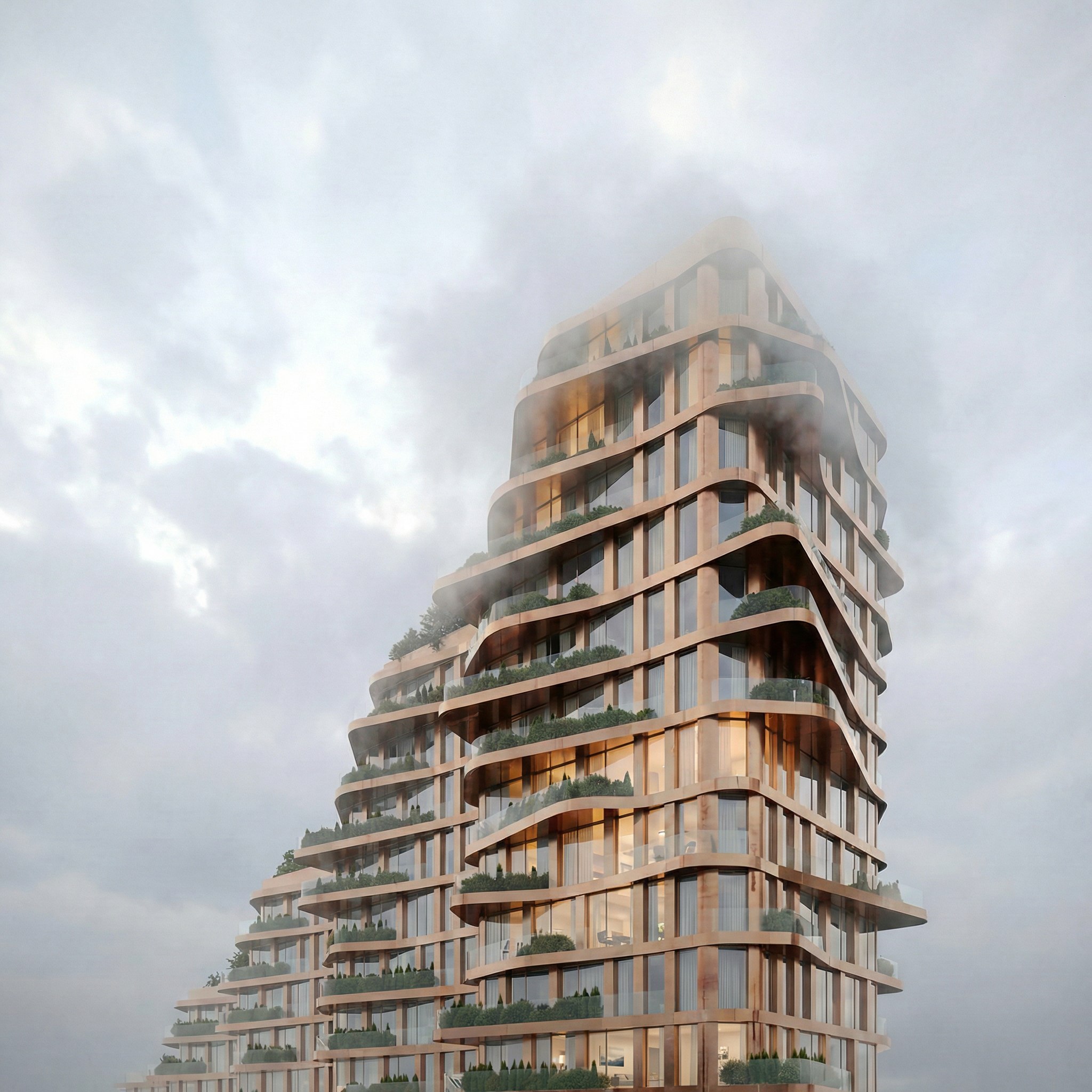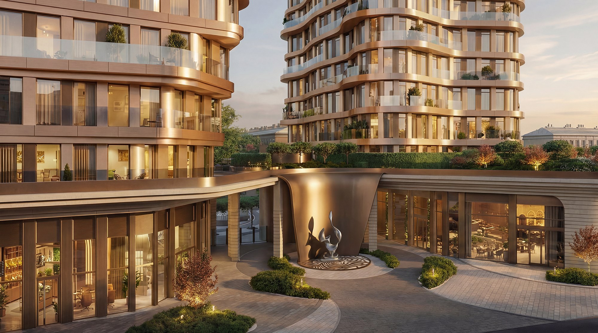 При этом композиция не спорит с районом высотой: ступенчатый массинг и перепады объемов собирают ансамбль в протяженный городской фронт, где пластика фасадов становится главным акцентом вместо вертикального доминирования.