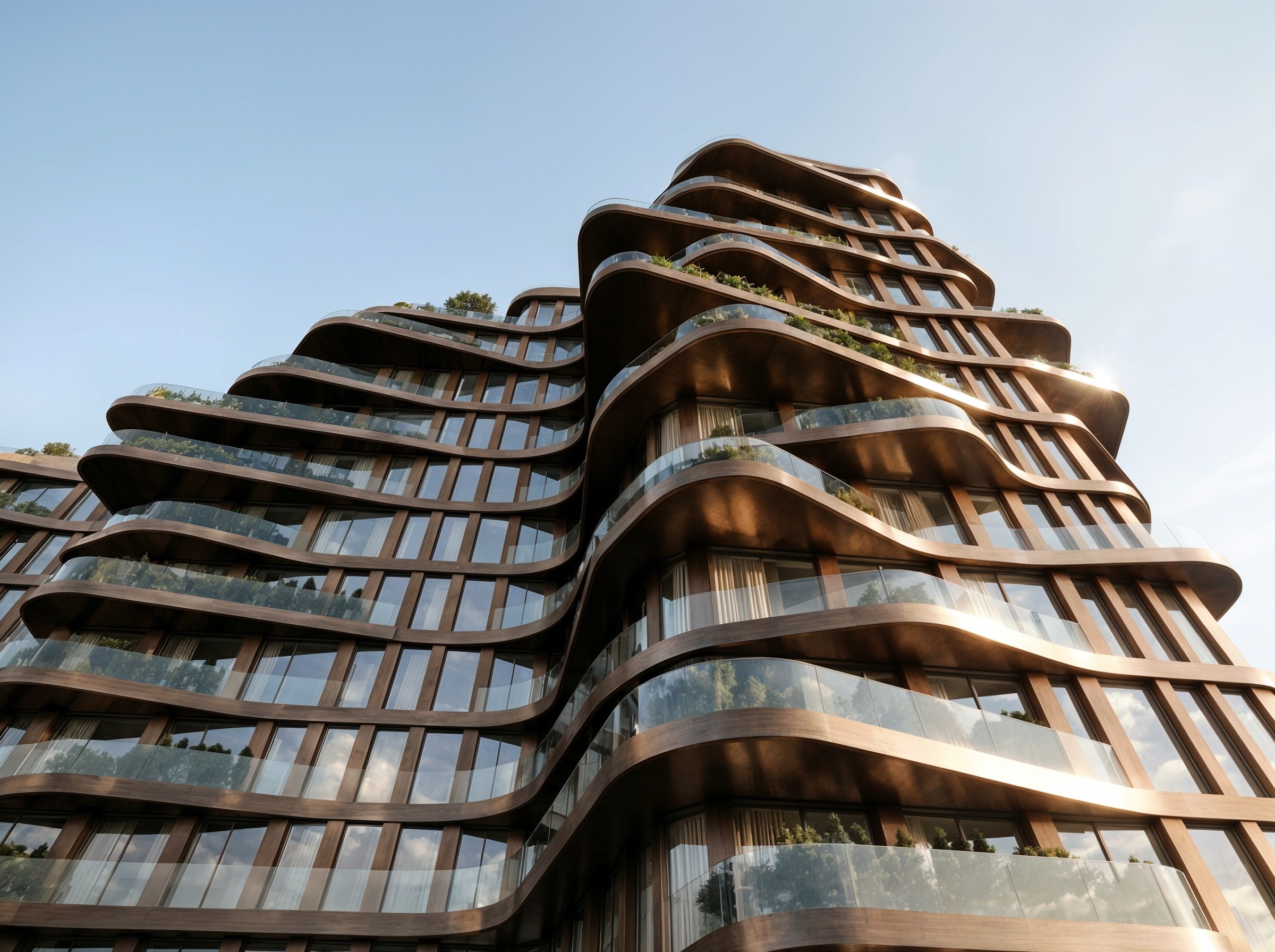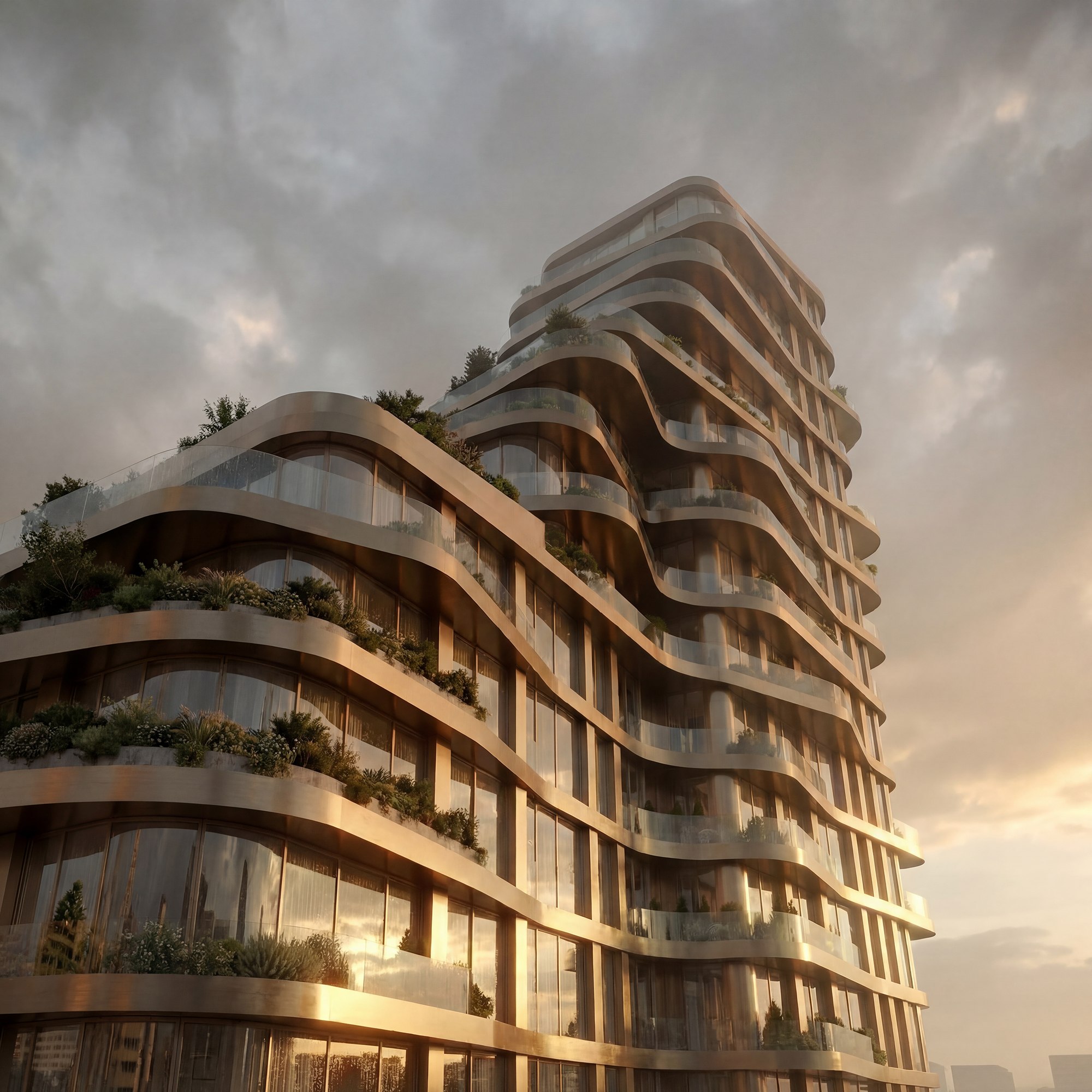 Фасадная тема строится на контрасте прозрачности и плотного «пояса» горизонтальных лент: крупное остекление усиливает легкость, а обтекаемые межэтажные пояса подчеркивают непрерывность линии и эффект скольжения света по поверхности.
