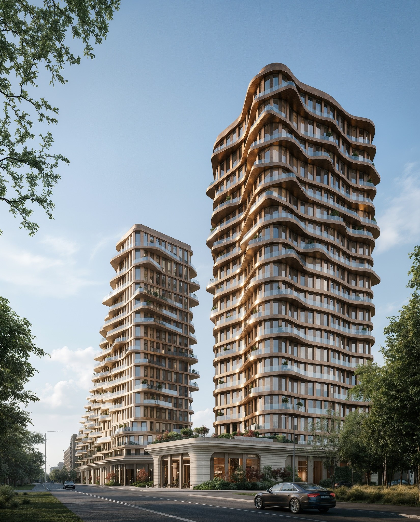 Название «МУЗА» в проекте прочитывается как принцип формообразования: здания собраны из текучих горизонталей, которые «обнимают» объемы и создают эффект непрерывного движения – от мягких уступов к более выраженному высотному акценту.