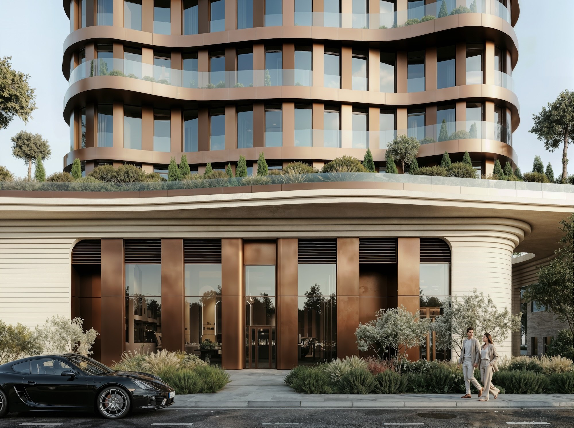 Первые этажи сделаны как часть городской улицы – с большими витринами и выразительным «основанием» здания. Массивный цоколь и широкие входы формируют активный уличный фасад и делают дом заметным и открытым городу, при этом жилые этажи выше остаются спокойными и приватными.