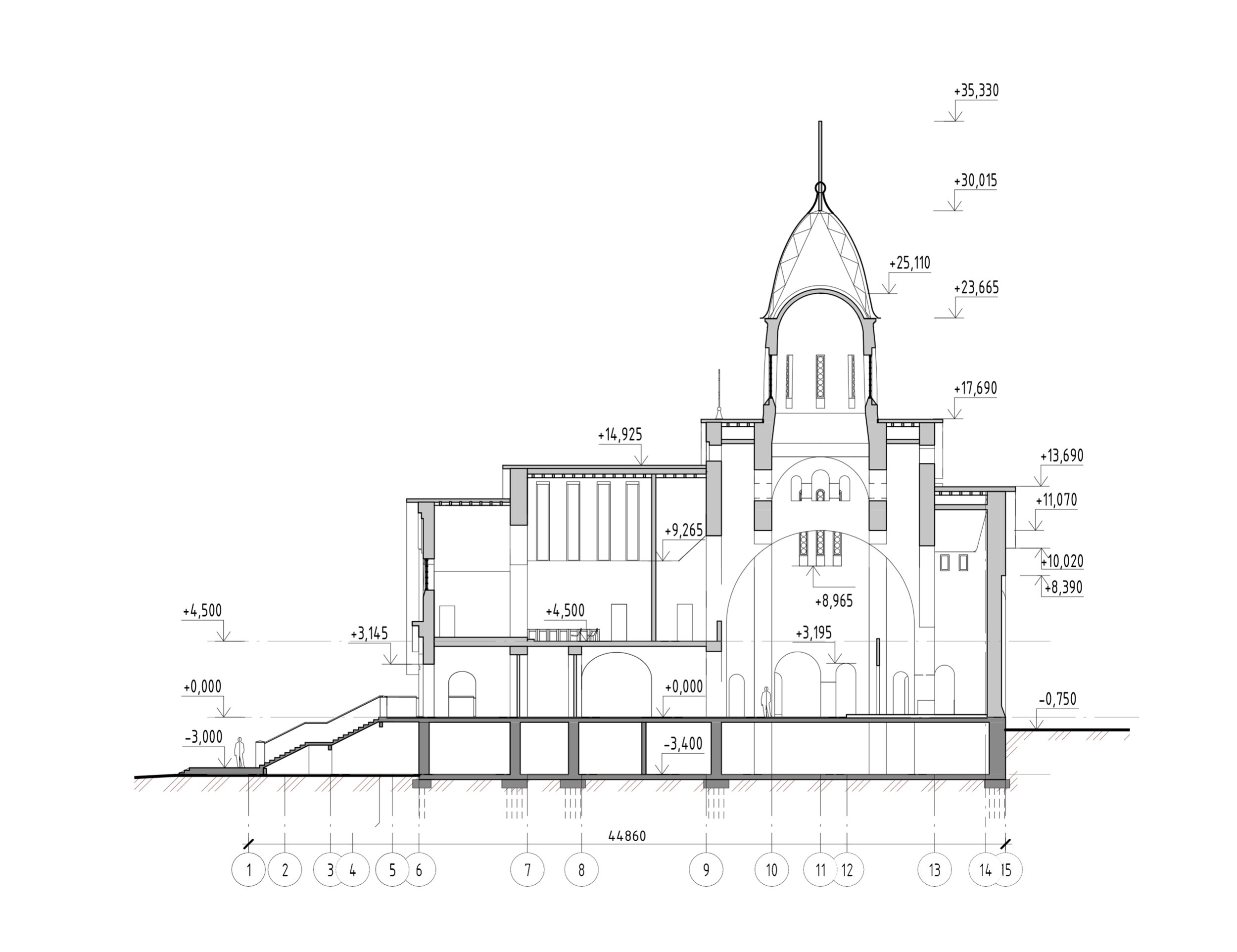 В стилобате размещаются культурно-досуговые помещения: кафе, церковная лавка, кухня, санузлы, помещения инженерного оборудования, паркинг.