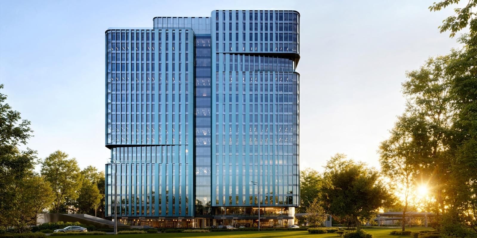 Благоустройство участка площадью 0,85 га включает рекреационные зоны, амфитеатр на кровле паркинга, велопарковки, озеленение и элементы геопластики. Территория бизнес-центра будет открыта и интегрирована в городскую среду.