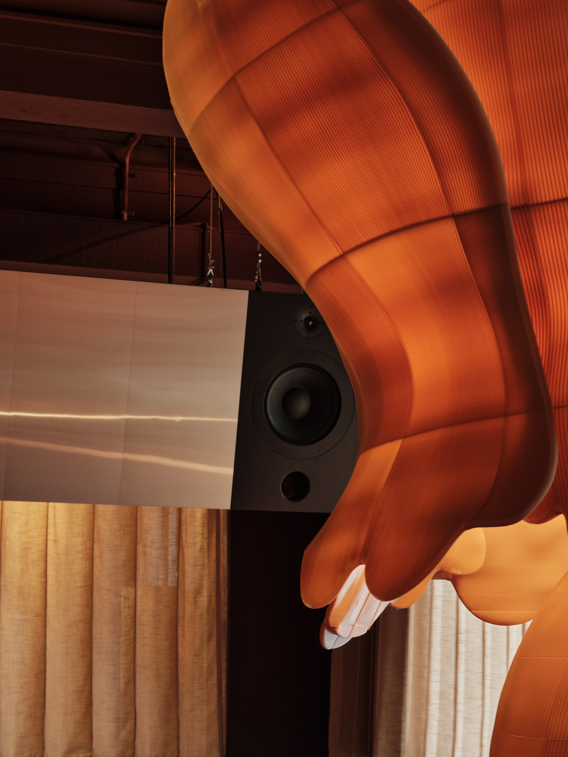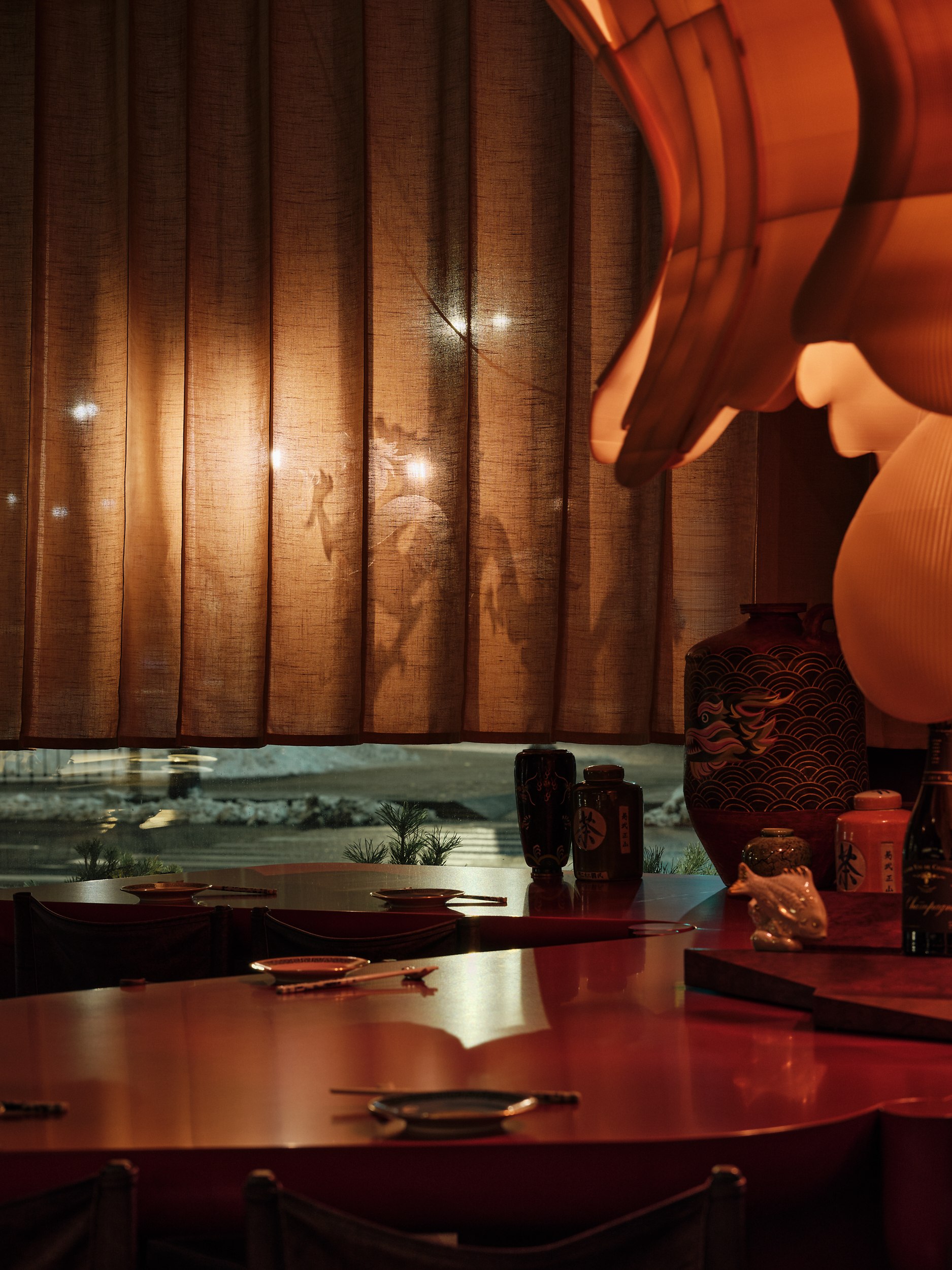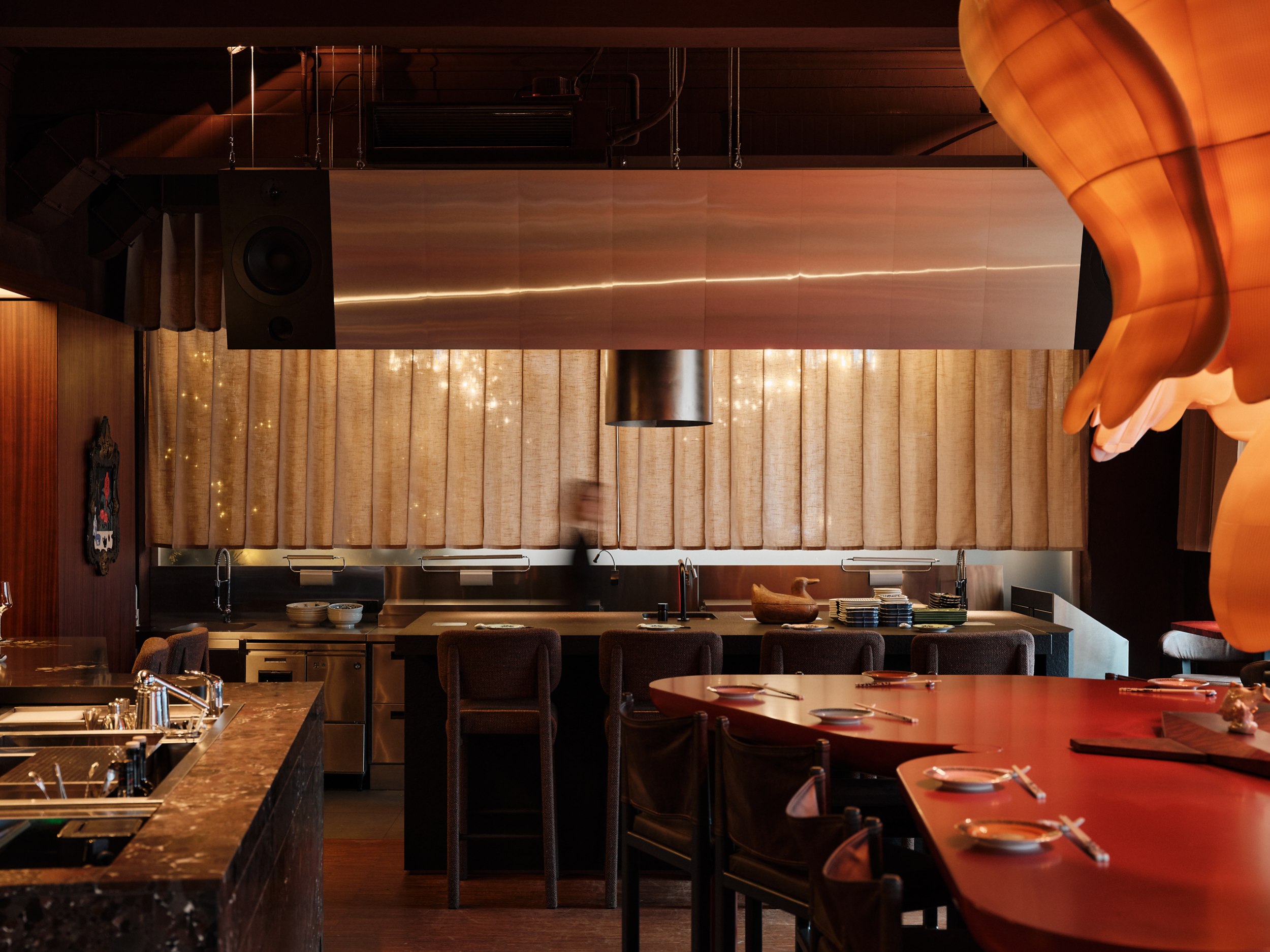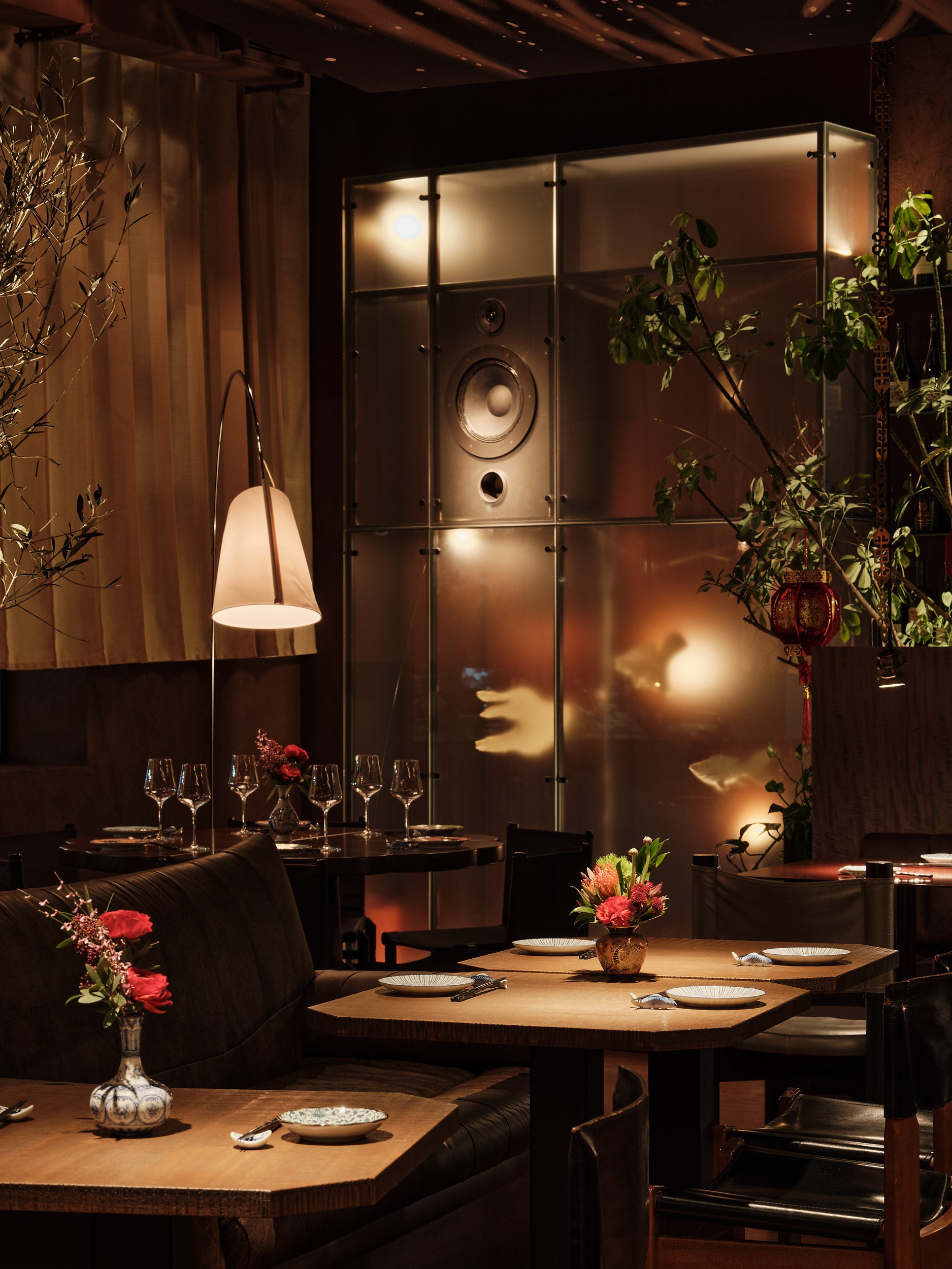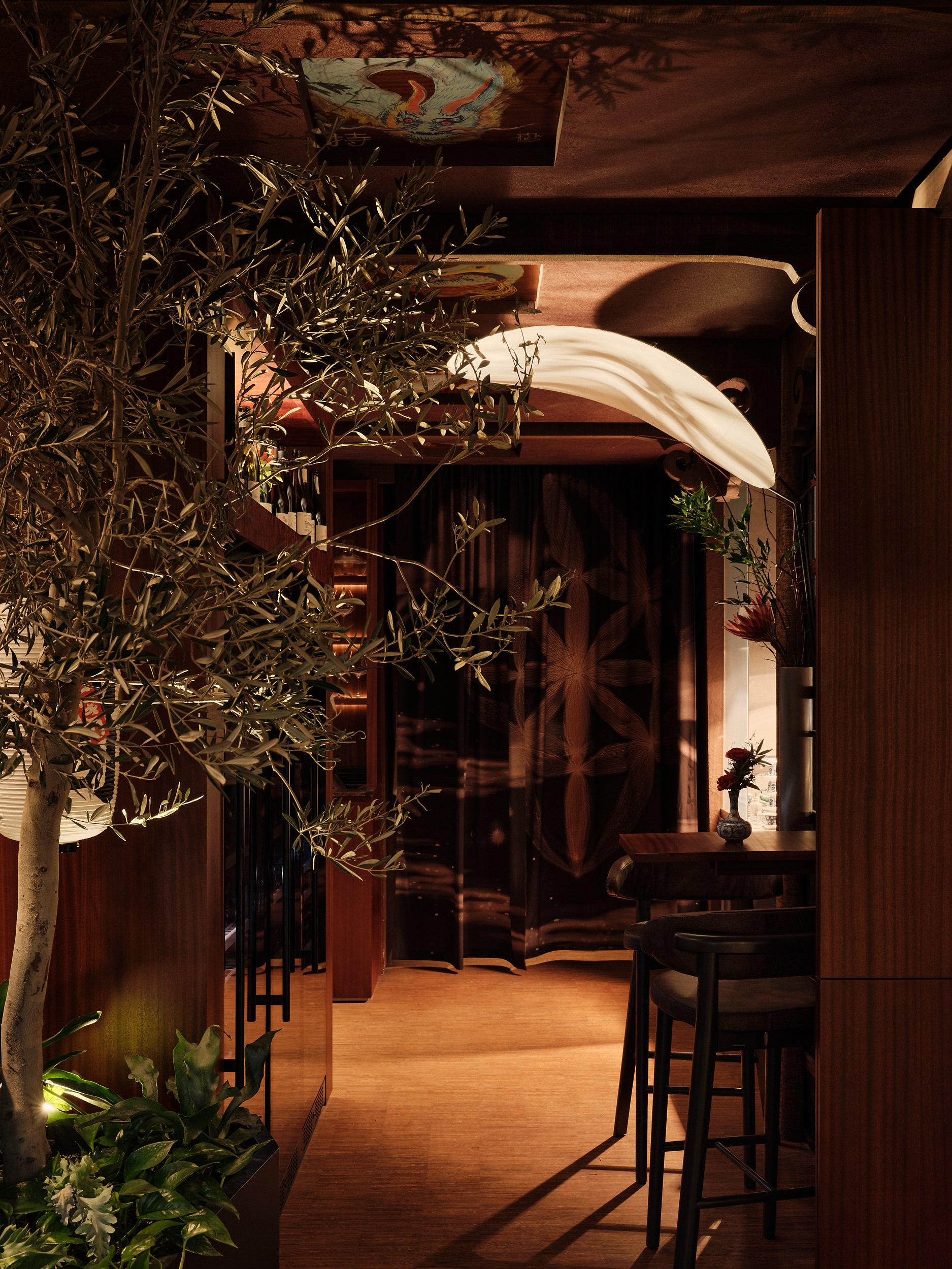 Игра теней на шторах напоминает китайский театр теней, где свет и тьма символизируют границу между мирами. Этот прием добавляет пространству глубину и усиливает его мистическую атмосферу. Все световые решения реализованы командой Poisson Spot.
