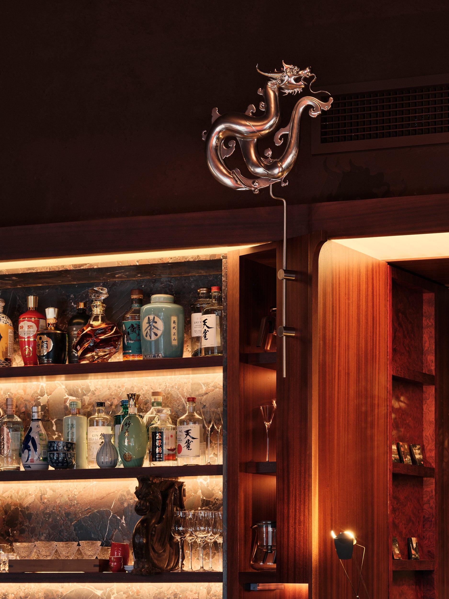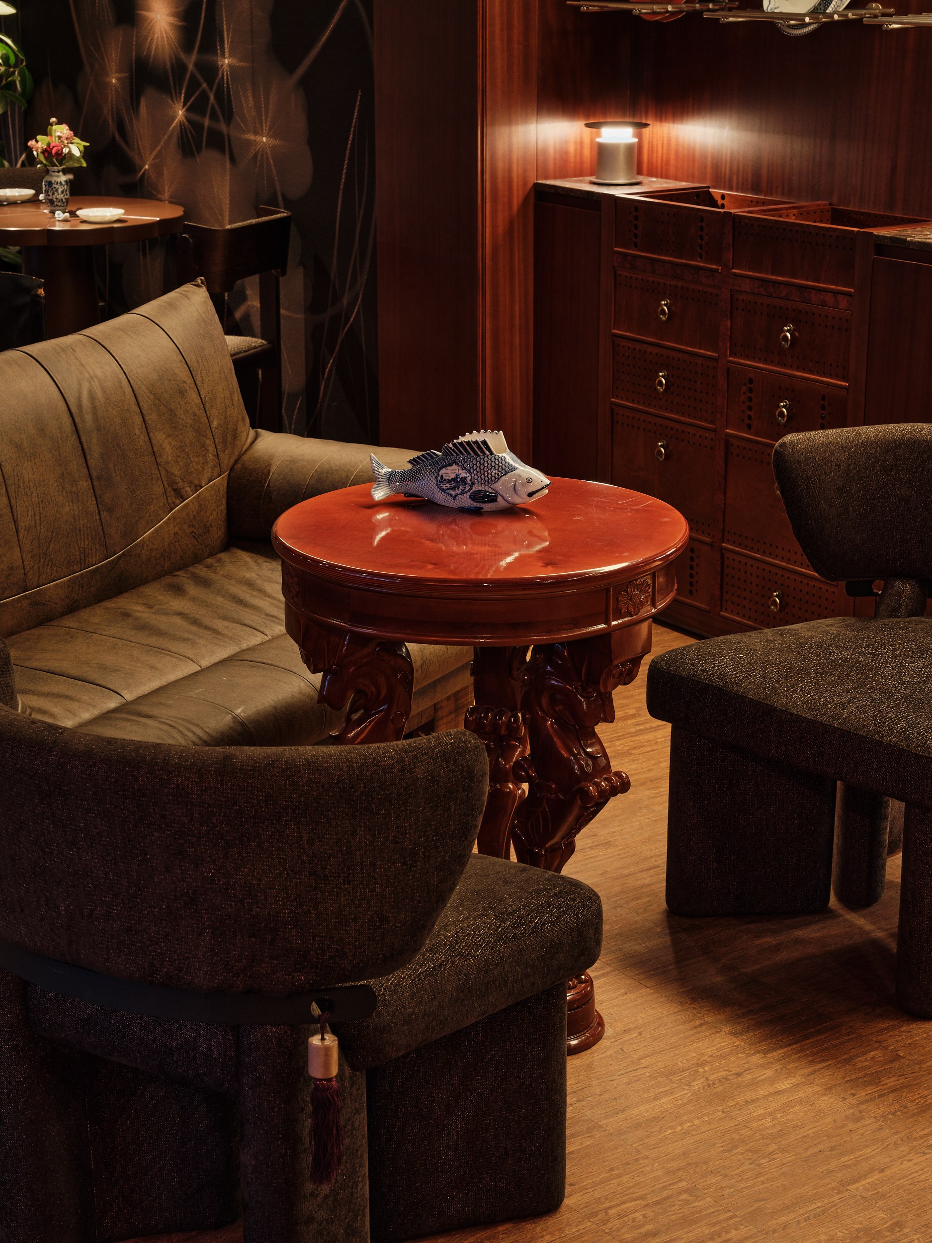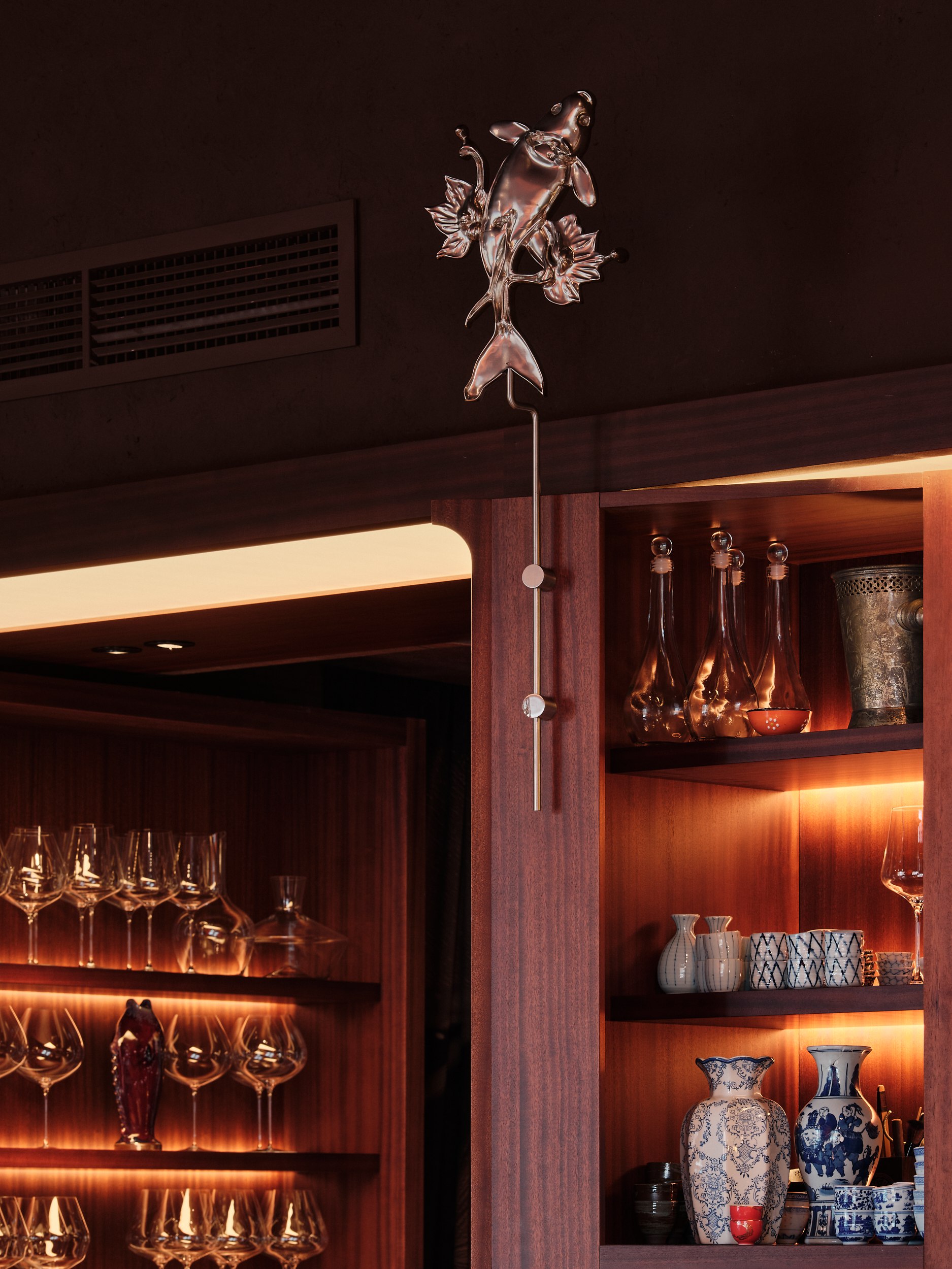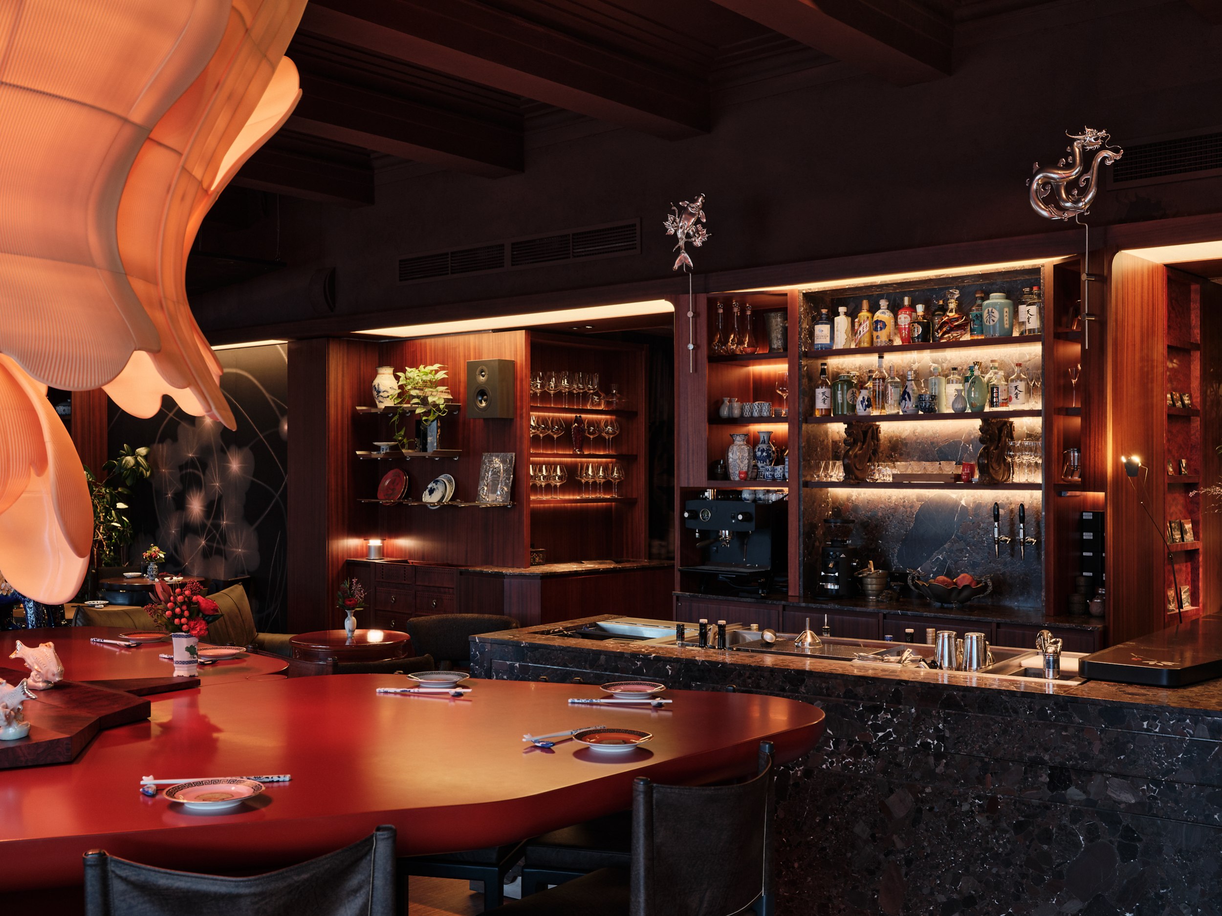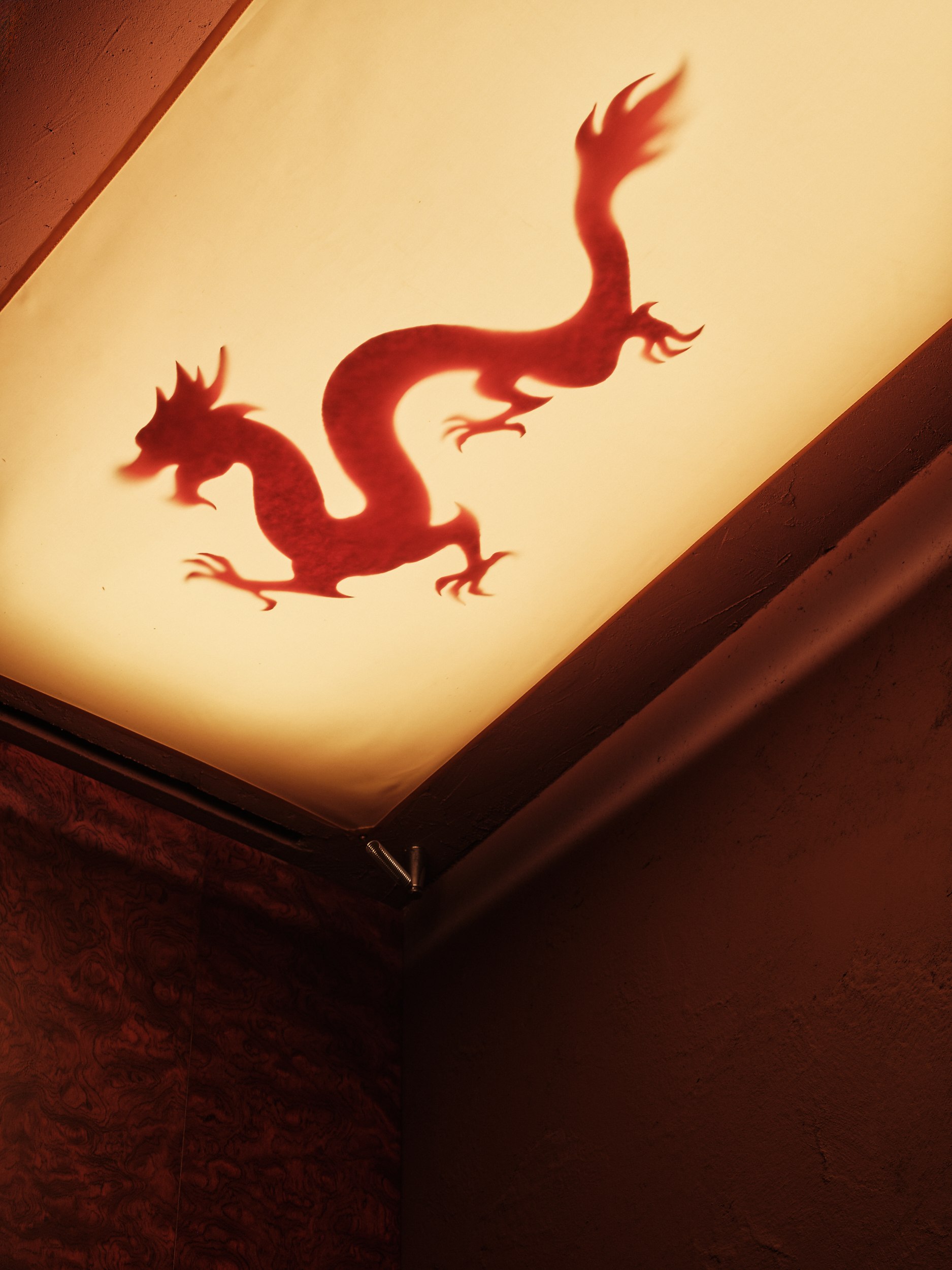 Бар решен как китайский сундук и дополнен образами карпа и дракона – символами трансформации, силы и мудрости. В зале дракон появляется вновь, уже как защитный и благоприятный знак, связанный с энергией ян.