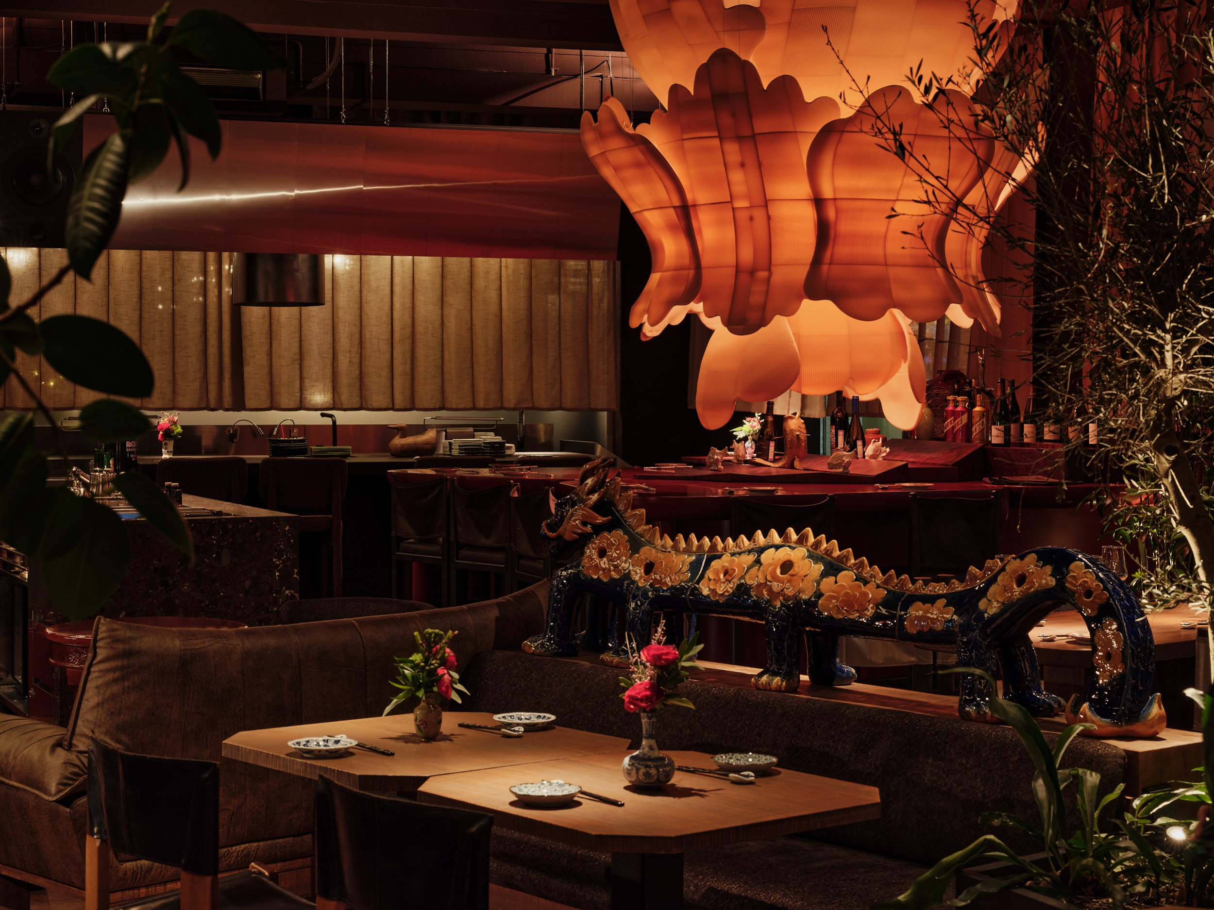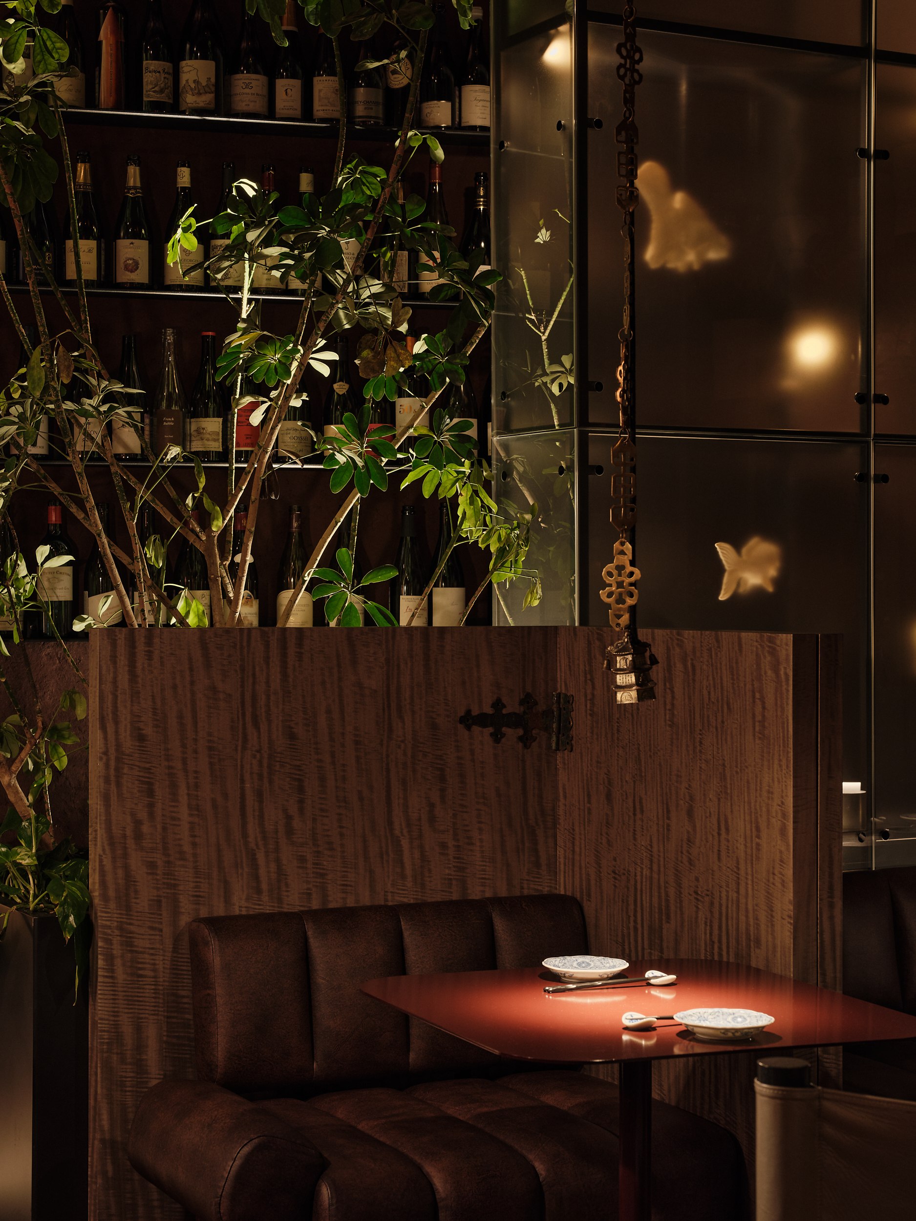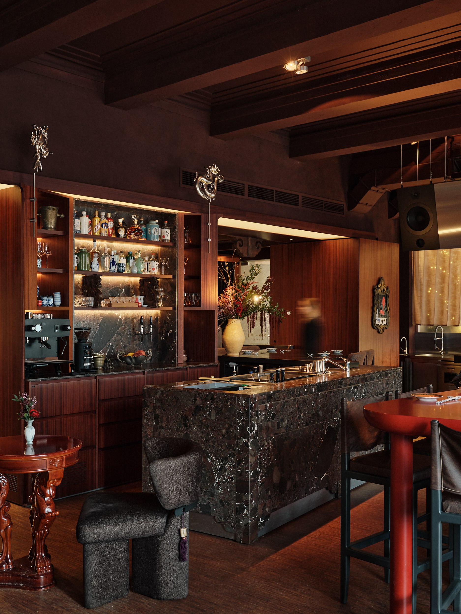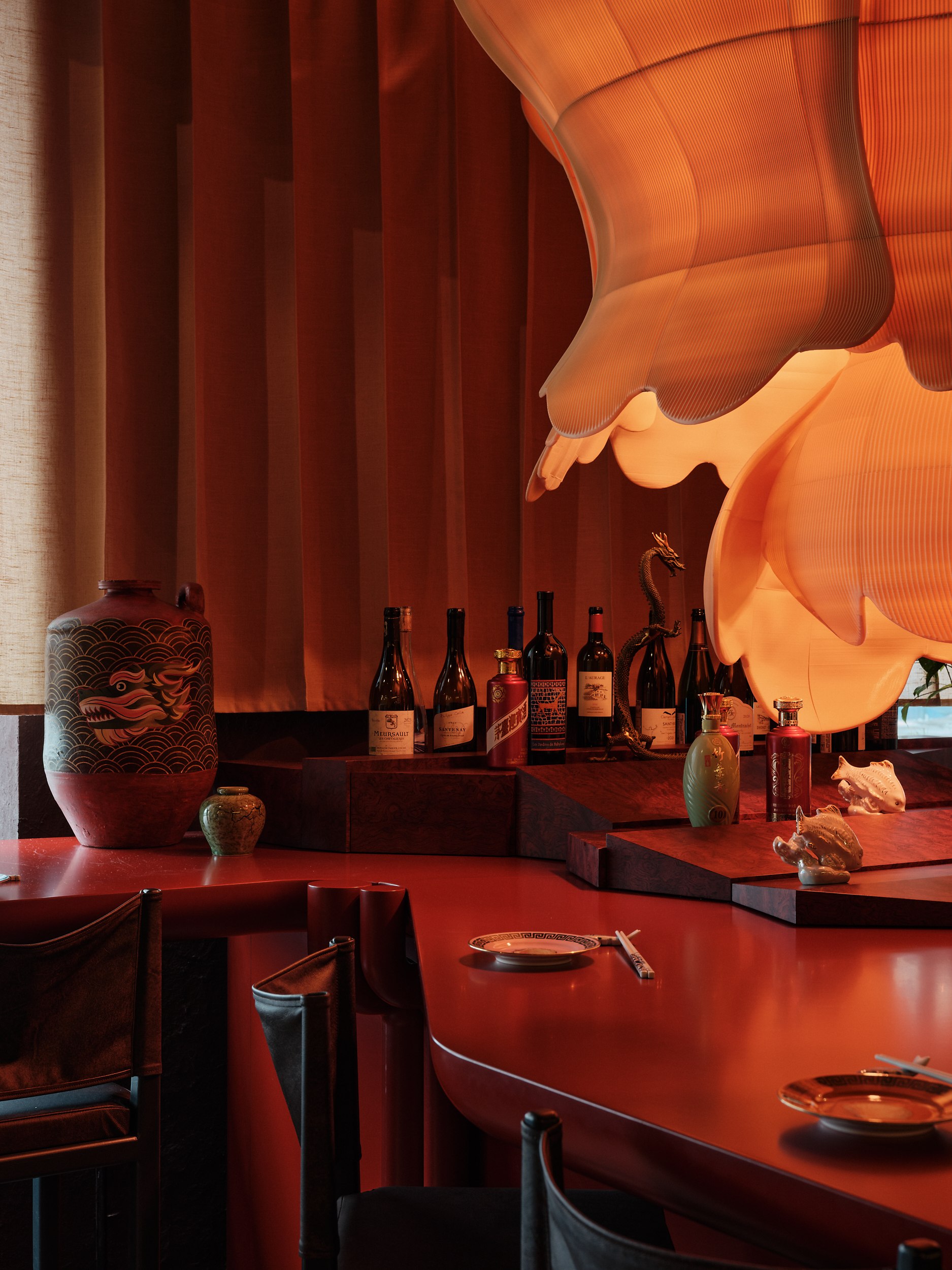 Бар решен как китайский сундук и дополнен образами карпа и дракона – символами трансформации, силы и мудрости. В зале дракон появляется вновь, уже как защитный и благоприятный знак, связанный с энергией ян.