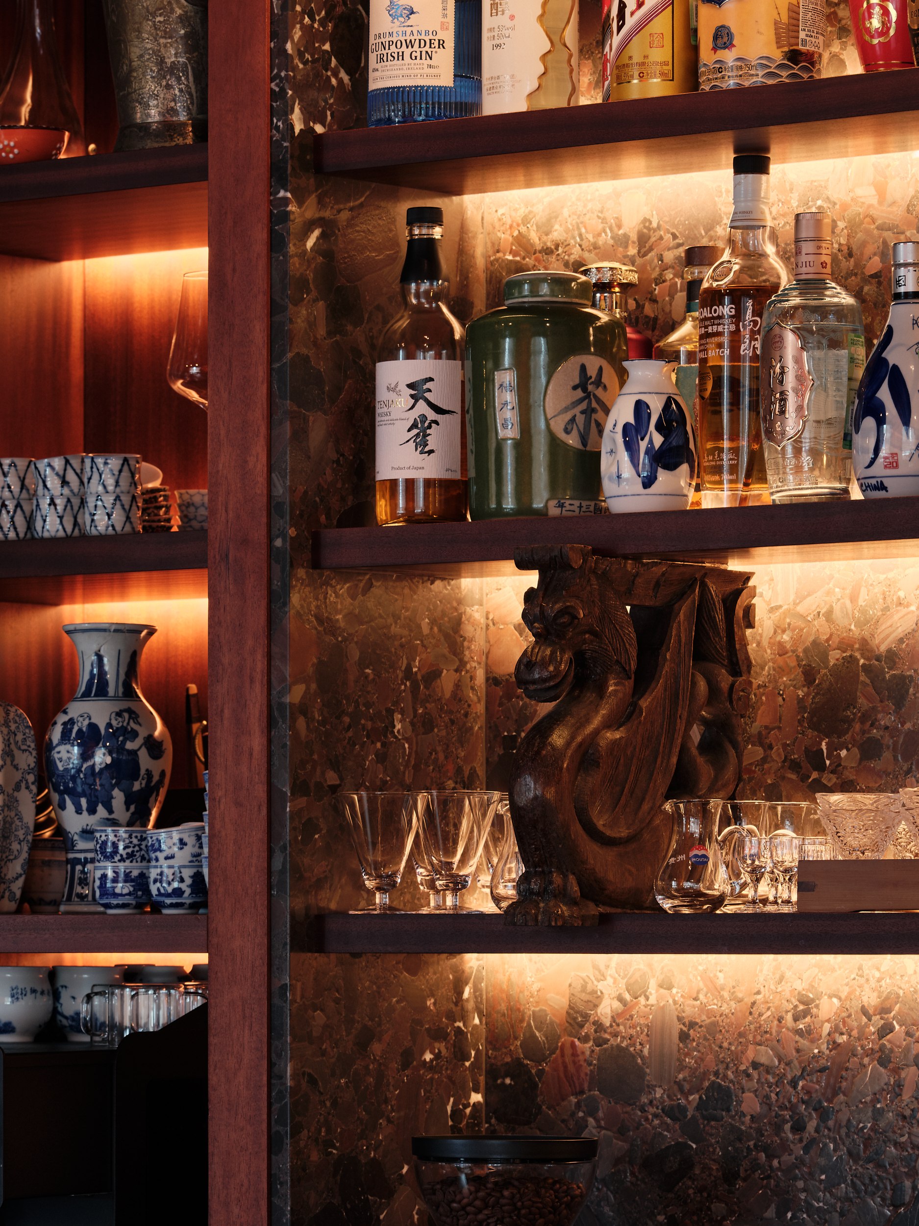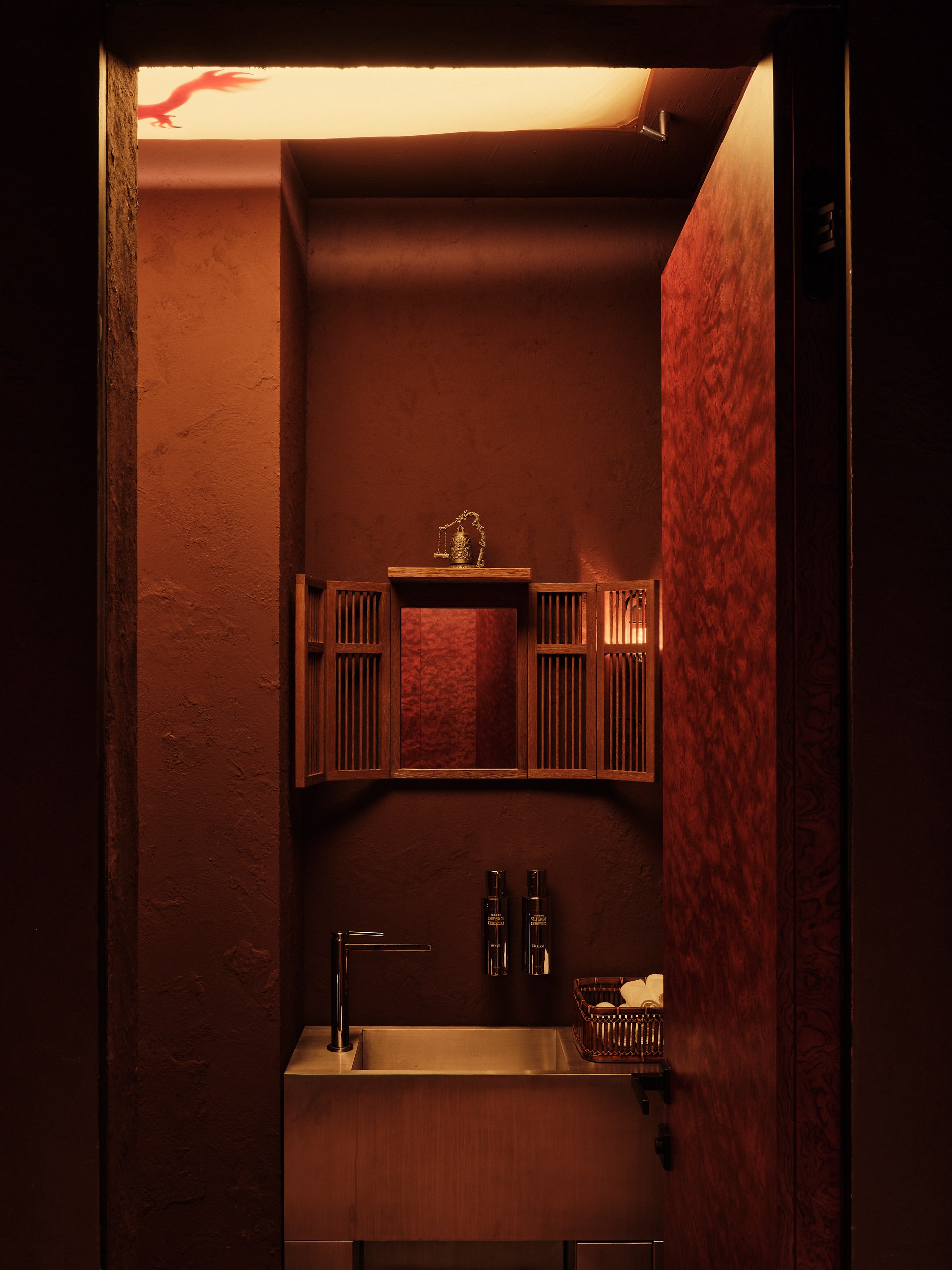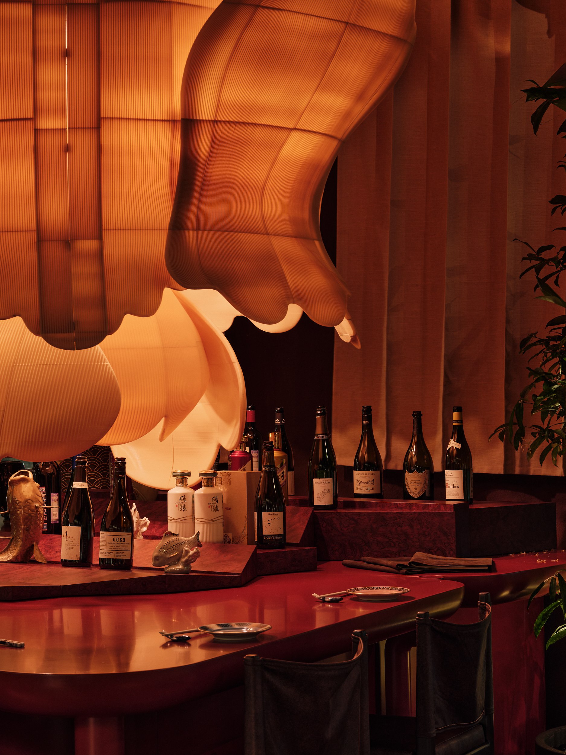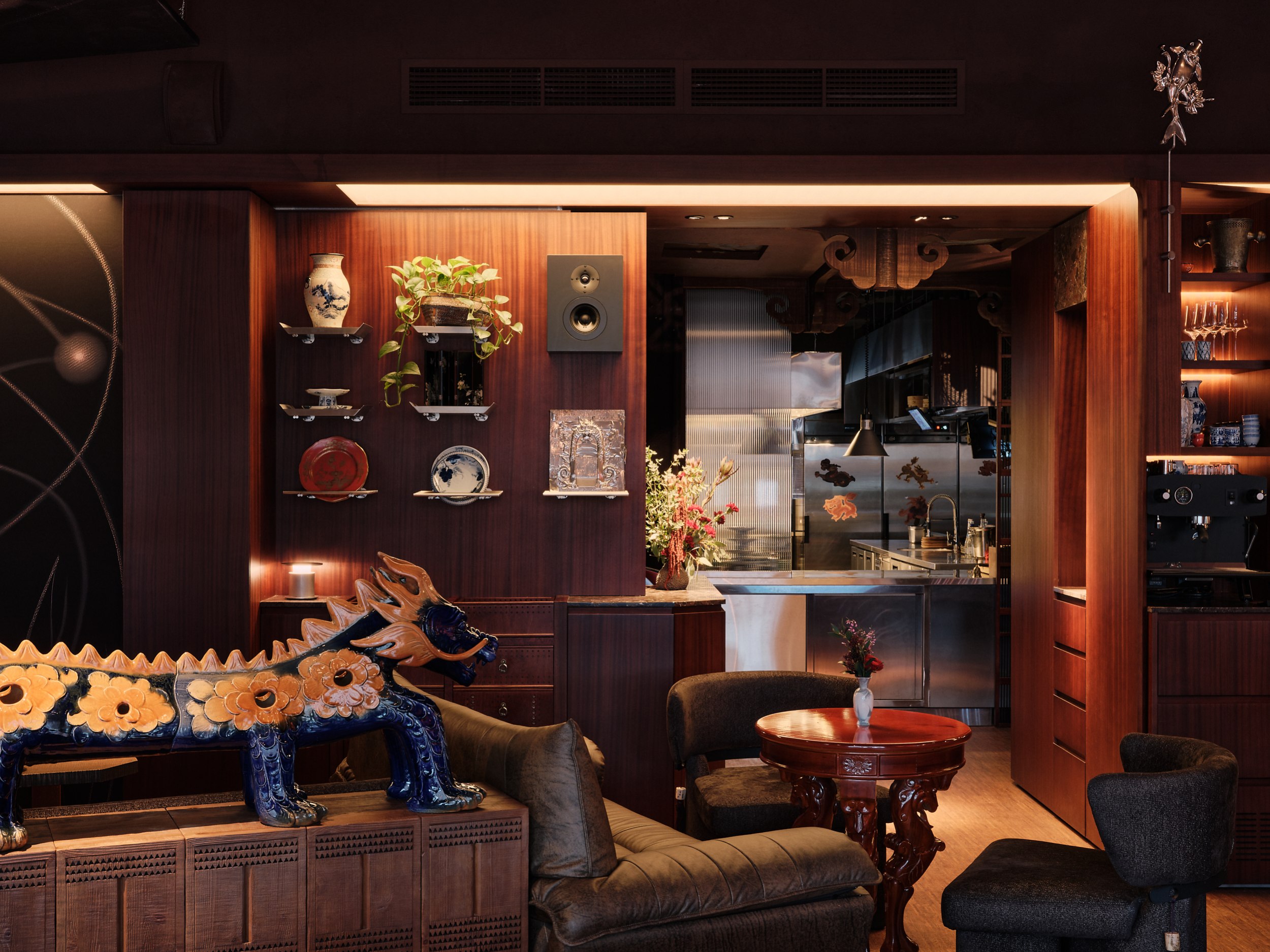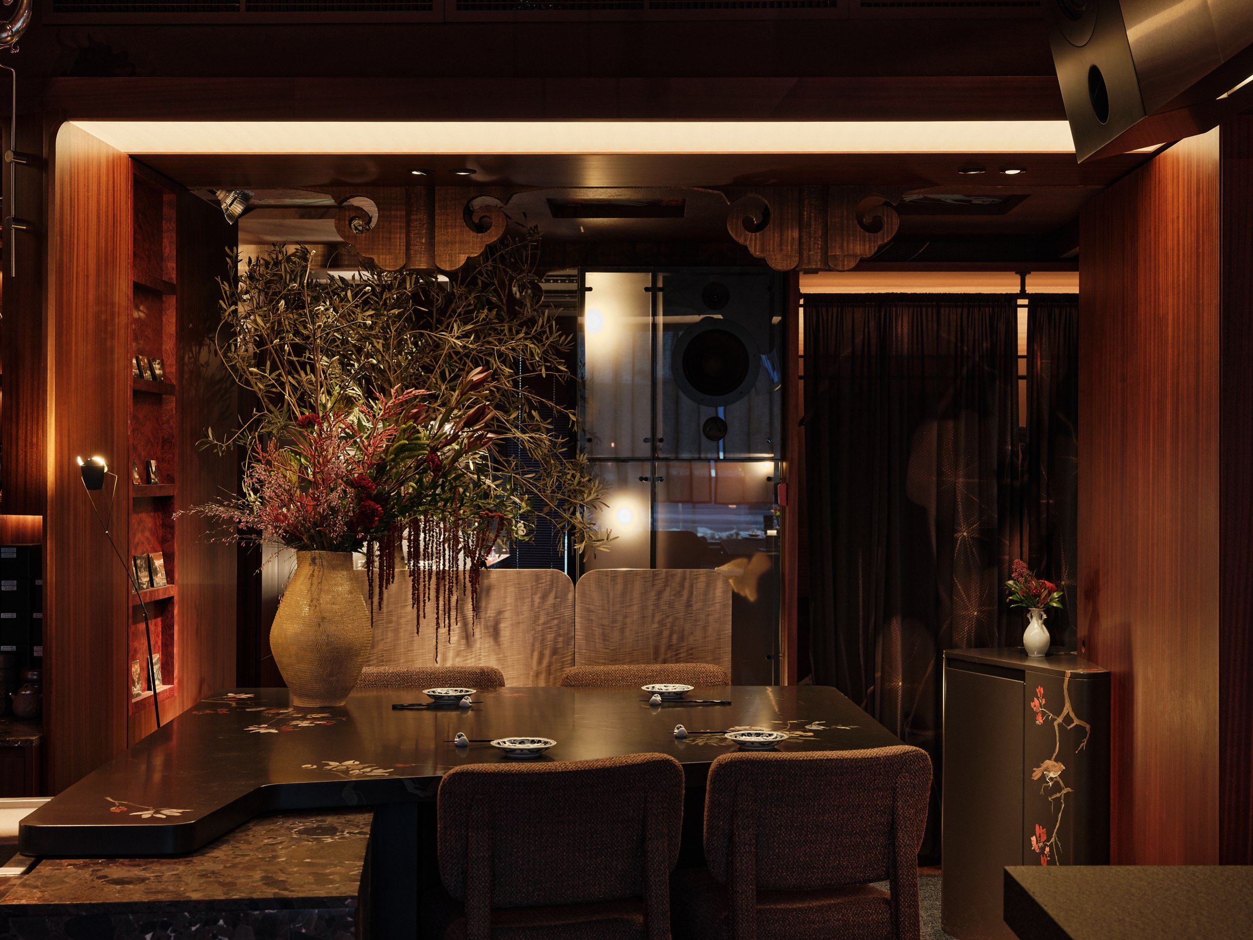 Бар решен как китайский сундук и дополнен образами карпа и дракона – символами трансформации, силы и мудрости. В зале дракон появляется вновь, уже как защитный и благоприятный знак, связанный с энергией ян.