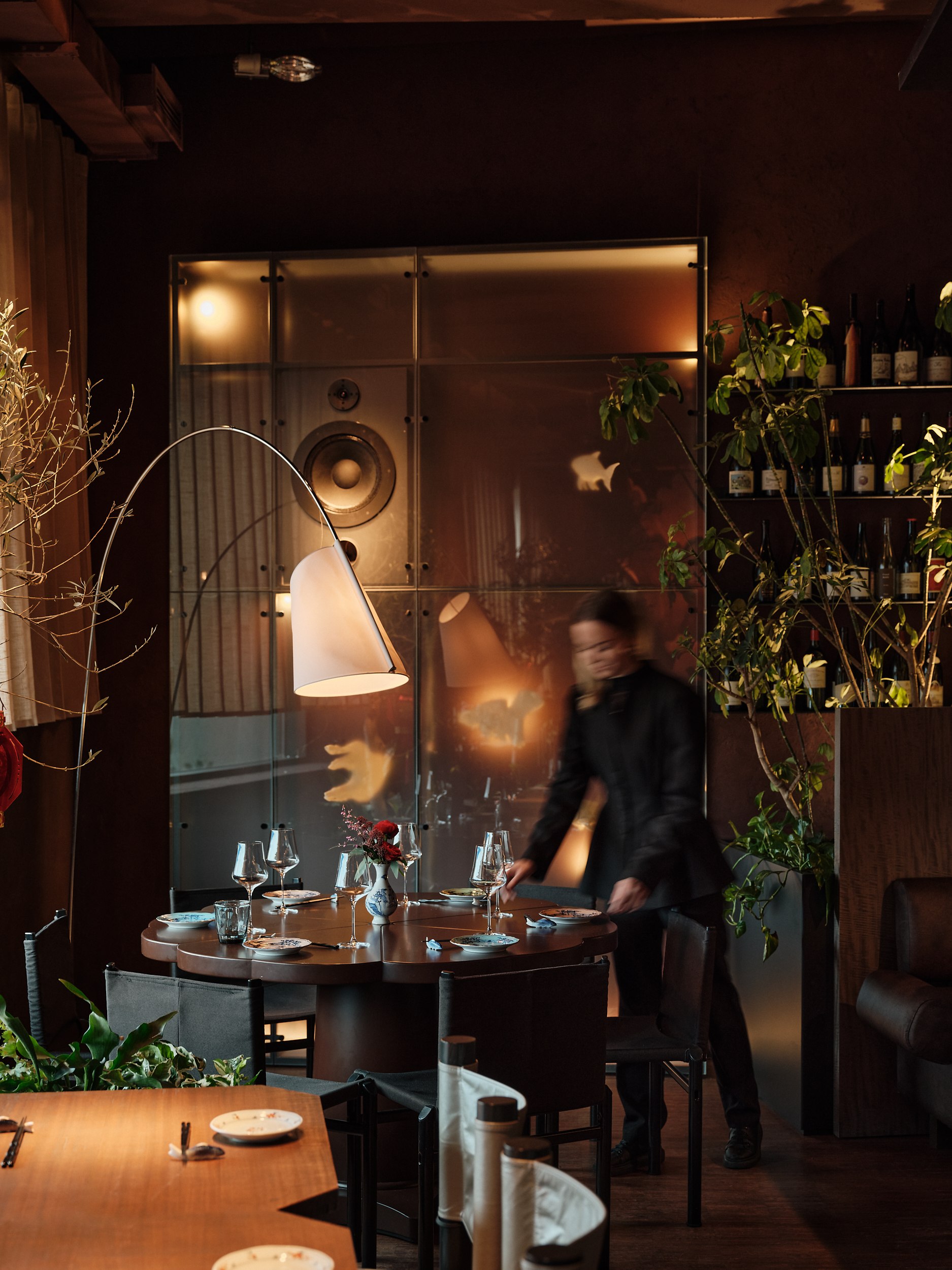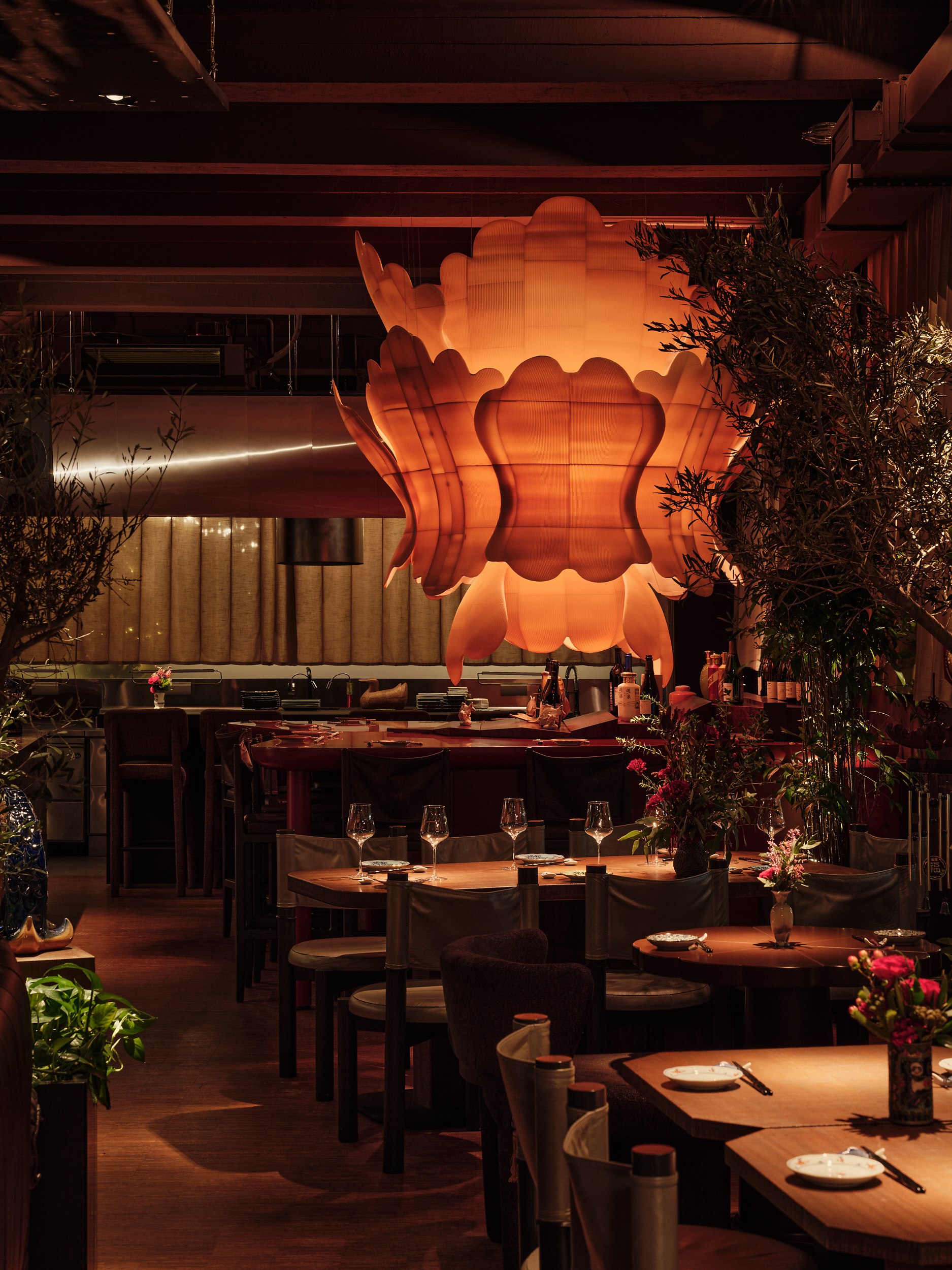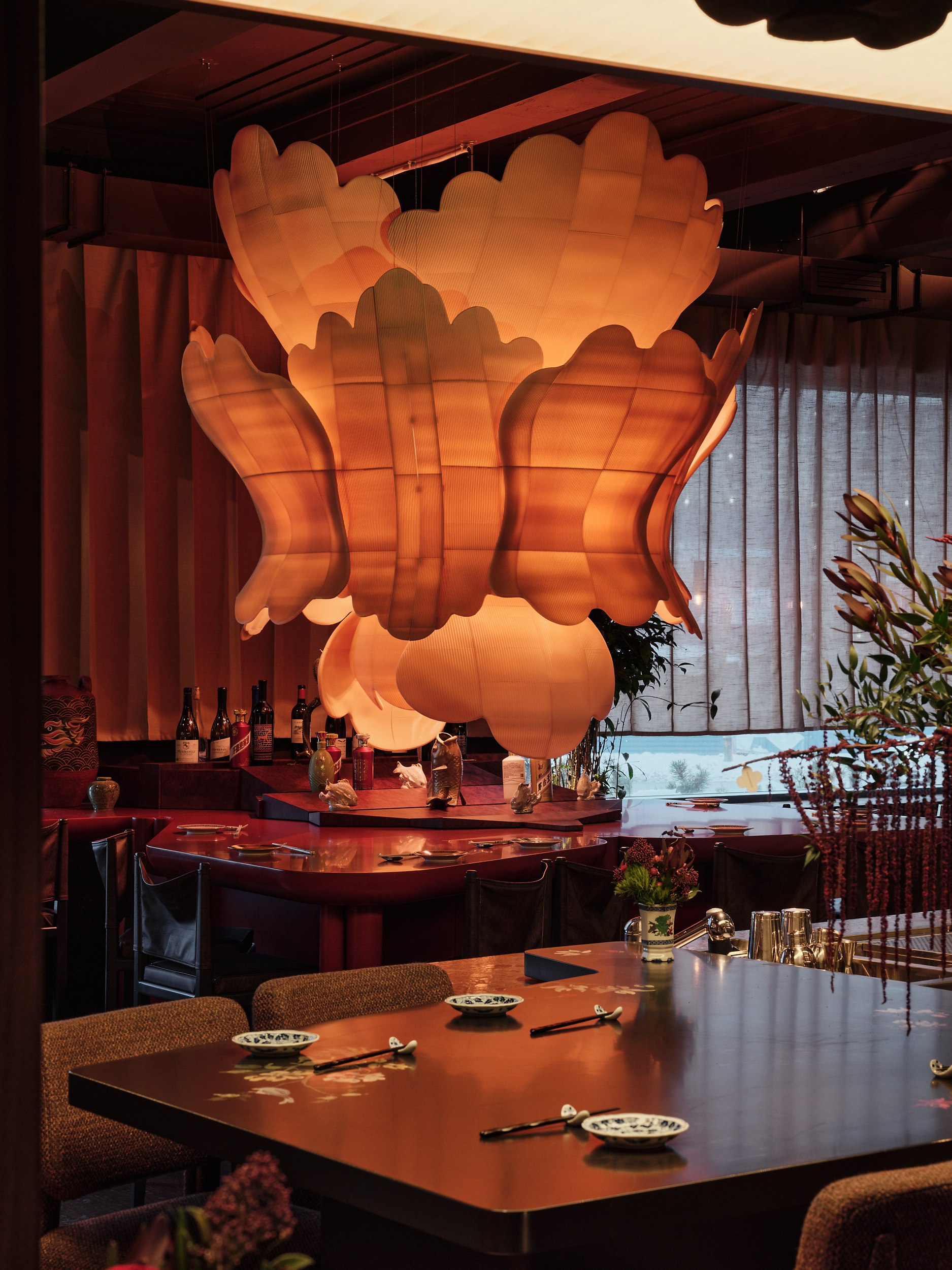 В основе – натуральные материалы, сдержанная палитра и отсутствие визуального шума, создающие условия для сосредоточенного восприятия вкуса и пространства. Центральный арт-объект над столом может напоминать солнце, цветок или пламя – символы жизненной силы, цикличности, добродетели и энергии ци. Его отражение на столе усиливает ощущение границы между стихиями и состояниями.