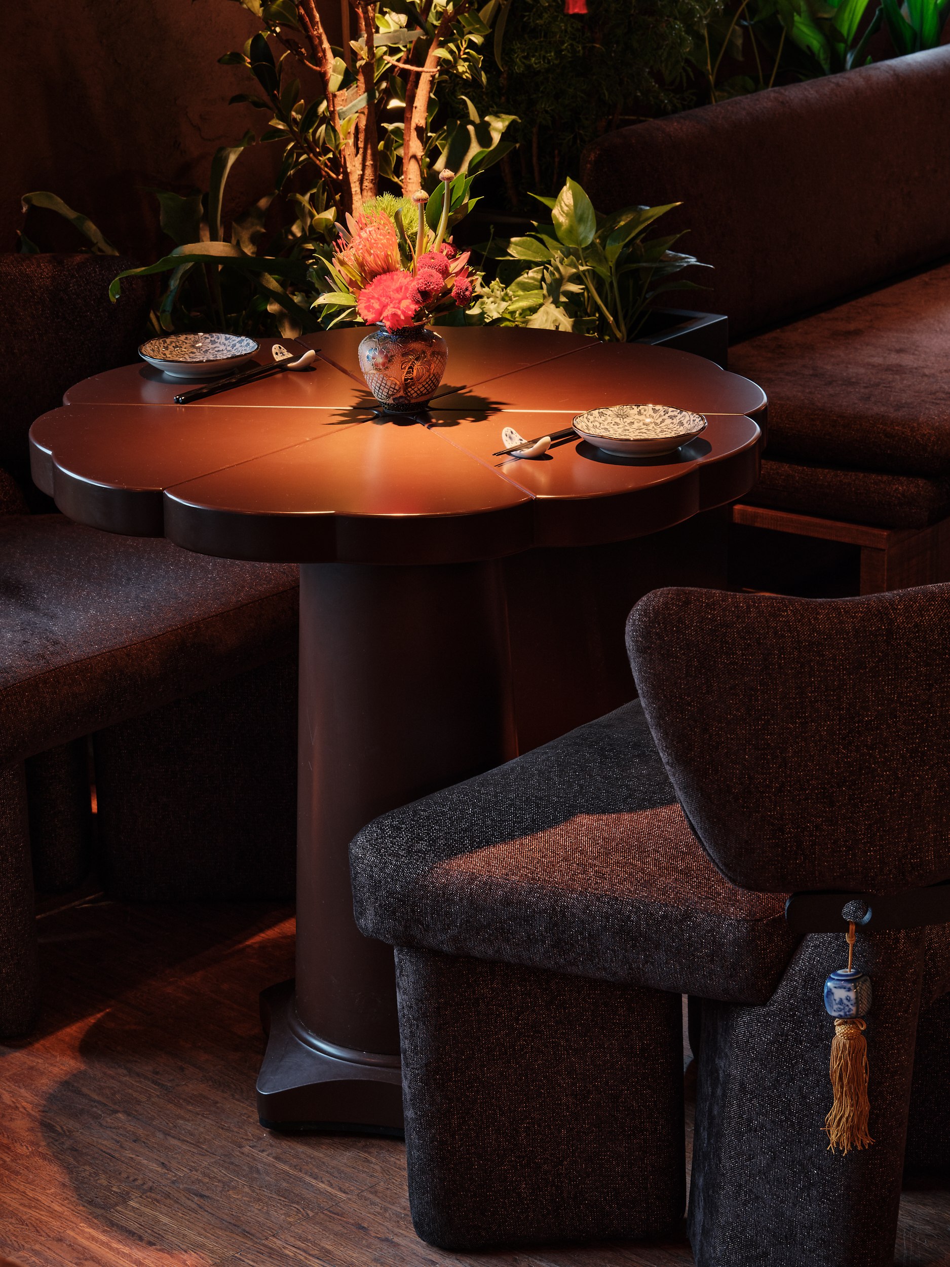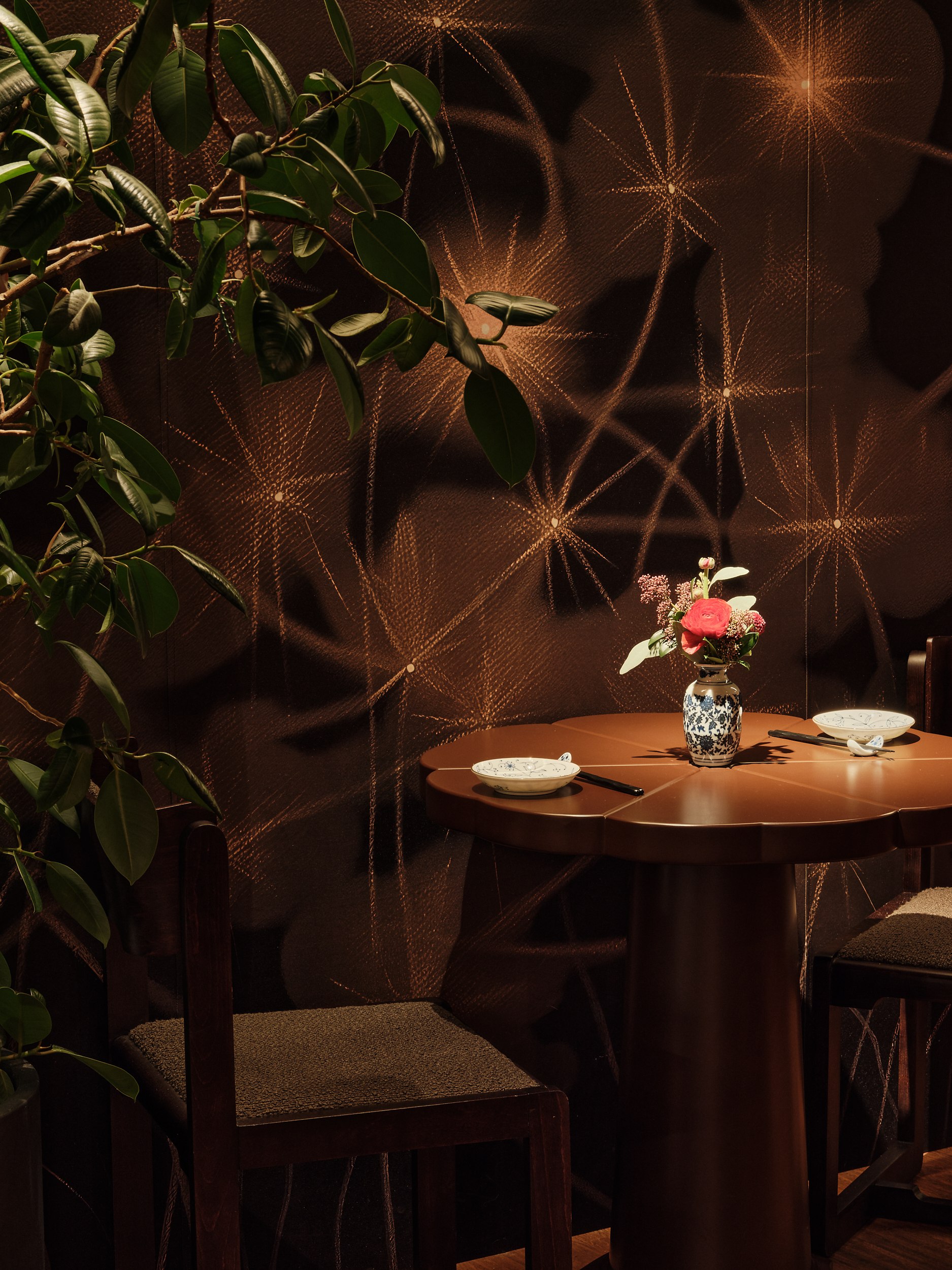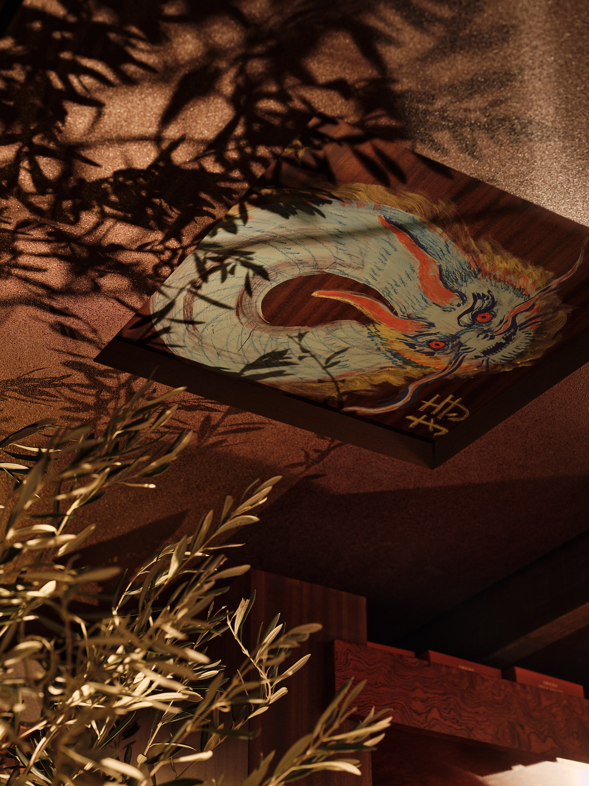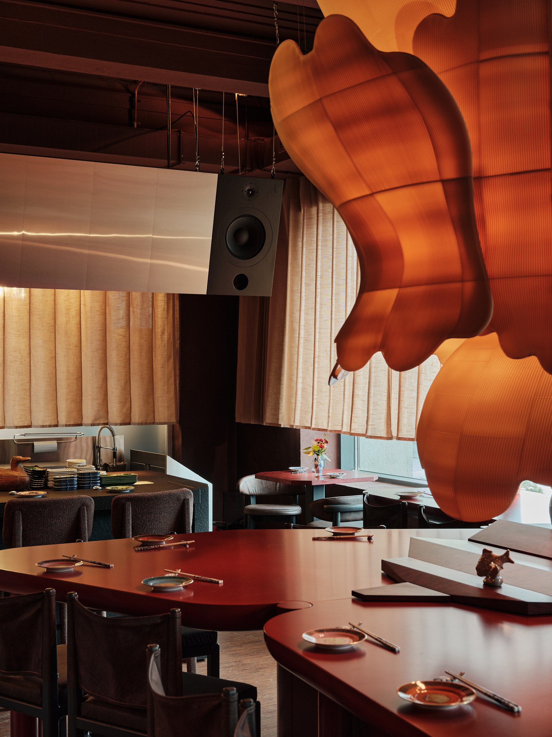 В основе – натуральные материалы, сдержанная палитра и отсутствие визуального шума, создающие условия для сосредоточенного восприятия вкуса и пространства. Центральный арт-объект над столом может напоминать солнце, цветок или пламя – символы жизненной силы, цикличности, добродетели и энергии ци. Его отражение на столе усиливает ощущение границы между стихиями и состояниями.