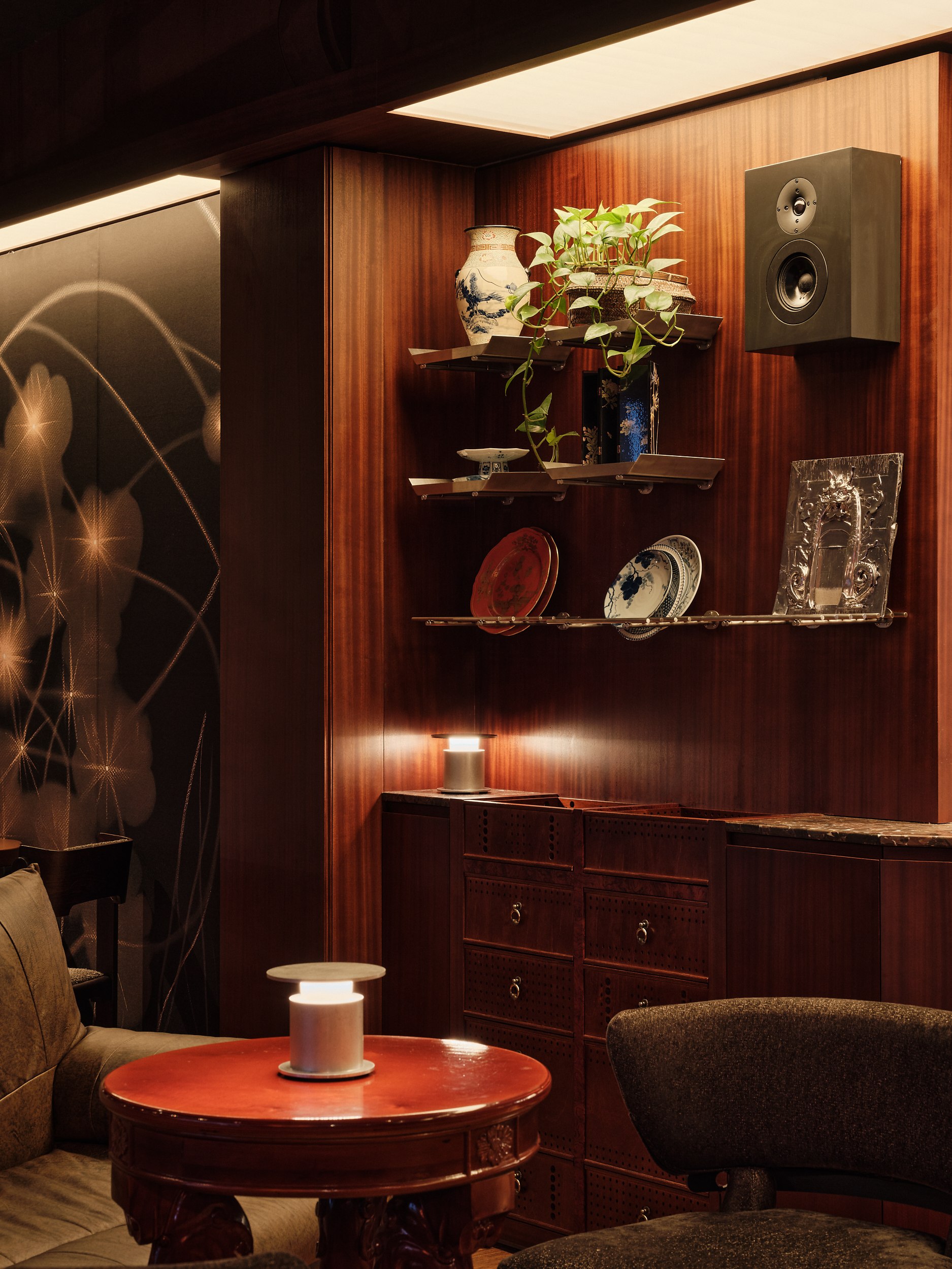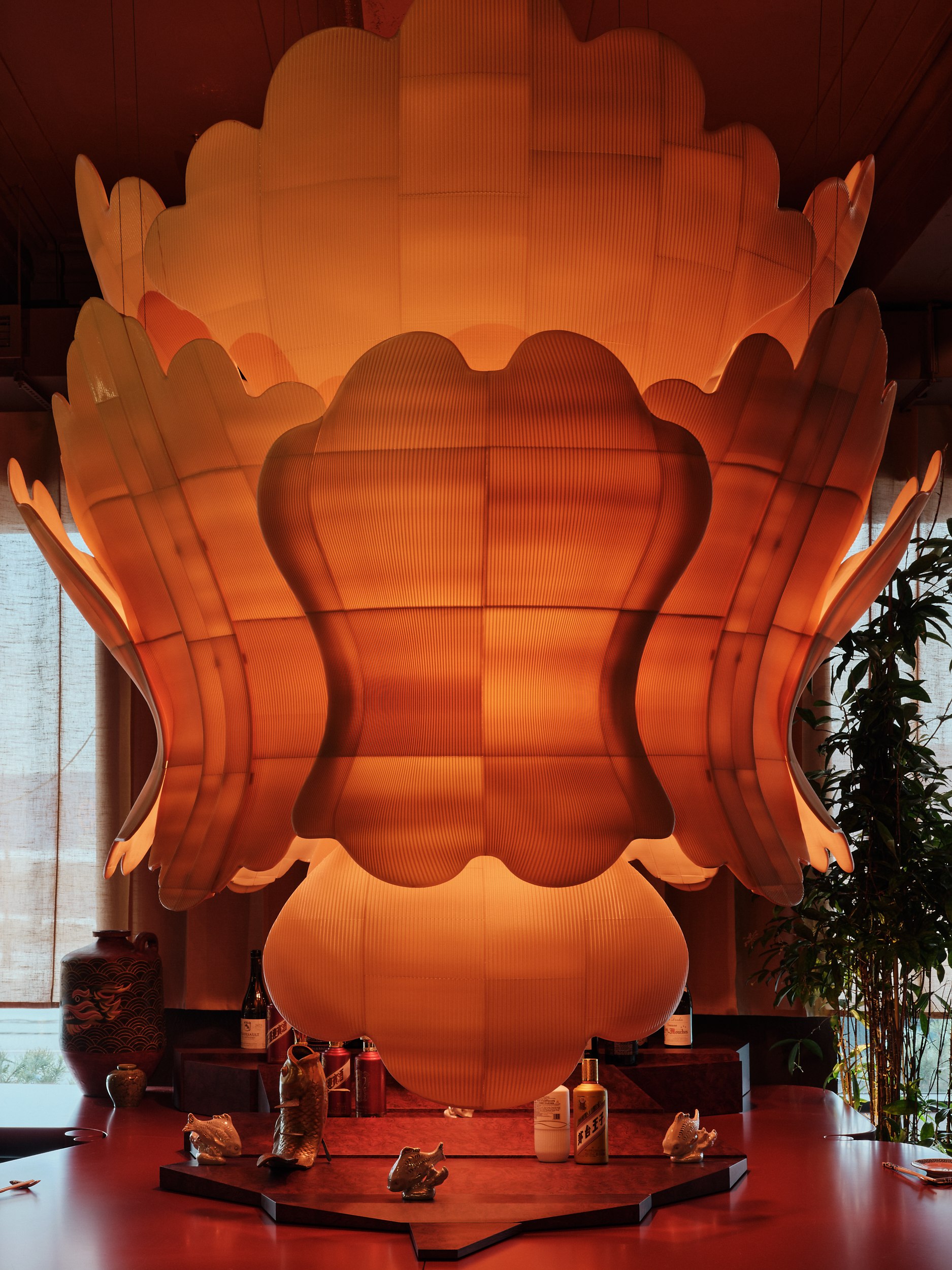 Тканевые панели с абстрактными принтами создают эмоциональный фон, отсылая к китайской эстетике на уровне ощущений. Образ веера интегрирован в световые решения как символ мудрости, гармонии и статуса.