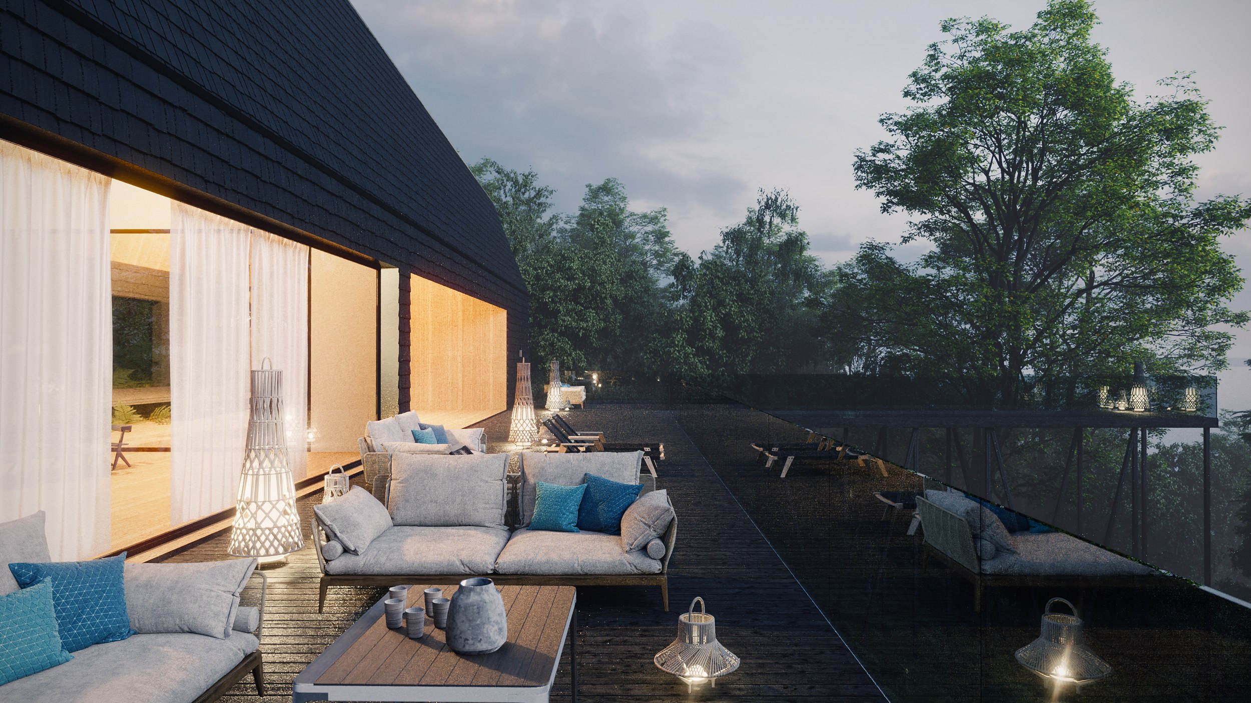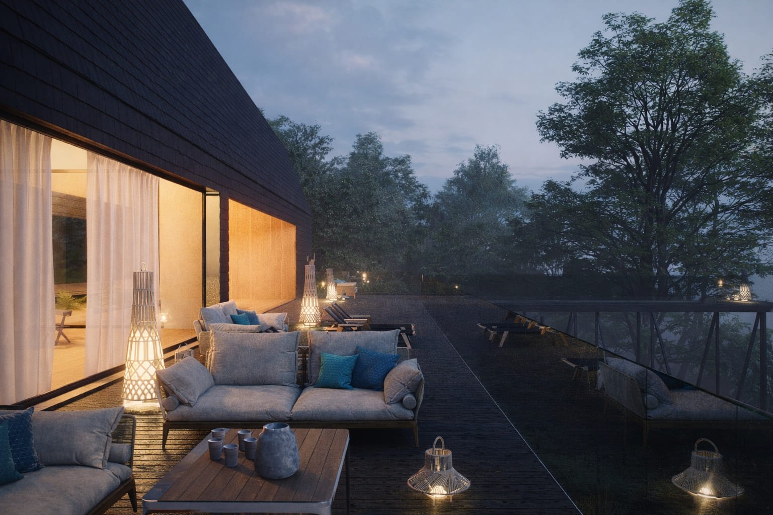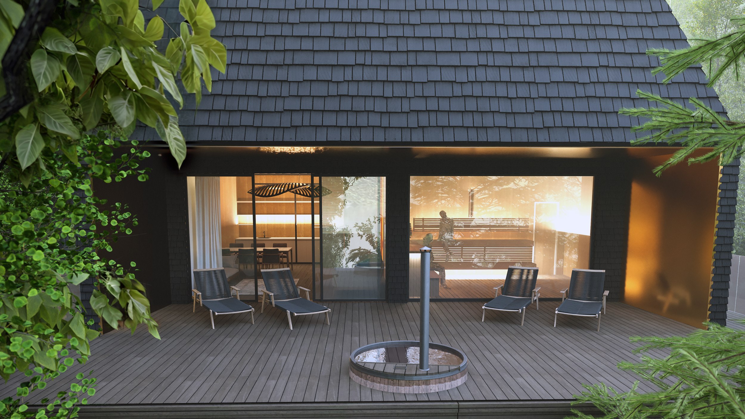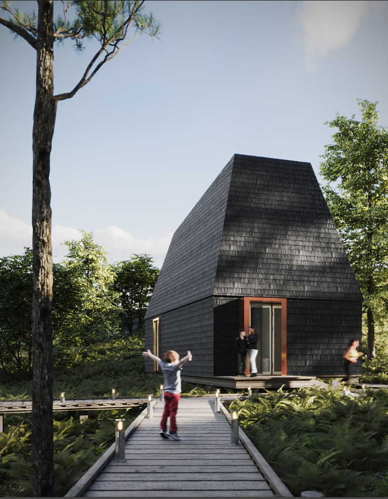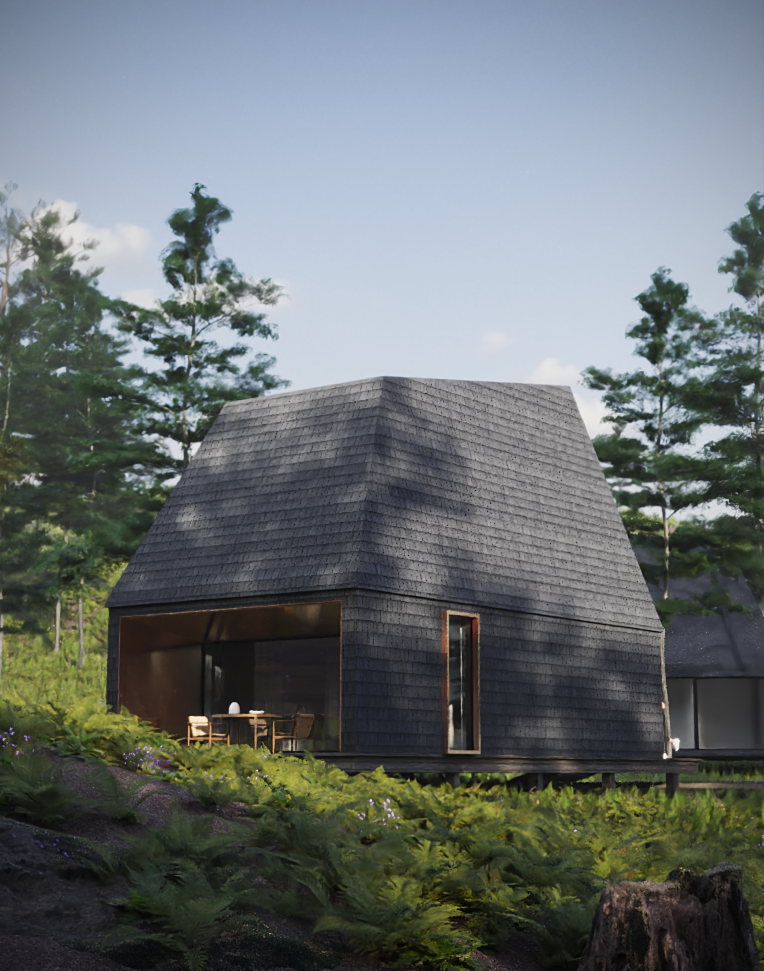 Контраст материалов усиливает эмоциональный опыт гостя: снаружи представлена брутальная обожженная древесина, внутри – теплое дерево и тактильные текстуры. Зонирование задает баланс приватности и коллективного опыта: уединение в гостевых домах, очищение в бане, созерцание с пирса, совместное творчество и чувство сообщества.