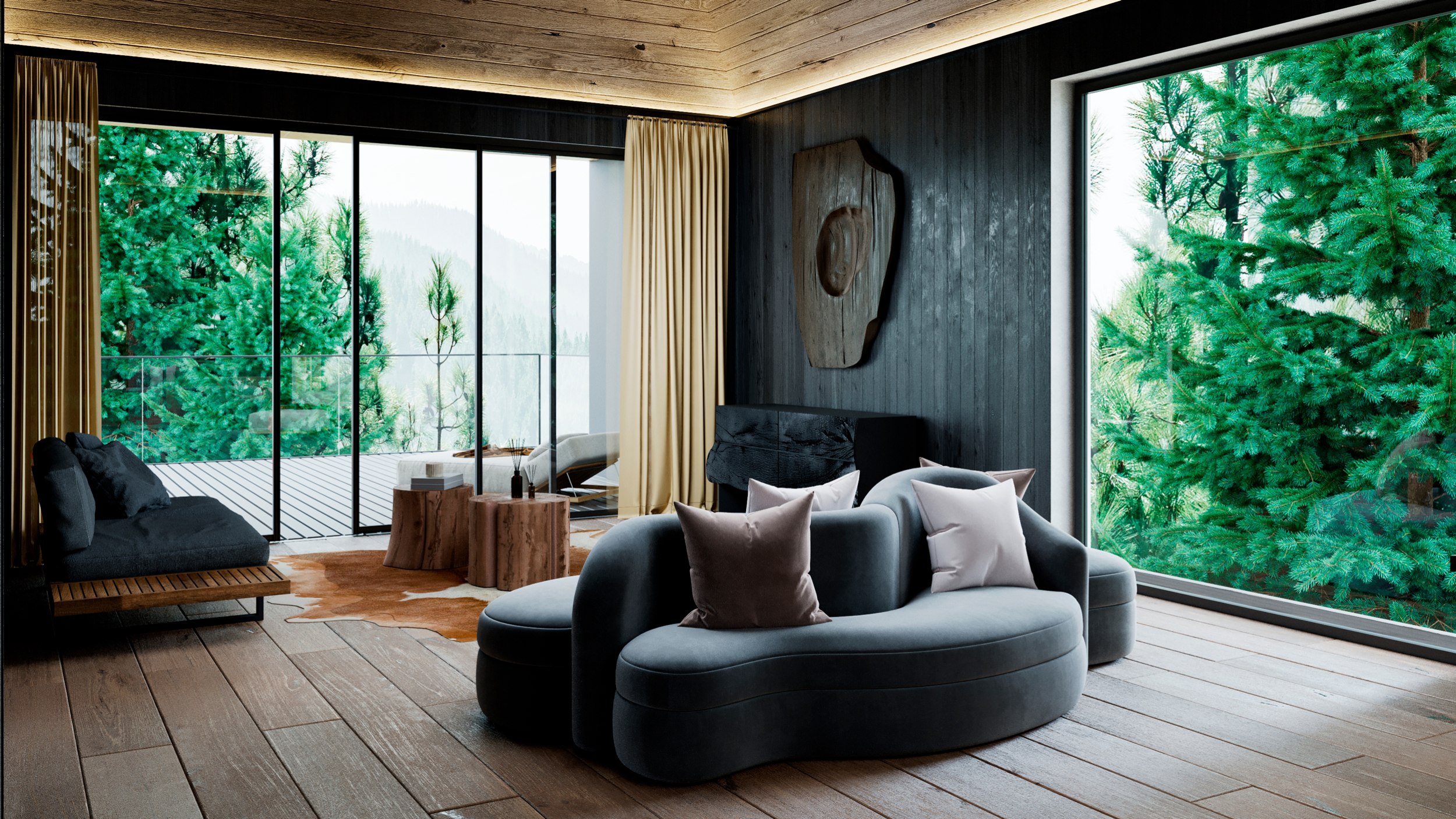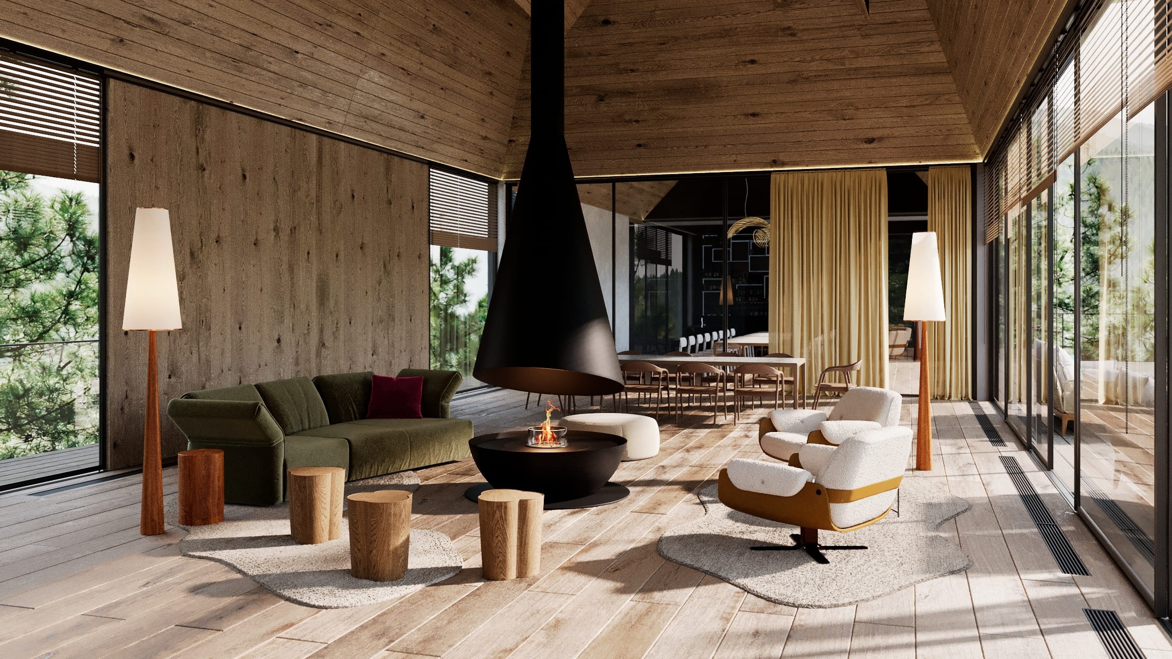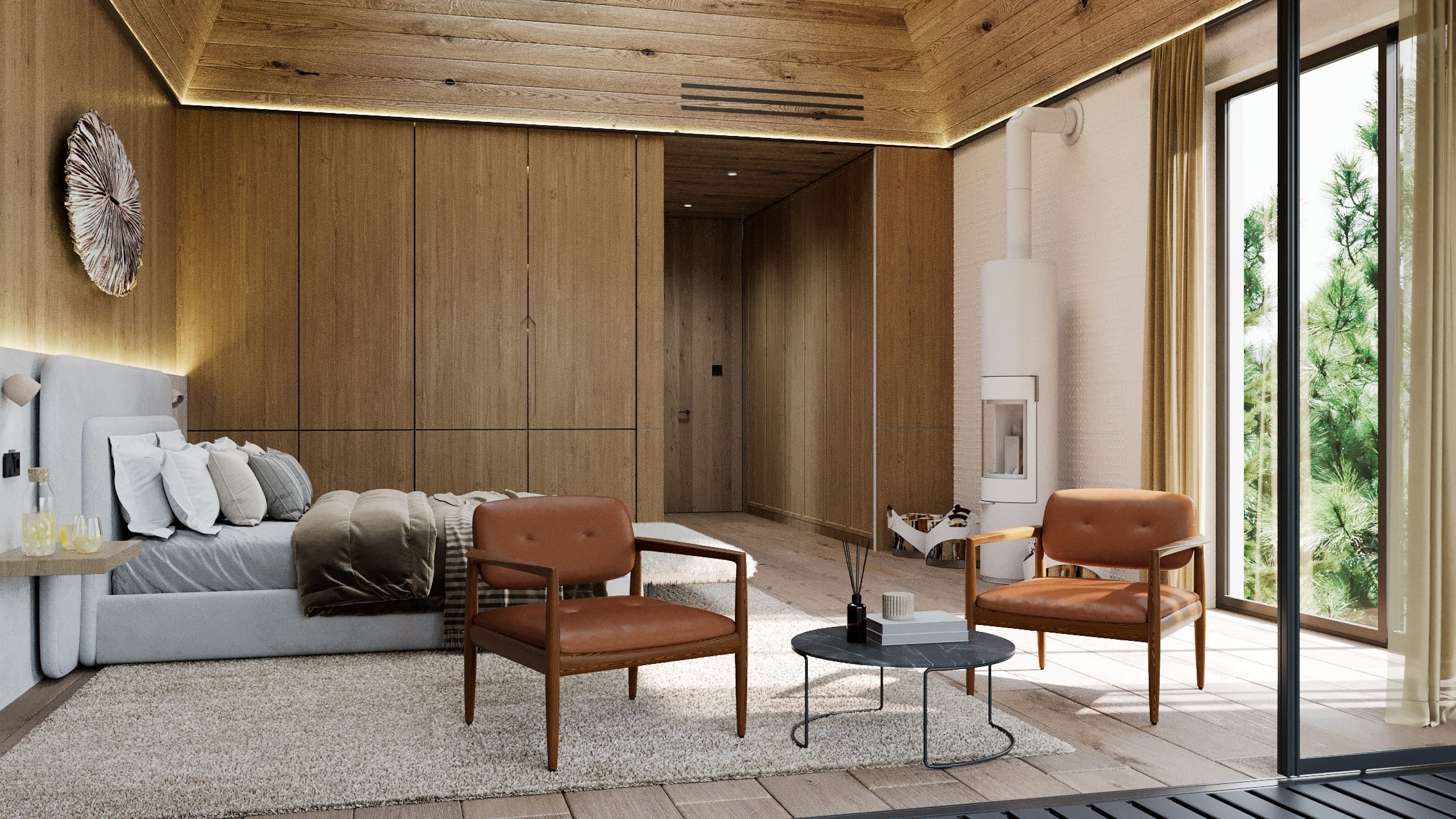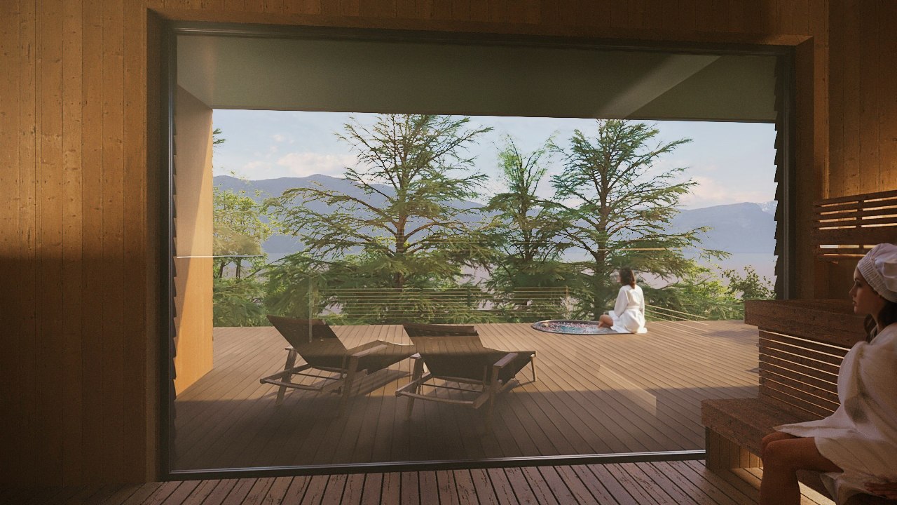 Контраст материалов усиливает эмоциональный опыт гостя: снаружи представлена брутальная обожженная древесина, внутри – теплое дерево и тактильные текстуры. Зонирование задает баланс приватности и коллективного опыта: уединение в гостевых домах, очищение в бане, созерцание с пирса, совместное творчество и чувство сообщества.