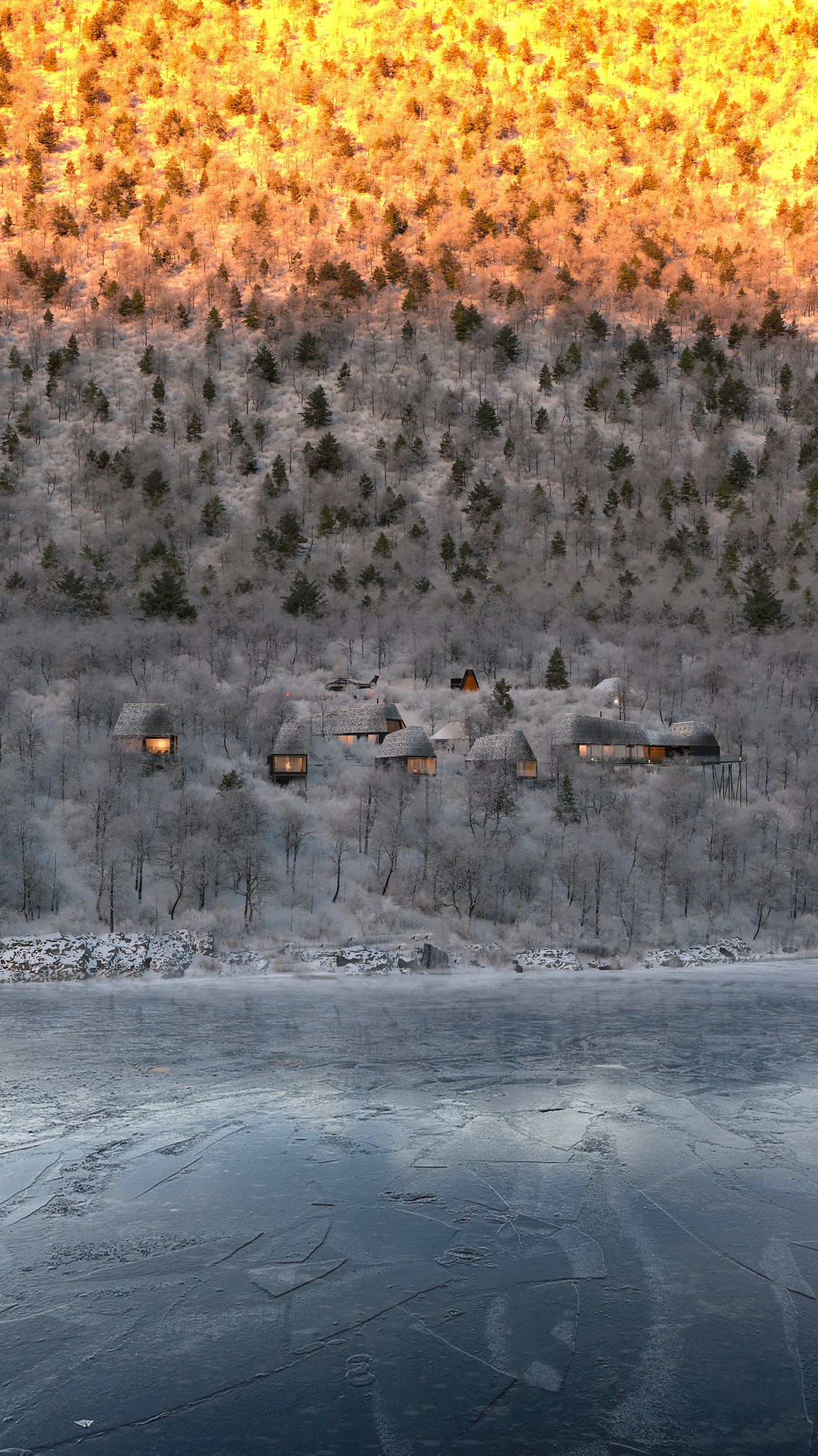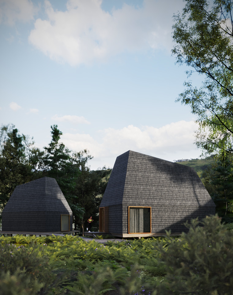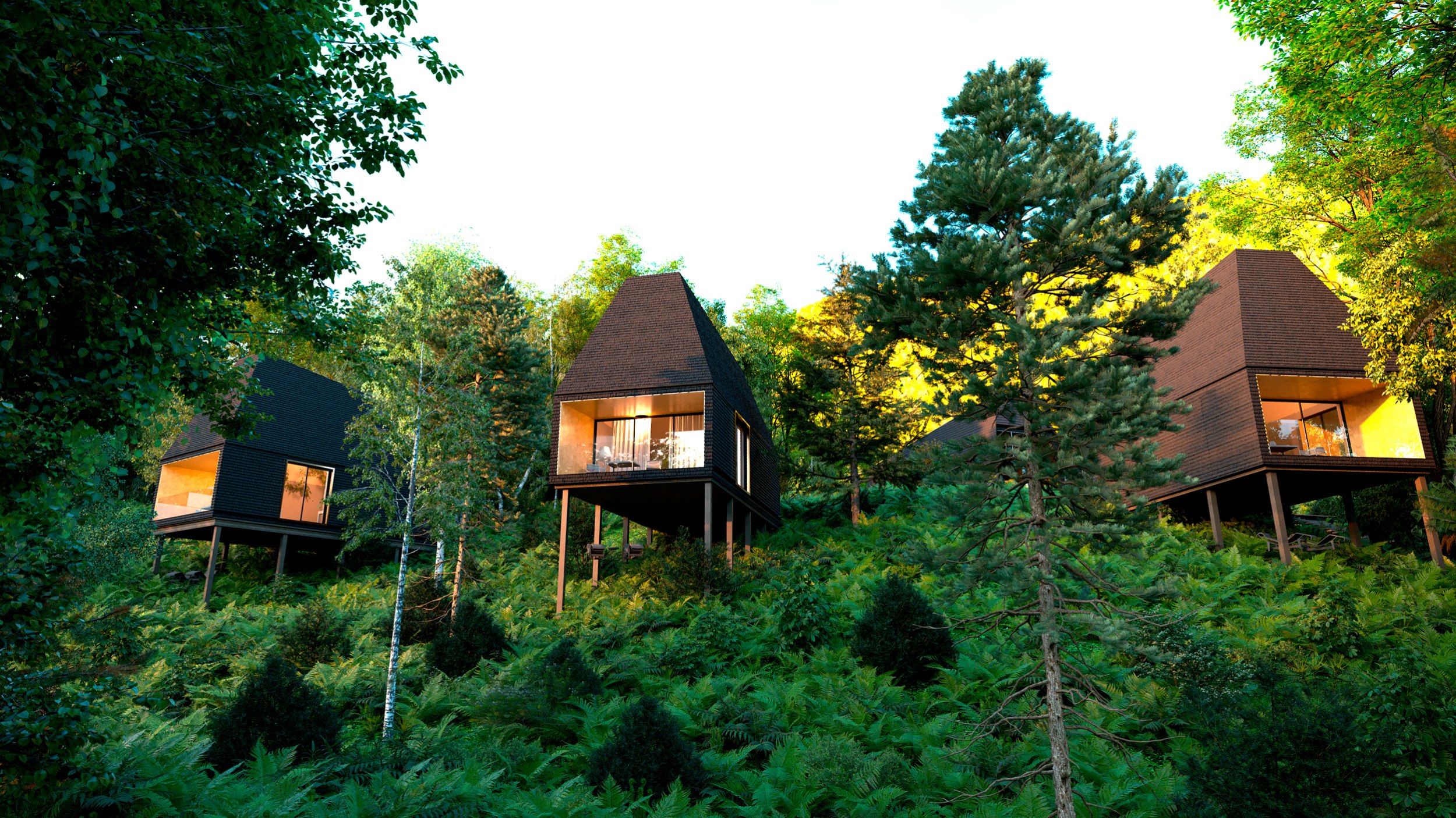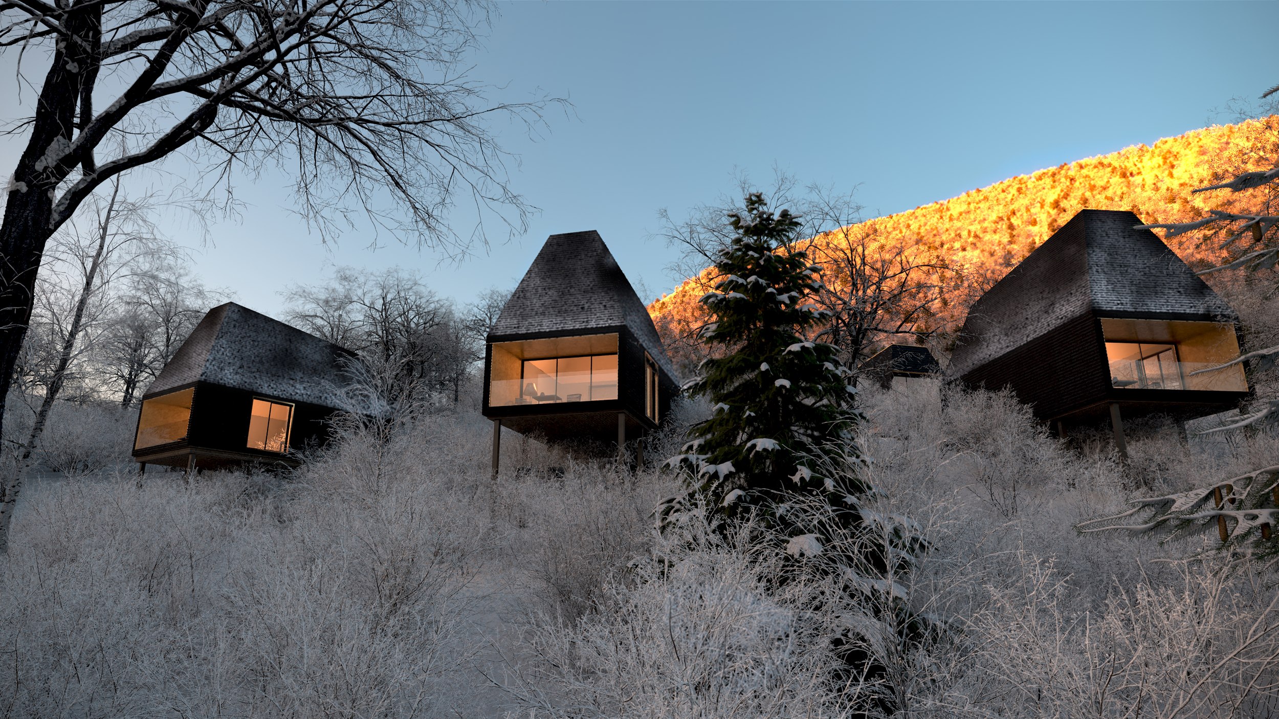 Авторы проекта переосмыслили алтайский аил (традиционное жилище коренных народов): конические силуэты с устремленными скатами крыш символизируют связь с небом и обеспечивают компактность. Это пример деликатной интеграции в ландшафт с минимальным вмешательством в природную среду.