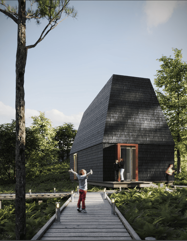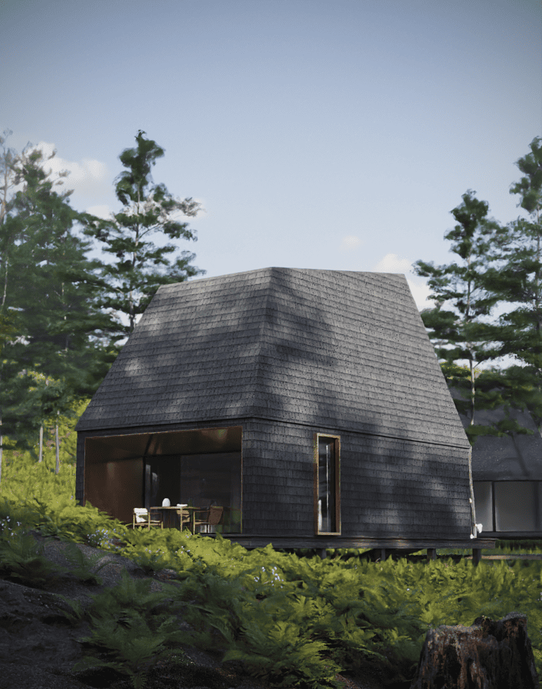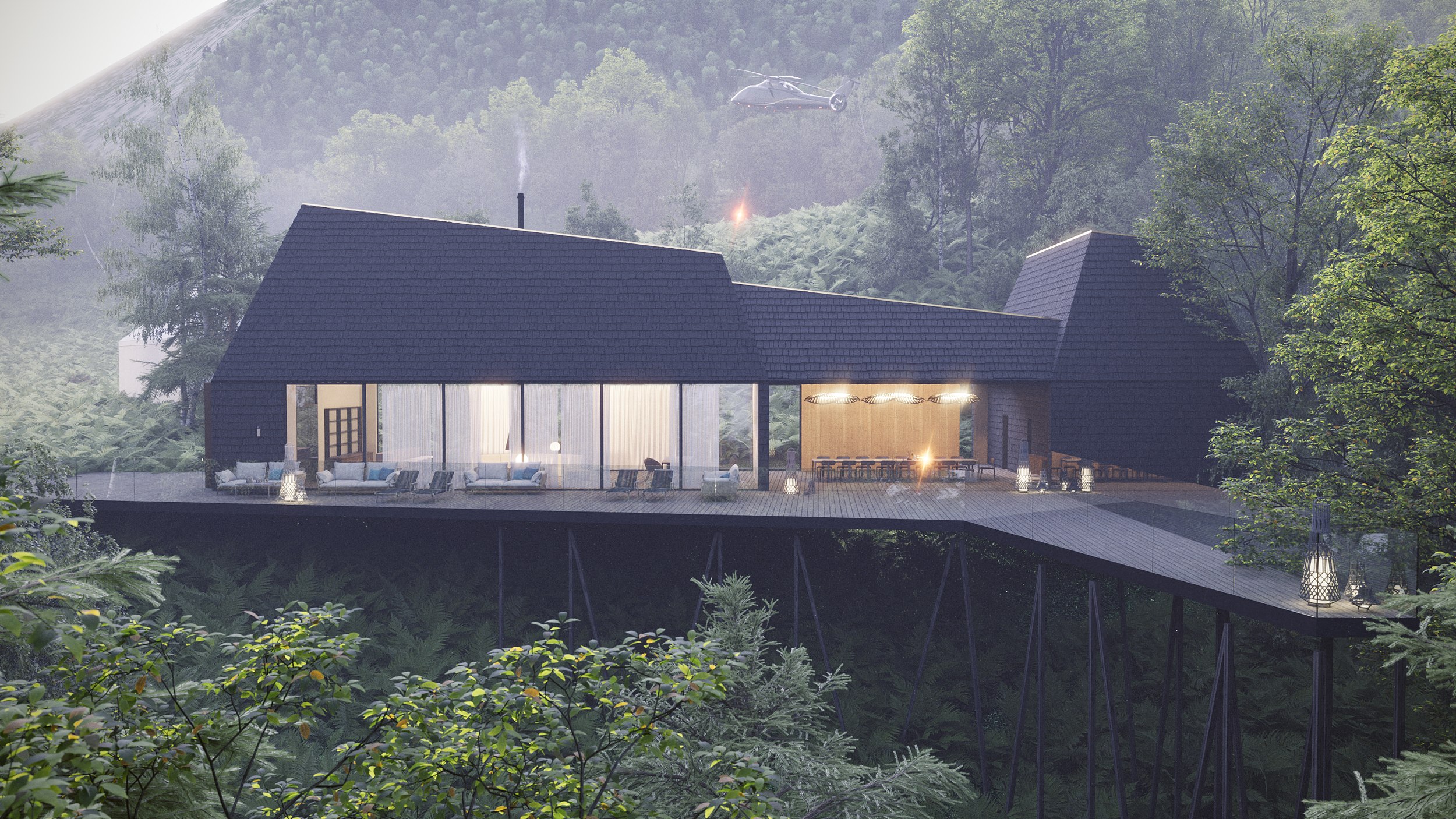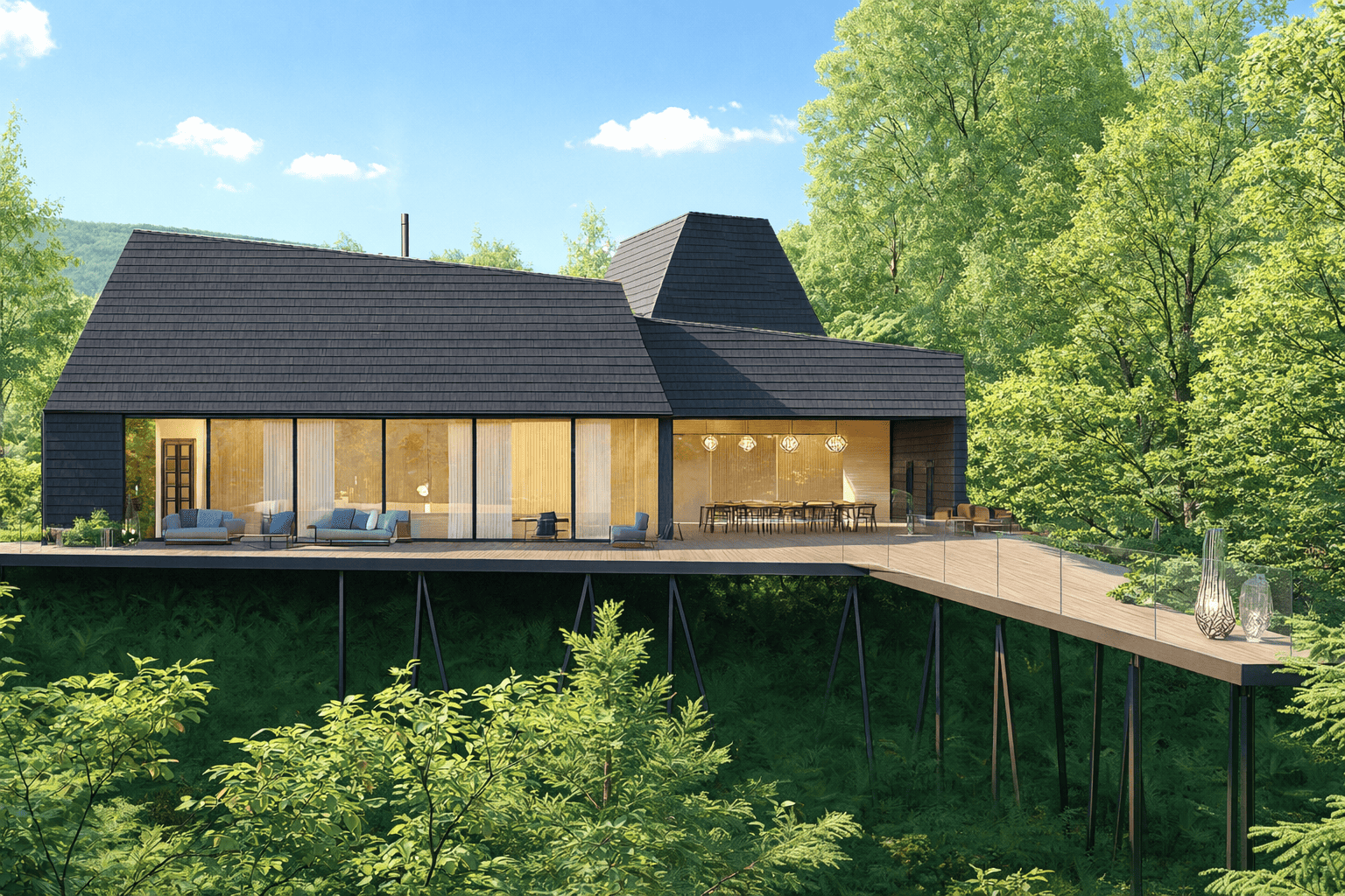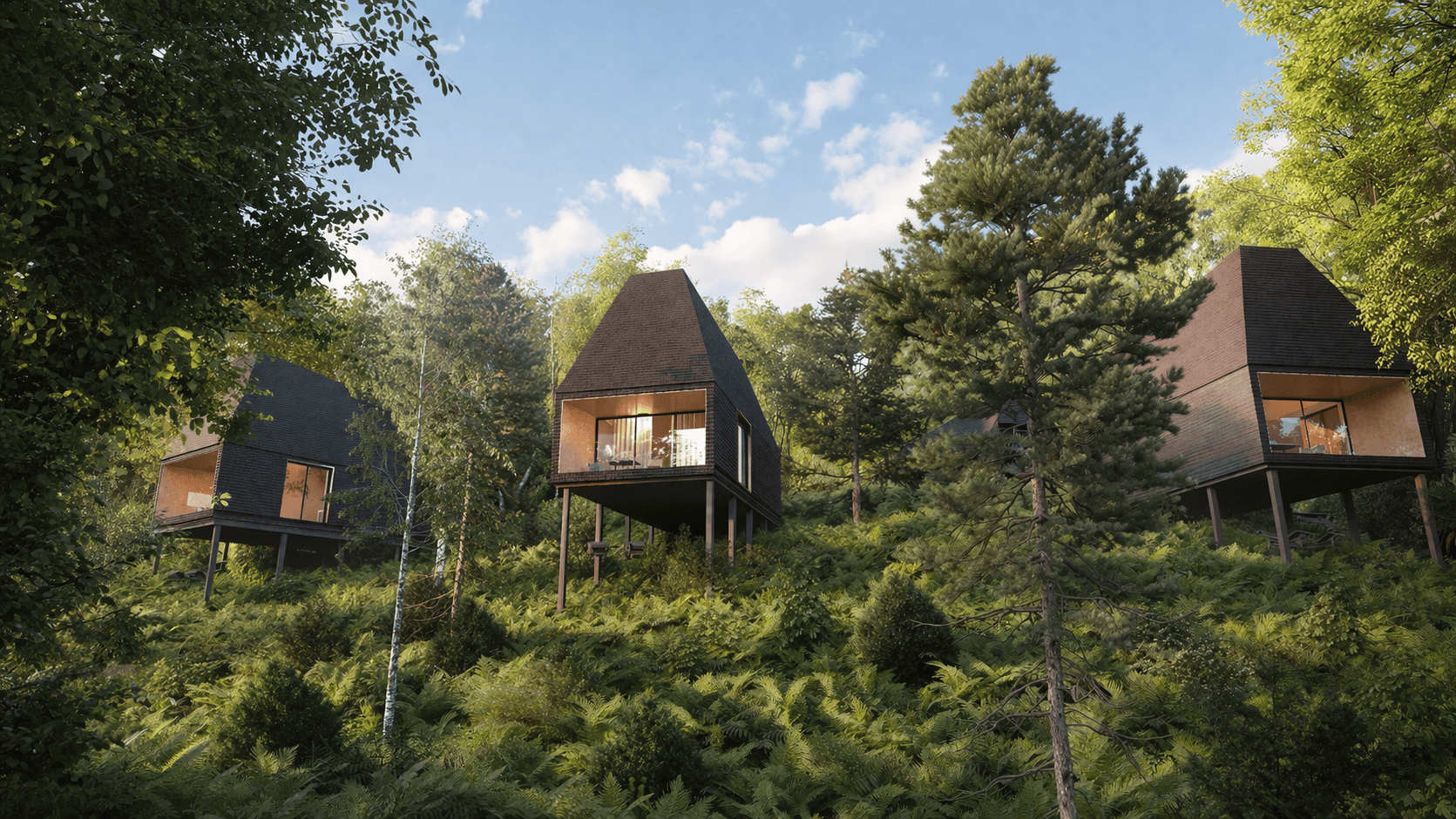 Авторы проекта переосмыслили алтайский аил (традиционное жилище коренных народов): конические силуэты с устремленными скатами крыш символизируют связь с небом и обеспечивают компактность. Это пример деликатной интеграции в ландшафт с минимальным вмешательством в природную среду.