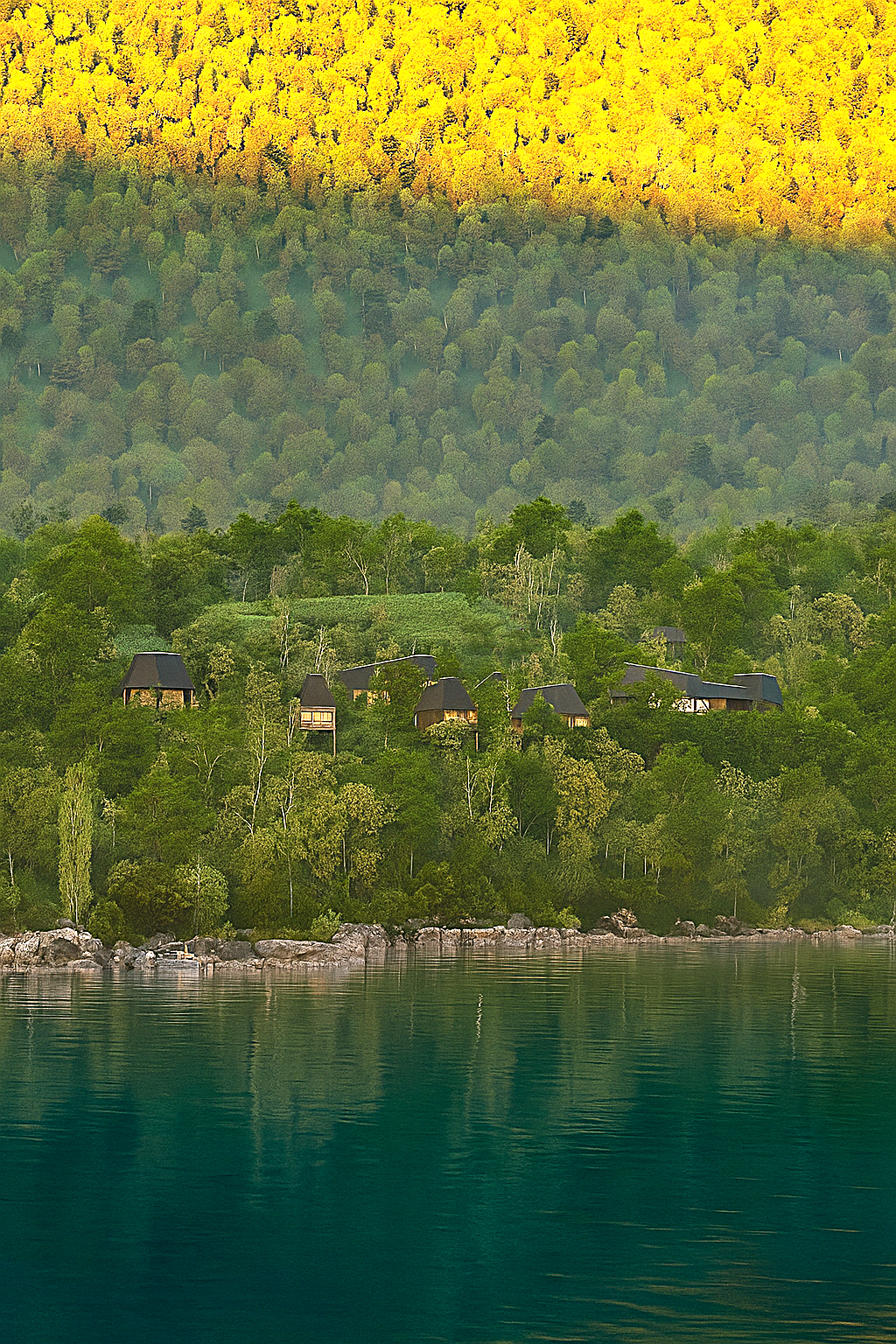 Требование заказчика заключалось в бережной интеграции комплекса в ландшафт (озеро – сакральное место для алтайцев), приватности размещения гостей и архитектурной выразительности без агрессии к природе.