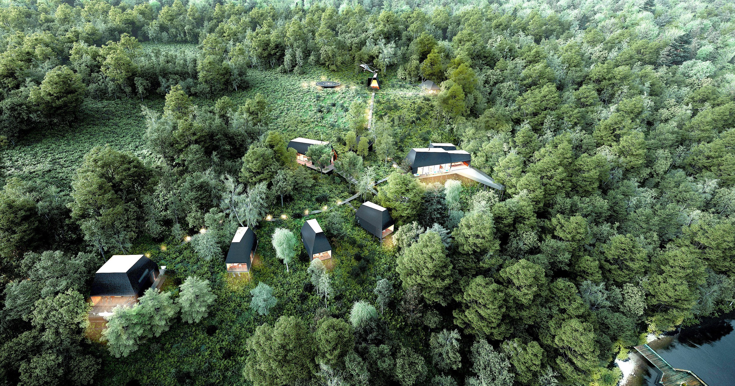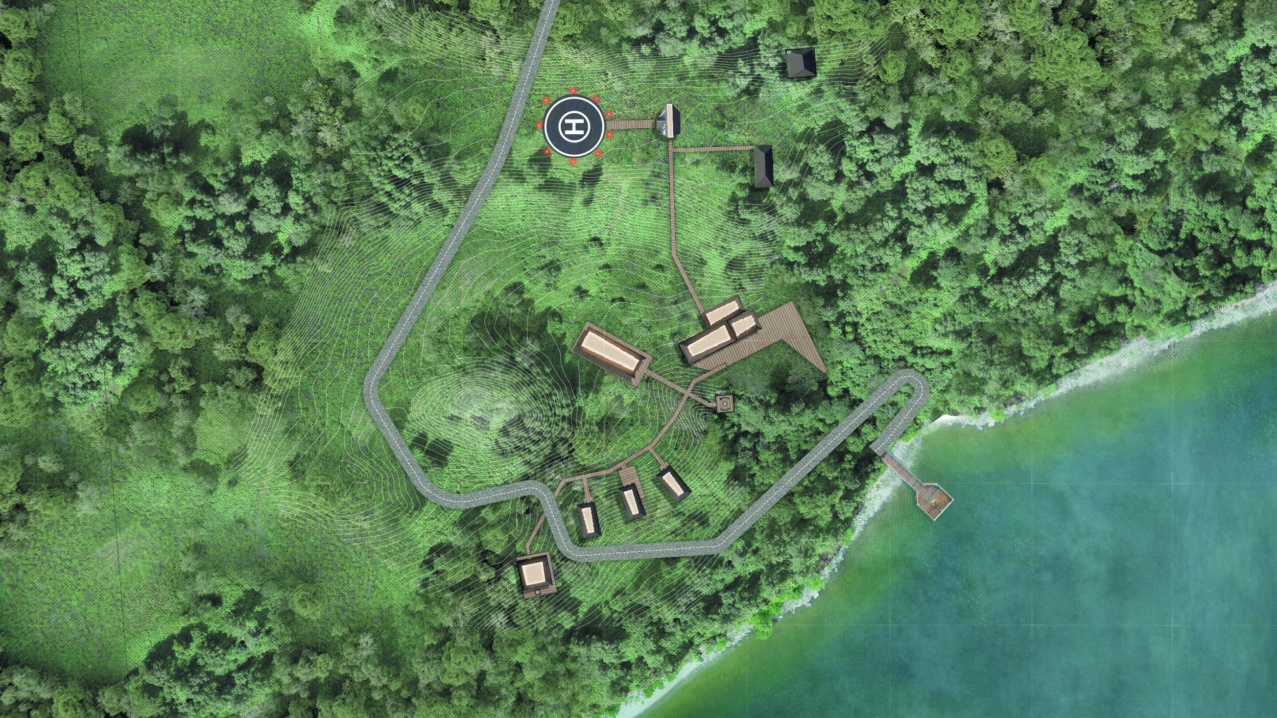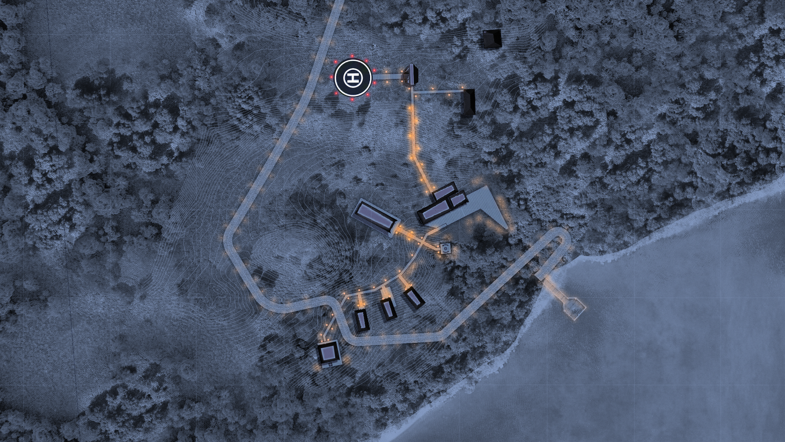 Комплекс включает вертолетную площадку, гостевую зону, ресторан, комьюнити-пространство, гостевые дома, баню, пирс и сервисный блок. Участок находится в удаленной природной зоне (ближайшие малые населенные пункты находятся в 20 километрах), поэтому комплекс становится местом для тотального замедления и подлинного переживания природы и себя.