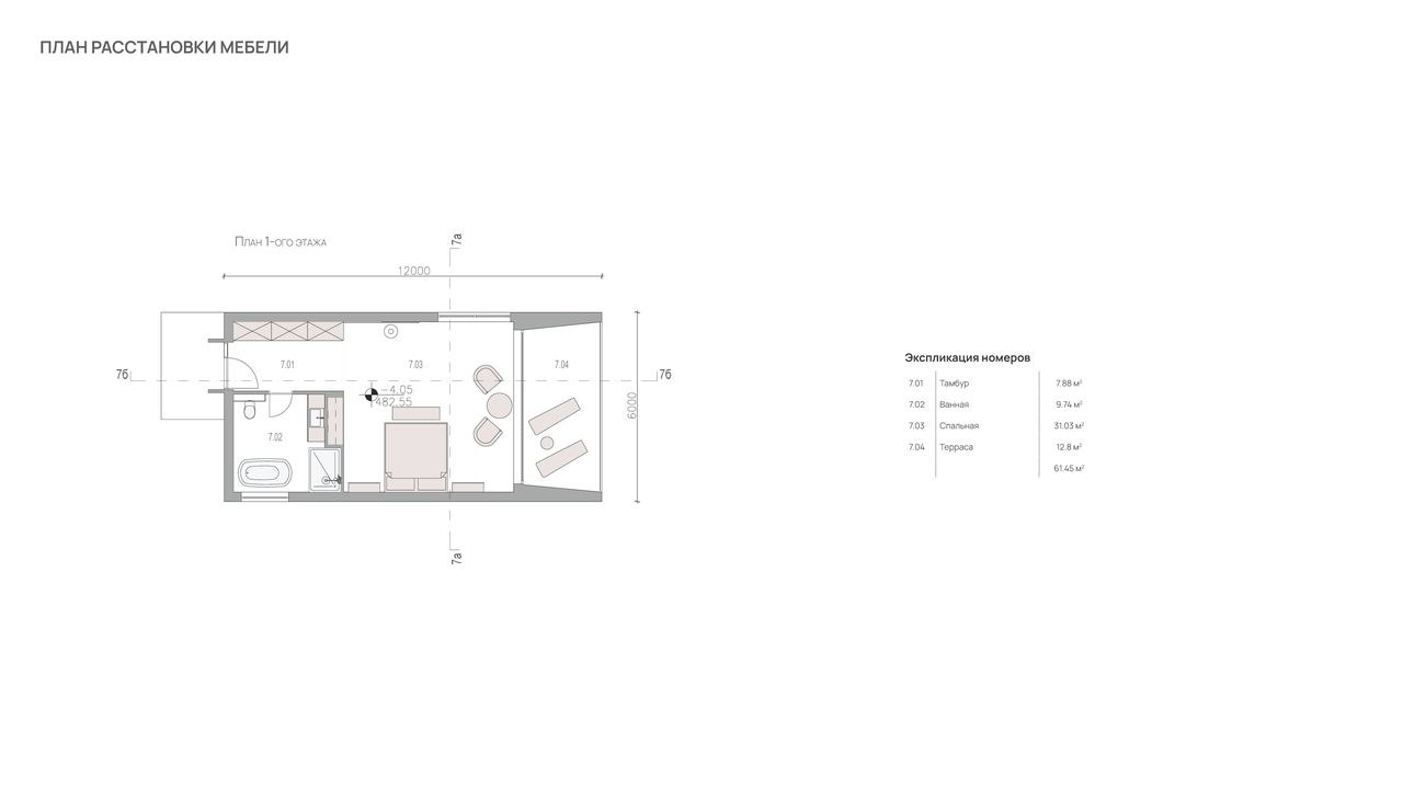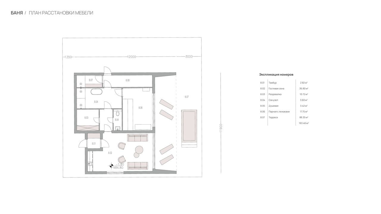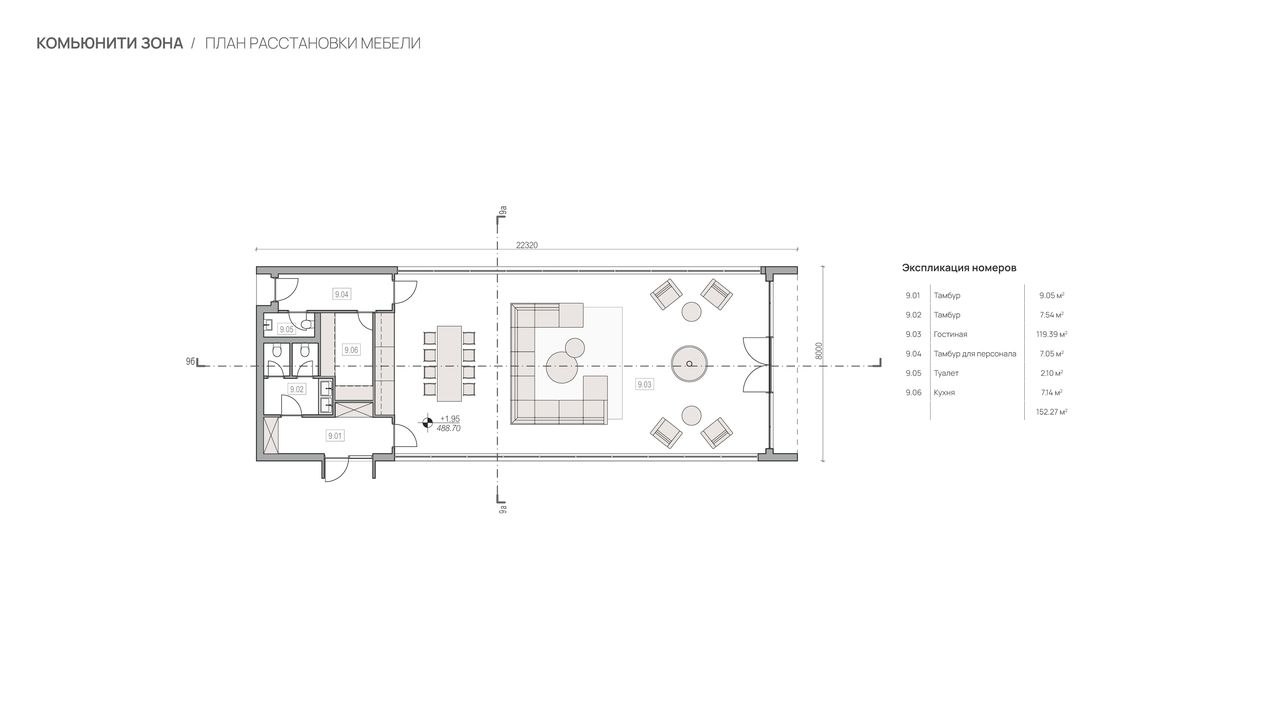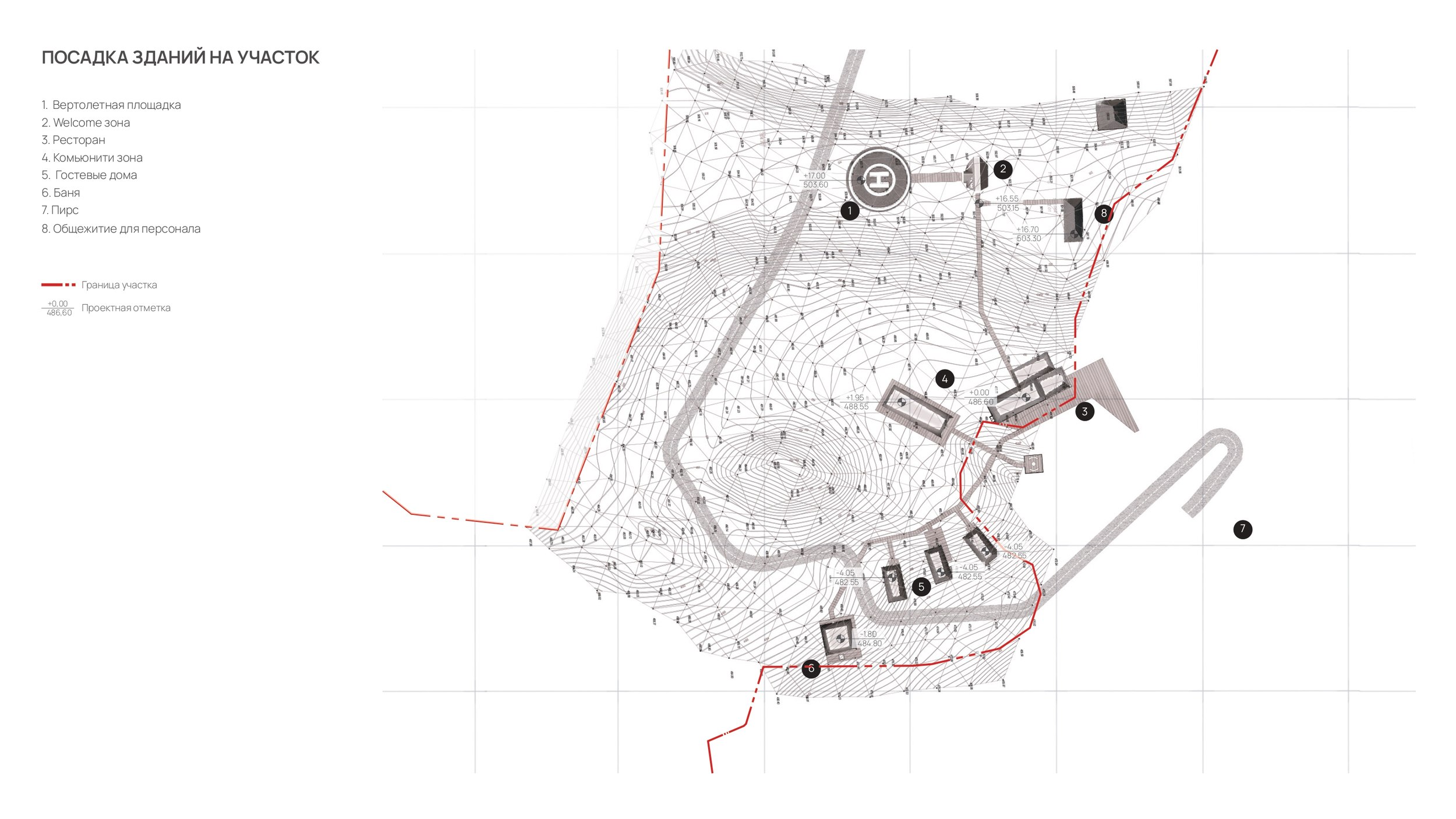 Комплекс включает вертолетную площадку, гостевую зону, ресторан, комьюнити-пространство, гостевые дома, баню, пирс и сервисный блок. Участок находится в удаленной природной зоне (ближайшие малые населенные пункты находятся в 20 километрах), поэтому комплекс становится местом для тотального замедления и подлинного переживания природы и себя.
