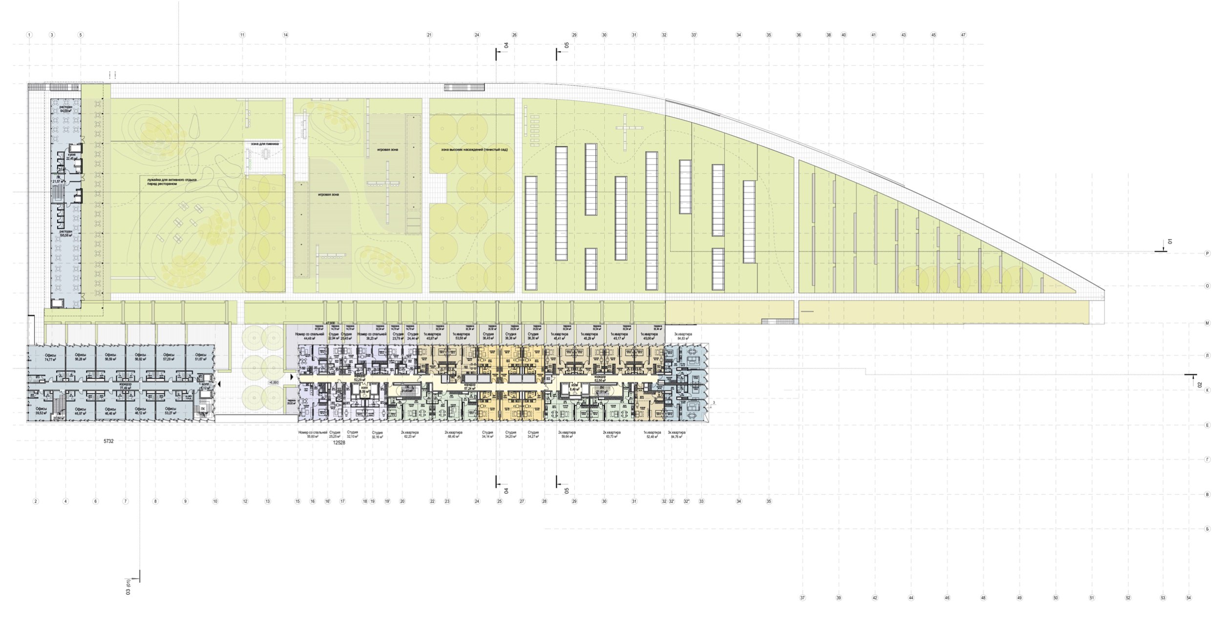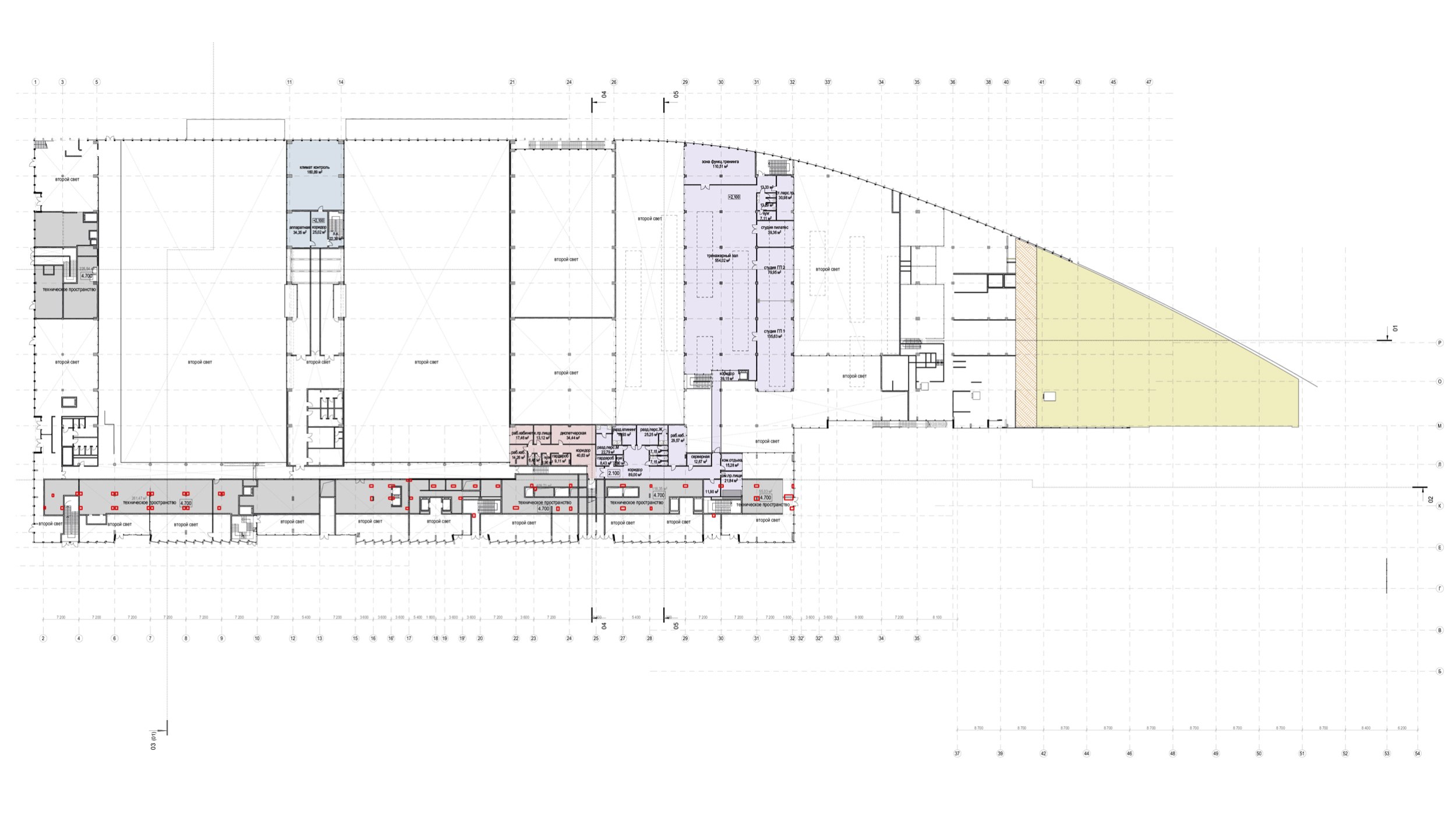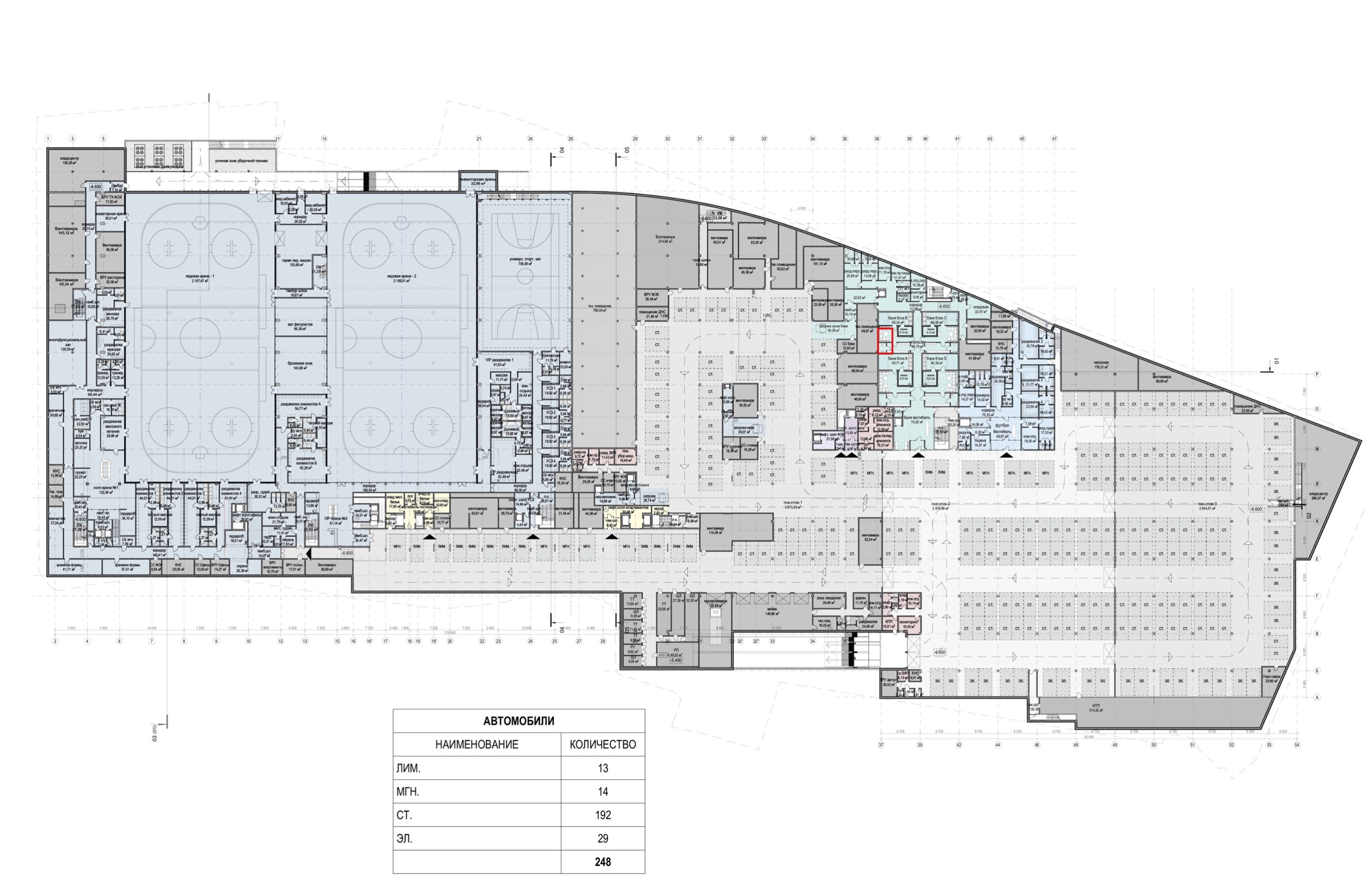 Также присутствуют мусорокамера, помещения для загрузки ресторанов, фитнеса и ледового комплекса, автомойка и технические помещения для инженерного оборудования.